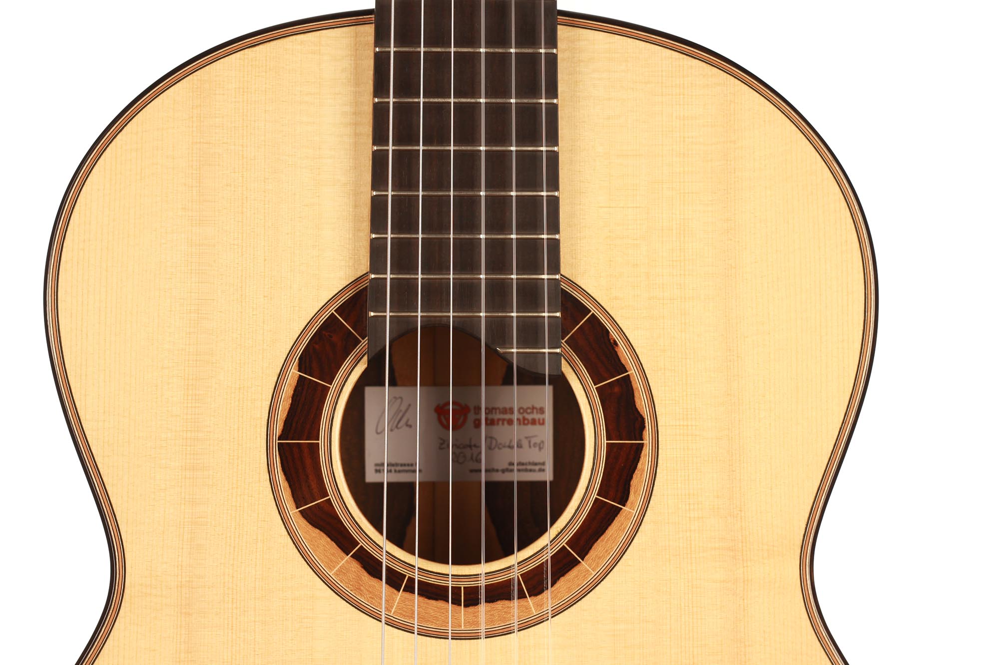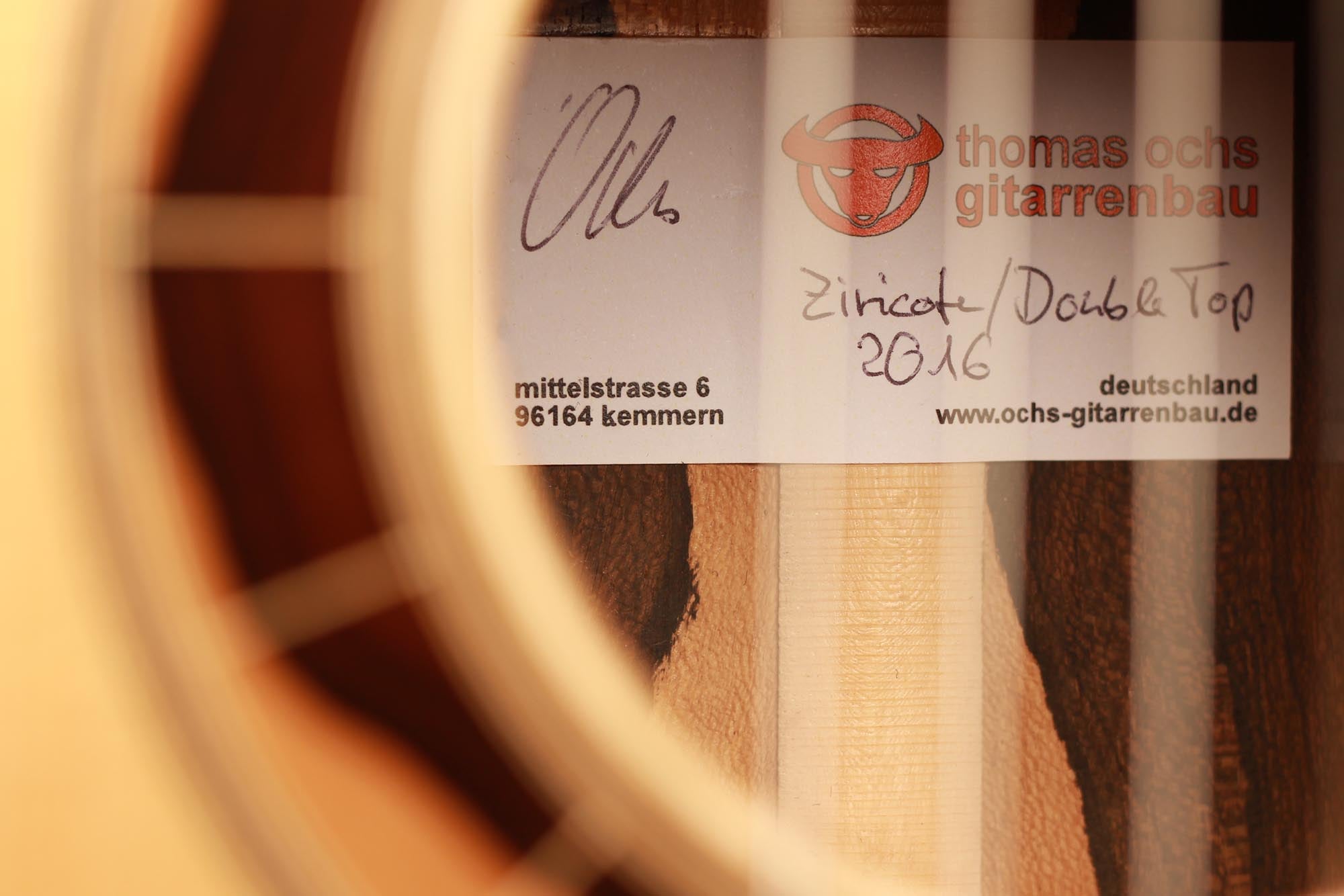 Thomas Ochs is an excellent German luthier from whom we have received many guitars in the past few years. His guitars are extremely well built, and his technical know-how is perfect. This CITES free spruce doubletop model has amazing acoustic qualities and its playing comfort is fantastic. The spruce aged very well and took a very charming honey colour. This second-hand guitar is almost as new and wears practically no playing marks.