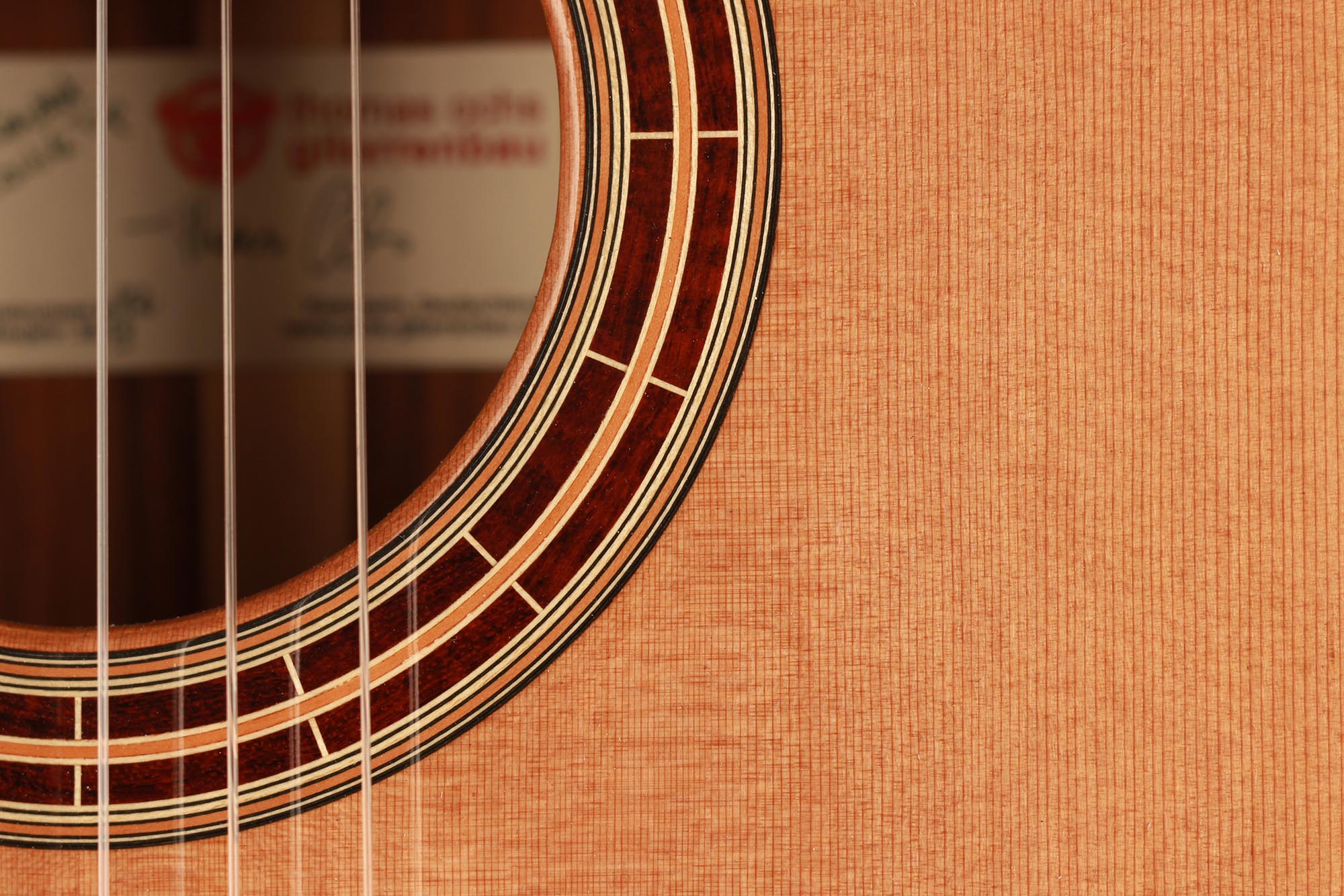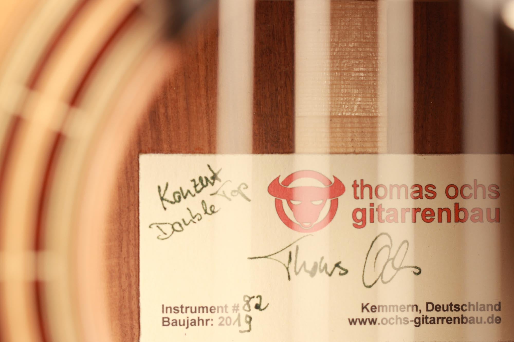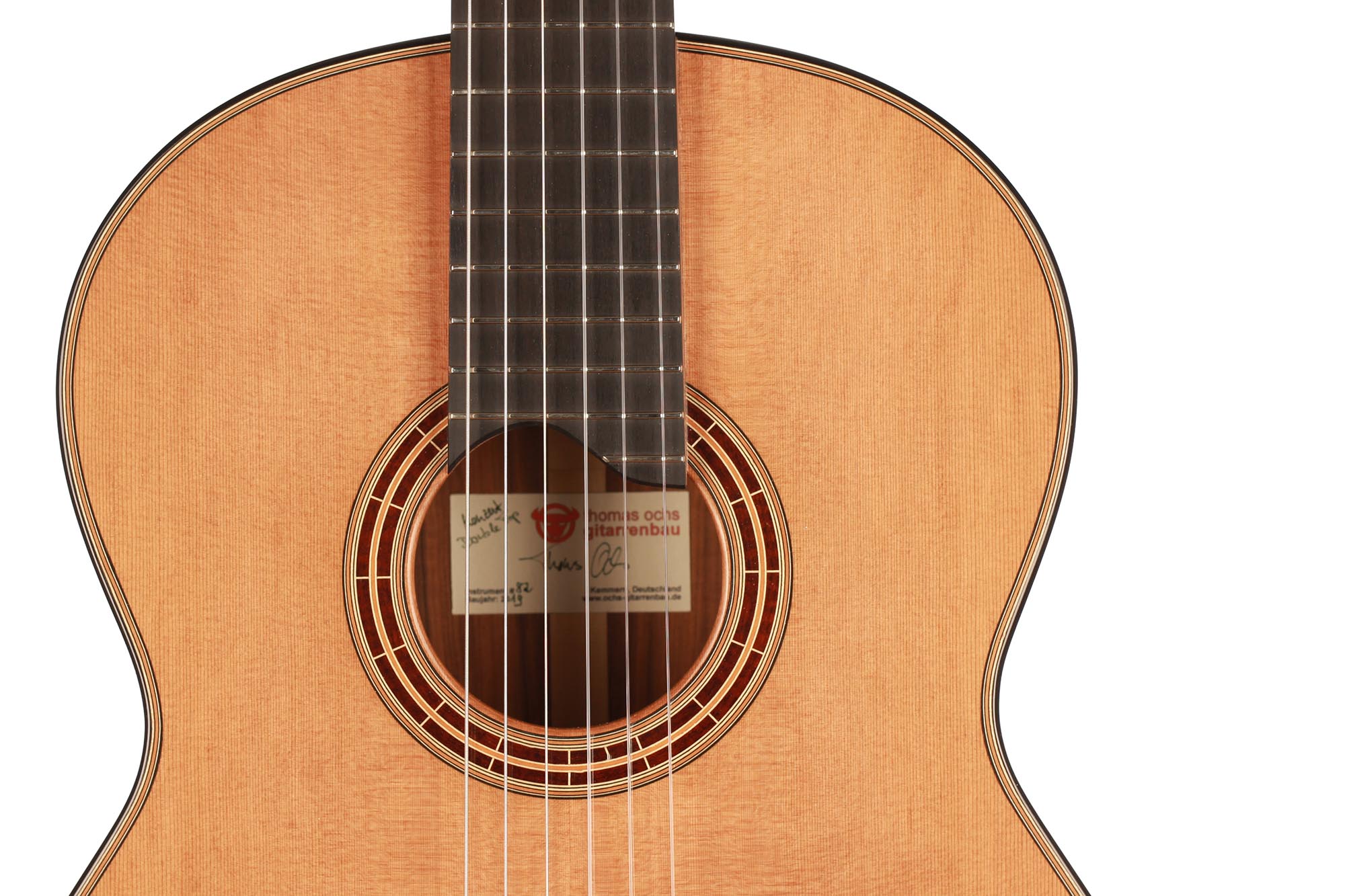 Thomas Ochs ist ein ausgezeichneter deutscher Gitarrenbauer, von dem wir in den letzten Jahren viele Gitarren erhalten haben. Seine Gitarren sind extrem gut gebaut, und sein technisches Know-how ist beeindruckend. Dieses CITES freie Doubletop Modell hat erstaunliche akustische Eigenschaften und bietet einen fantastischen Spielkomfort. Diese Gitarre hat eine doppelte Zeder / Zederndecke, die ihr eine enorme Power sowie einen runden und warmen Klang verleiht. Die Klarheit und Präzision jeder Note ist überraschend. Das Griffbrett ist erhöht, was der linken Hand den Zugang zu den Höhen erleichtert und der Spielkomfort für die rechte Hand ist aufgrund der Vibrationsfreiheit der Decke beeindruckend.
