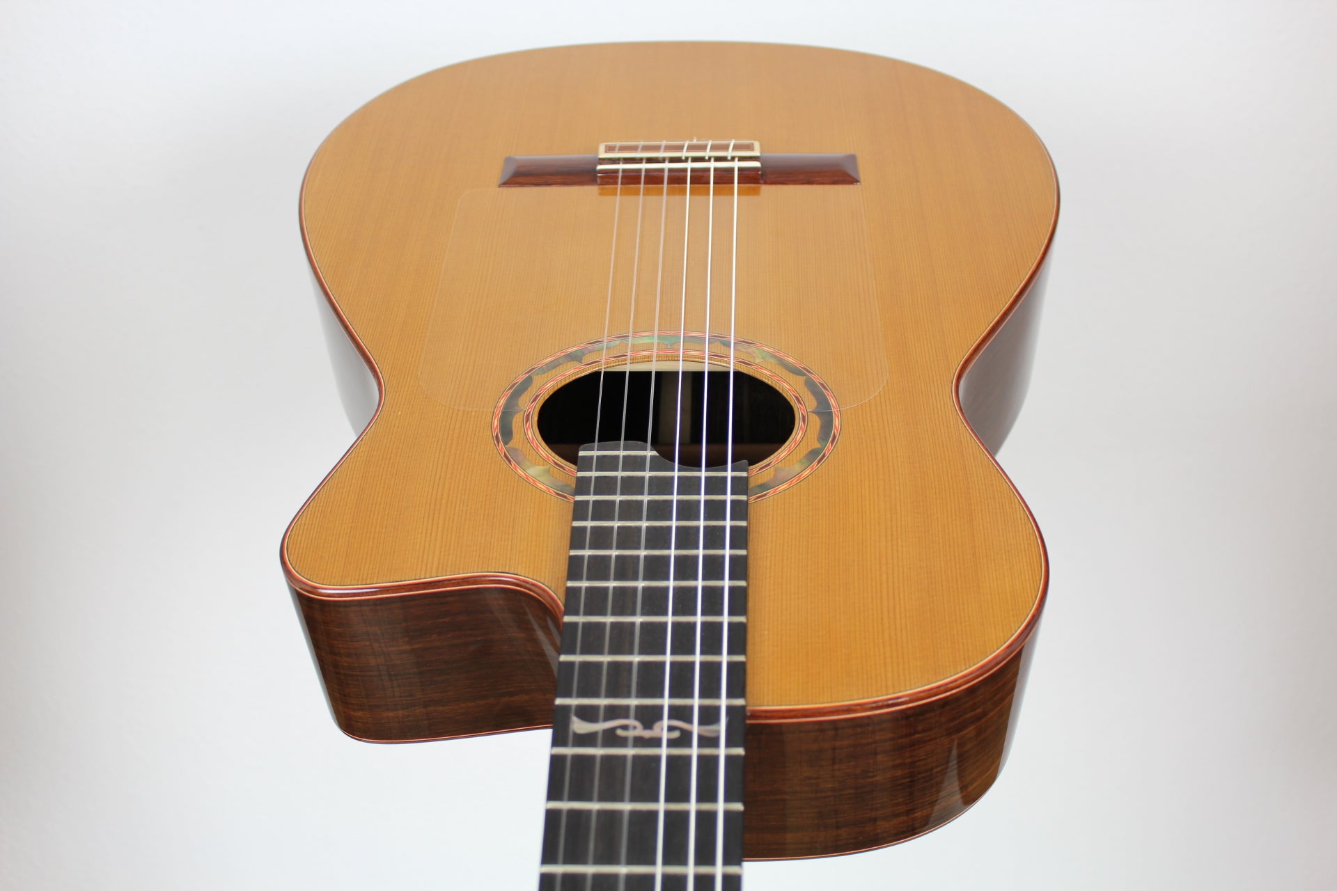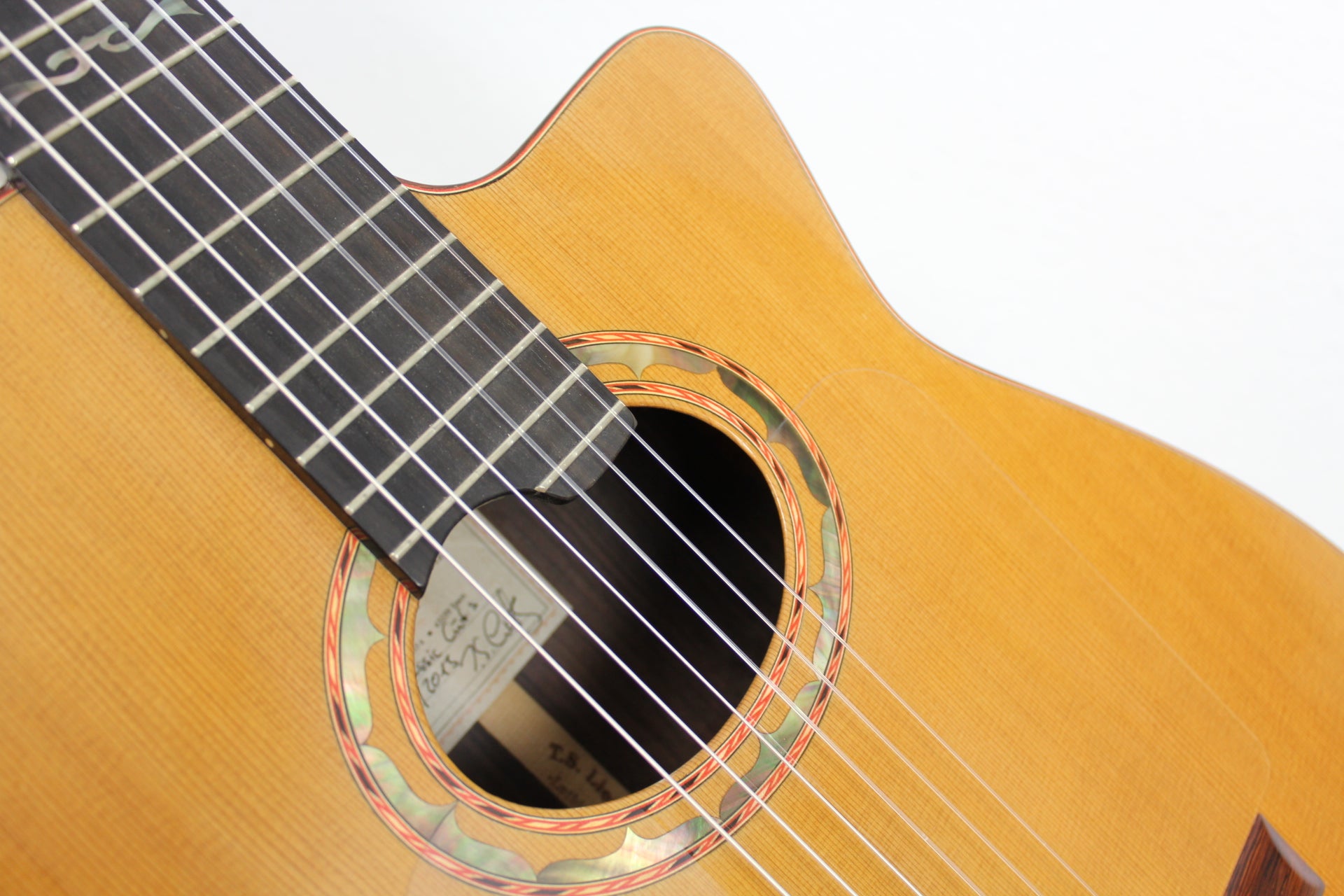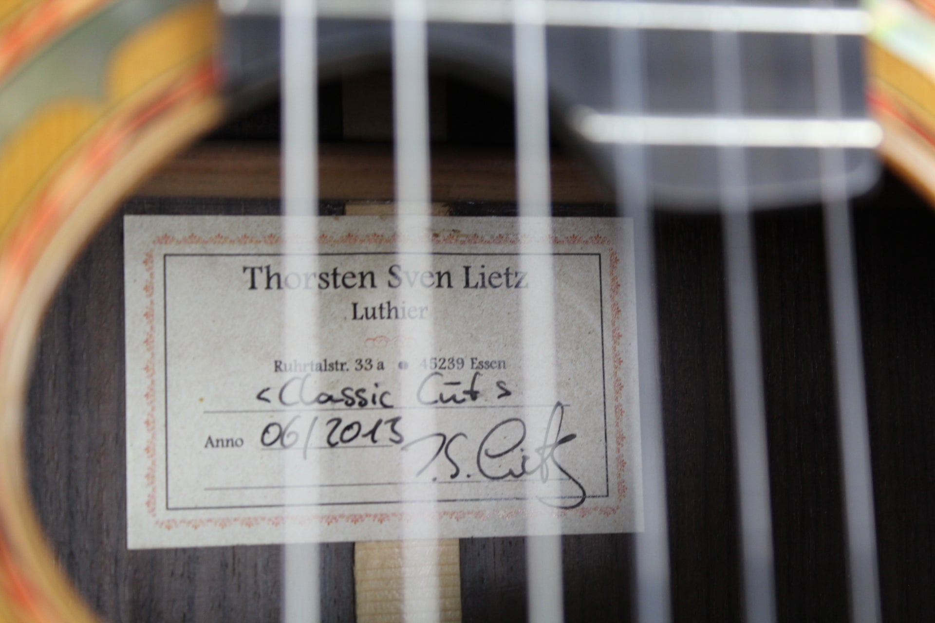 Thorsten Sven Lietz studied in Mittenwald at the "Fachschule für Geigen- und Zupfinstrumentenbau" where he finished his studies with the craftsmans diploma. This Lietz guitar has a cutaway and active Pickup and was built in 2013. It has a hand French-polished cedar top with five symmetrical braces. Back and sides are made of Indian rosewood and a nitrocellulose finish. A very powerful guitar with a body air resonance somewhat above F. The top has only some minor signs. Comes with an Hiscox Pro II case.