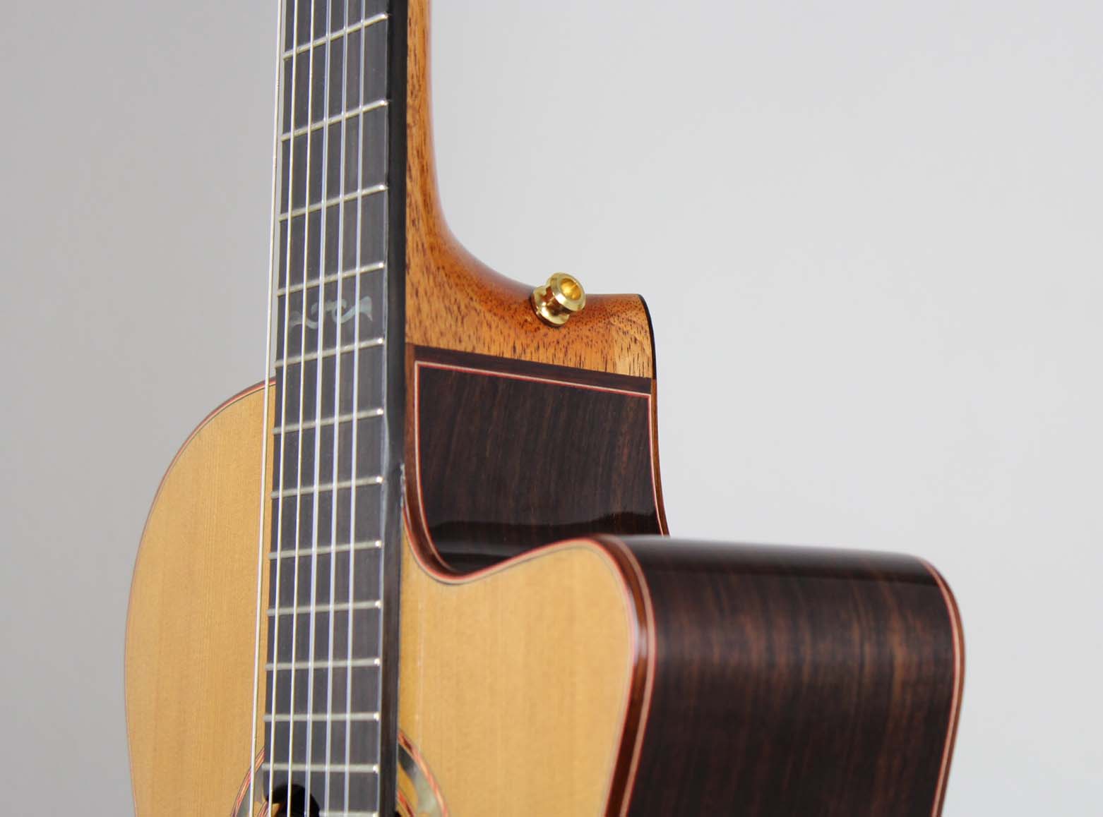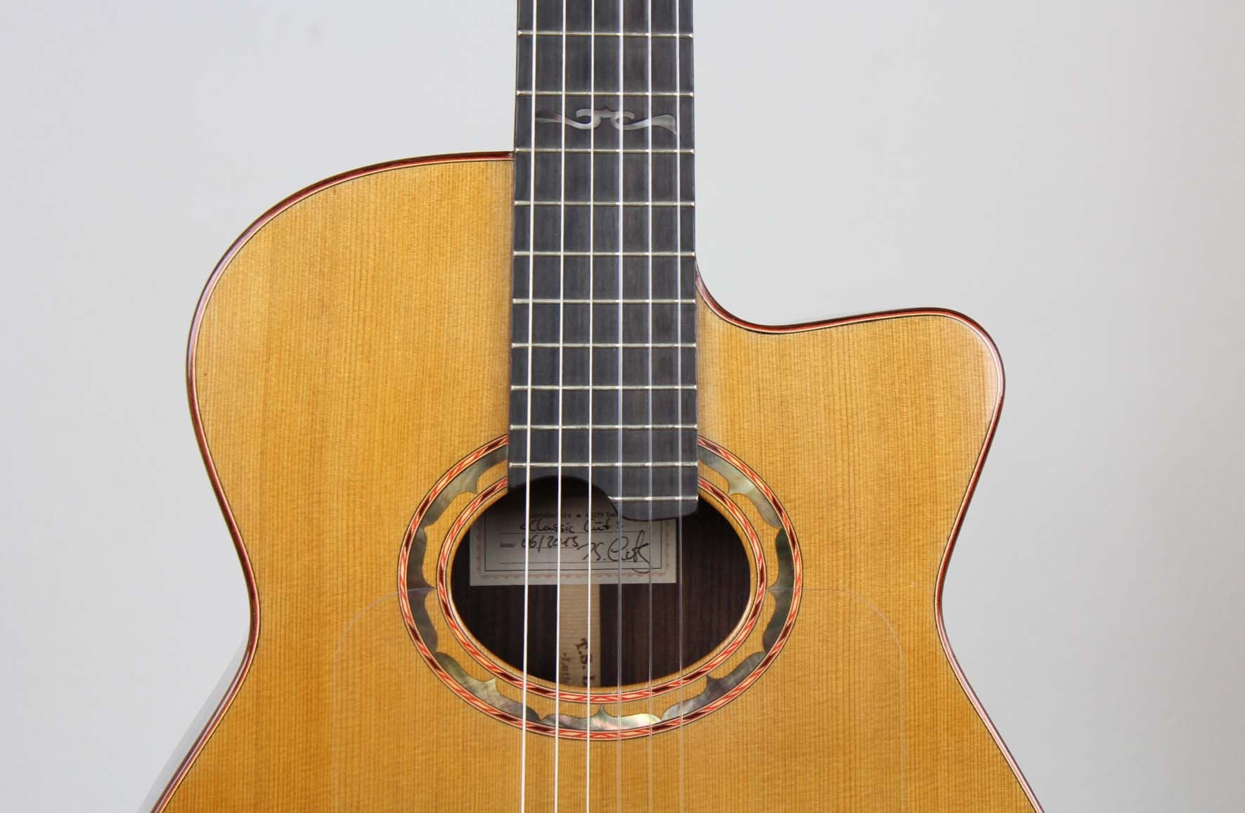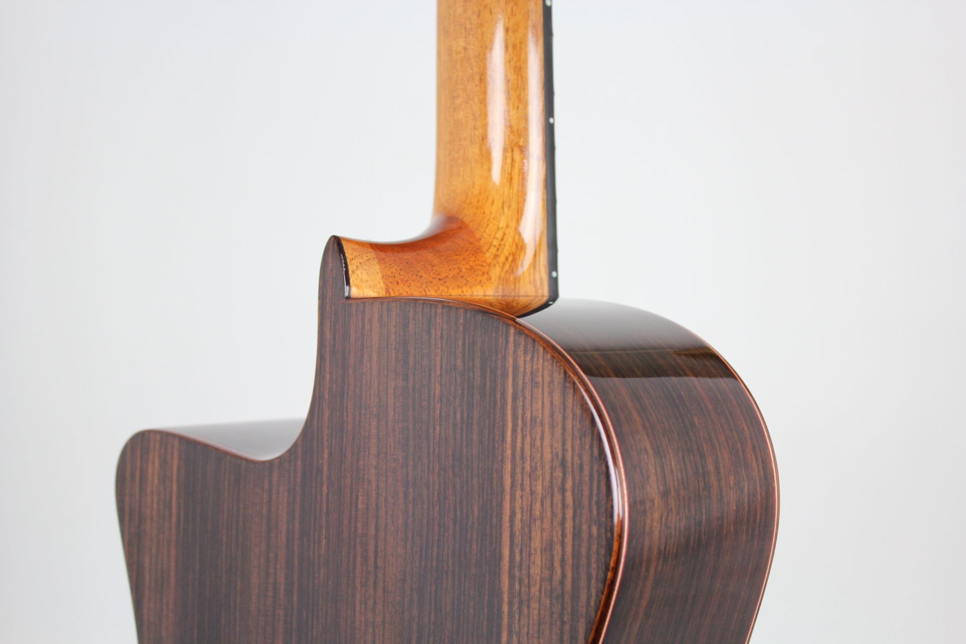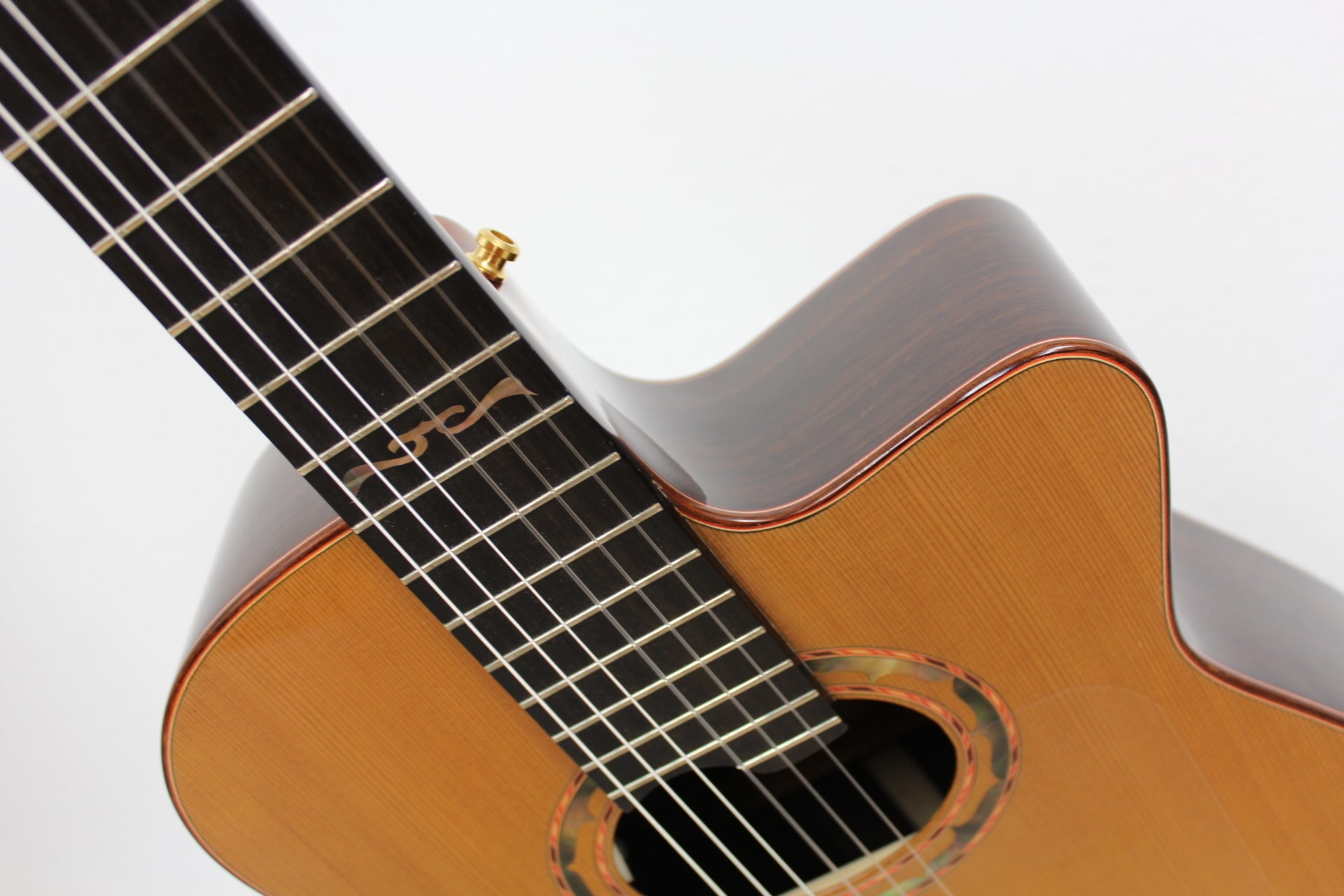Thorsten Sven Lietz studied in Mittenwald at the "Fachschule für Geigen- und Zupfinstrumentenbau" where he finished his studies with the craftsmans diploma. This Lietz guitar has a cutaway and active Pickup and was built in 2013. It has a hand French-polished cedar top with five symmetrical braces. Back and sides are made of Indian rosewood and a nitrocellulose finish. A very powerful guitar with a body air resonance somewhat above F. The top has only some minor signs. Comes with an Hiscox Pro II case.