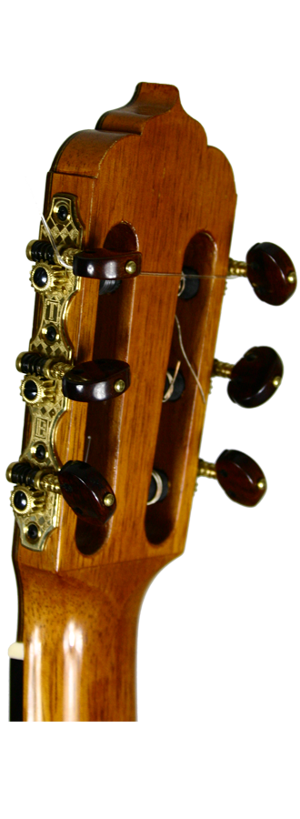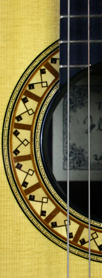 This guitar has a spruce top. Back and ribs are made of East Indian rosewood. A special feature is a small tornavoz, which is built-in 17mm lower. Tobias Braun got the inspiration for this from studying the traditional Spanish lutherie. A tornavoz can also be found in guitars made by Antonio de Torres, and has the aim to increase the projection capability of the guitars. In addition to that, the body resonates less, which is conducive for the sonority of the instruments. The motif of the guitar’s rosette shows two small keys. This motif has a regional reference to the residence of Tobias Braun and corresponds to the coat of arms of the district of Melk in Upper Austria.