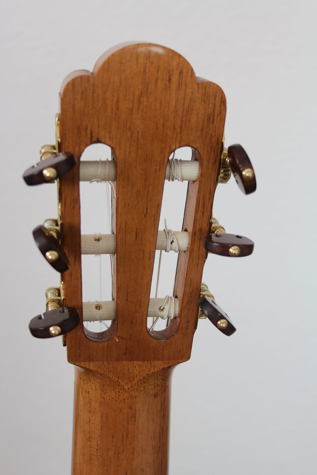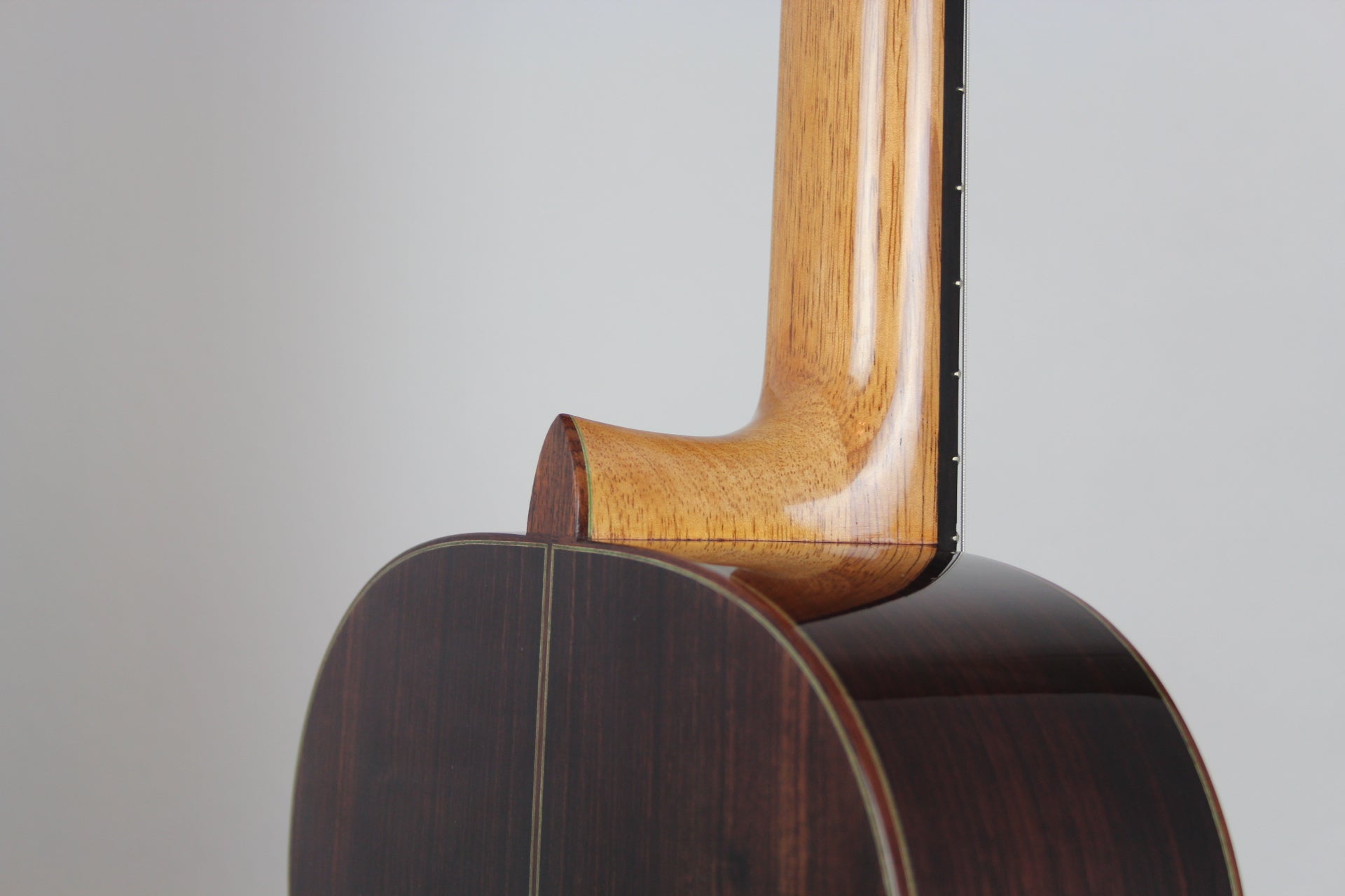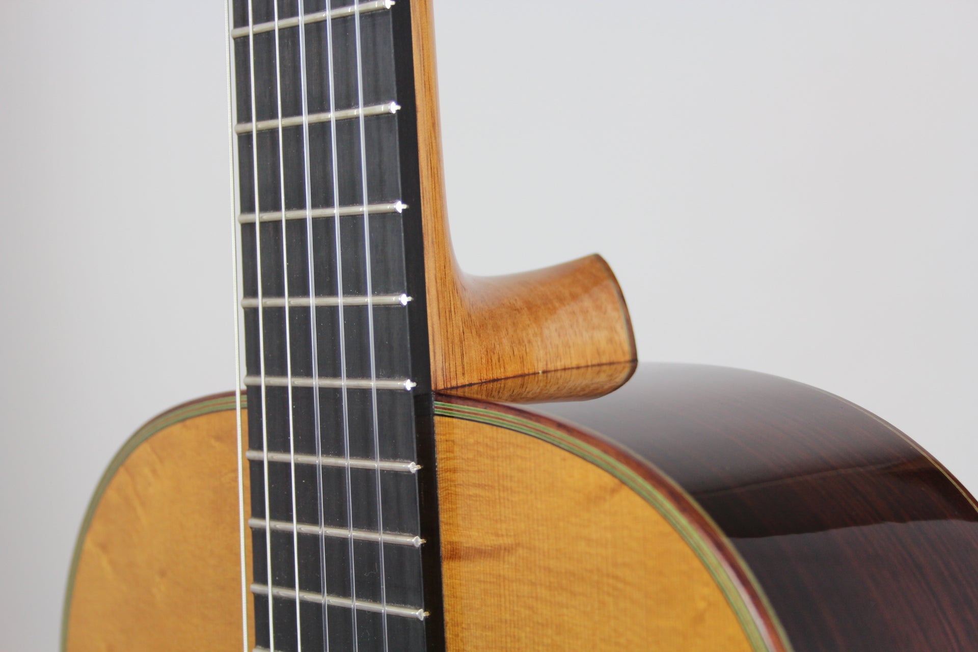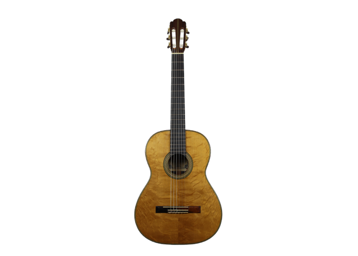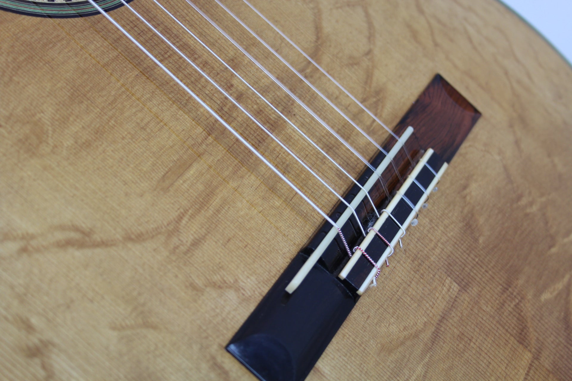 This model has a European spruce top with bear claw figuring. The top was treated thermally that gives the top not only a beautiful look but also a very open and equilibrated sound. The responsiveness is very fast and direct.