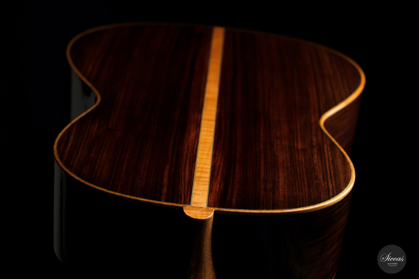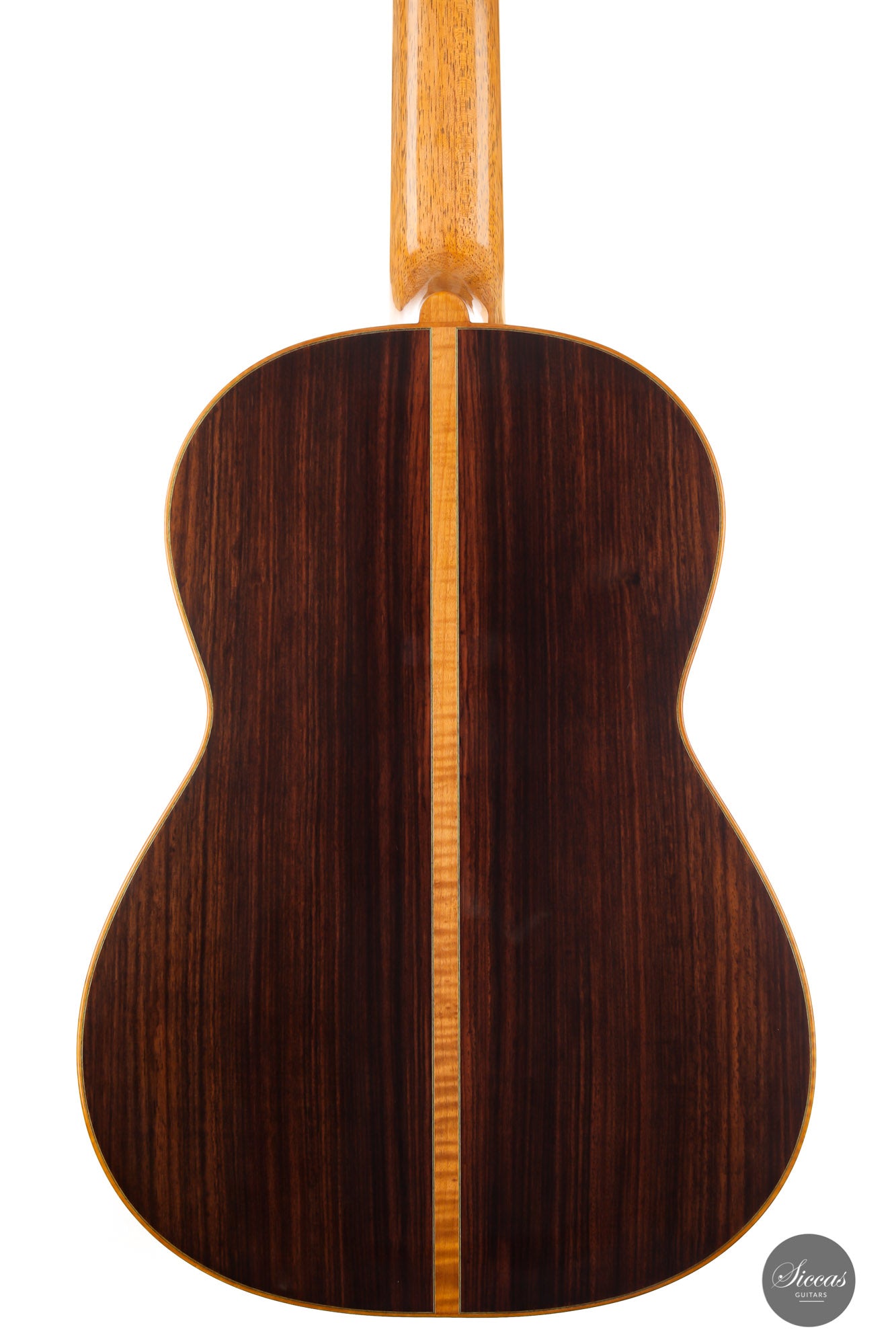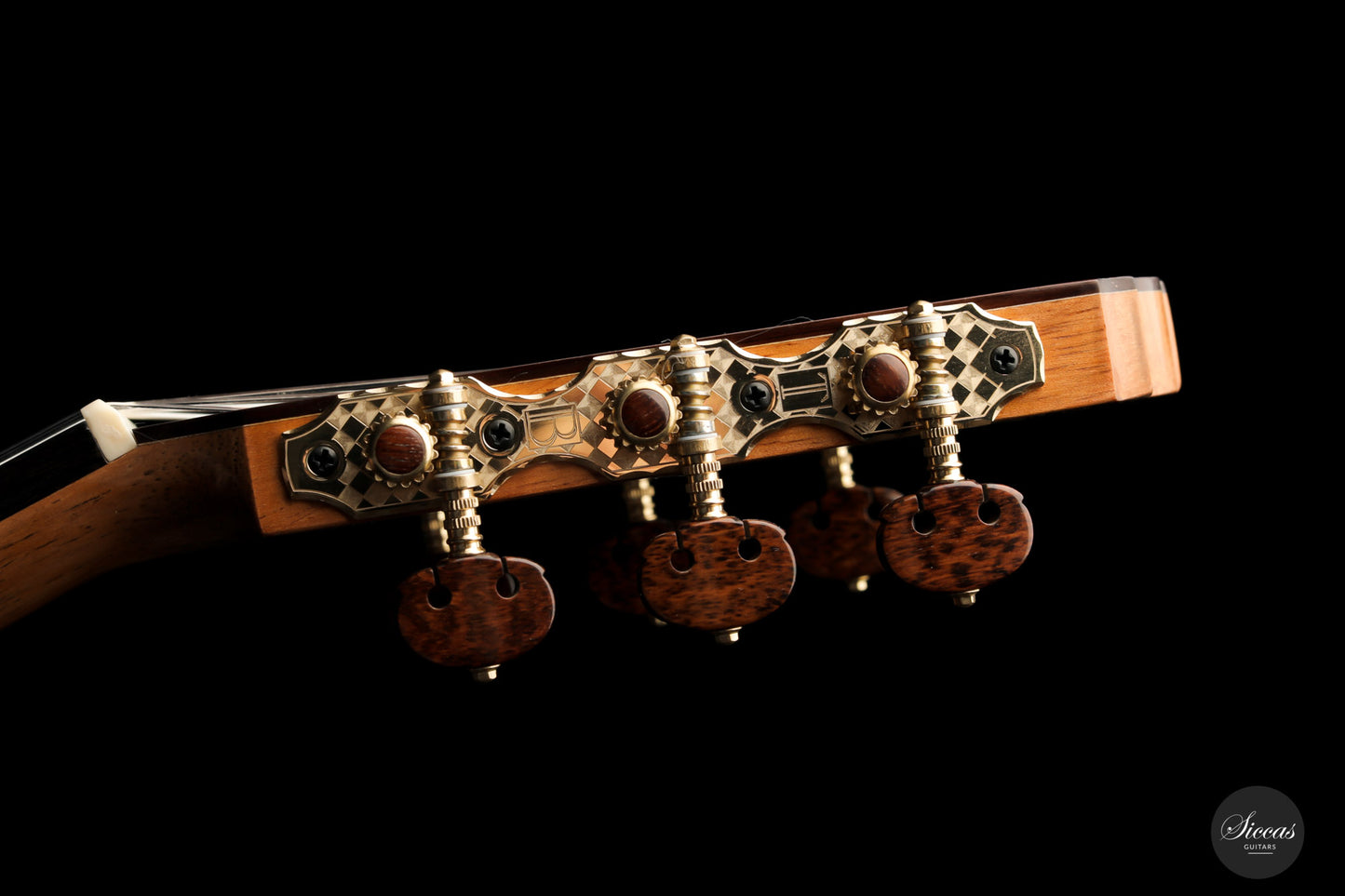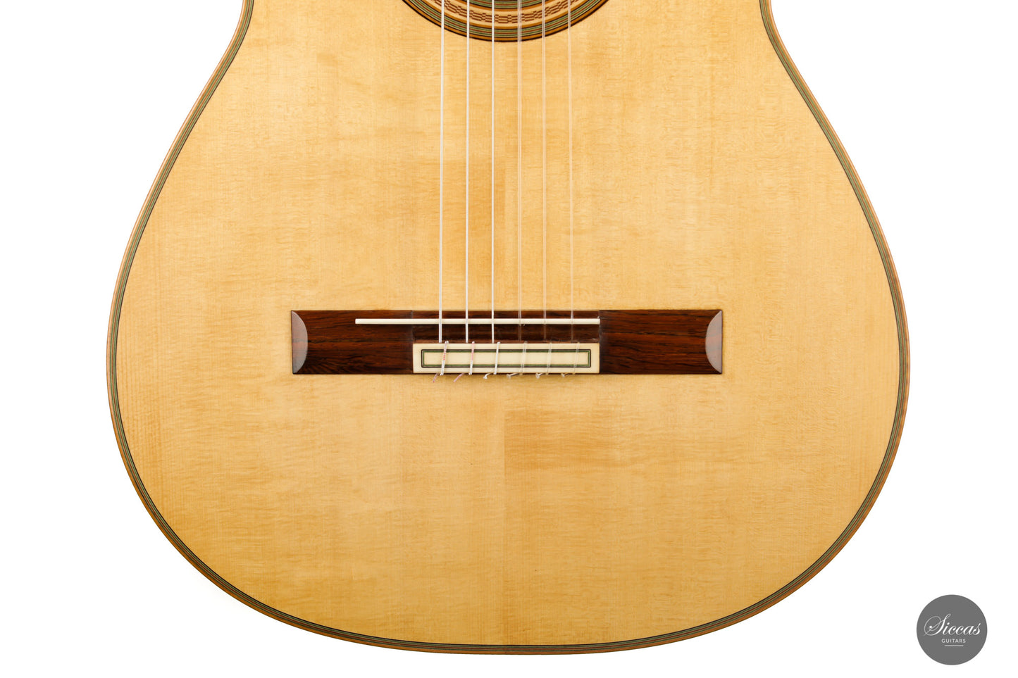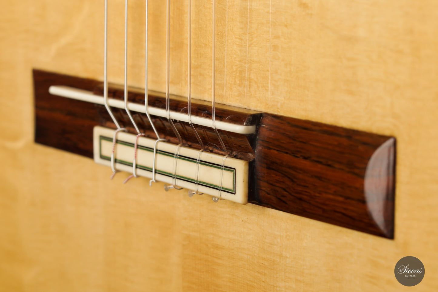 This guitar comes directly from the workshop of Tobias Braun and is strongly inspired by the guitar of Andrès Segovia, built in 1912 by Santos Hernandez for the workshop of Manuel Ramirez. One can see many beautiful reflections in the grain on this spruce, which in itself is a natural work of art. The back and sides are made of Indian rosewood and a fine maple inlay adorns the middle of the back. In addition, the rosette is decorated with green inlays. This same green colour can be found throughout the entire decoration of the guitar. An interesting detail is the very pronounced angle of the head, which is completely corresponding to the superior instruments from the famous Madrilenian workshop of Manuel Ramirez.