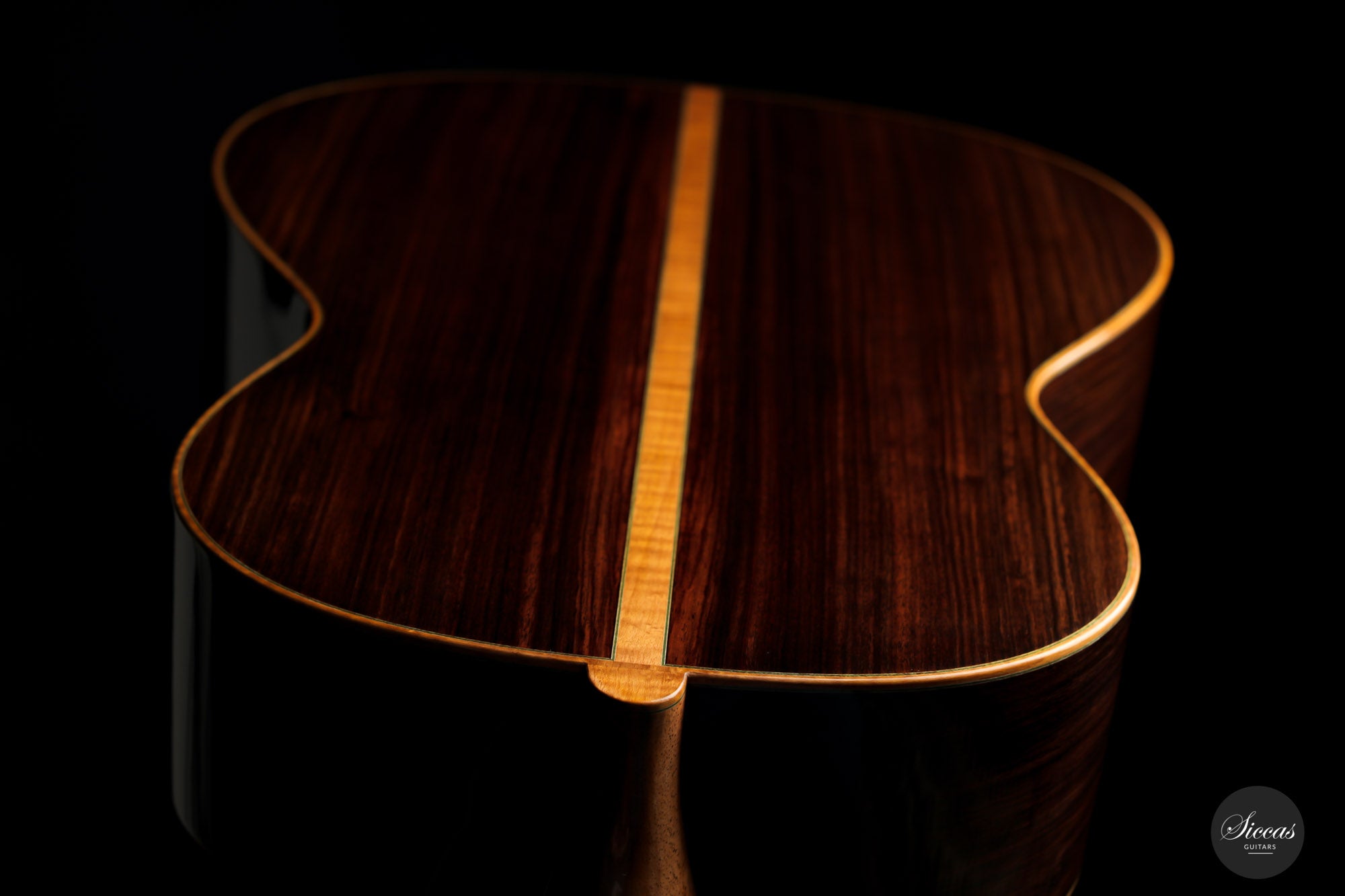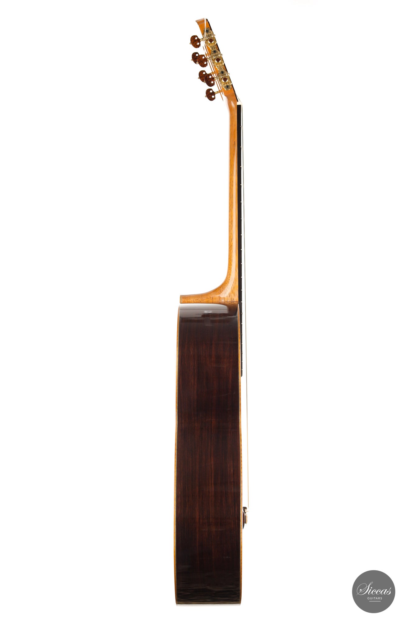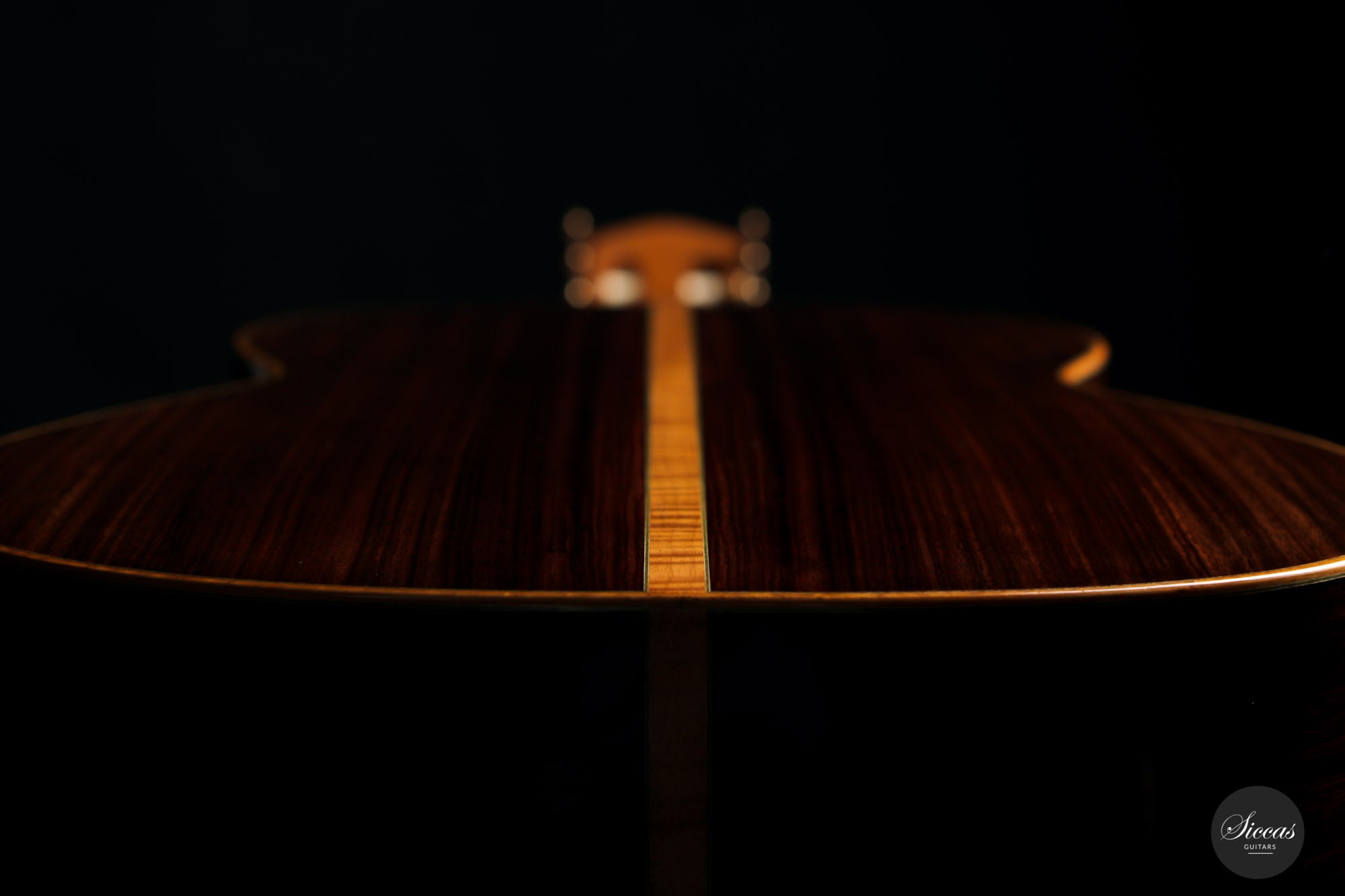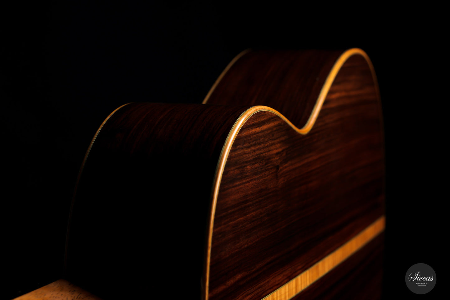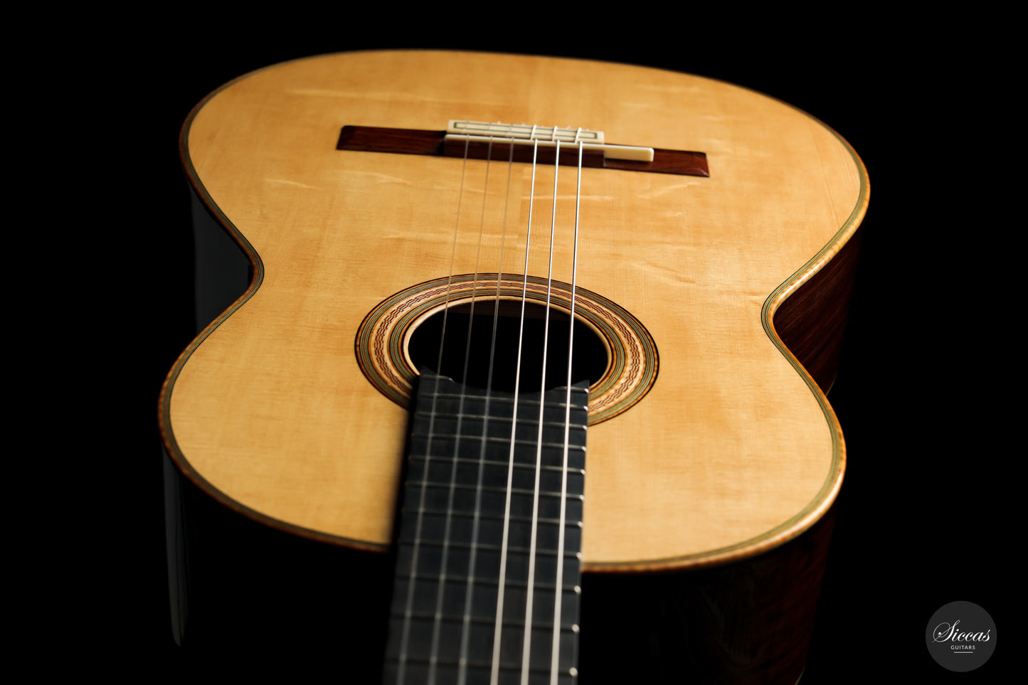 A wonderful charm and an enveloping warmth of sound emanate from this instrument. This reflects exactly the characteristics and the magic that is inherent in the early 20th century Madrilenian guitars, namely a deep, inspiring Spanish tone, whose elegant and complex melodic first string makes the guitar sing so beautifully. In addition, the basses sound warm and captivating and especially carrying, which gives this instrument an authentic character.