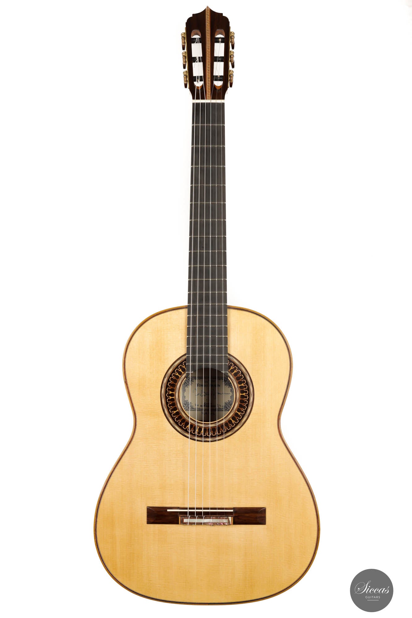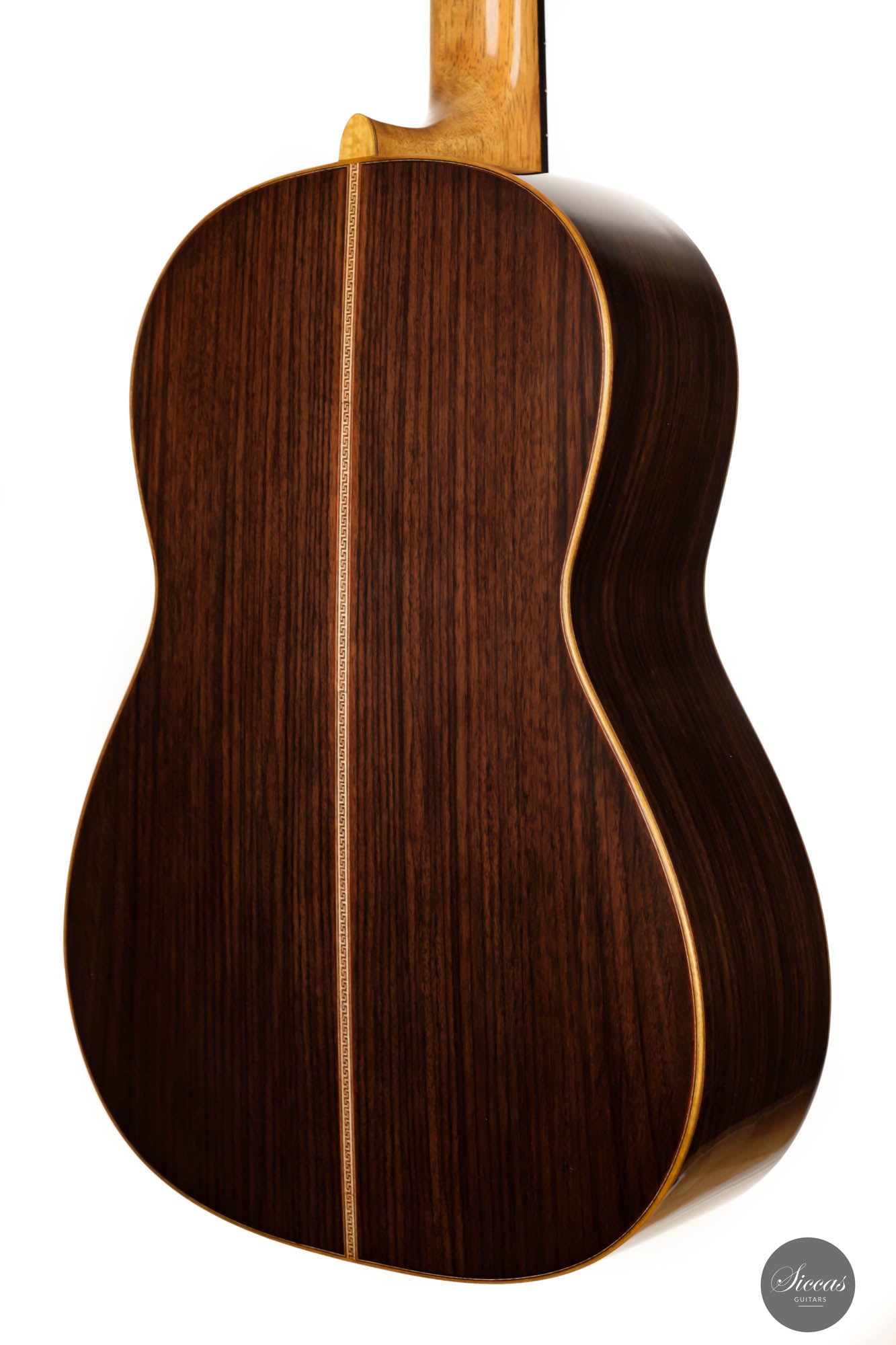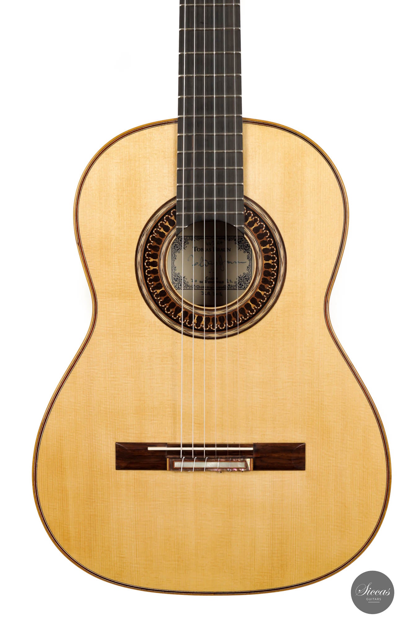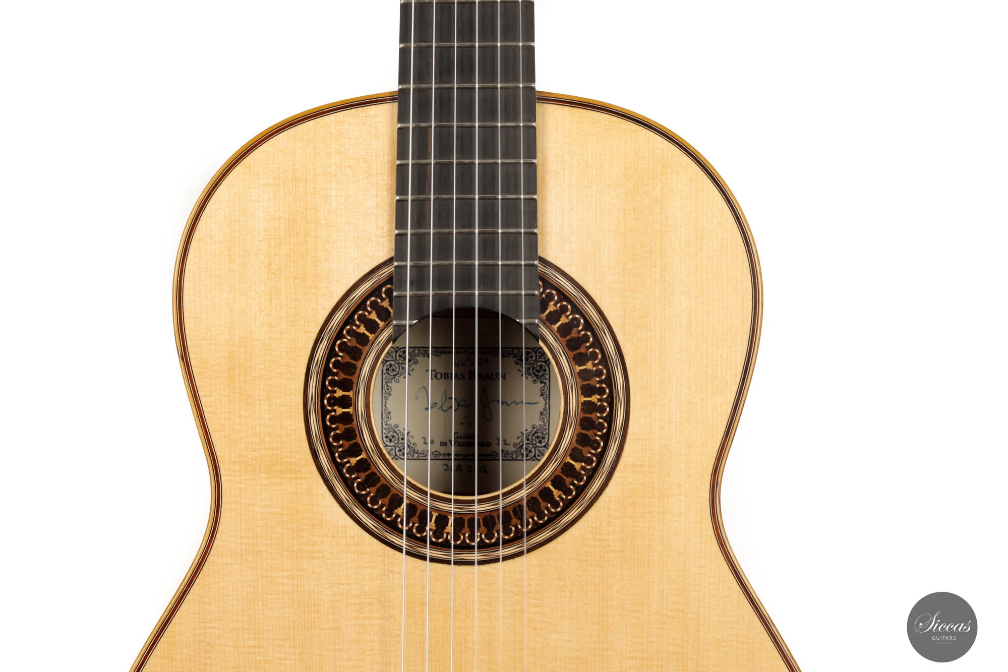 Tobias Braun ist einer der wenigen Gitarrenbauer, die eine lange Geschichte mit der Familie Romanillos haben. Dieses Instrument ist das Ergebnis eines hervorragenden Verständnisses von Joses Instrument, insbesondere der 2012 José L. Romanillos, auf der diese Gitarre basiert. Tobias ist es gelungen, mit diesem Instrument eine schöne Reminiszenz an das Original zu schaffen. Die wunderschöne Fichtendecke ist in Anlehnung an Josés Gitarren geschmackvoll verziert und auf höchstem handwerklichen Niveau ausgeführt. Der markante Boden und die Zargen aus indischem Palisander runden das Erscheinungsbild dieser Gitarre ab. Akustisch repräsentiert diese Gitarre die breite Farbpalette von José L. Romanillos' Gitarre. Und nicht nur das, sie hat auch das gleiche Spielgefühl wie das Original.