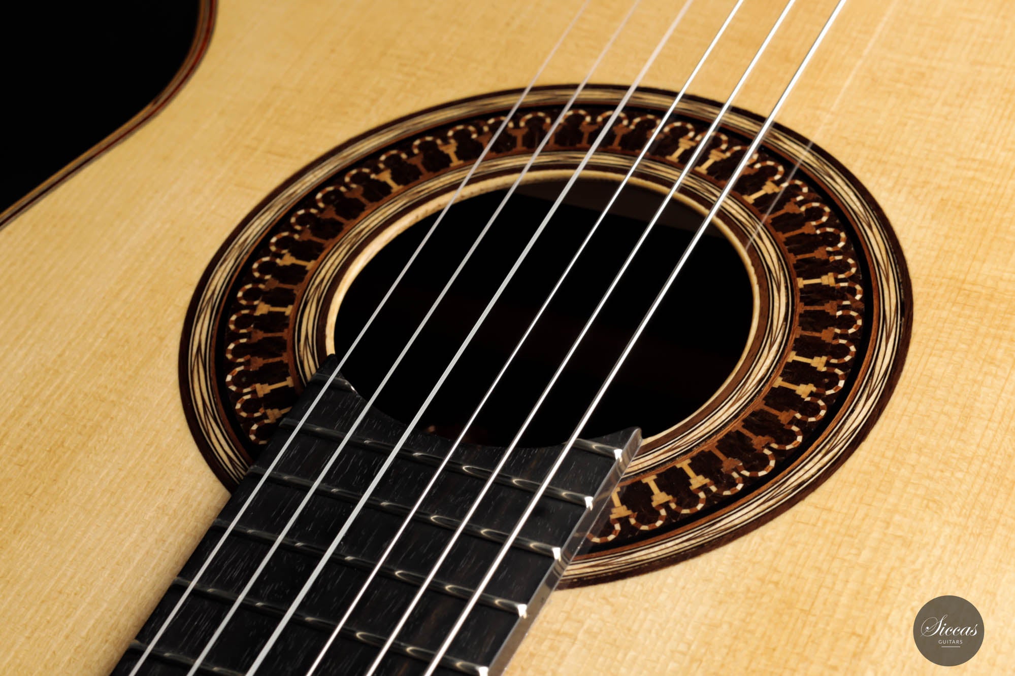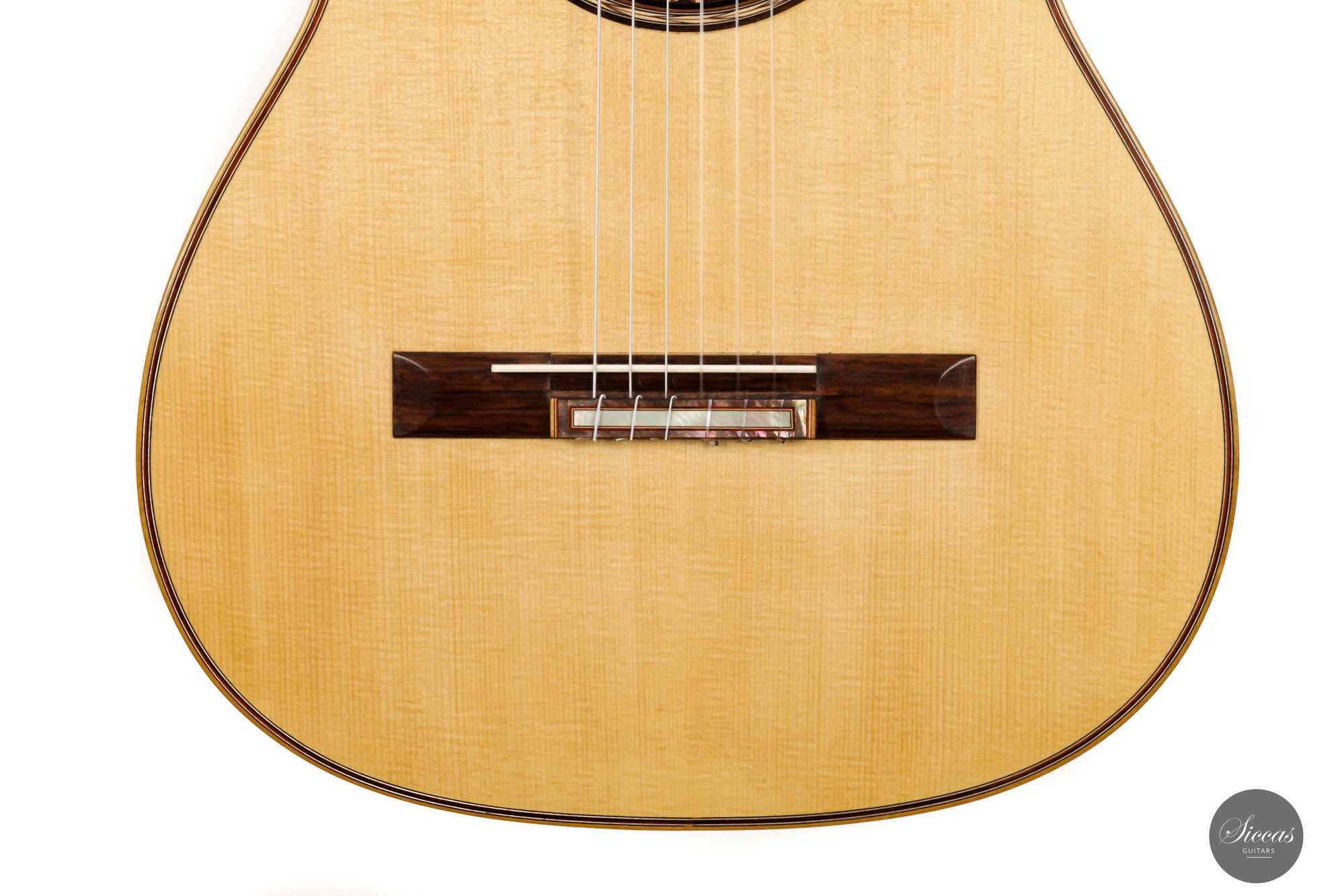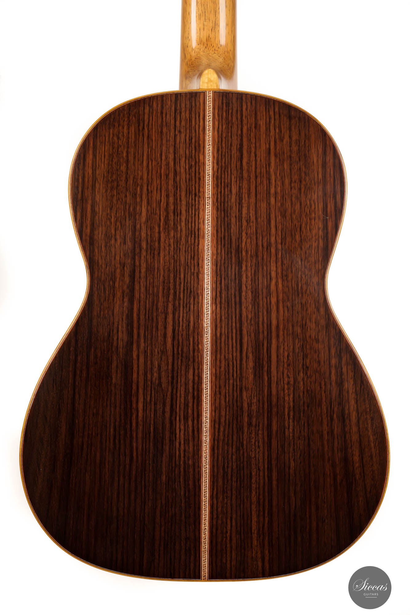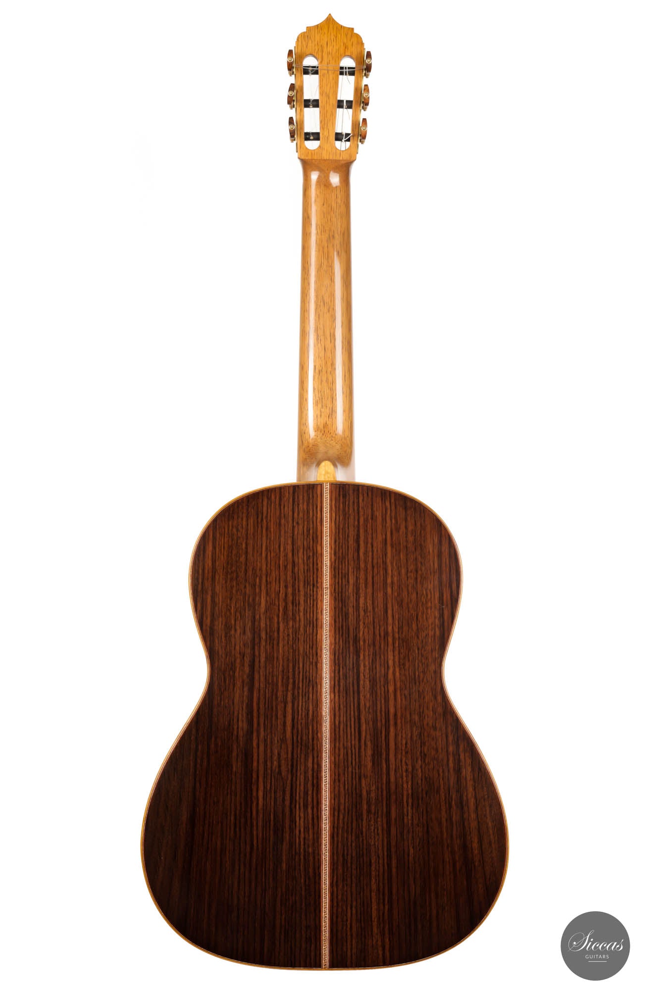Tobias Braun ist einer der wenigen Gitarrenbauer, die eine lange Geschichte mit der Familie Romanillos haben. Dieses Instrument ist das Ergebnis eines hervorragenden Verständnisses von Joses Instrument, insbesondere der 2012 José L. Romanillos, auf der diese Gitarre basiert. Tobias ist es gelungen, mit diesem Instrument eine schöne Reminiszenz an das Original zu schaffen. Die wunderschöne Fichtendecke ist in Anlehnung an Josés Gitarren geschmackvoll verziert und auf höchstem handwerklichen Niveau ausgeführt. Der markante Boden und die Zargen aus indischem Palisander runden das Erscheinungsbild dieser Gitarre ab. Akustisch repräsentiert diese Gitarre die breite Farbpalette von José L. Romanillos' Gitarre. Und nicht nur das, sie hat auch das gleiche Spielgefühl wie das Original.