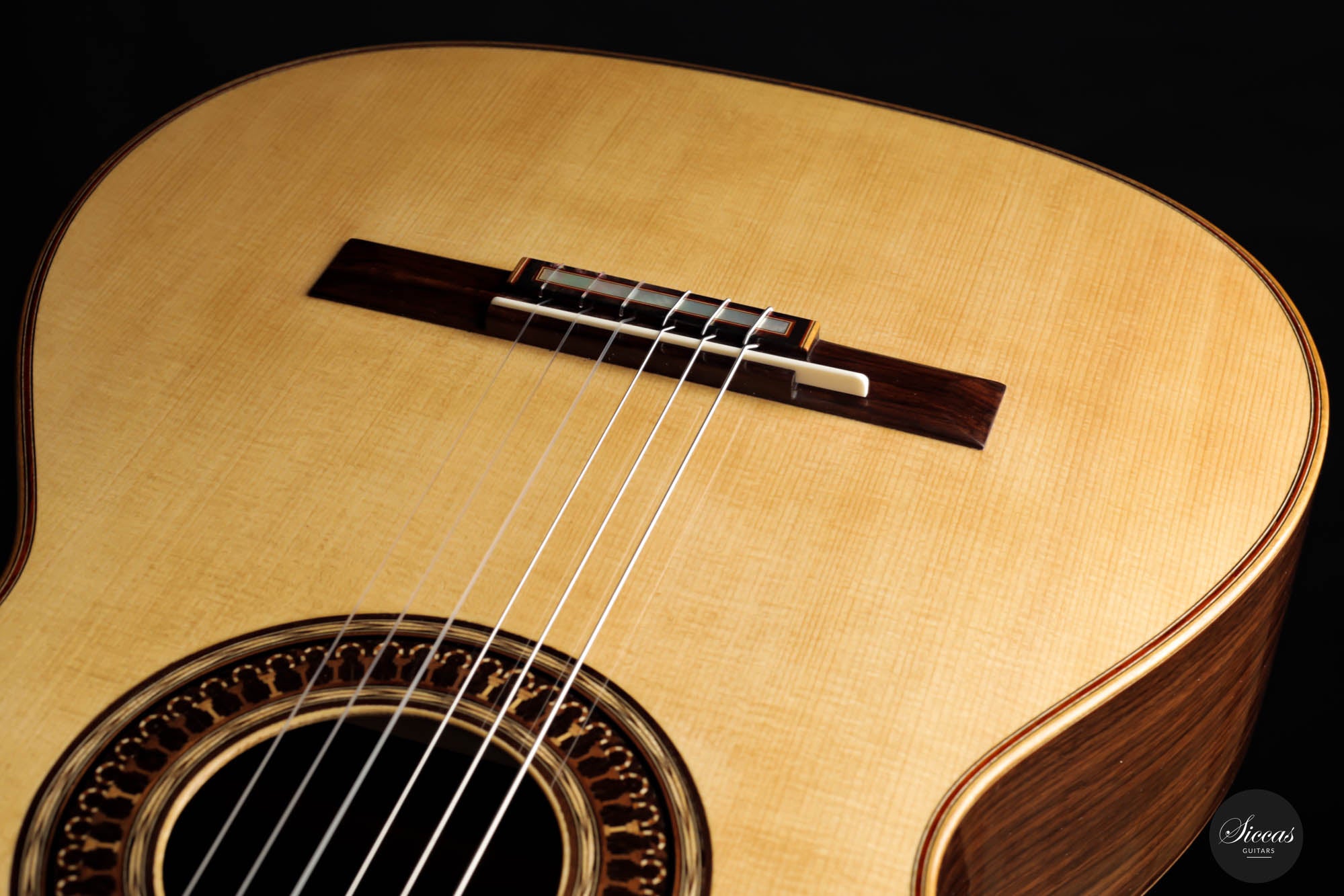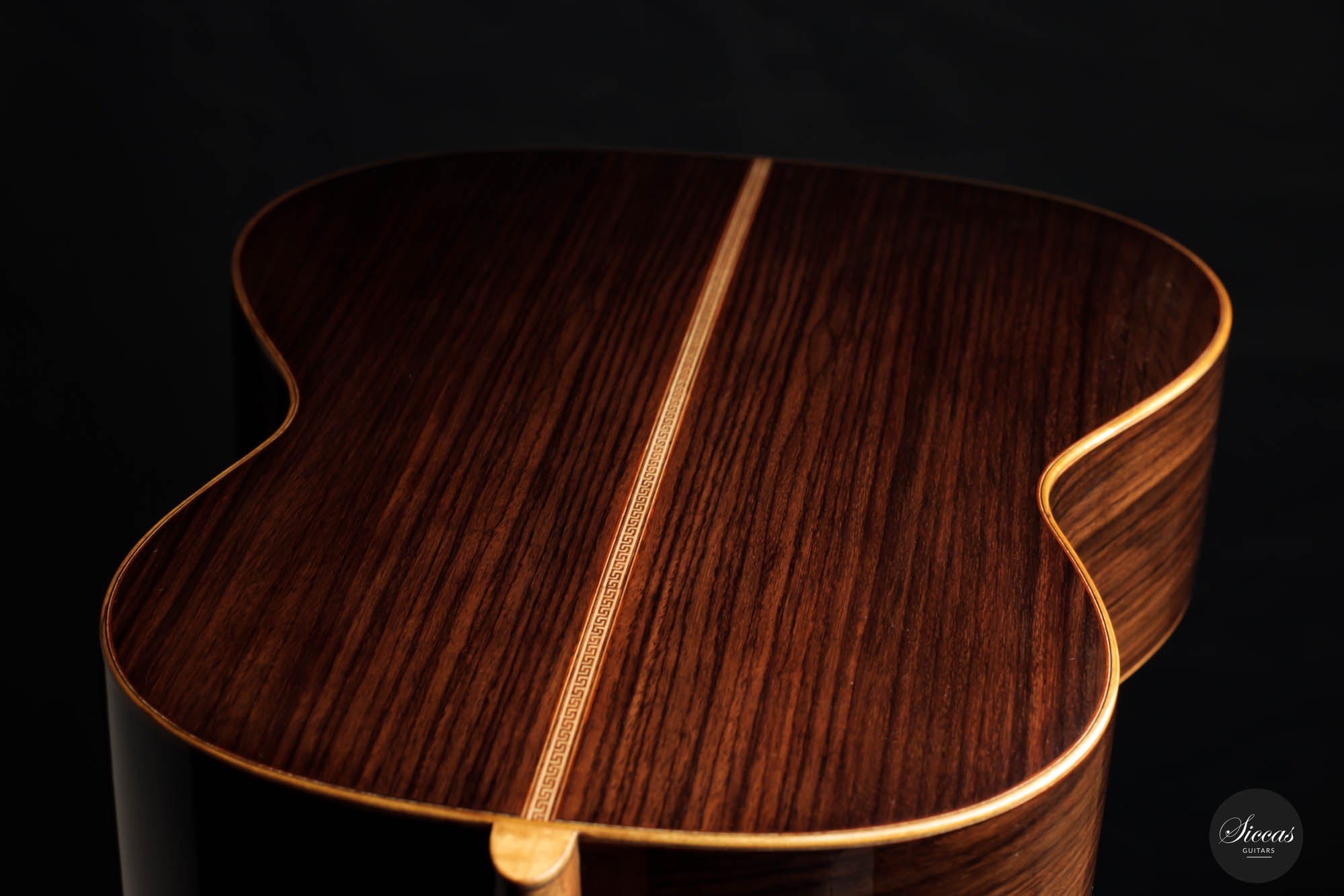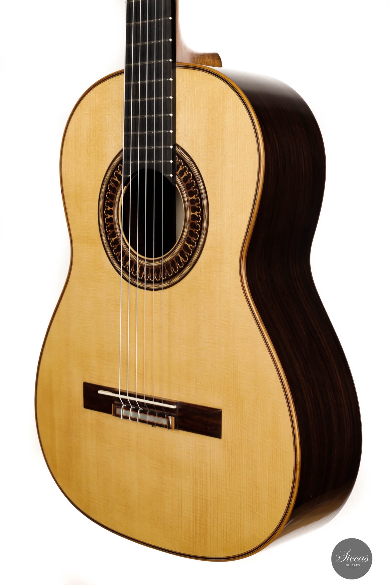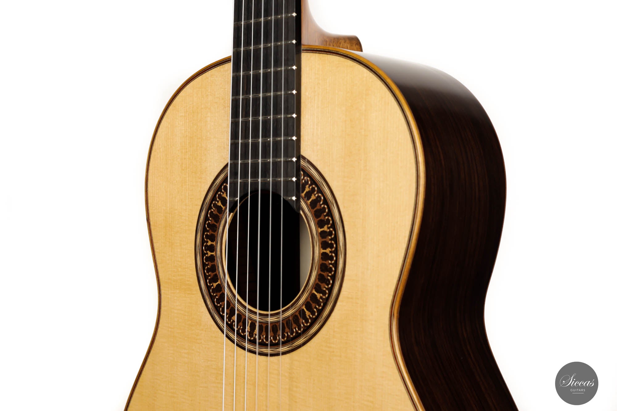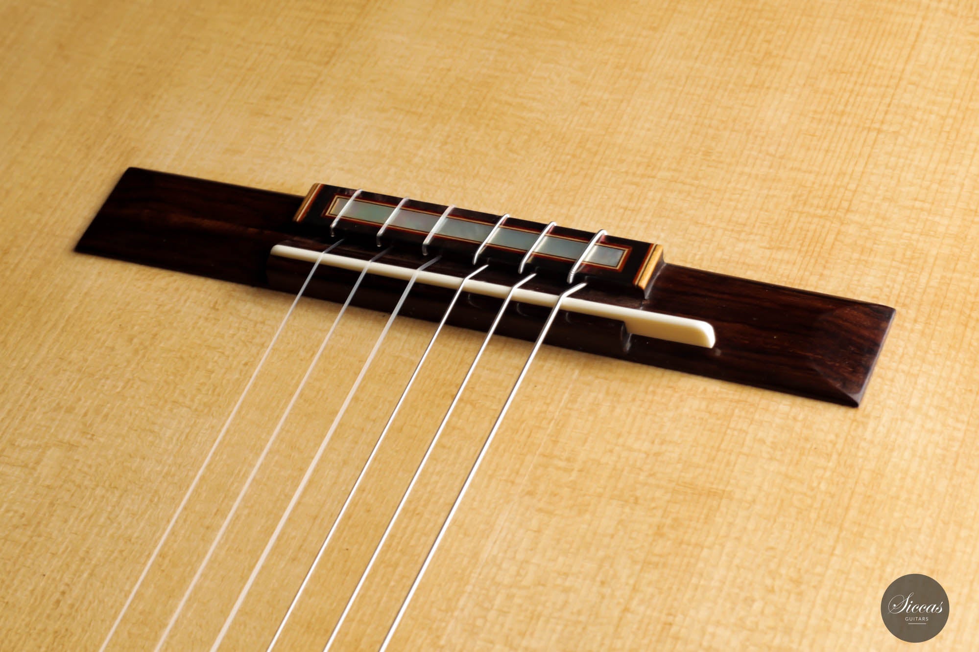 Tobias Braun ist einer der wenigen Gitarrenbauer, die eine lange Geschichte mit der Familie Romanillos haben. Dieses Instrument ist das Ergebnis eines hervorragenden Verständnisses von Joses Instrument, insbesondere der 2012 José L. Romanillos, auf der diese Gitarre basiert. Tobias ist es gelungen, mit diesem Instrument eine schöne Reminiszenz an das Original zu schaffen. Die wunderschöne Fichtendecke ist in Anlehnung an Josés Gitarren geschmackvoll verziert und auf höchstem handwerklichen Niveau ausgeführt. Der markante Boden und die Zargen aus indischem Palisander runden das Erscheinungsbild dieser Gitarre ab. Akustisch repräsentiert diese Gitarre die breite Farbpalette von José L. Romanillos' Gitarre. Und nicht nur das, sie hat auch das gleiche Spielgefühl wie das Original.