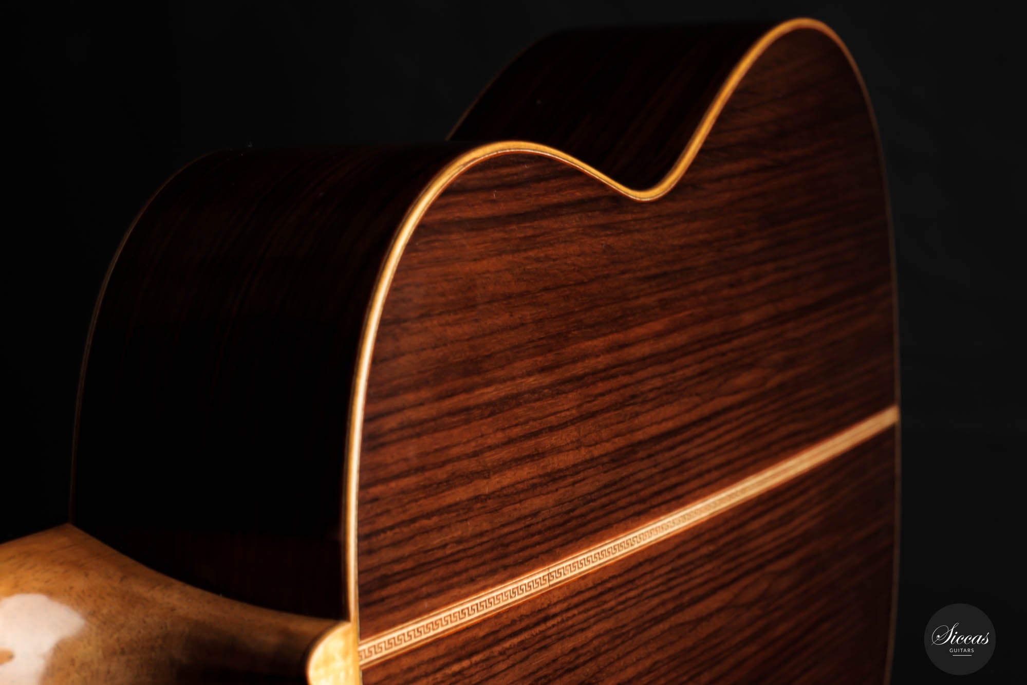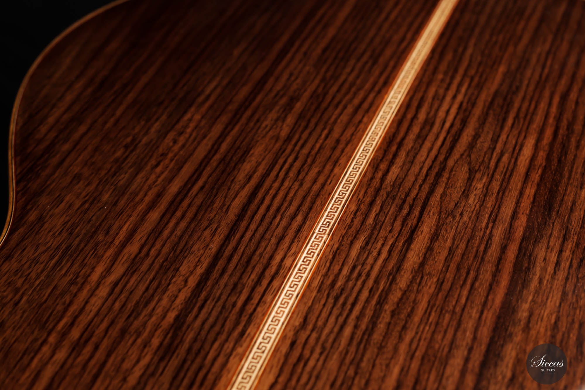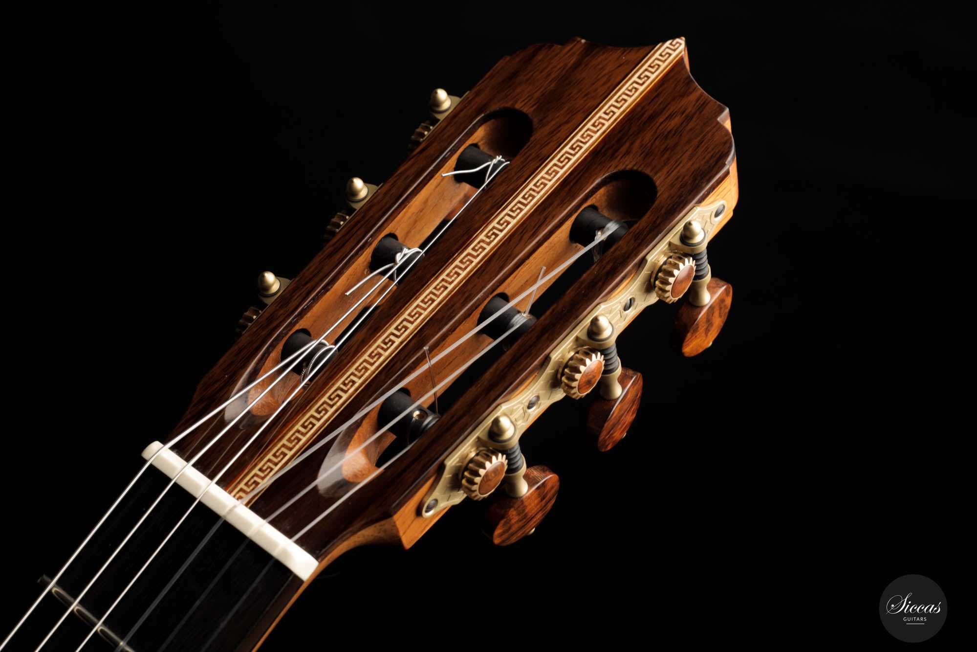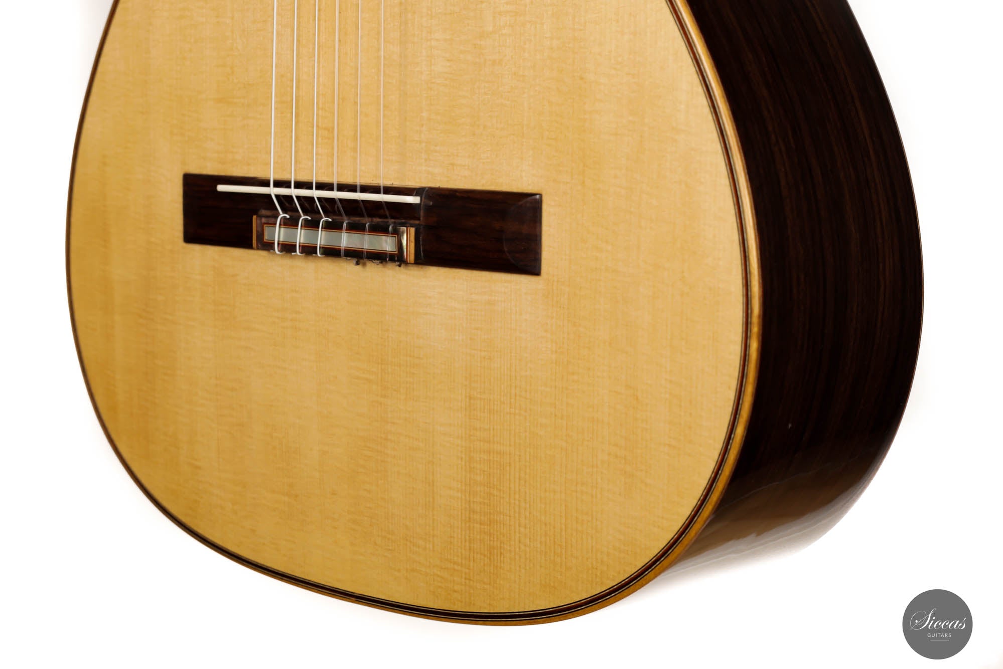 Tobias Braun ist einer der wenigen Gitarrenbauer, die eine lange Geschichte mit der Familie Romanillos haben. Dieses Instrument ist das Ergebnis eines hervorragenden Verständnisses von Joses Instrument, insbesondere der 2012 José L. Romanillos, auf der diese Gitarre basiert. Tobias ist es gelungen, mit diesem Instrument eine schöne Reminiszenz an das Original zu schaffen. Die wunderschöne Fichtendecke ist in Anlehnung an Josés Gitarren geschmackvoll verziert und auf höchstem handwerklichen Niveau ausgeführt. Der markante Boden und die Zargen aus indischem Palisander runden das Erscheinungsbild dieser Gitarre ab. Akustisch repräsentiert diese Gitarre die breite Farbpalette von José L. Romanillos' Gitarre. Und nicht nur das, sie hat auch das gleiche Spielgefühl wie das Original.