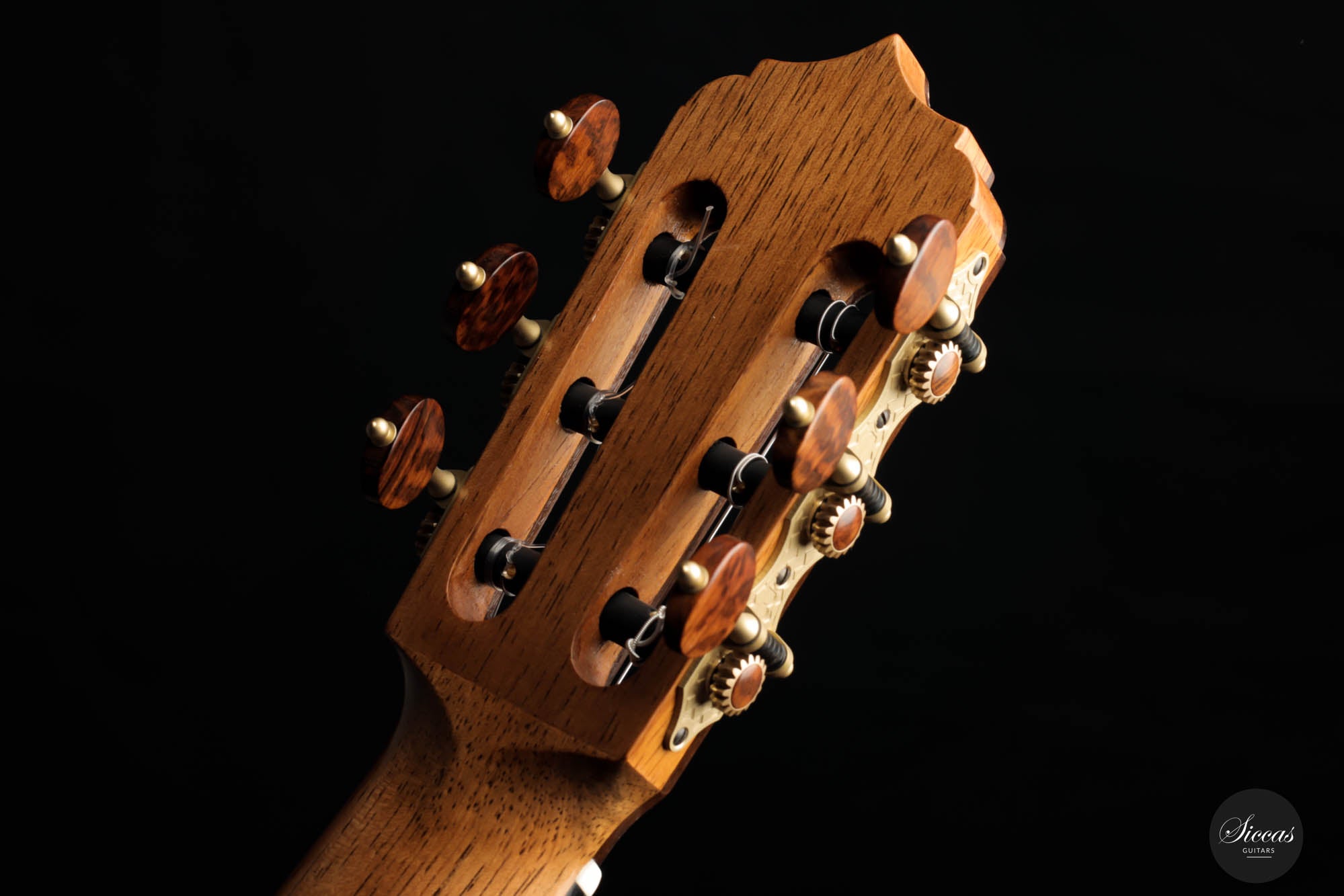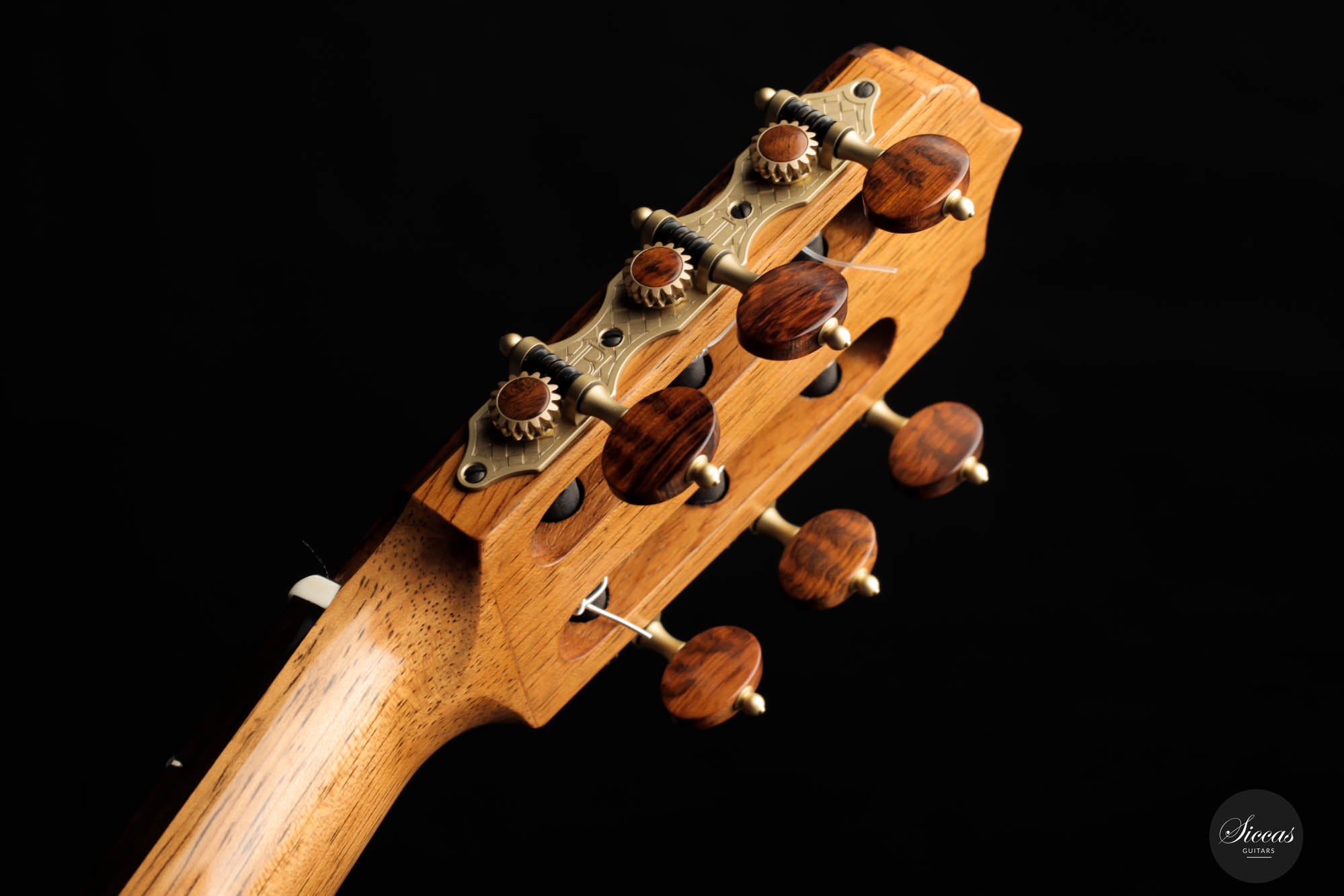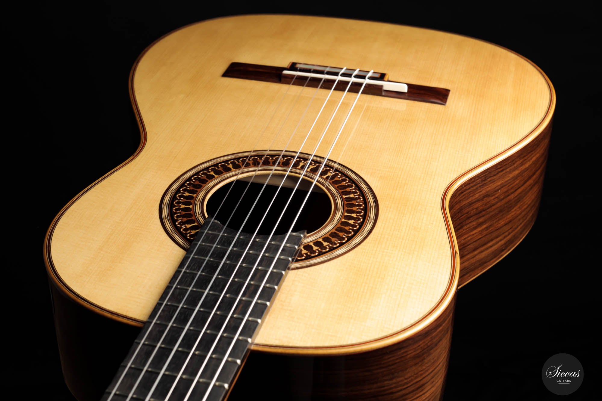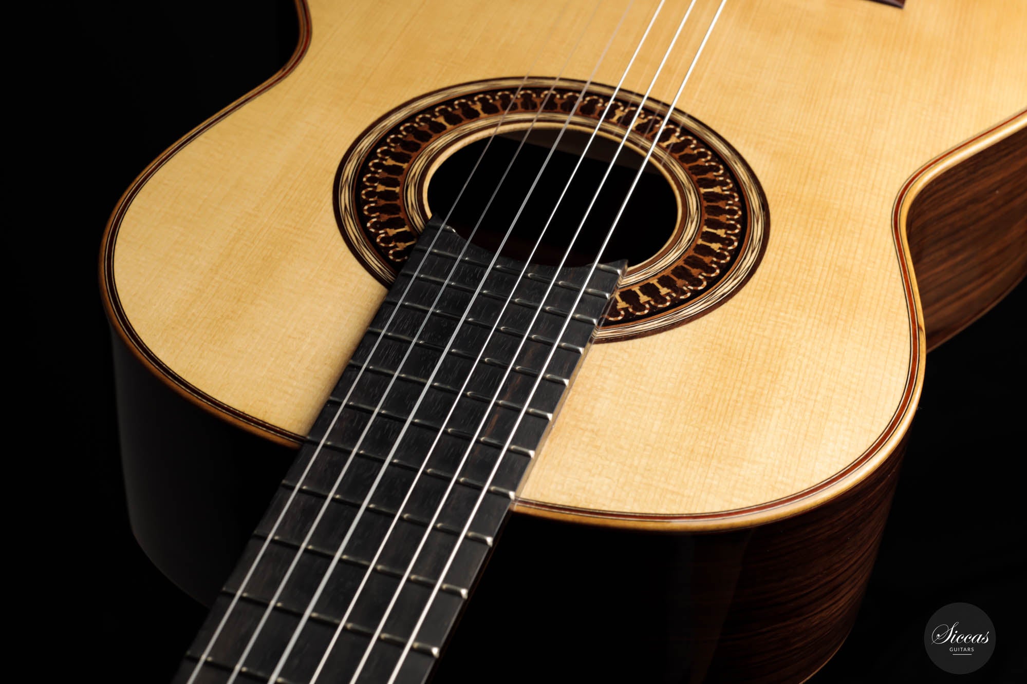 Tobias Braun ist einer der wenigen Gitarrenbauer, die eine lange Geschichte mit der Familie Romanillos haben. Dieses Instrument ist das Ergebnis eines hervorragenden Verständnisses von Joses Instrument, insbesondere der 2012 José L. Romanillos, auf der diese Gitarre basiert. Tobias ist es gelungen, mit diesem Instrument eine schöne Reminiszenz an das Original zu schaffen. Die wunderschöne Fichtendecke ist in Anlehnung an Josés Gitarren geschmackvoll verziert und auf höchstem handwerklichen Niveau ausgeführt. Der markante Boden und die Zargen aus indischem Palisander runden das Erscheinungsbild dieser Gitarre ab. Akustisch repräsentiert diese Gitarre die breite Farbpalette von José L. Romanillos' Gitarre. Und nicht nur das, sie hat auch das gleiche Spielgefühl wie das Original.