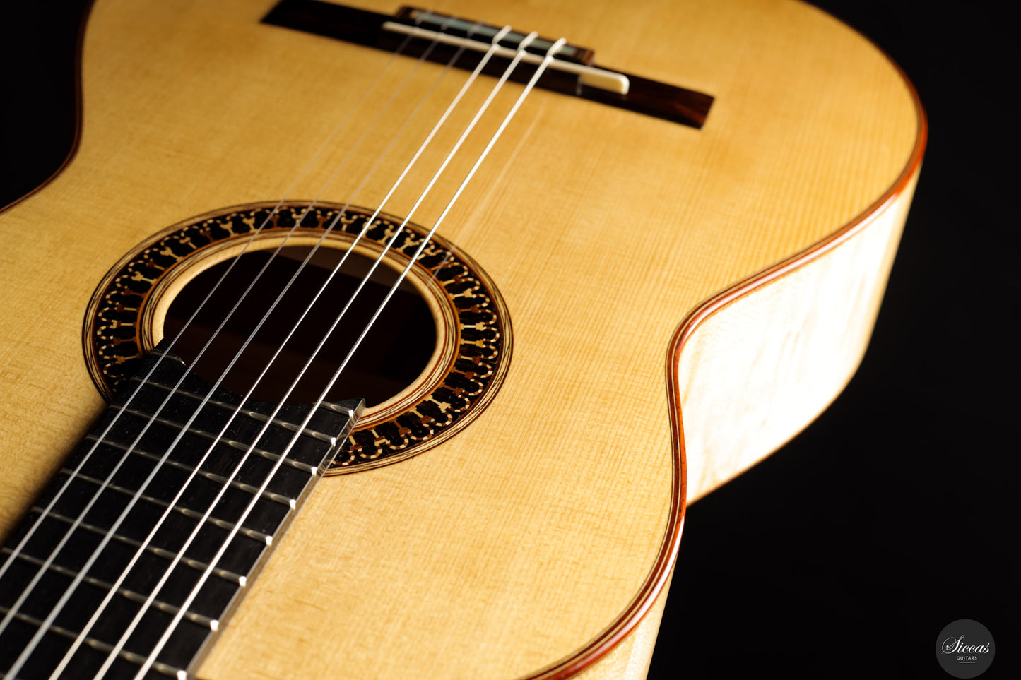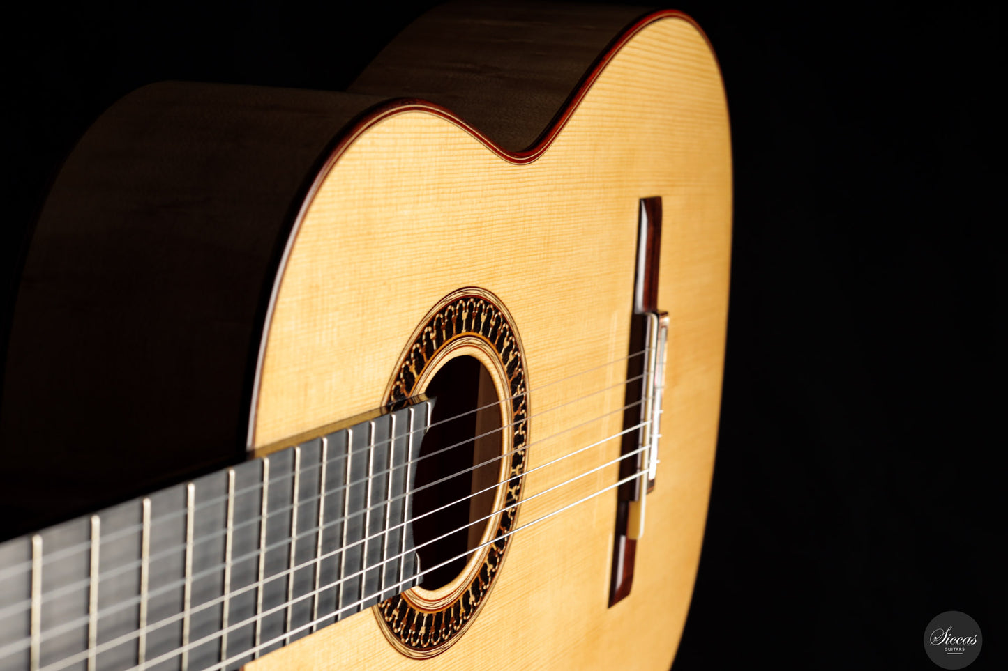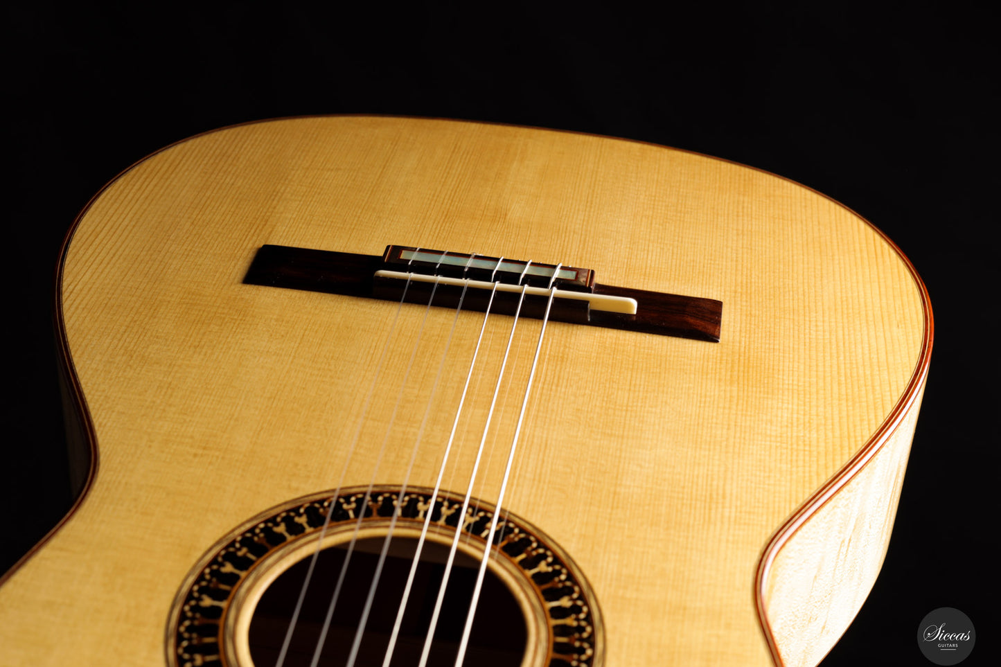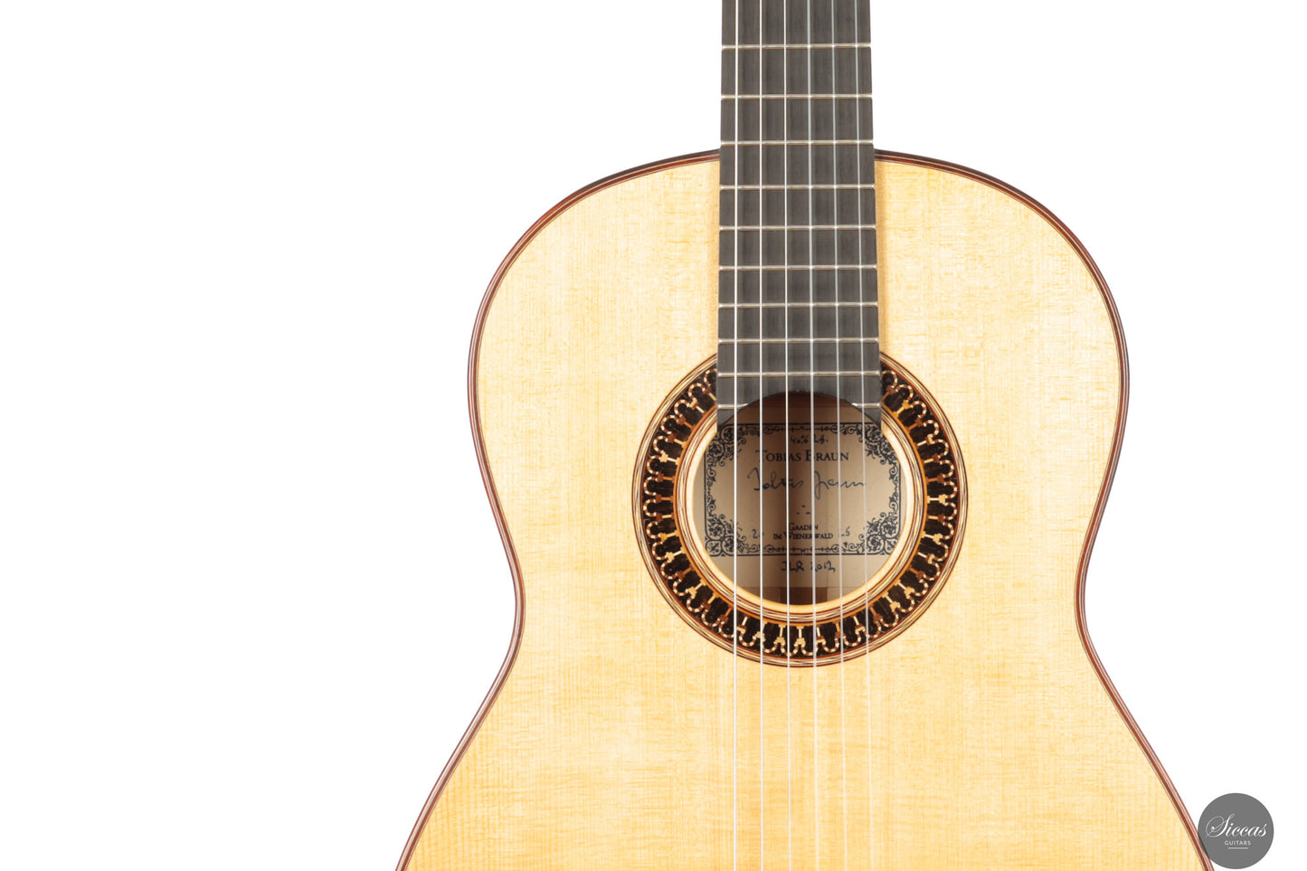 Die Bässe sind tief und voll, während die Höhen seidig weich und geschmeidig klingen. Die Gitarre bietet eine enorme Klangfarbenvielfalt und lädt die Spielerin oder den Spieler dazu ein, sie voll auszuschöpfen. Dank ihrer hohen Ansprache ist sie zudem ausgesprochen angenehm zu spielen. Wie bei Tobias Braun zu erwarten, besteht die Decke aus erstklassiger Fichte – ein weiteres Merkmal dieses außergewöhnlichen Instruments.