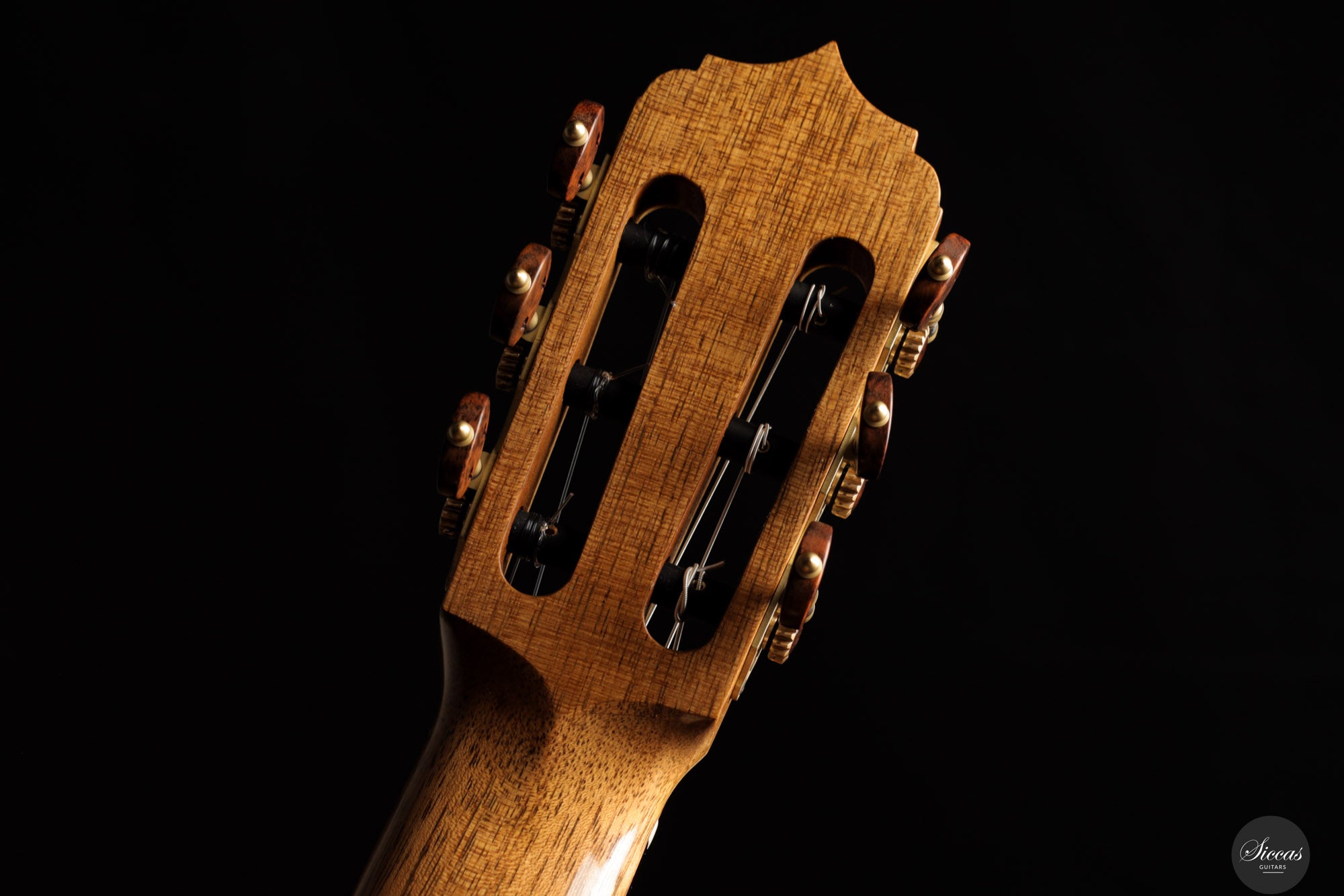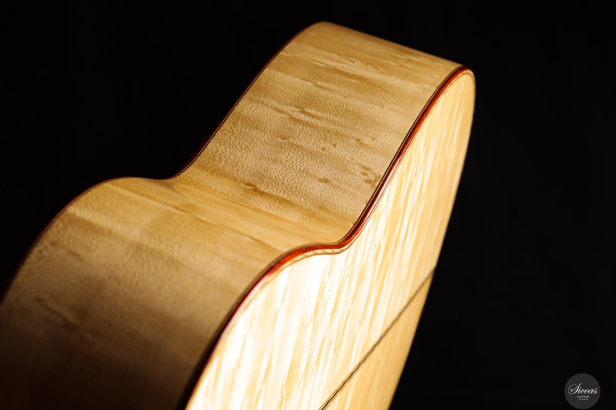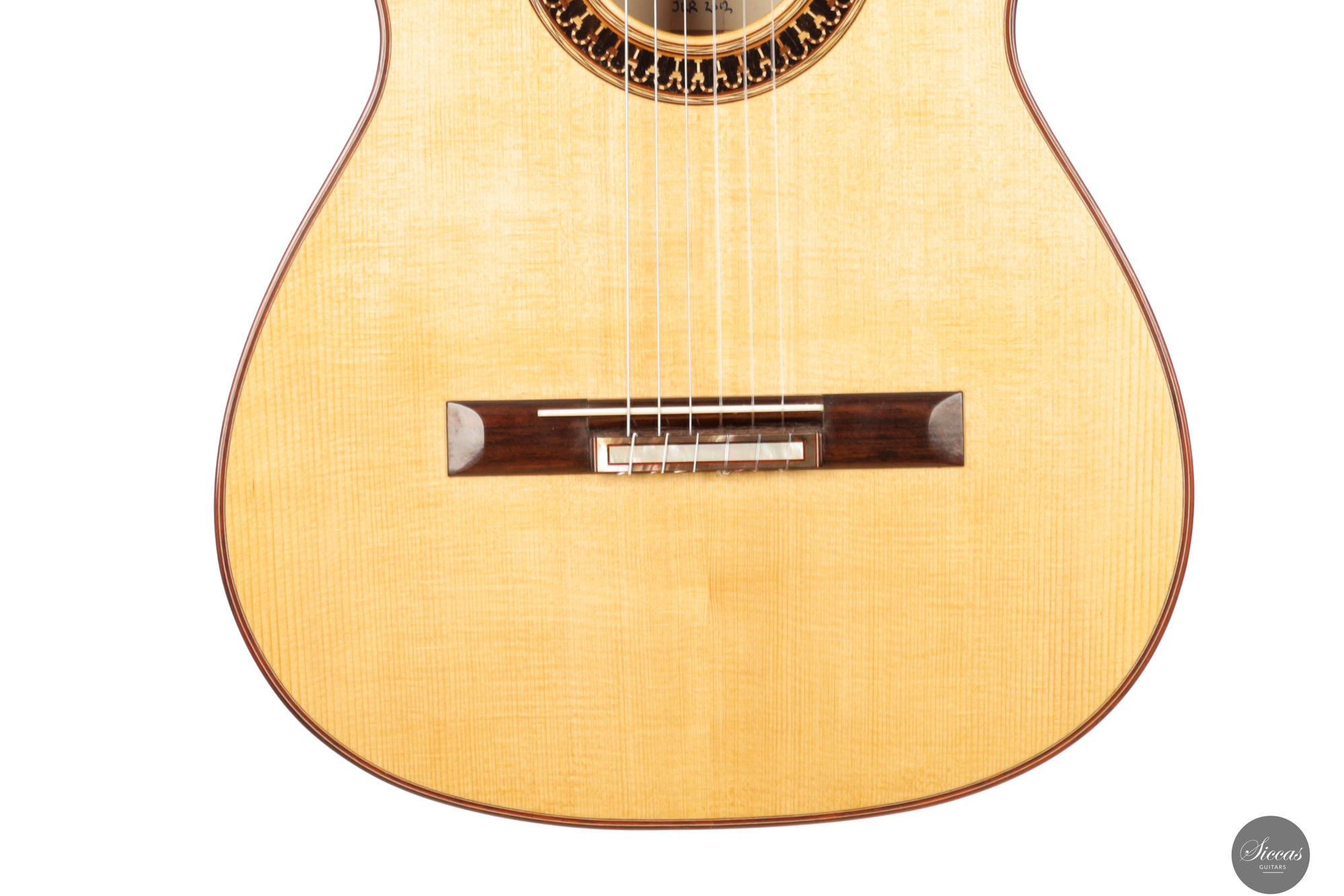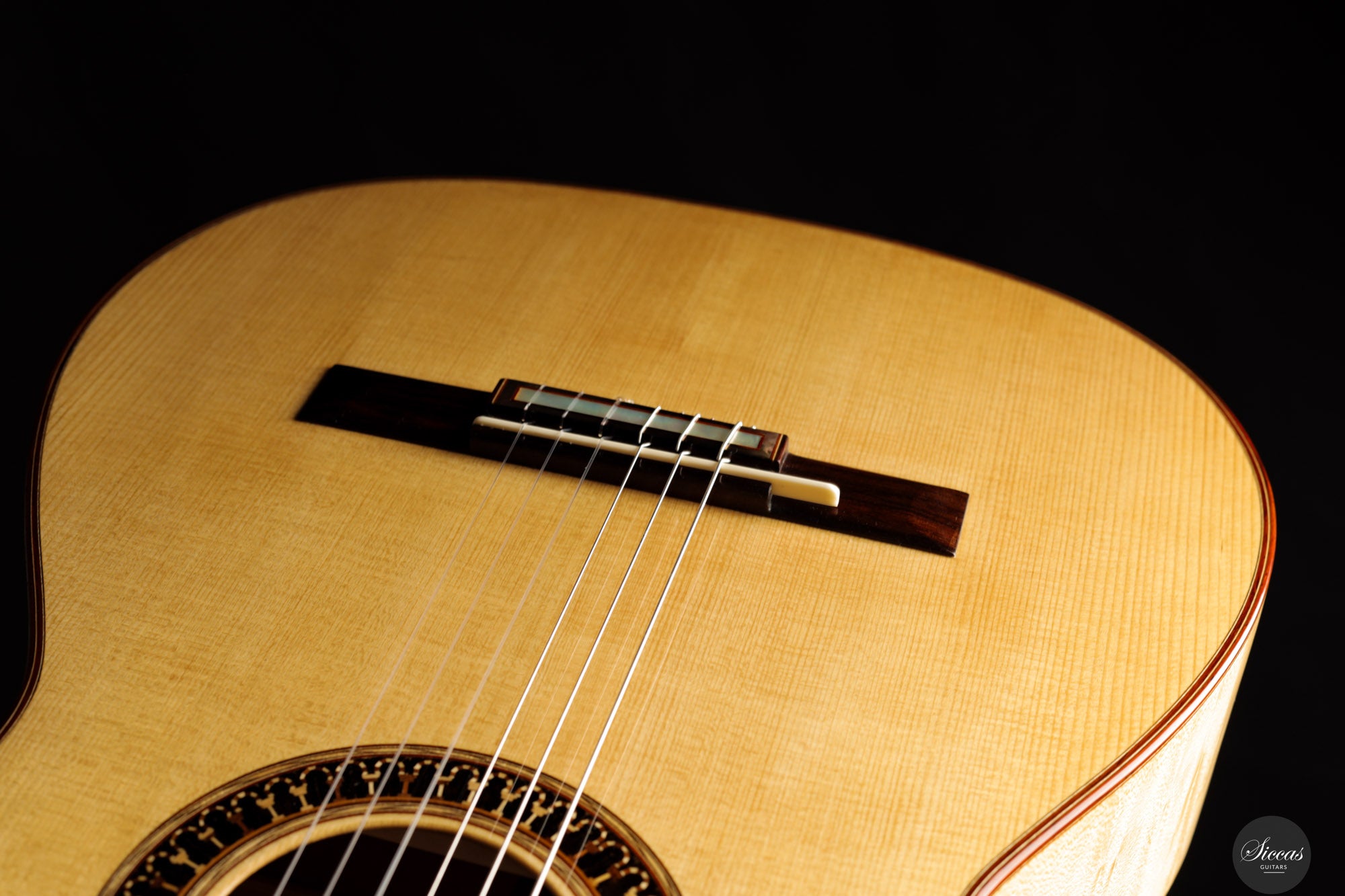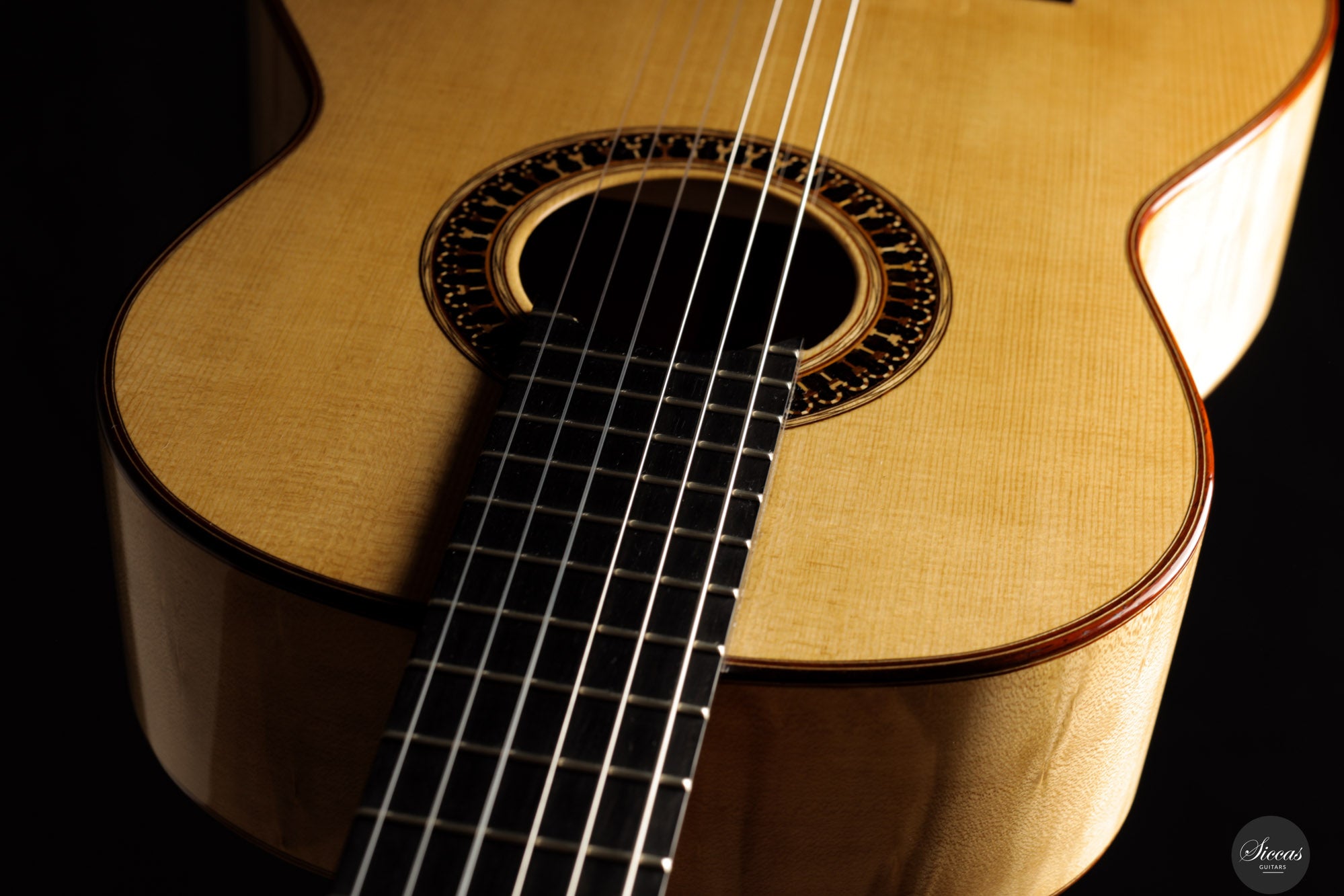 Die Bässe sind tief und voll, während die Höhen seidig weich und geschmeidig klingen. Die Gitarre bietet eine enorme Klangfarbenvielfalt und lädt die Spielerin oder den Spieler dazu ein, sie voll auszuschöpfen. Dank ihrer hohen Ansprache ist sie zudem ausgesprochen angenehm zu spielen. Wie bei Tobias Braun zu erwarten, besteht die Decke aus erstklassiger Fichte – ein weiteres Merkmal dieses außergewöhnlichen Instruments.