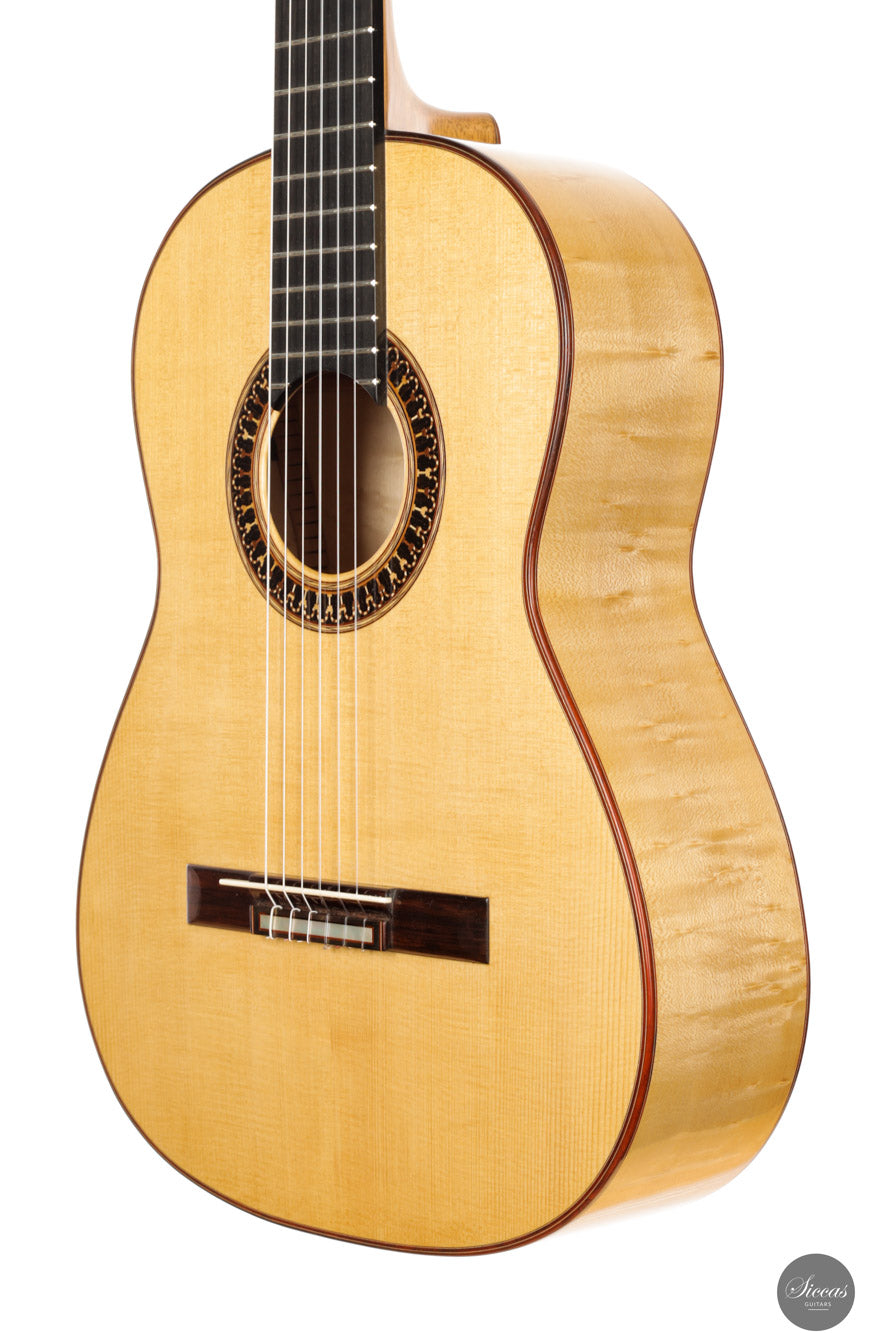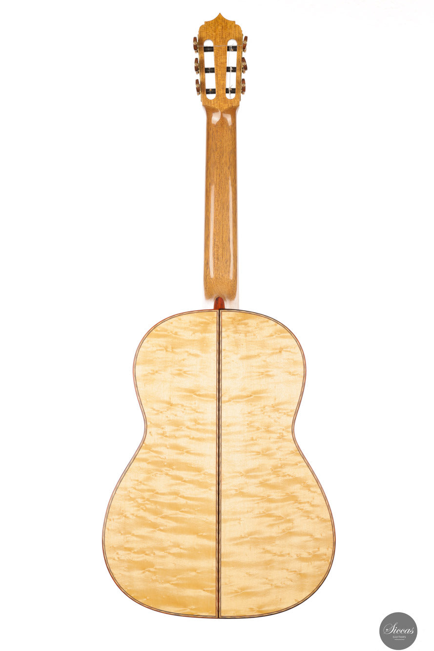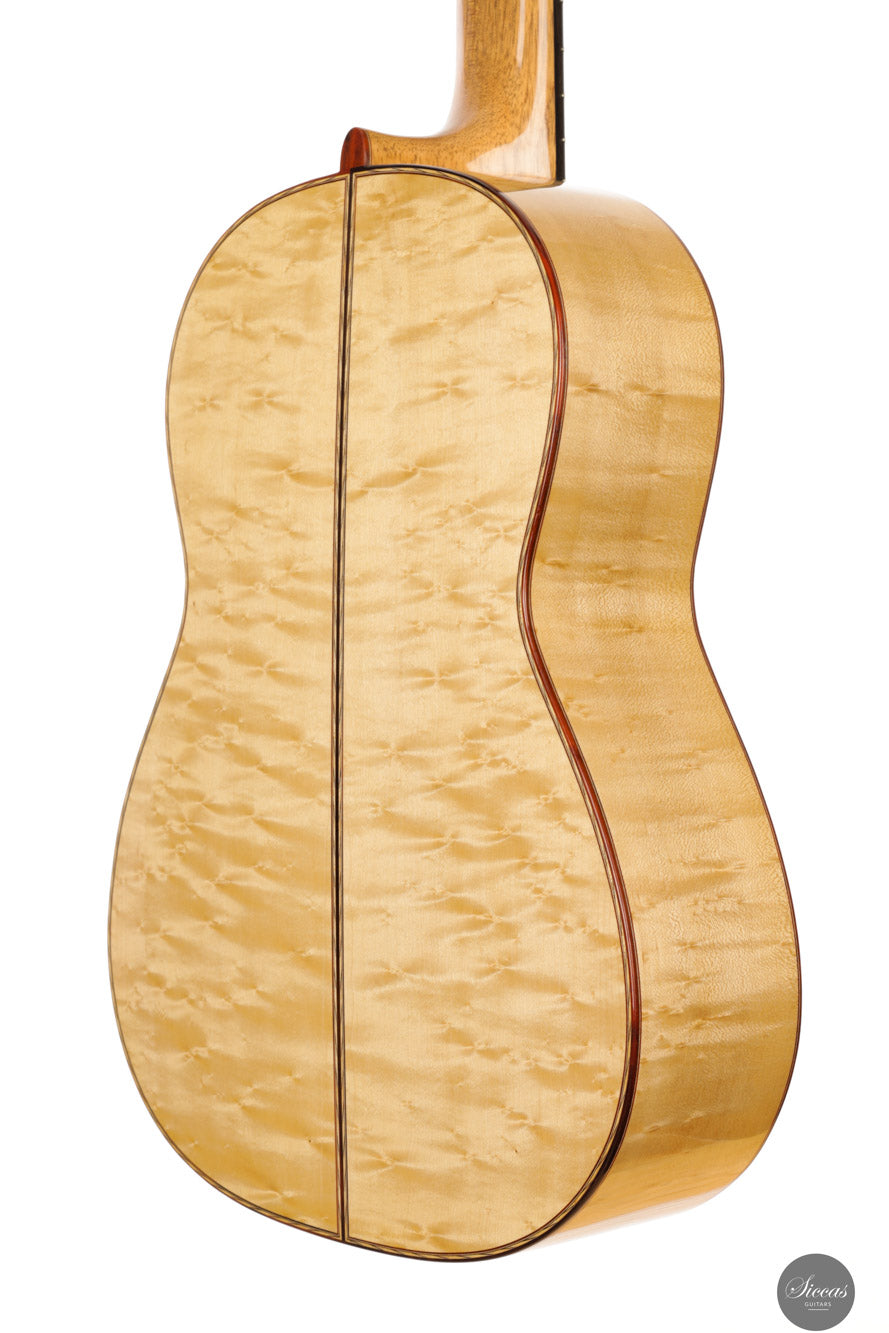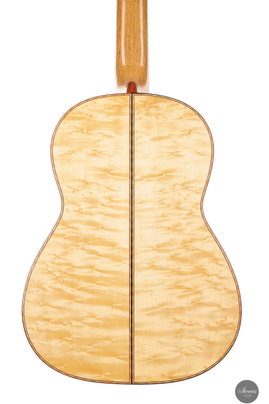 Das Romanillos-Modell von Tobias Braun mit Boden und Zargen aus Vogelaugenahorn erfreut sich derzeit großer Beliebtheit – und das aus gutem Grund. Diese Gitarre fängt nicht nur die Seele eines Romanillos-Instruments ein, sondern zeigt auch Tobias Brauns beeindruckende Interpretation einer erstklassigen Konzertgitarre.