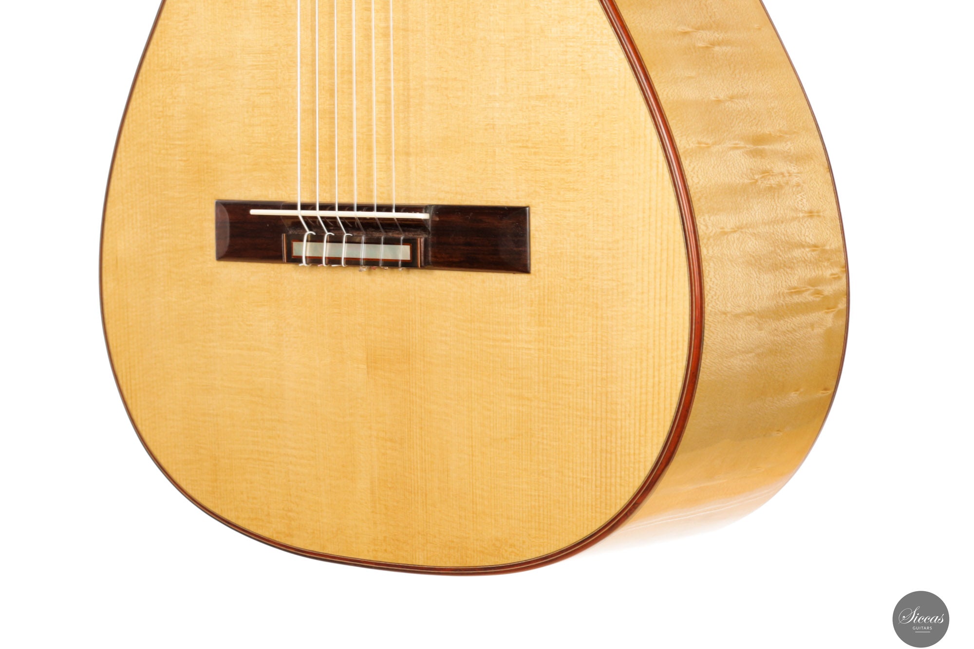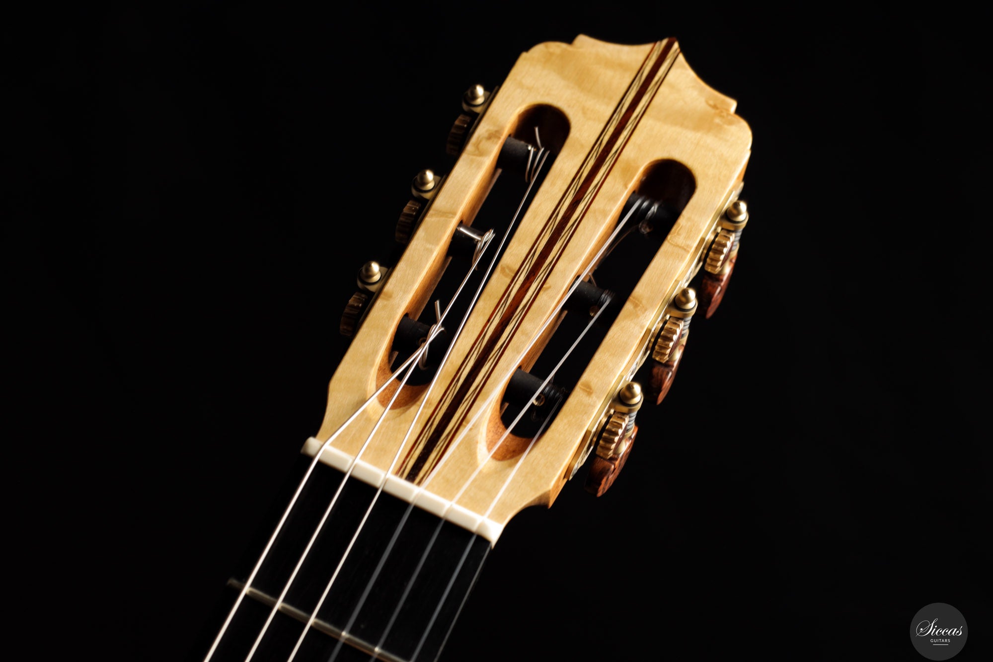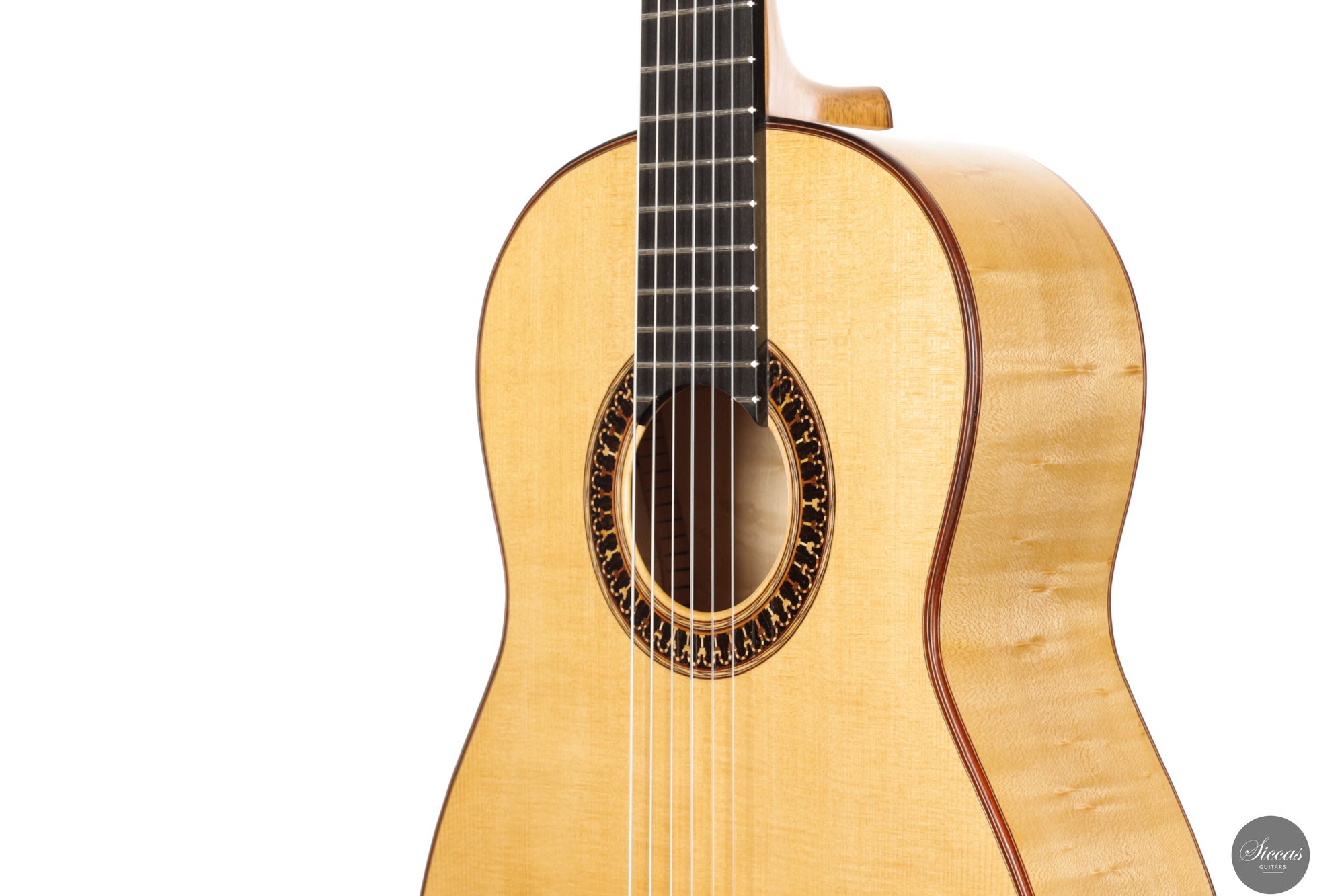 Das Romanillos-Modell von Tobias Braun mit Boden und Zargen aus Vogelaugenahorn erfreut sich derzeit großer Beliebtheit – und das aus gutem Grund. Diese Gitarre fängt nicht nur die Seele eines Romanillos-Instruments ein, sondern zeigt auch Tobias Brauns beeindruckende Interpretation einer erstklassigen Konzertgitarre.