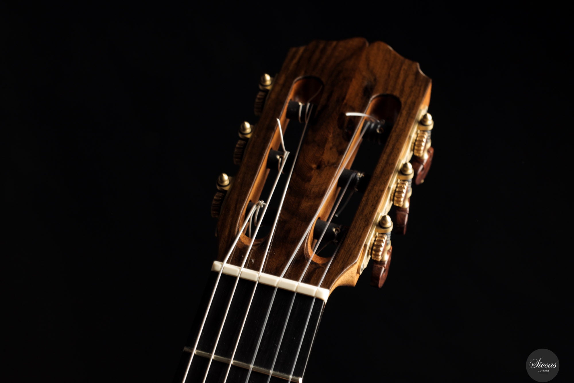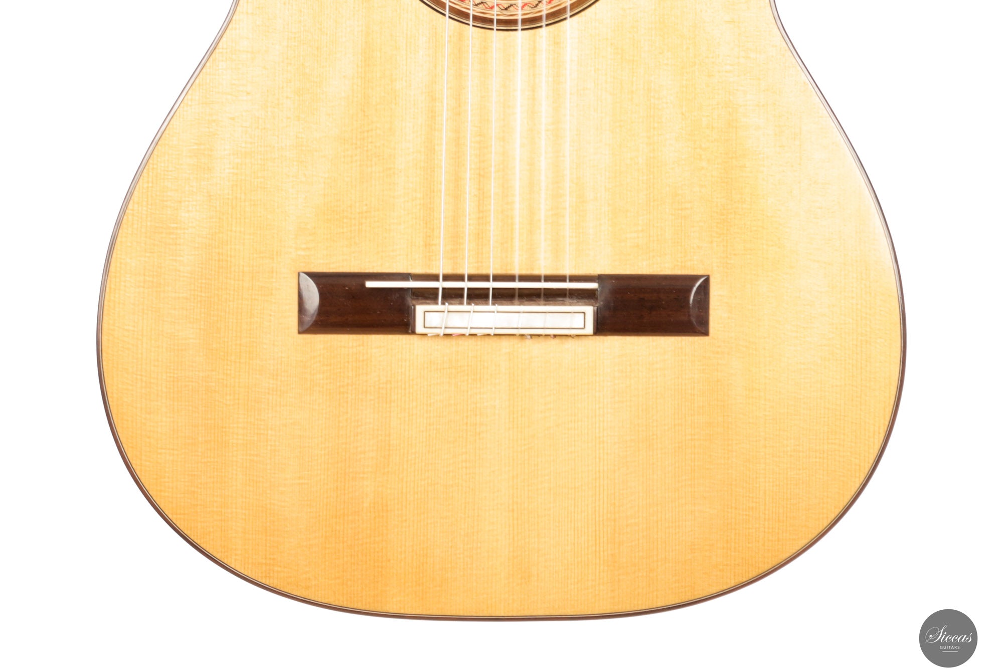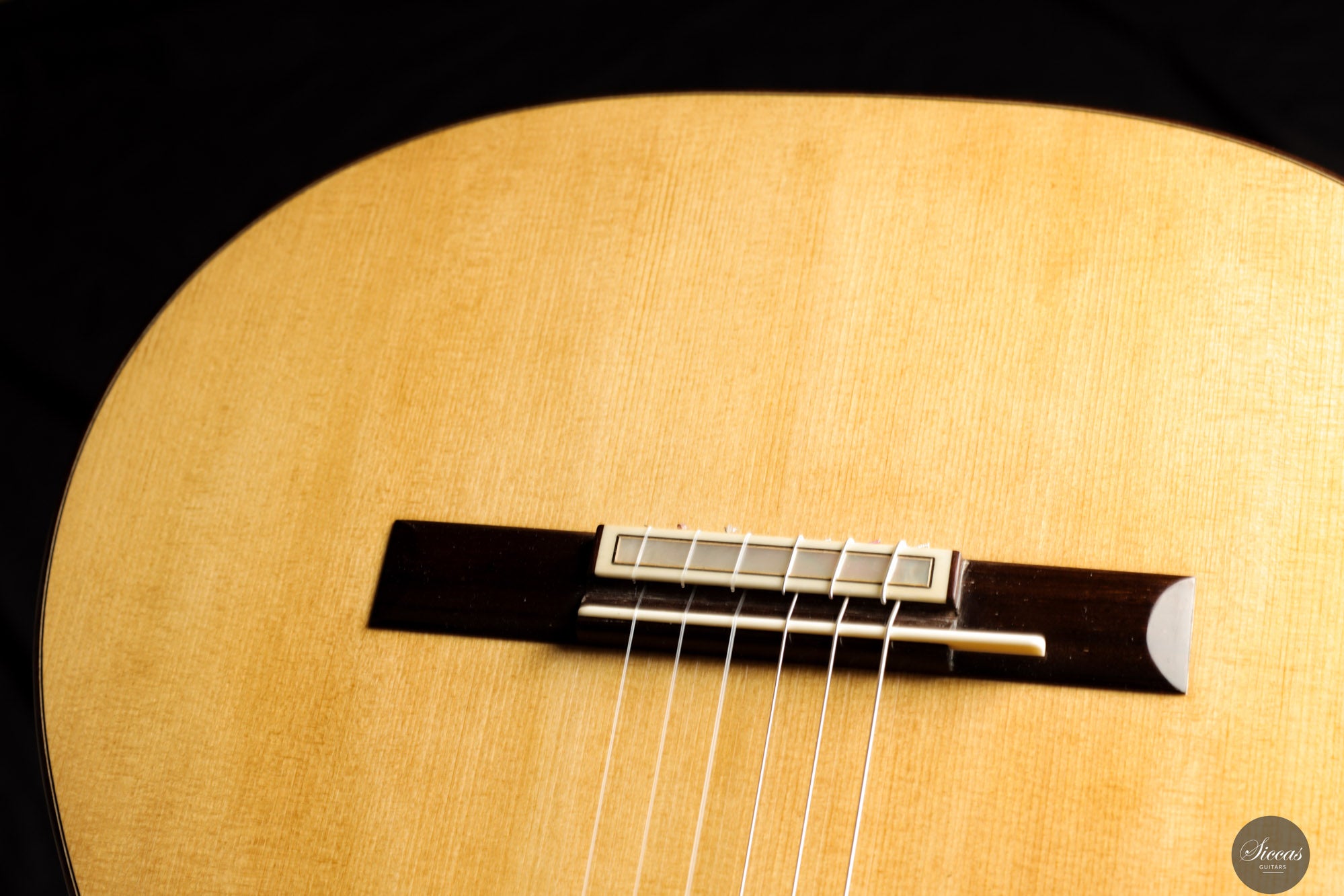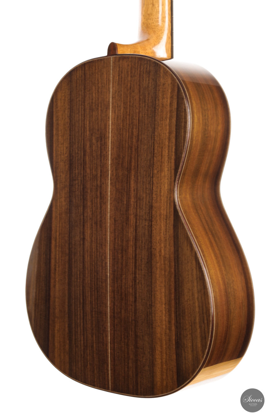 Diese Gitarre, gebaut im Jahr 2025 von Tobias Braun, ist eine Hommage an die Santos Hernandez Gitarre von 1924, die einst der österreichischen Gitarristin Luise Walker gehörte. Ihr Lehrer Miguel Llobet brachte ihr dieses Instrument 1924 persönlich aus der Werkstatt von Santos Hernandez nach Wien. Braun führt mit diesem Modell seine Tradition historisch informierten Gitarrenbaus konsequent fort. Die Fichtendecke besticht durch ihre feine Maserung, während Boden und Zargen aus indischem Palisander eine klare und fokussierte Klangprojektion unterstützen. Das Klangbild ist ausgewogen über alle Register. Die Bässe sind warm und voluminös, die Diskantseiten klingen klar und gesanglich, und der Mitteltonbereich ist farbig und resonant. Trotz einer Mensur von 656 mm und einer Sattelbreite von 52 mm bietet die Gitarre weiterhin eine komfortable Bespielbarkeit. Dieses Instrument richtet sich an Konzertgitarristen, Sammler und Liebhaber, die eine moderne Gitarre mit historischer Authentizität suchen.