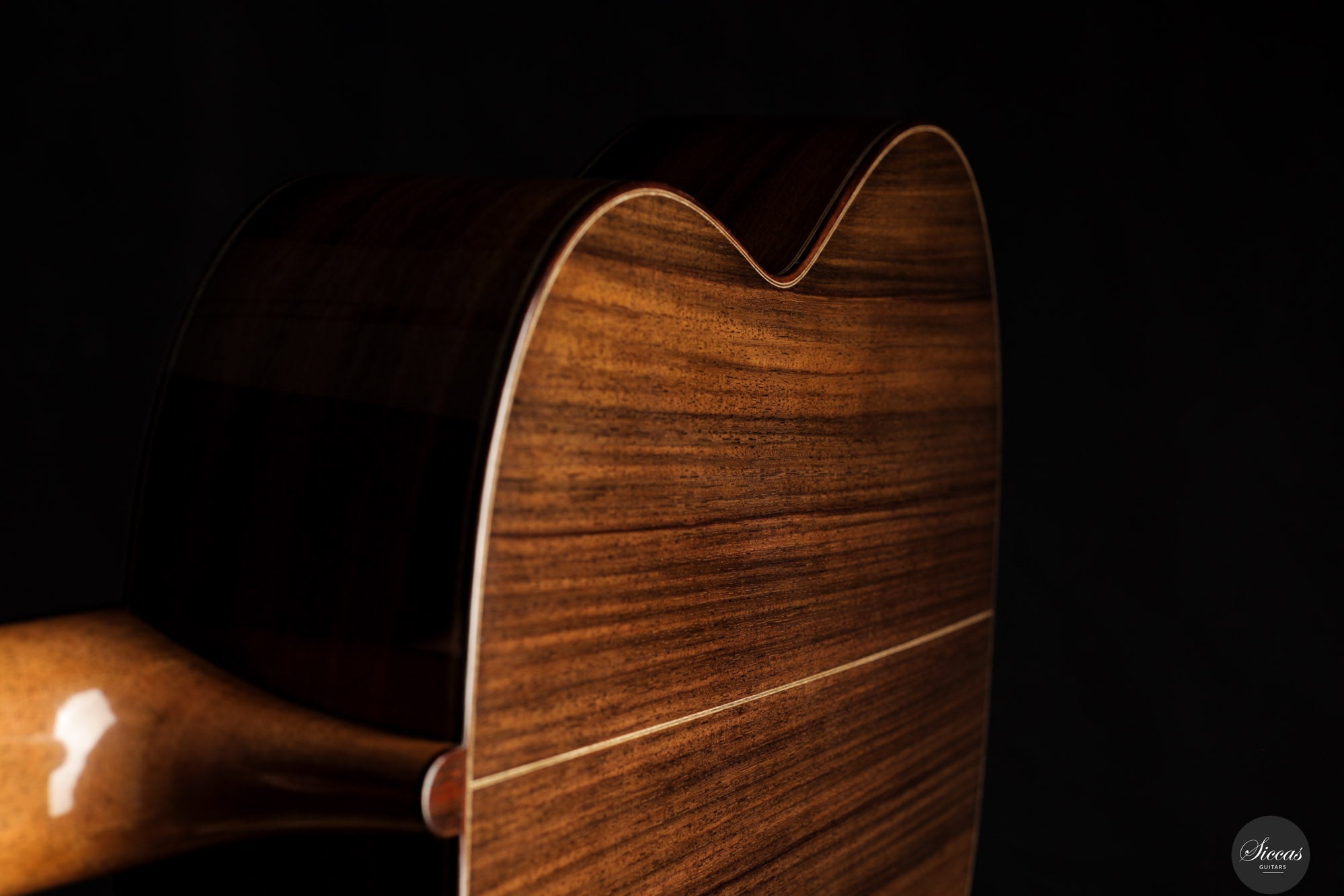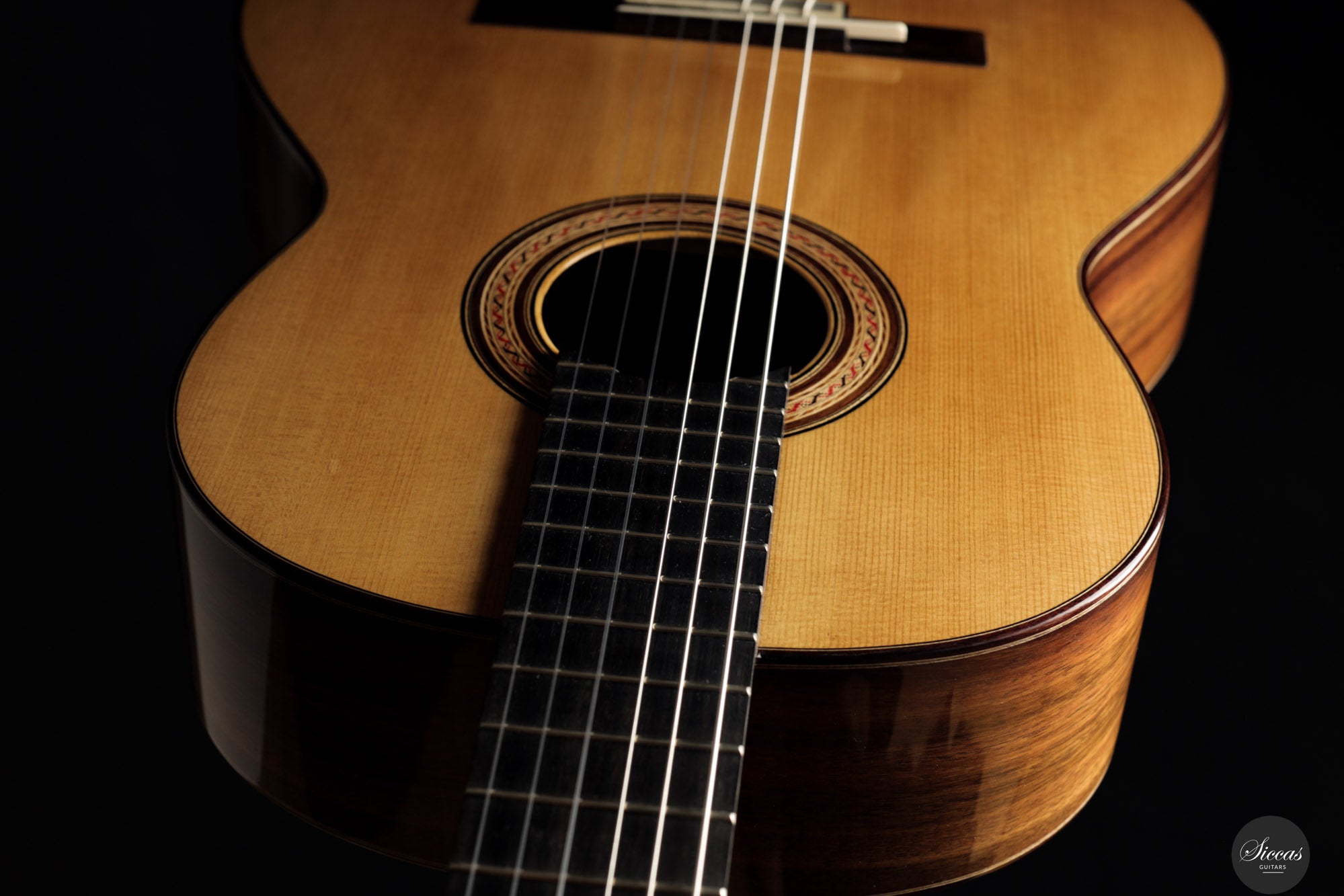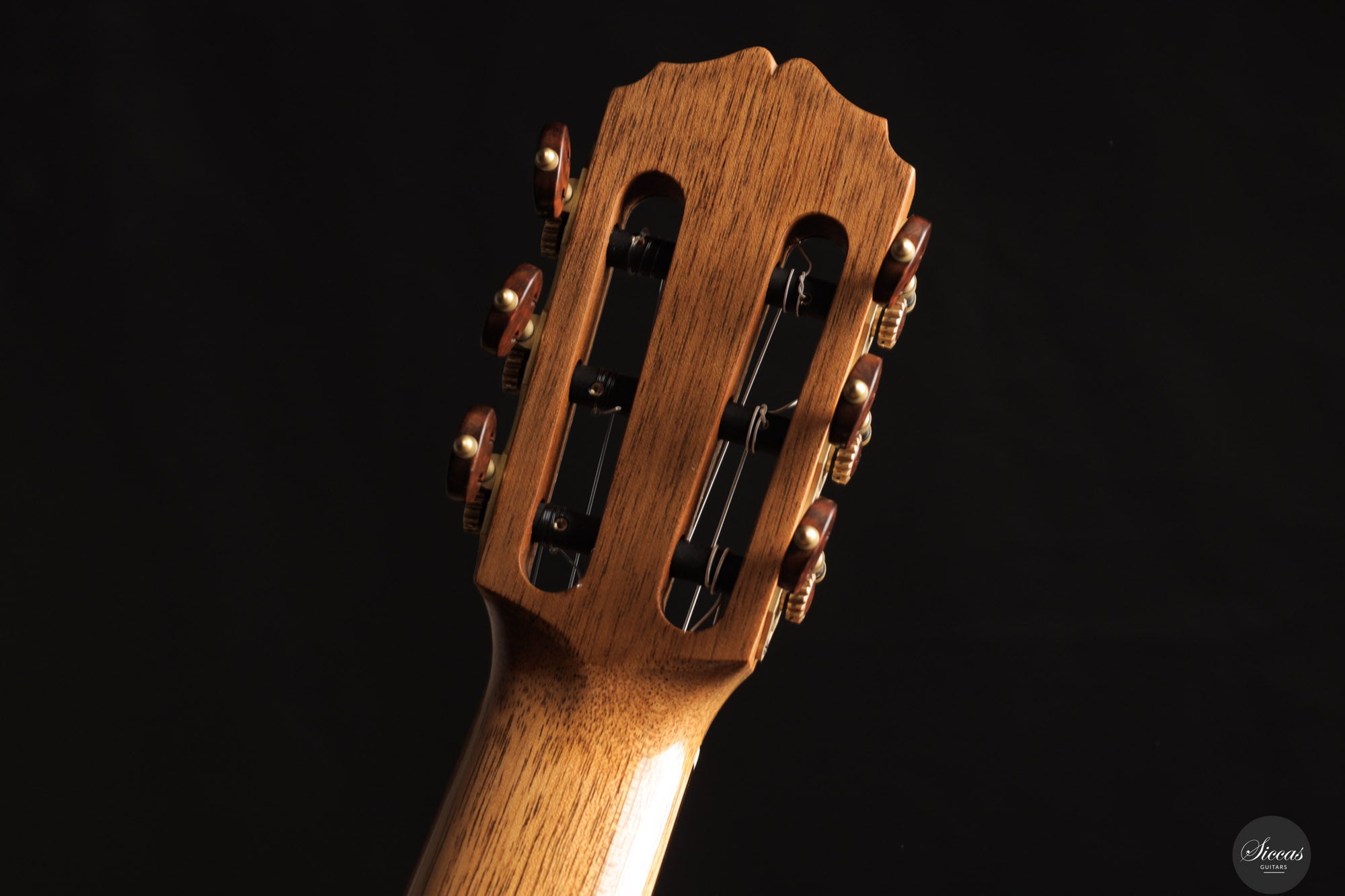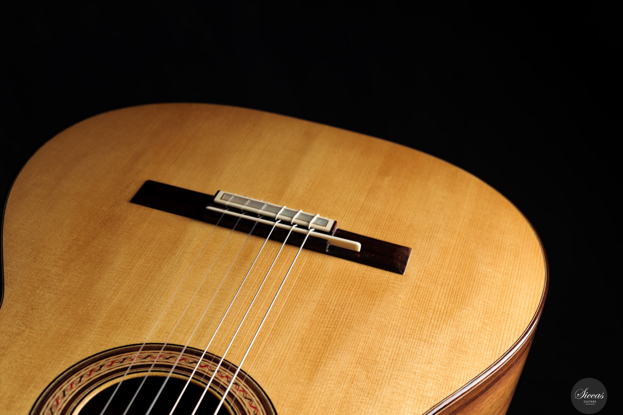 Diese Gitarre, gebaut im Jahr 2025 von Tobias Braun, ist eine Hommage an die Santos Hernandez Gitarre von 1924, die einst der österreichischen Gitarristin Luise Walker gehörte. Ihr Lehrer Miguel Llobet brachte ihr dieses Instrument 1924 persönlich aus der Werkstatt von Santos Hernandez nach Wien. Braun führt mit diesem Modell seine Tradition historisch informierten Gitarrenbaus konsequent fort. Die Fichtendecke besticht durch ihre feine Maserung, während Boden und Zargen aus indischem Palisander eine klare und fokussierte Klangprojektion unterstützen. Das Klangbild ist ausgewogen über alle Register. Die Bässe sind warm und voluminös, die Diskantseiten klingen klar und gesanglich, und der Mitteltonbereich ist farbig und resonant. Trotz einer Mensur von 656 mm und einer Sattelbreite von 52 mm bietet die Gitarre weiterhin eine komfortable Bespielbarkeit. Dieses Instrument richtet sich an Konzertgitarristen, Sammler und Liebhaber, die eine moderne Gitarre mit historischer Authentizität suchen.