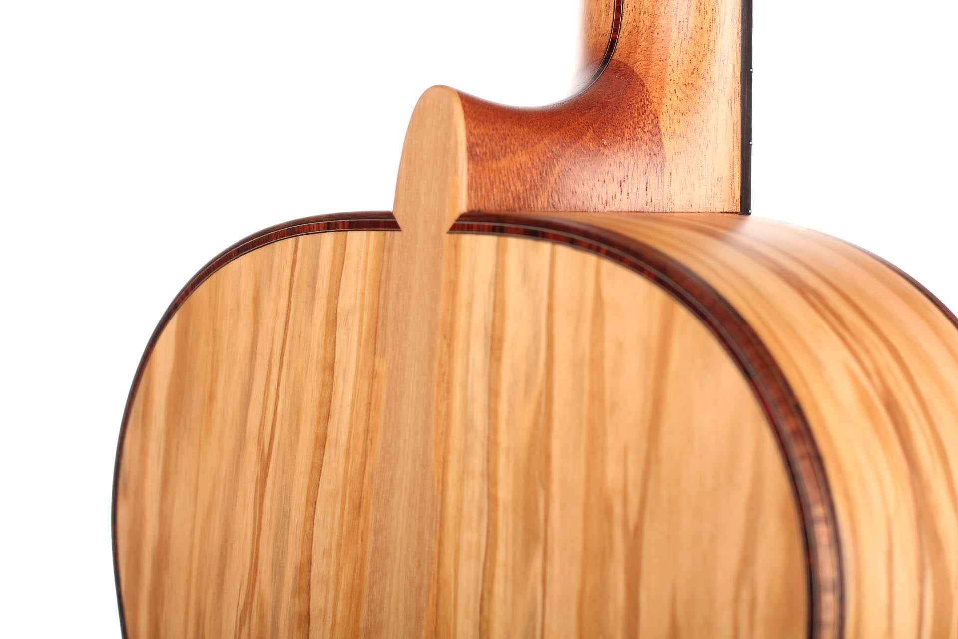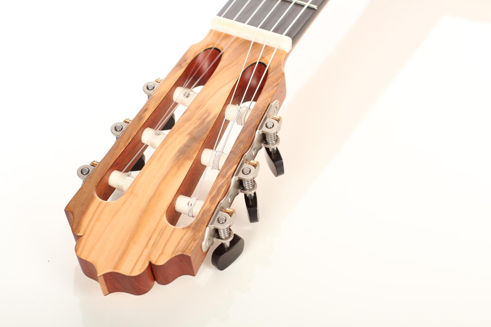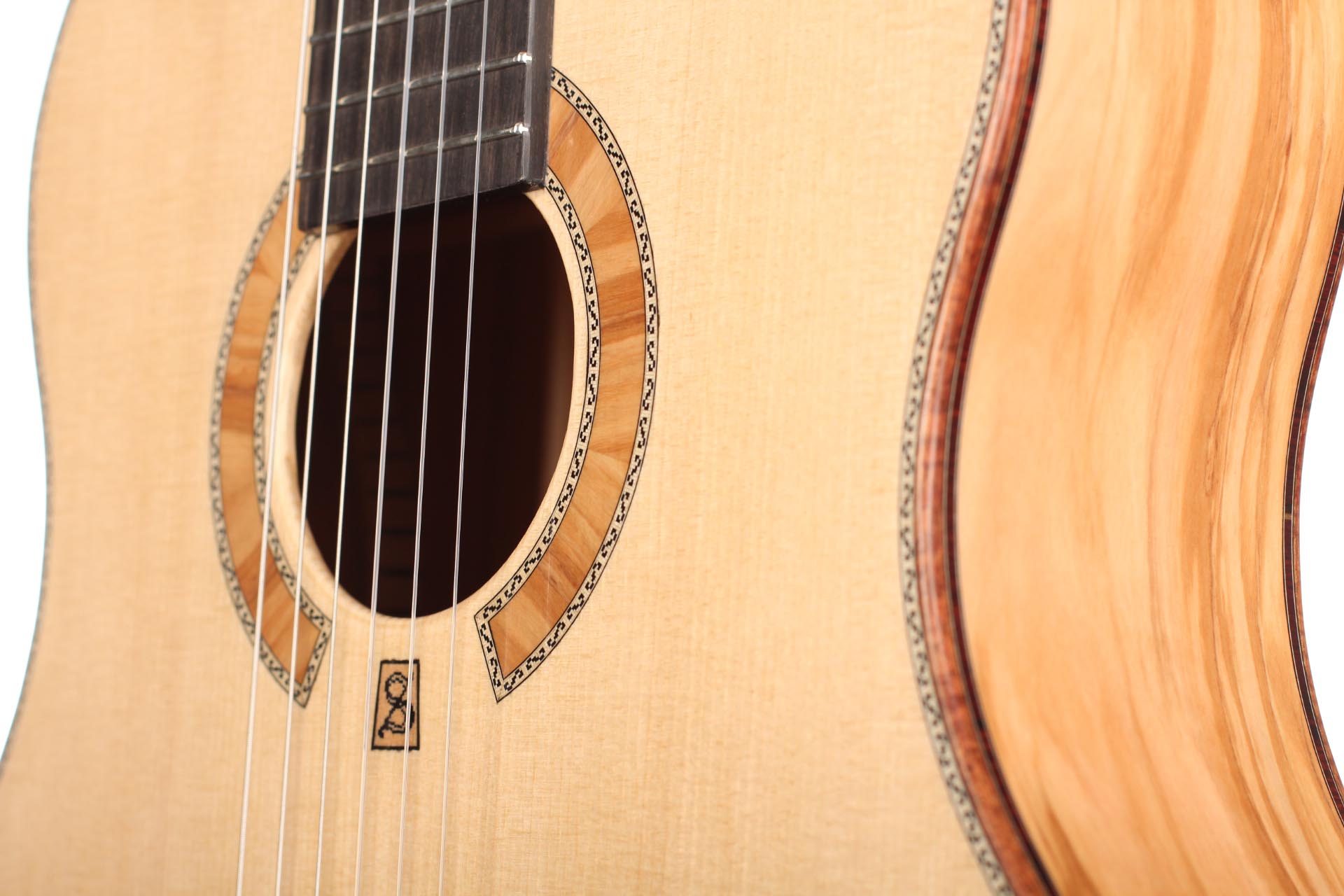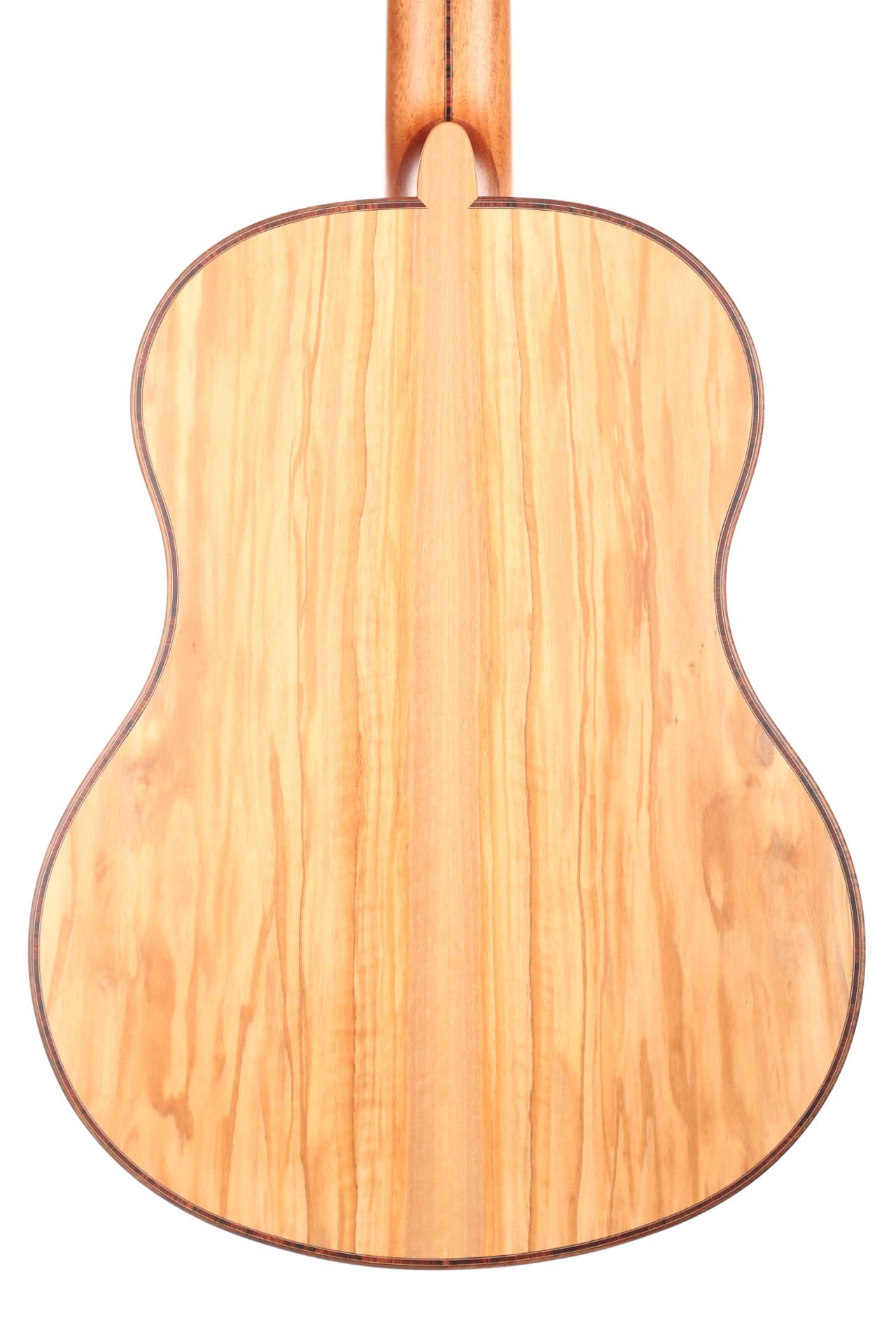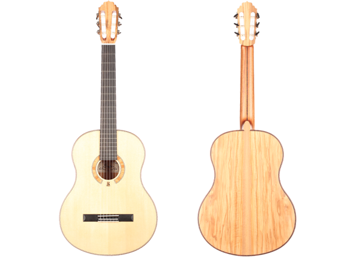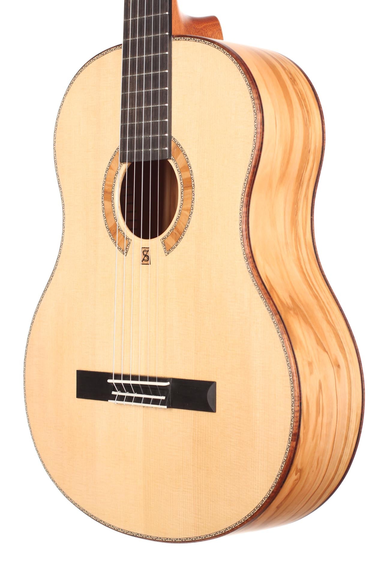 Diese neue Gitarre wurde von Tobias Straßer gebaut. Boden und Zargen sind aus wunderschönem Olivenholz gefertigt - die Decke ist aus Fichtenholz. Die Bässe sind voll und warm und der Diskant singt lebhaft. Die erste Deckenresonanz liegt zwischen F# und G. Boden und Zargen sind matt lackiert während die Decke mit einer Schellackpolitur veredelt wurde. Die Mechaniken sind von Schaller. Ein Hiscox Pro II Koffer ist inklusive.