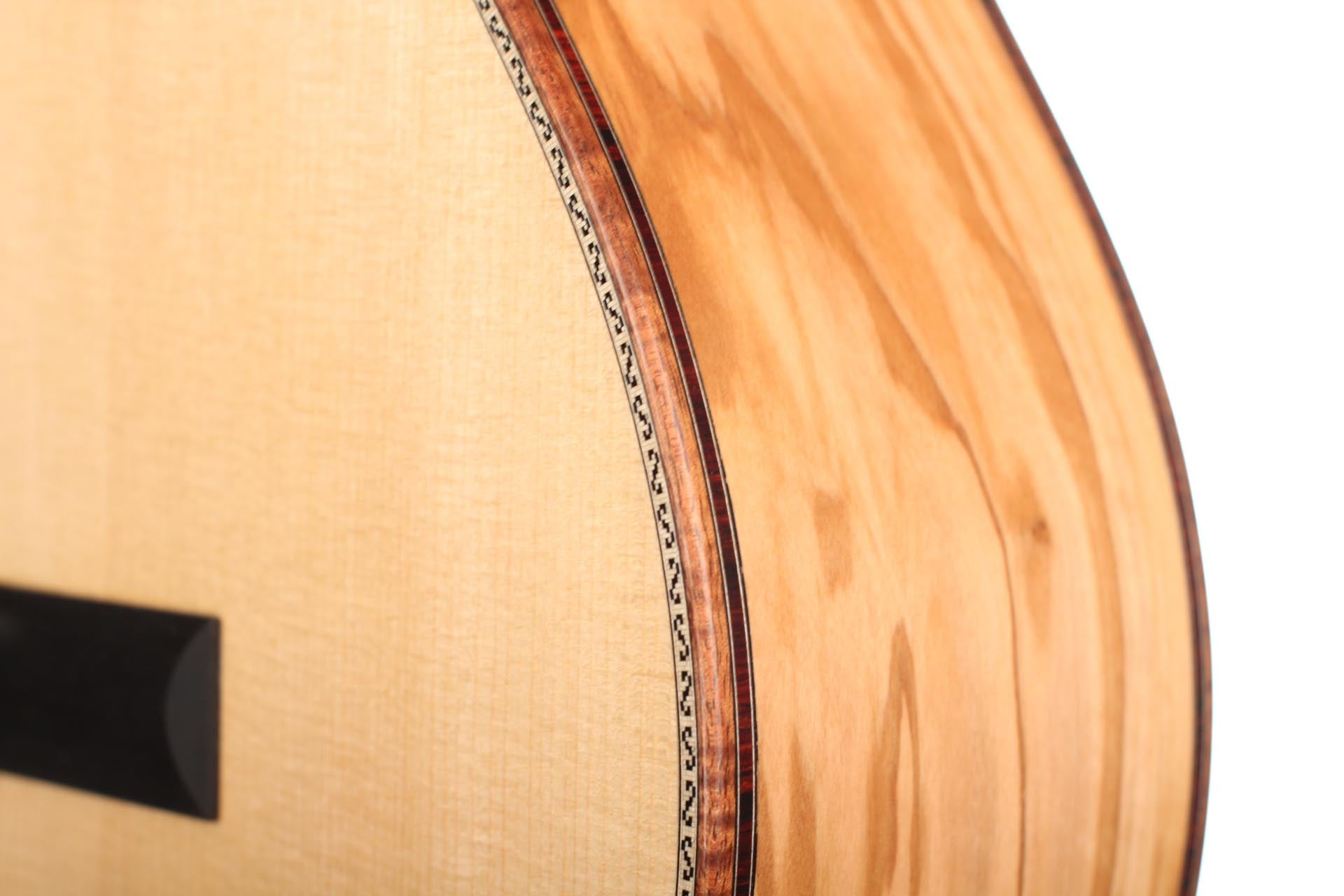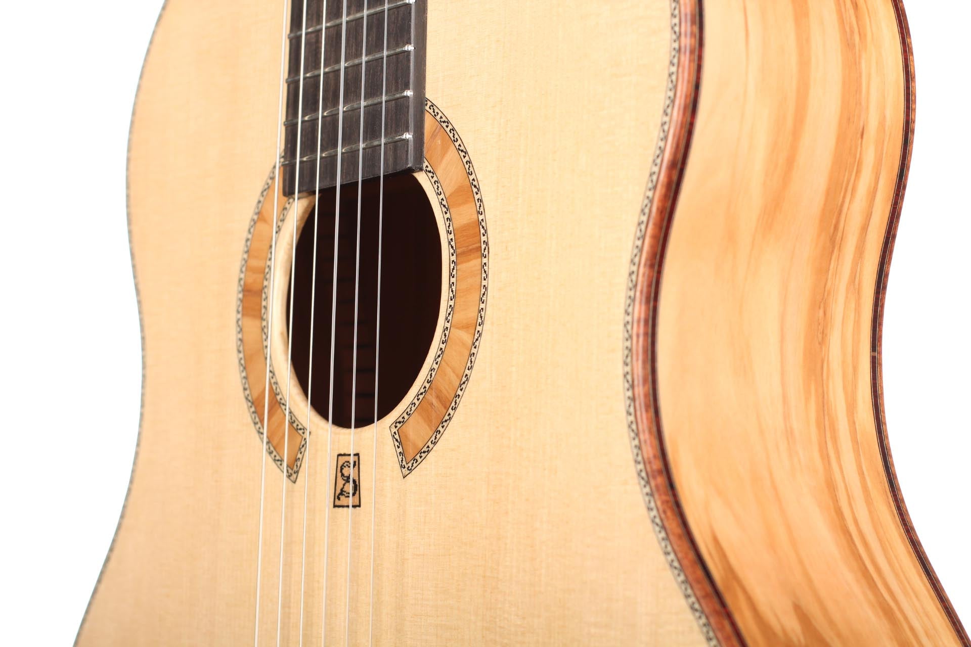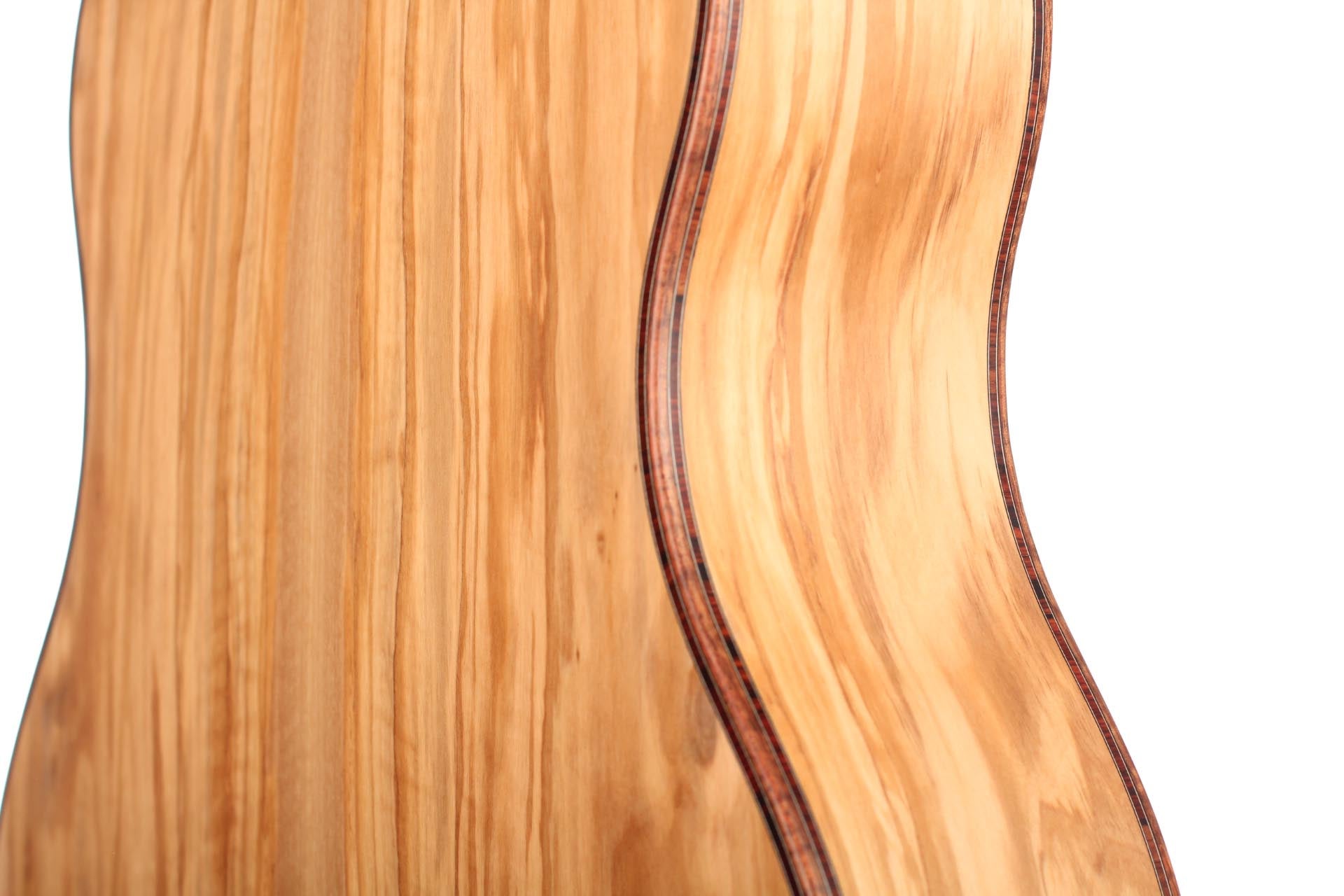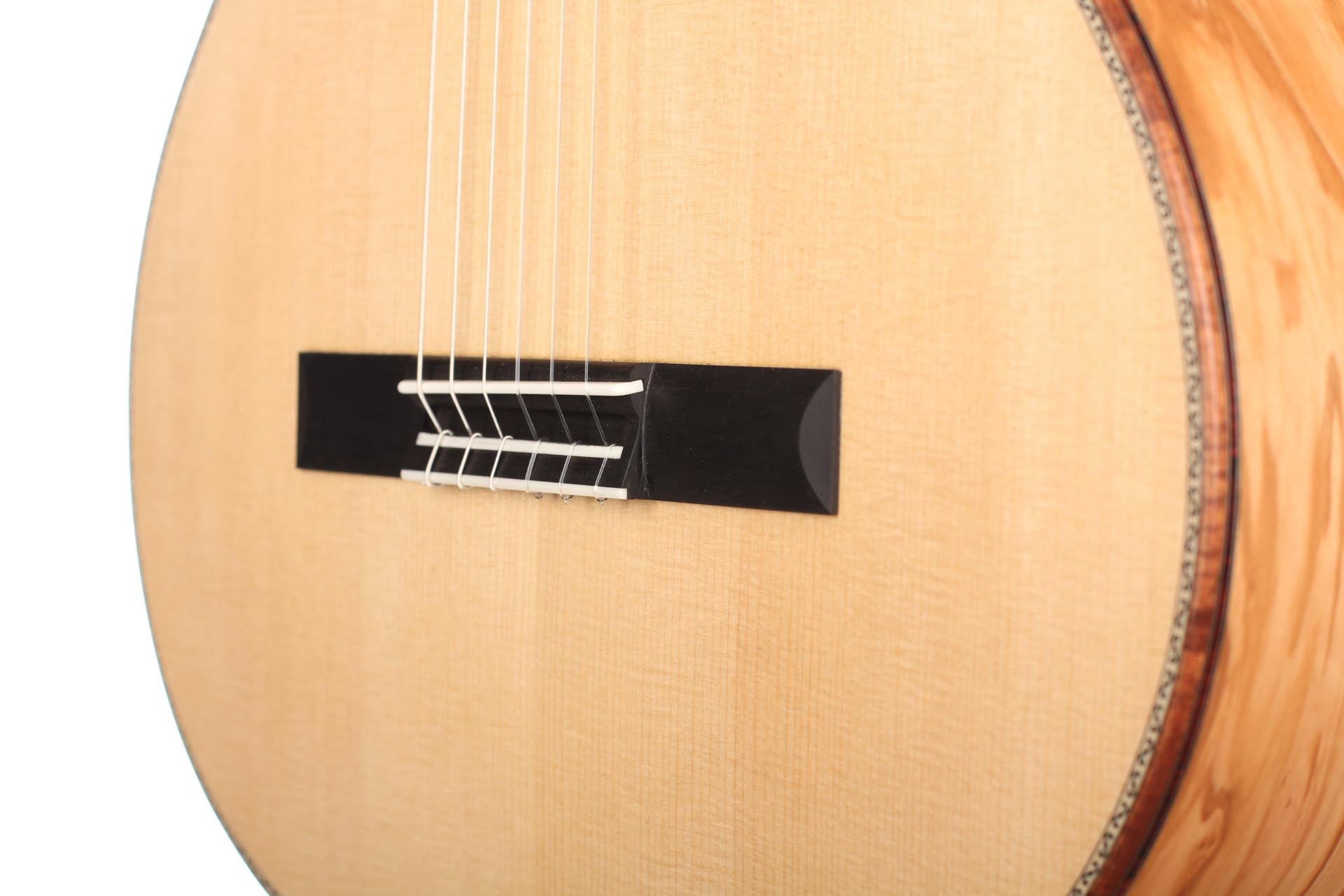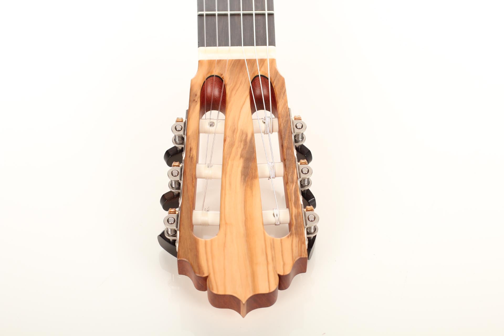 Diese neue Gitarre wurde von Tobias Straßer gebaut. Boden und Zargen sind aus wunderschönem Olivenholz gefertigt - die Decke ist aus Fichtenholz. Die Bässe sind voll und warm und der Diskant singt lebhaft. Die erste Deckenresonanz liegt zwischen F# und G. Boden und Zargen sind matt lackiert während die Decke mit einer Schellackpolitur veredelt wurde. Die Mechaniken sind von Schaller. Ein Hiscox Pro II Koffer ist inklusive.