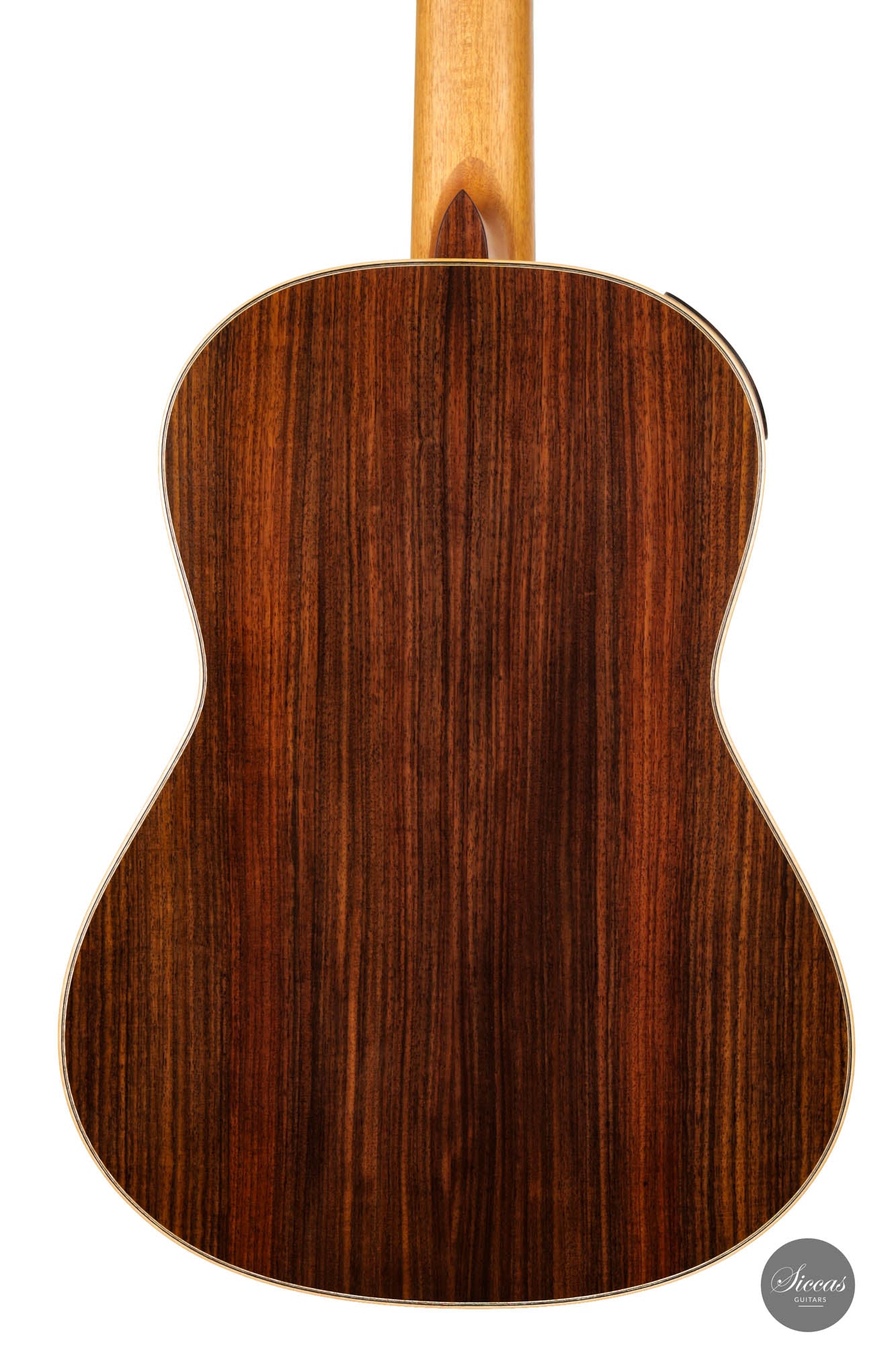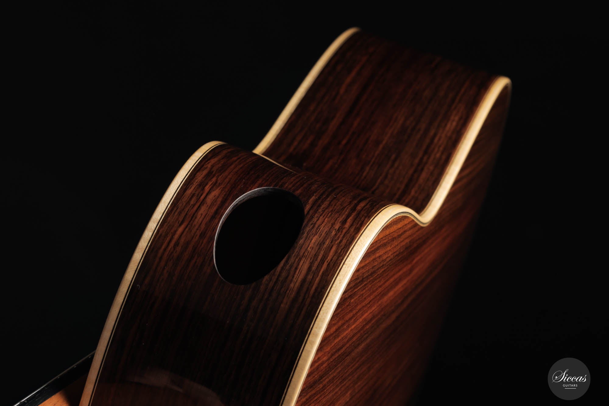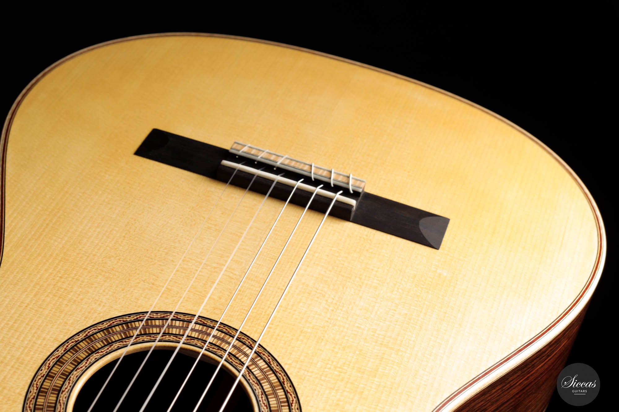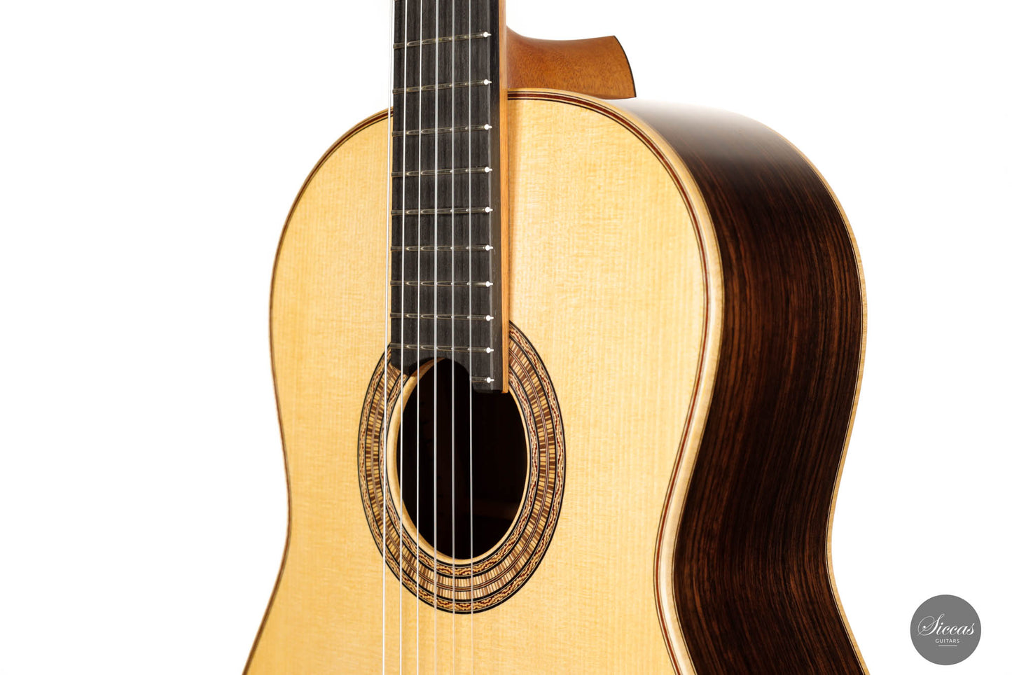 Die Konstruktionsmaterialien sind ein Zeugnis für die Qualität der Gitarre. Eine Fichtendecke ziert die Decke der Gitarre und sorgt für einen scharfen, klaren Ton und eine schnelle Reaktion auf Ihren Anschlag. Dazu kommt das für Boden und Zargen verwendete indische Palisander, ein Klassiker unter den Gitarrenbauern wegen seiner tiefen, resonanten tiefen Frequenzen und seiner Fähigkeit, ein breites Spektrum an klanglichen Möglichkeiten zu bieten.