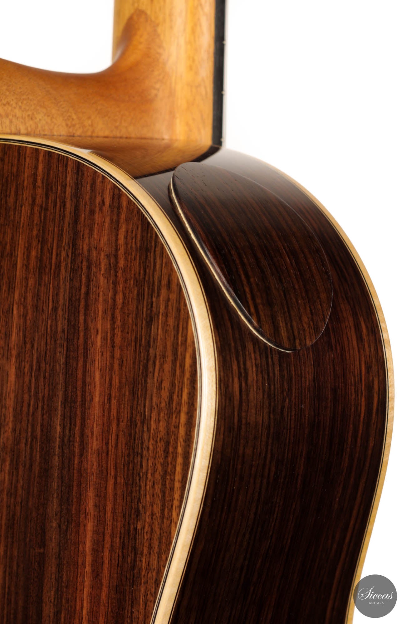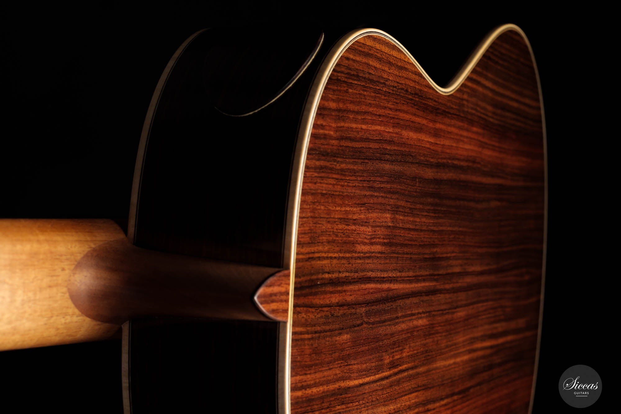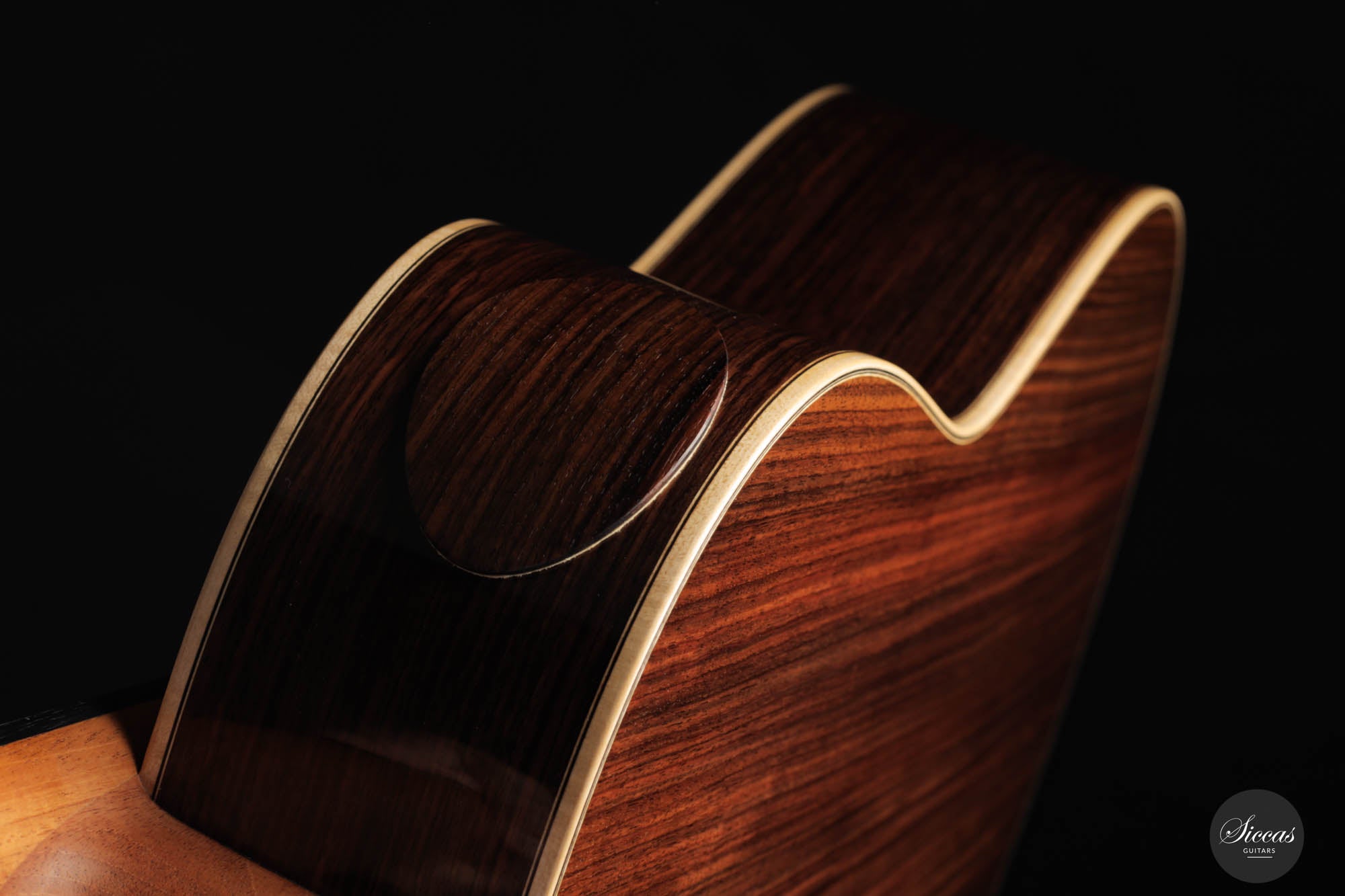 Eine dieser Modifikationen ist die Gitterverstrebung, eine Designentscheidung, die nicht von australischen Gitarrenbauern inspiriert wurde, sondern eine deutliche Abkehr von ihnen darstellt. Im Gegensatz zu den dünneren Decken und kohlenstoffhaltigen Verstrebungen vieler australischer Gitarren entscheidet sich Toby Rzepka für eine massivere Decke, die frei von jeglicher Kohlenstoffverstärkung in den Verstrebungen ist. Diese Wahl resultiert in einer stabileren, langlebigen Gitarre, die eine klangliche Qualität liefert, die unverkennbar Rzepka's ist.