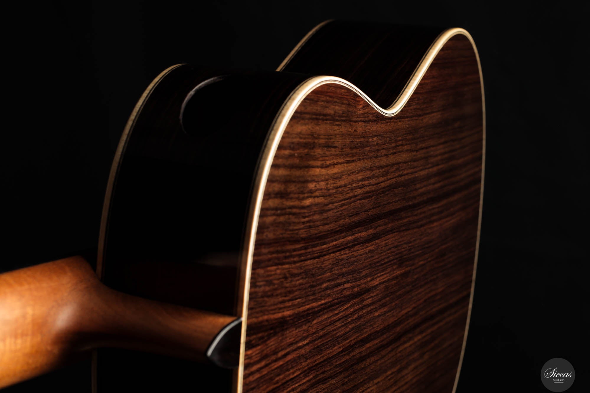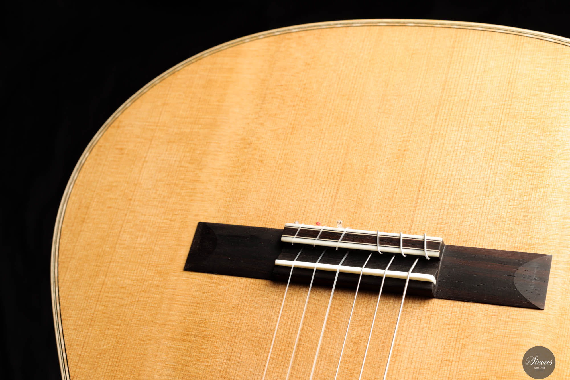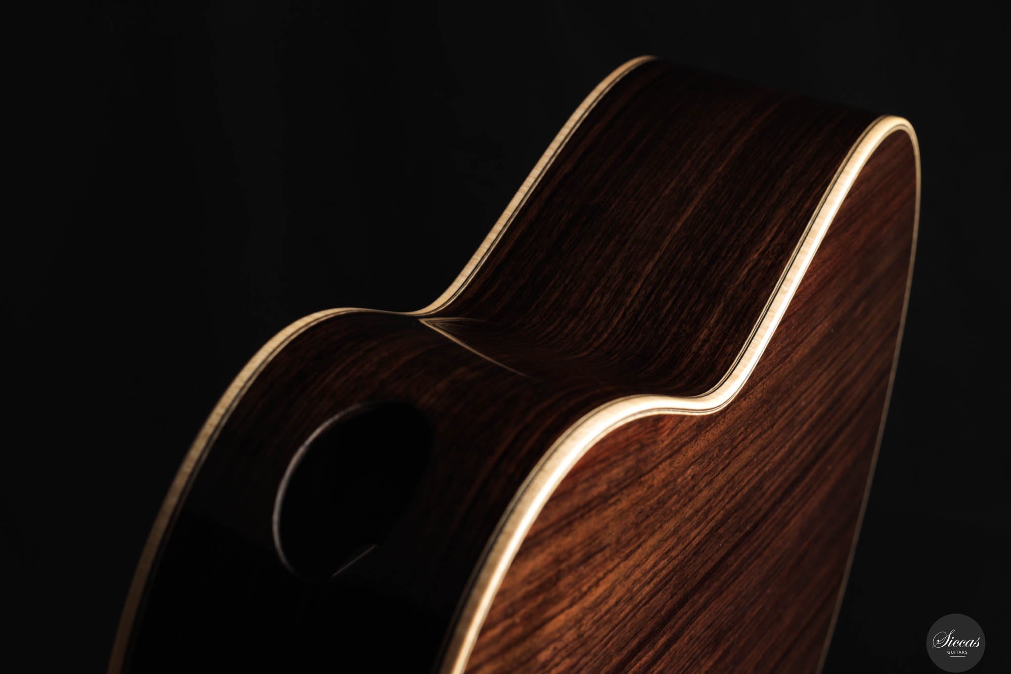 Die Gitarre von Toby Rzepka aus dem Jahr 2024 zeigt diese Philosophie eindrucksvoll und verbindet nahtlos Tradition und Moderne. Auf den ersten Blick fällt die klassische Korpusform ins Auge, die die zeitlosen Designkonventionen des Gitarrenbaus ehrt. Bei näherer Betrachtung erkennt man jedoch innovative Details wie die von Toby entwickelte Lattice-Versteifung. Anders als viele australische Gitarrenbauer, die dünnere Decken und kohlefaserverstärkte Leisten verwenden, setzt Toby auf eine robuste Decke ohne Kohlenstoffverstärkungen, was dem Instrument eine einzigartige Klangidentität verleiht. Mit einer Fichtendecke für klare Höhen und indischem Palisander für reiche, resonante Tiefen erzeugt diese Gitarre einen natürlichen und ausgewogenen Klang. Sie ist mehr als nur ein Instrument – sie ist ein Zeugnis von Tobys Handwerkskunst und seiner Fähigkeit, Tradition mit zukunftsweisendem Design zu vereinen.