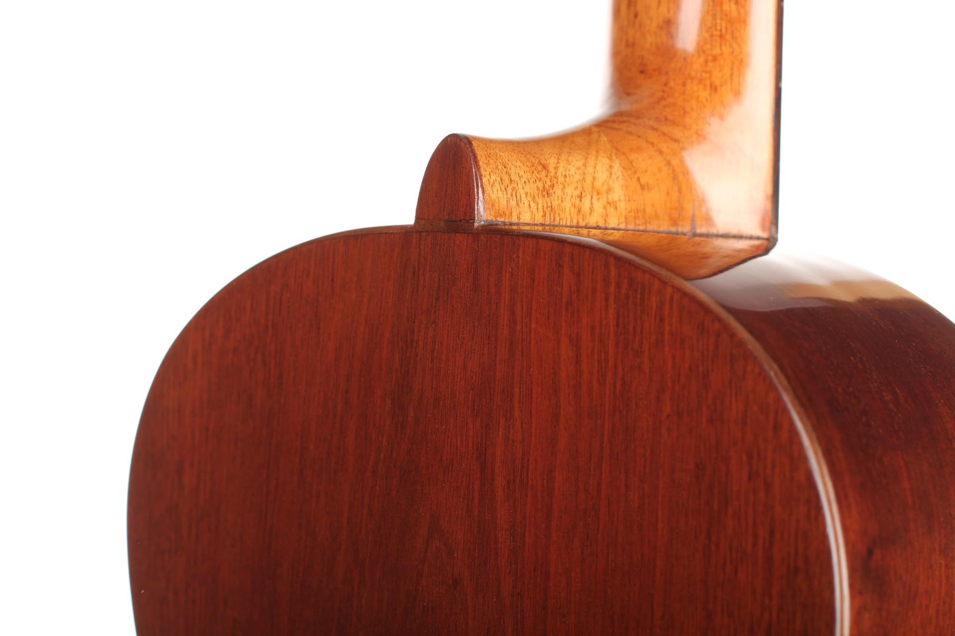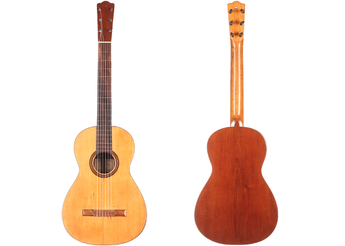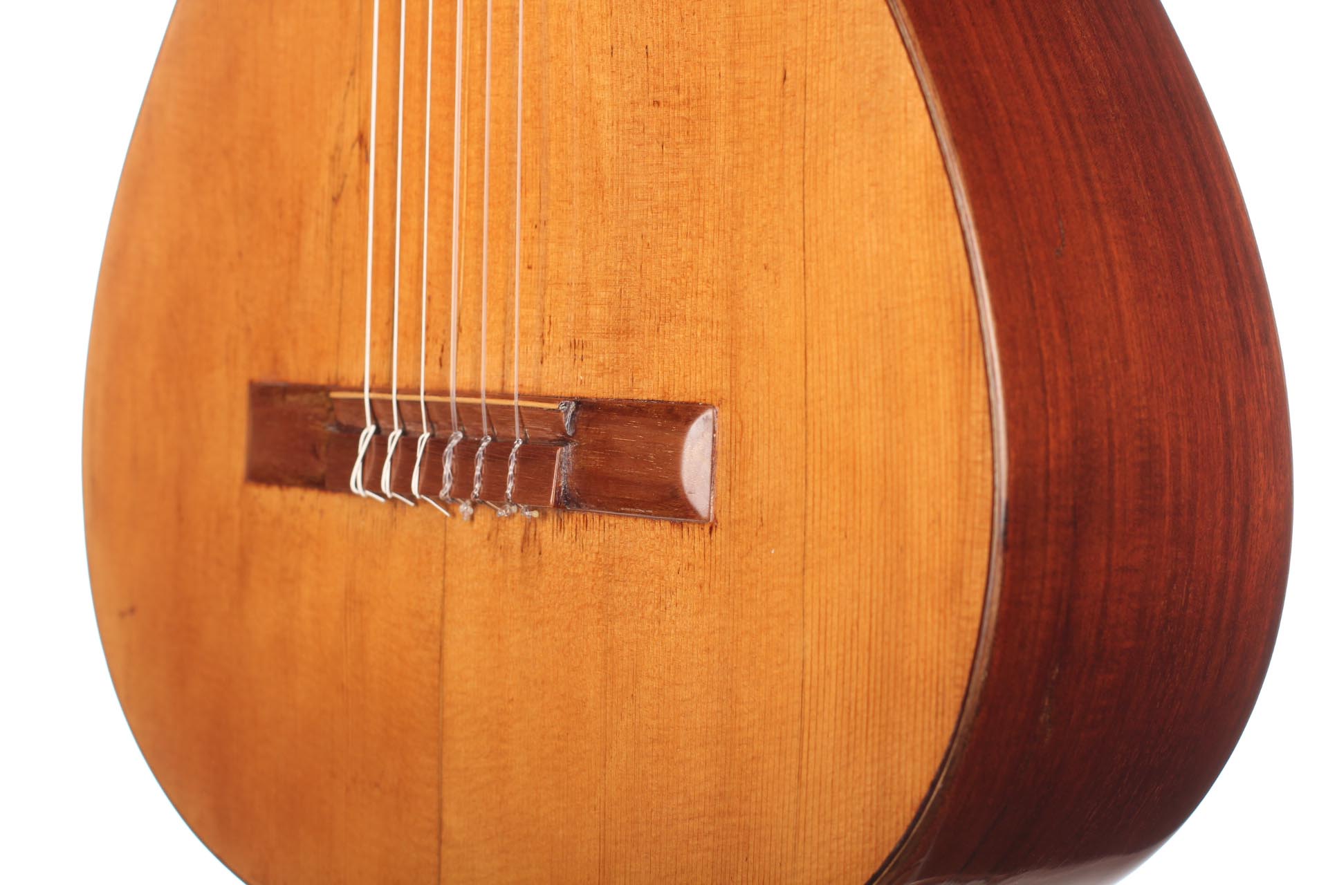 Vicente Arias (1833-1914) wurde in Ciudad Real, südlich von Madrid geboren. Wie auch Antonio de Torres war er ursprünglich ein Tischler, der autodidaktisch den Gitarrenbau erlernte. Wahrscheinlich begann er um 1860 Gitarren zu bauen. Während seiner Karriere gewann er viele bedeutende Preise rund um den Globus, wie z.B. in Buenos Aires, Madrid, Brüssel und Barcelona. Der wohl berühmteste Gitarrist, der seine Gitarren spielte, ist Francisco Tárrega. Diese hier vorgestellte Gitarre mit Fichtendecke wurde 1874 gebaut und befindet sich in einem für das Alter beeindruckend gutem Zustand. Die Decke weißt kleinere Reparaturen auf, ist aber für das Alter von über 140 Jahren in einem sehr gutem Zustand. Der Mahagoni Boden und die Zargen sind ebenso in sehr gutem Zustand. Lediglich eine kleine Stelle in der Zarge wurde ersetzt (siehe Foto). Diese Gitarre ist ein wunderbares Instrument. Es macht große Freude all die vielen Klangfarben zu entdecken und bietet dem Spieler großartige Möglichkeiten sich künstlerisch auszuleben. Inklusive Hartschalenkoffer.