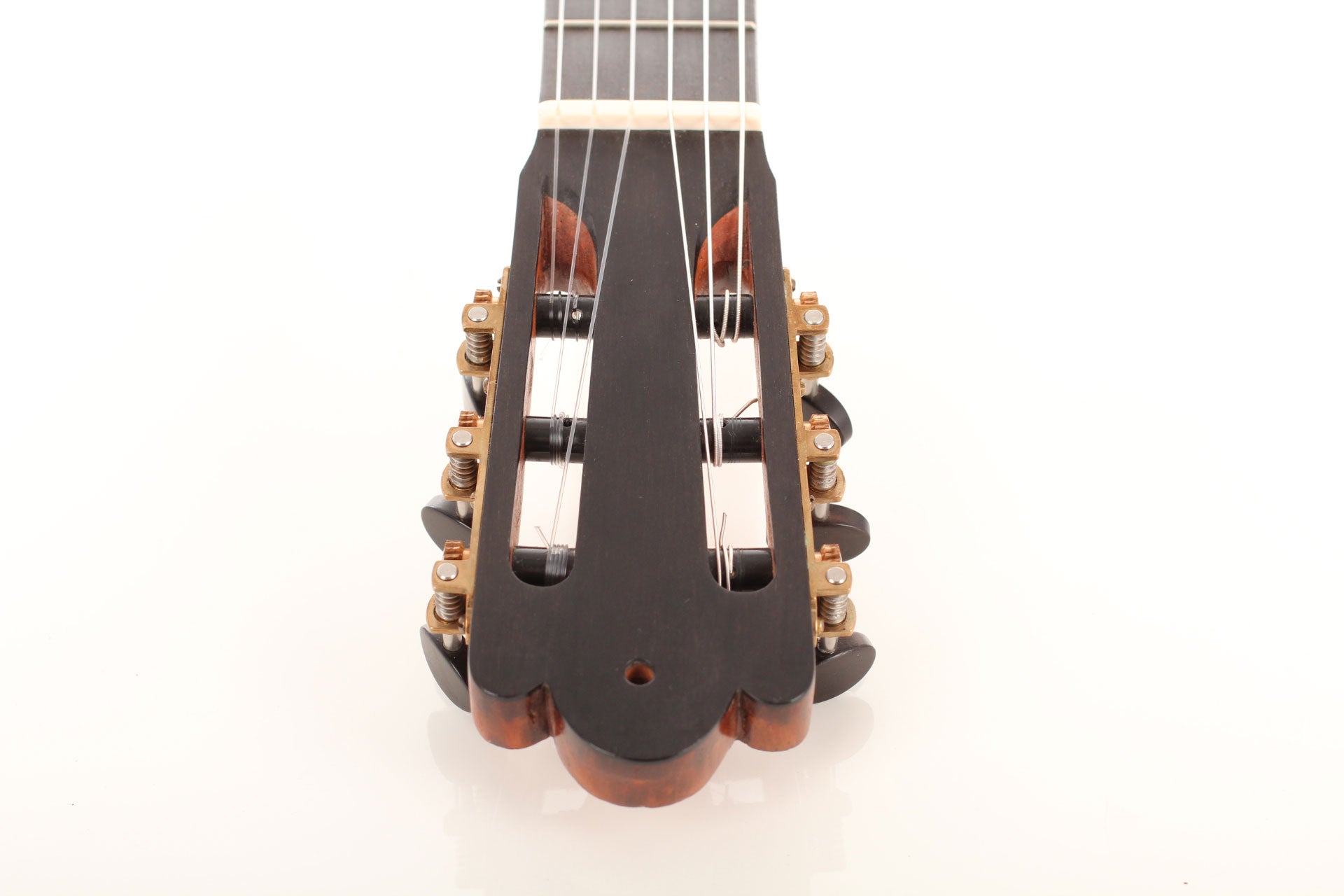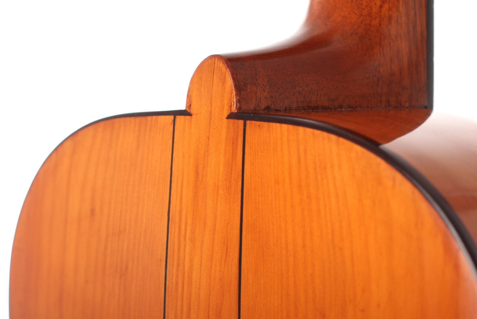 Vicente Arias (1833-1914) wurde in Ciudad Real, südlich von Madrid geboren. Wie auch Antonio de Torres war er ursprünglich ein Tischler, der autodidaktisch den Gitarrenbau erlernte. Wahrscheinlich begann er um 1860 Gitarren zu bauen. Während seiner Karriere gewann er viele bedeutende Preise rund um den Globus, wie z.B. in Buenos Aires, Madrid, Brüssel und Barcelona. Der wohl berühmteste Gitarrist, der seine Gitarren spielte, ist Francisco Tárrega. Diese hier vorgestellte Gitarre mit Fichtendecke wurde 1901 gebaut und befindet sich in einem für das Alter beeindruckend gutem Zustand. Diese Gitarre hat eine große Plantilla und einen Lippensteg, wie es seine großen Konzertgitarren hatten. Die Decke weißt kleinere Reparaturen auf, ist aber für das Alter von 115 Jahren in einem sehr gutem Zustand. Das Griffbrett und die Bünde sind original. The dünne Kopfplatte aus Ebenholz wurde ersetzt wie auch die Mechaniken, die nun von Sloane sind. Insgesamt ist diese Gitarre ist ein wunderbares Instrument. Es macht große Freude all die vielen Klangfarben zu entdecken und bietet dem Spieler großartige Möglichkeiten sich künstlerisch auszuleben. Ein Hartschalenkoffer ist inklusive.