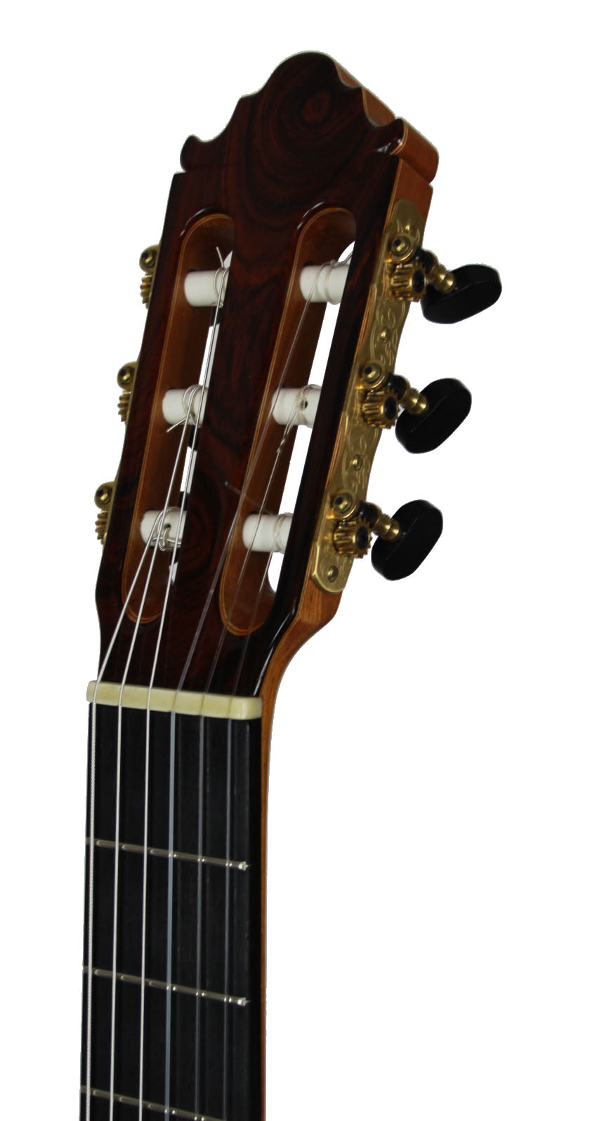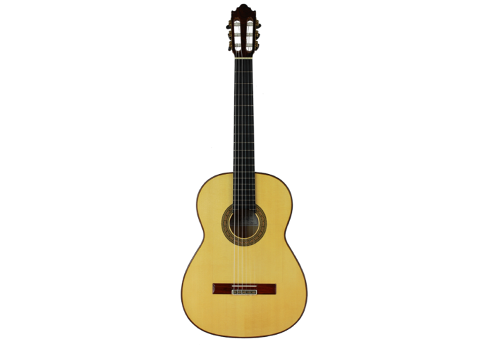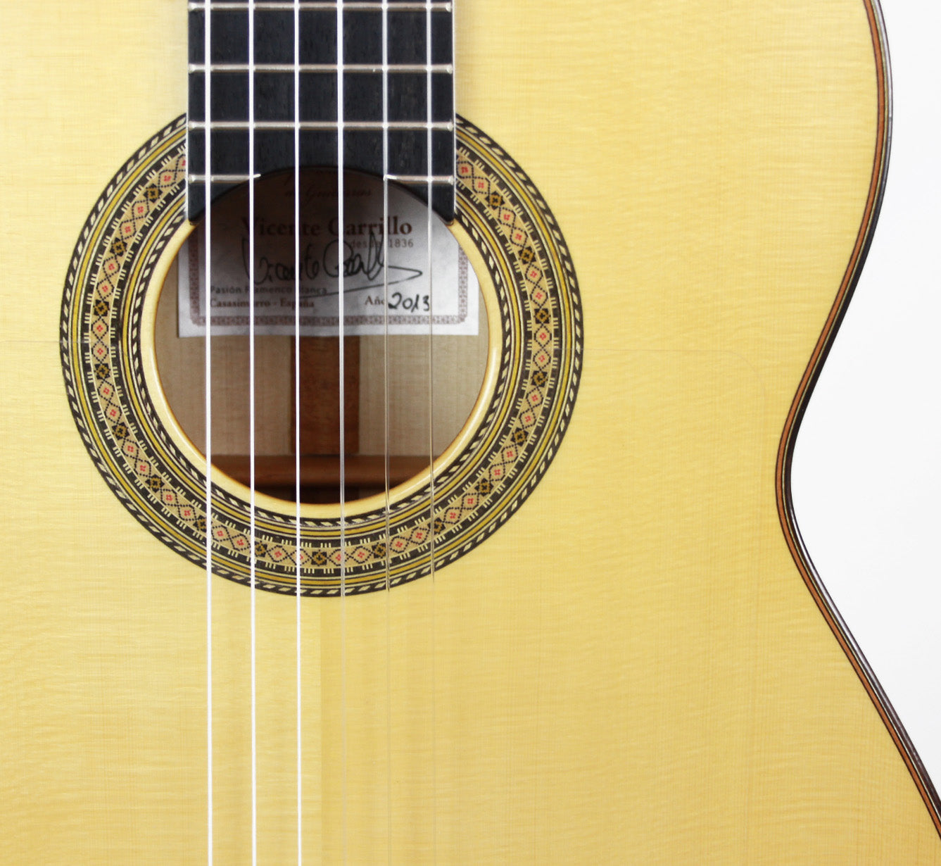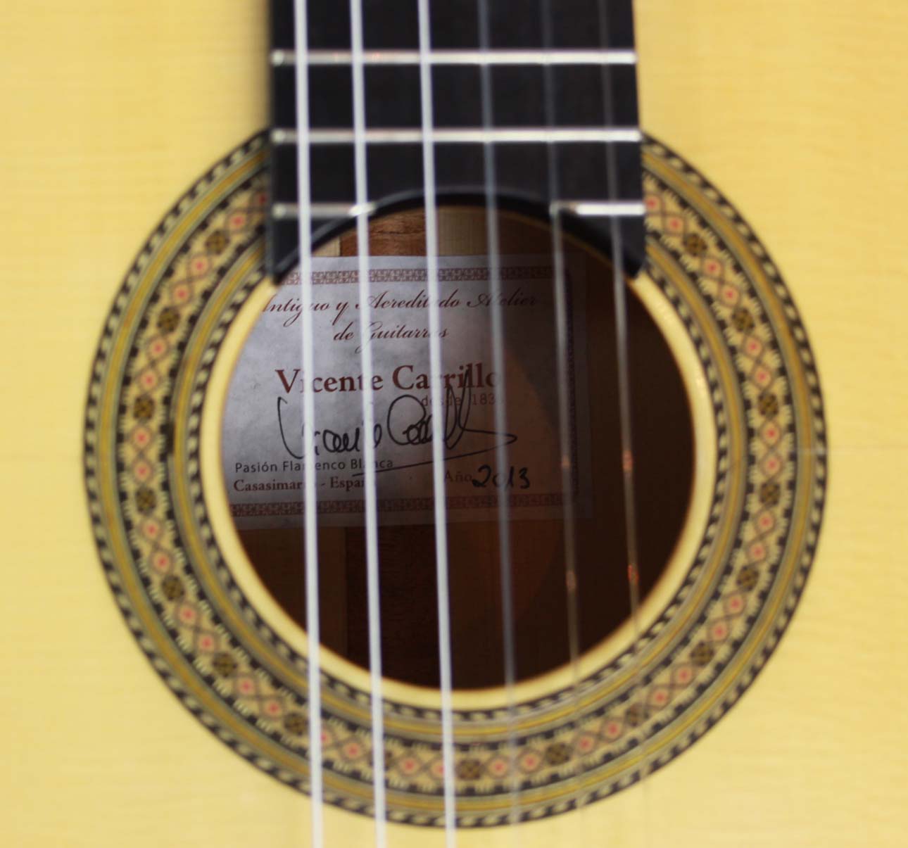Vicente Carrillo was born in 1963 being the 4th generation luthier in the Carrillo family. Vicente contructs Flamenco and Classical guitars. He was awarded in 2009 with the Regional Craftsmanship Award and in 2010 with the National Craftsmanship Award. His guitars are and were played by Paco de Lucía, Tomatito, J.M. Cañizarez, El Niño Josele, Rafael Cañizares, Javier Limón, Keith Richards. This guitar by Vicente Carrillo has spruce top. Back and sides are made of finest cypress wood. The guitar is easy to play and has a bright and punchy sound. Overall condition is very good. The machine heads are made by Gotoh. Hard shell case included.