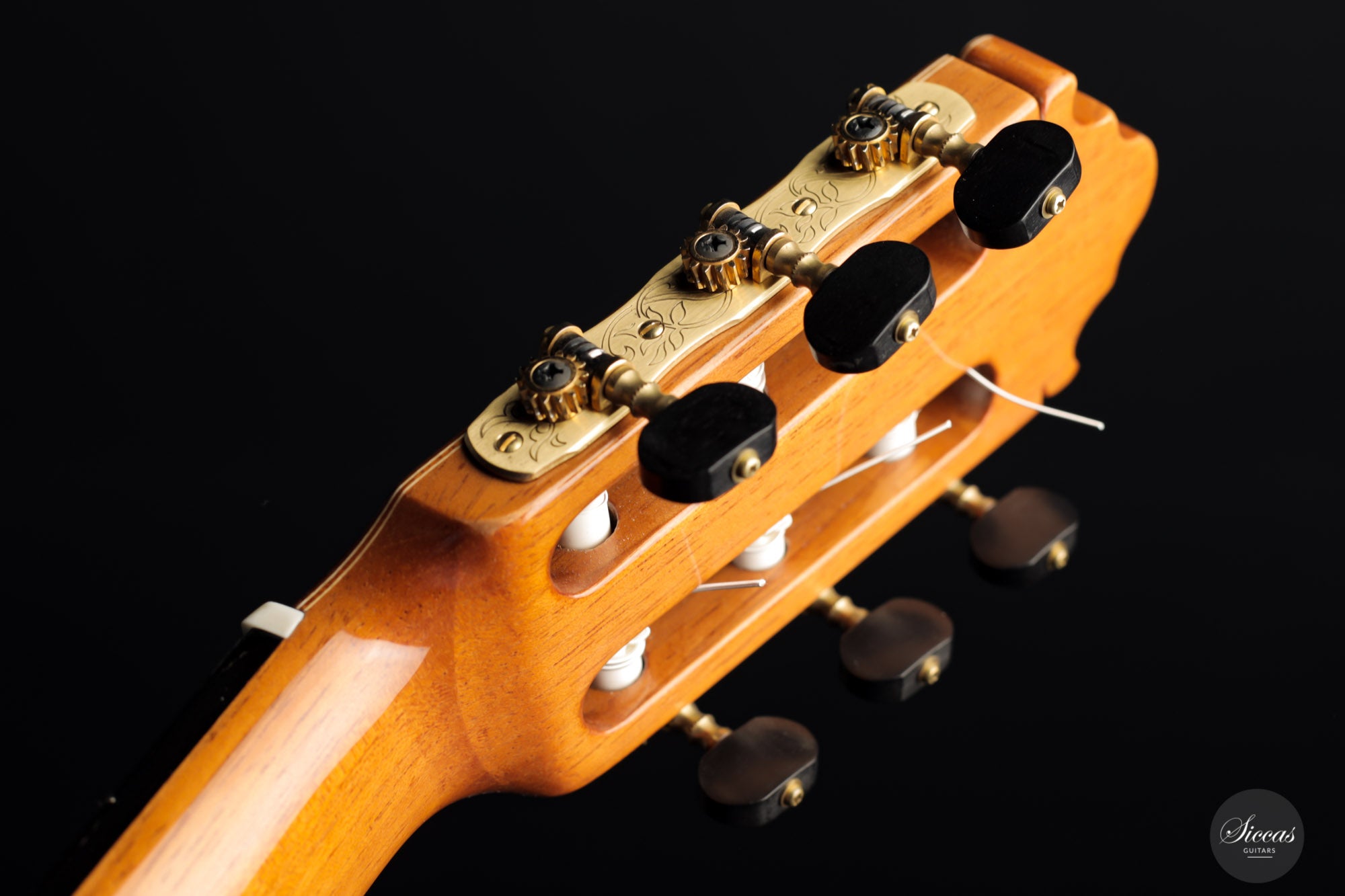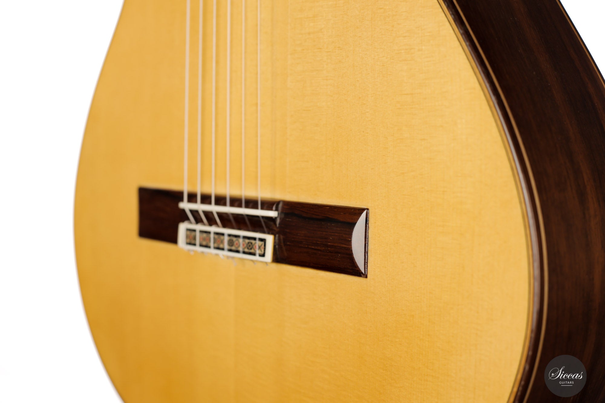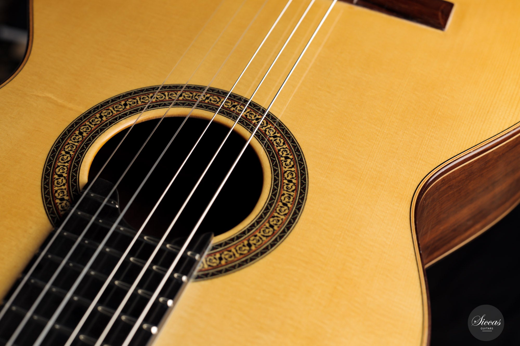 Die Decke dieser wunderschönen Gitarre ist aus feiner Fichte und Boden und Zargen aus Madagaskar-Palisander gefertigt, was ihr ein exotisches und edles Aussehen verleiht. Dank der exzellenten Ansprache bedarf es nur eines minimalen Aufwands in der rechten Hand, um maximale Projektion und Lautstärke zu erreichen. Die sehr komfortable 63-cm-Mensur bietet zudem eine hervorragende Bespielbarkeit und unterstützt den Gitarristen bei Streckungen und akrobatischen Fingersätzen. Der Klang dieser Gitarre ist sowohl sehr spontan und spielfreudig als auch äußerst warm und sanglich. Die Höhen haben eine ausgeprägte Personalität und einen abgerundeten, spanischen Klang. Die Bässe besitzen eine schöne Tiefe und bieten einen großen Raum für kraftvolle und samtige Mitten. Dank ihrer kürzeren Mensur ist sie außerdem ausgesprochen gut spielbar und insgesamt sowohl für den Gitarristen wie auch für das Publikum ein echter Hörgenuss.