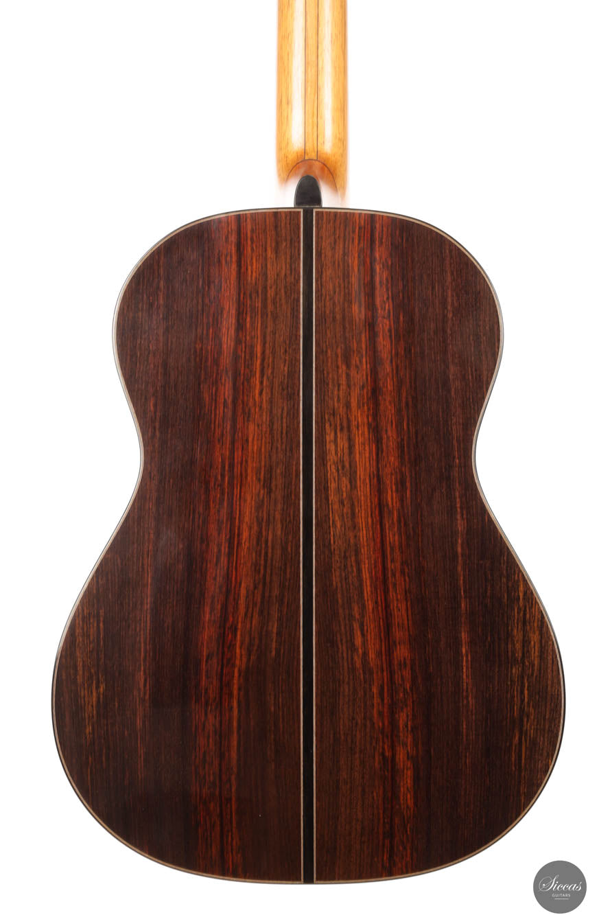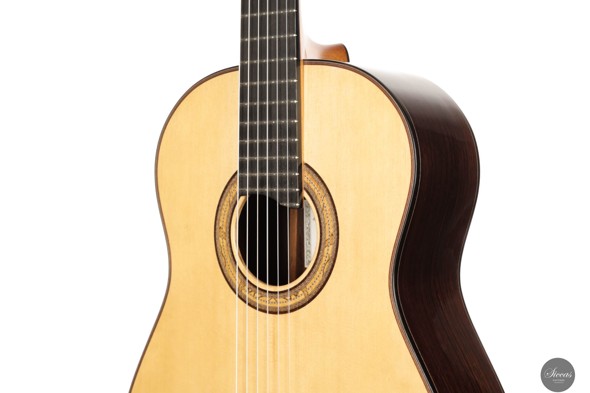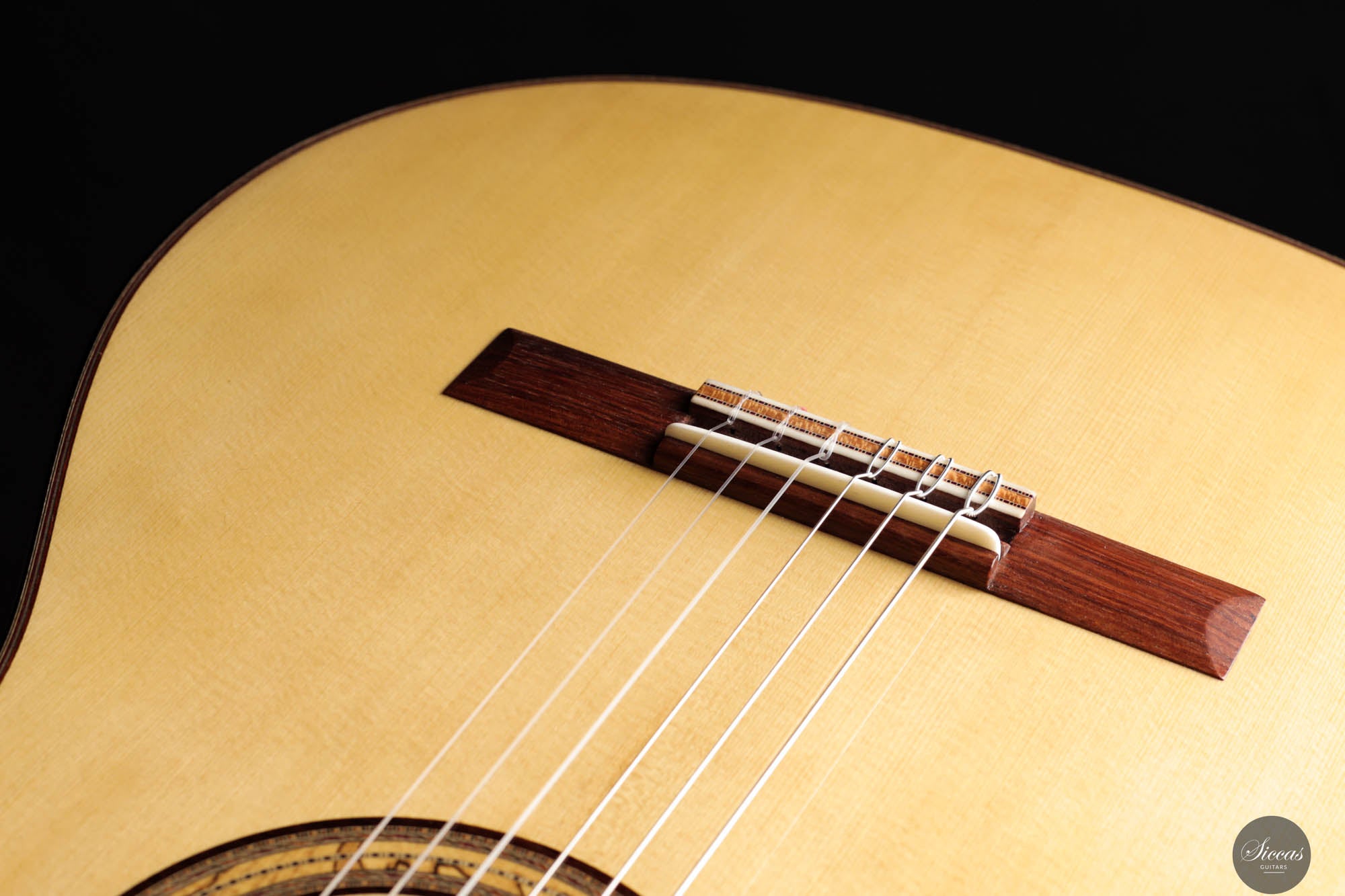 This exceptional instrument is a clear expression of Vincent Engelbrecht’s innovative vision. The standout feature is his proprietary star-woven spruce mesh bracing, combined with a spruce and balsa top. This design not only increases the guitar’s volume but also preserves a richly nuanced tonal palette, making it versatile for both intimate performances and larger concert stages. The top’s carefully controlled tension translates into an effortless right-hand response, allowing for refined dynamics and expressive playing with ease. The instrument’s dynamic range and balance are truly remarkable, with singing trebles and a robust, articulate bass response. It’s no surprise that acclaimed guitarist Cassie Martin performs with a Vincent Engelbrecht guitar. This guitar offers both technical ease and musical inspiration, meeting the highest expectations of demanding players.