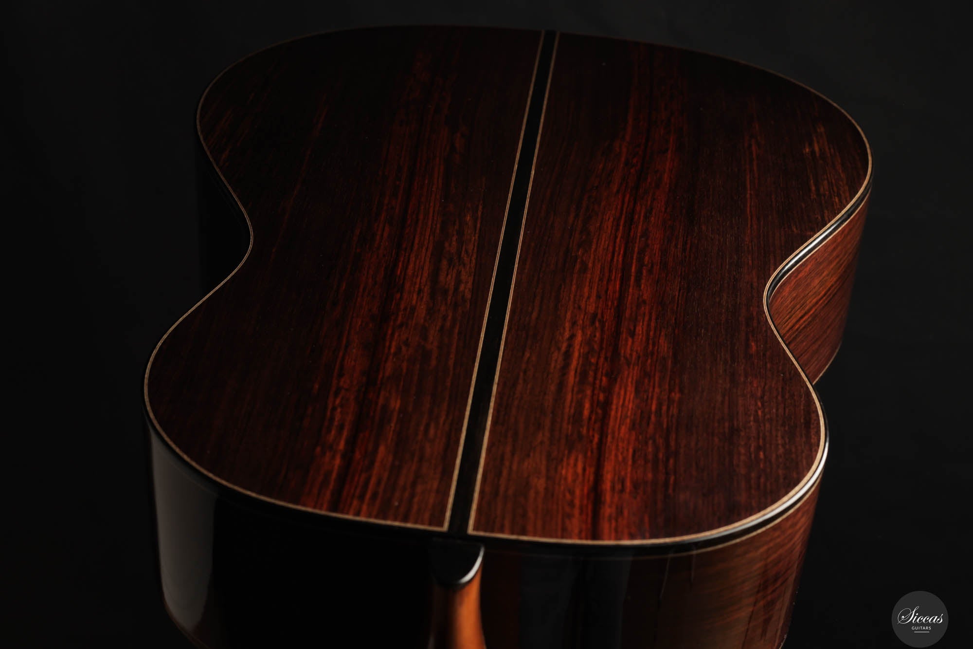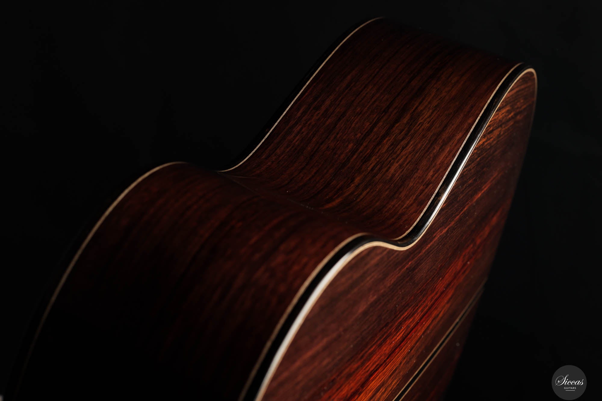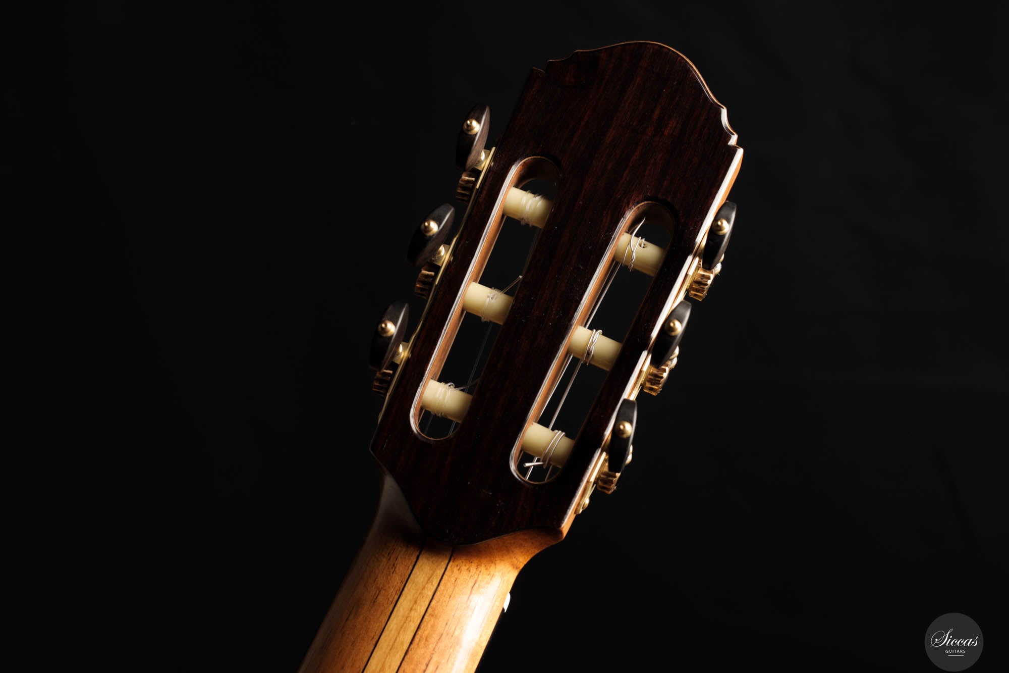 This exceptional instrument is a clear expression of Vincent Engelbrecht’s innovative vision. The standout feature is his proprietary star-woven spruce mesh bracing, combined with a spruce and balsa top. This design not only increases the guitar’s volume but also preserves a richly nuanced tonal palette, making it versatile for both intimate performances and larger concert stages. The top’s carefully controlled tension translates into an effortless right-hand response, allowing for refined dynamics and expressive playing with ease. The instrument’s dynamic range and balance are truly remarkable, with singing trebles and a robust, articulate bass response. It’s no surprise that acclaimed guitarist Cassie Martin performs with a Vincent Engelbrecht guitar. This guitar offers both technical ease and musical inspiration, meeting the highest expectations of demanding players.
