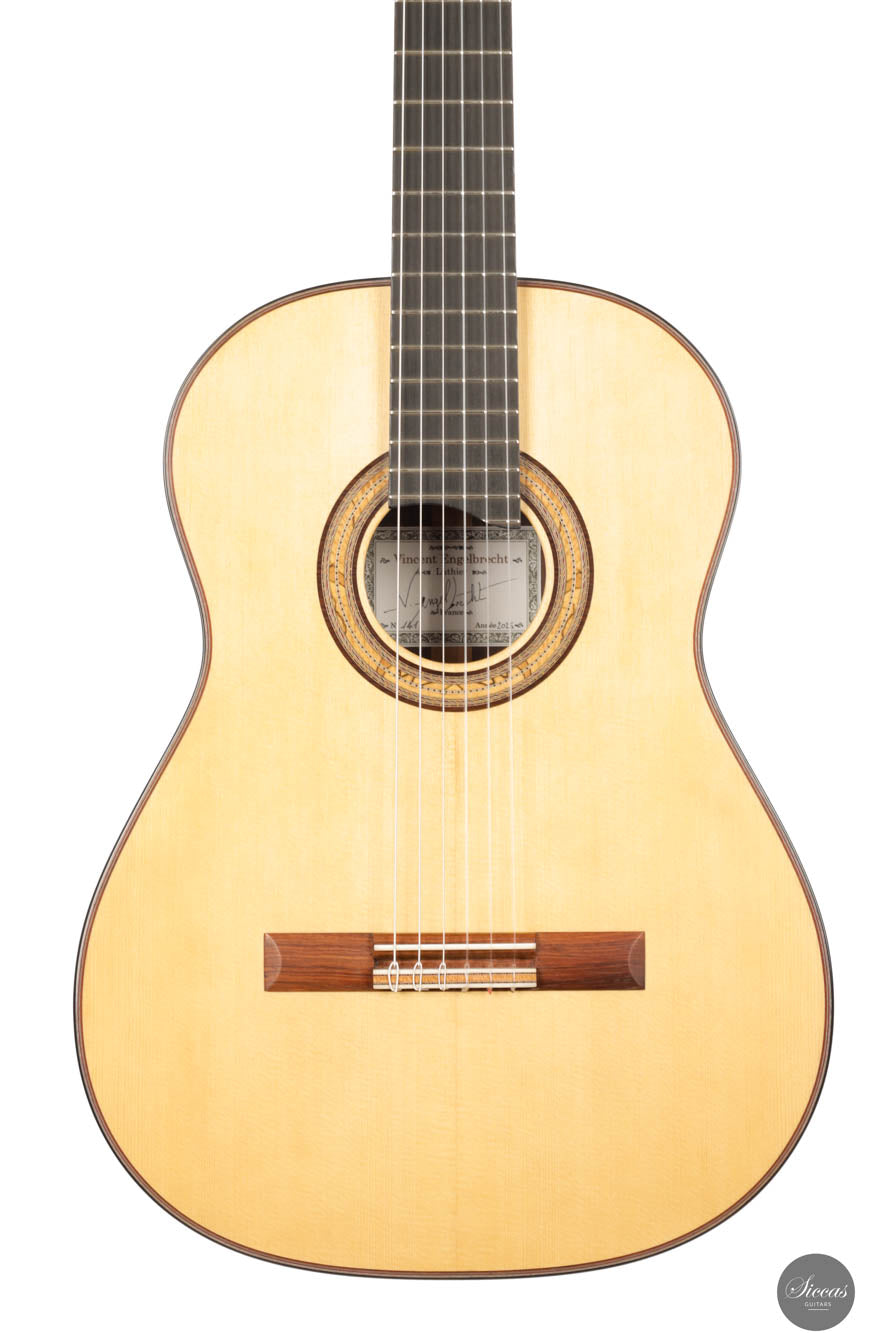 Diese Gitarre von Vincent Engelbrecht ist ein eindrucksvolles Beispiel für moderne Innovation im Gitarrenbau. Ihr zentrales Merkmal ist das von Engelbrecht entwickelte sternförmig gewebte Fichtengitter, kombiniert mit einer Fichten-Balsa-Doppeldecke. Diese Bauweise sorgt für außergewöhnliches Volumen und Projektion, ohne die klangliche Vielfalt zu mindern. Die Gitarre spricht äußerst sensibel an und eröffnet eine breite Palette an Farben und Dynamik – von klaren, leuchtenden Höhen bis zu kräftigen, präzisen Bässen. Durch die ausgewogene Spannung der Decke entsteht ein Instrument, das sowohl im intimen Rahmen als auch im Konzertsaal überzeugt. Dass auch Cassie Martin auf einer Engelbrecht spielt, unterstreicht den professionellen Anspruch dieser außergewöhnlichen Gitarre.