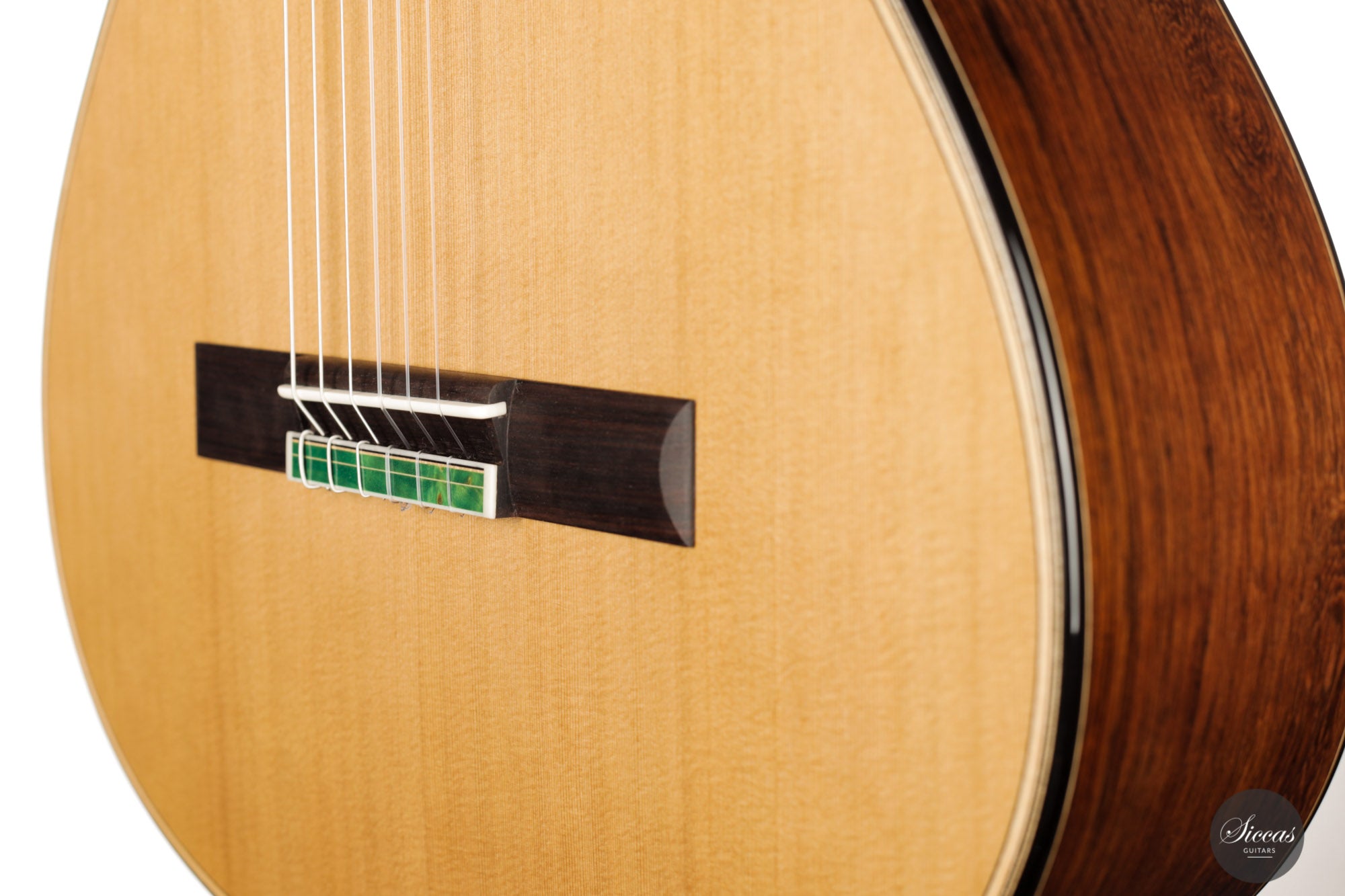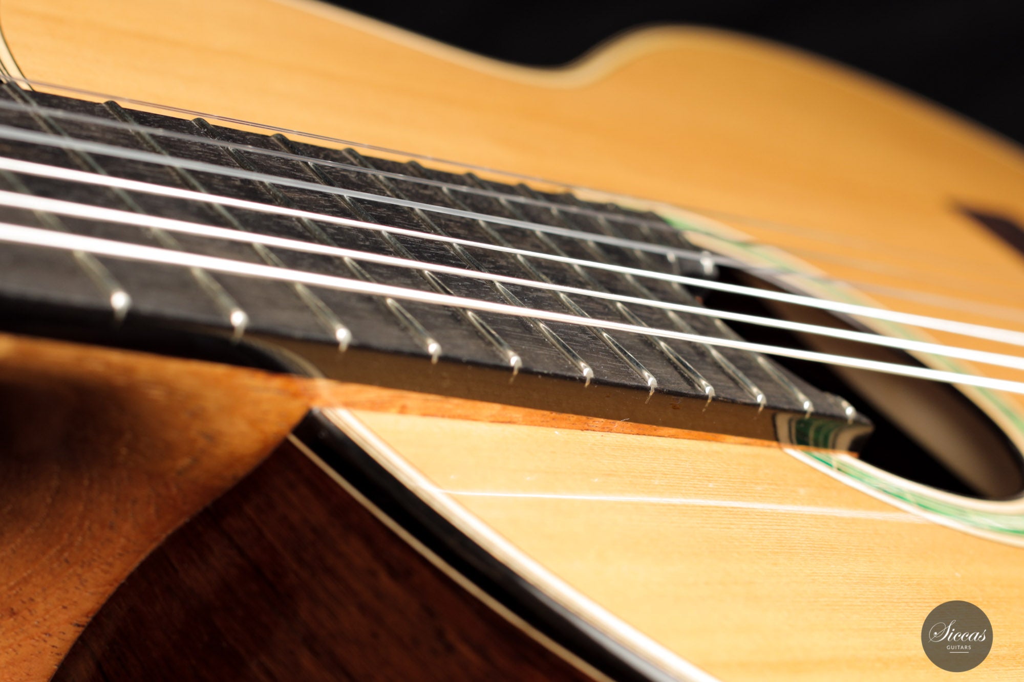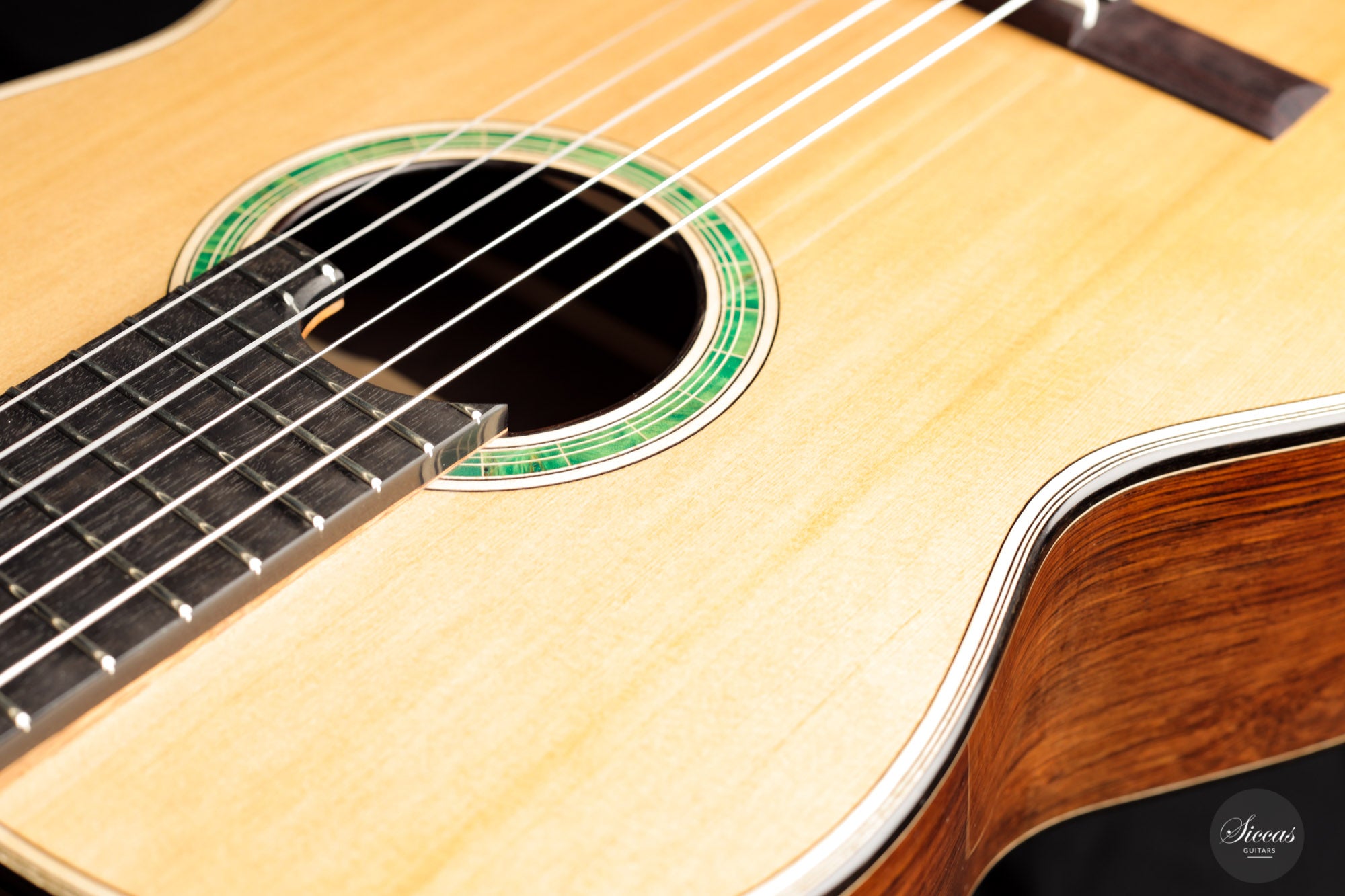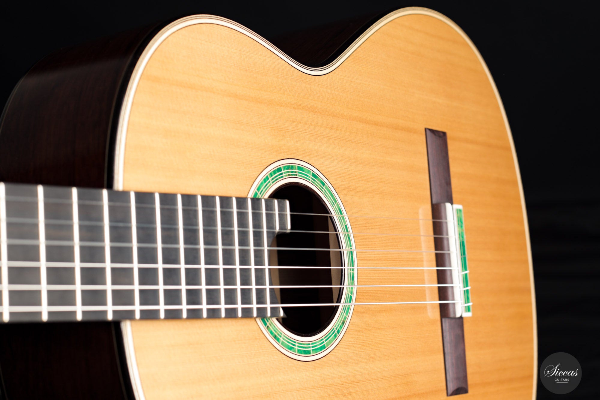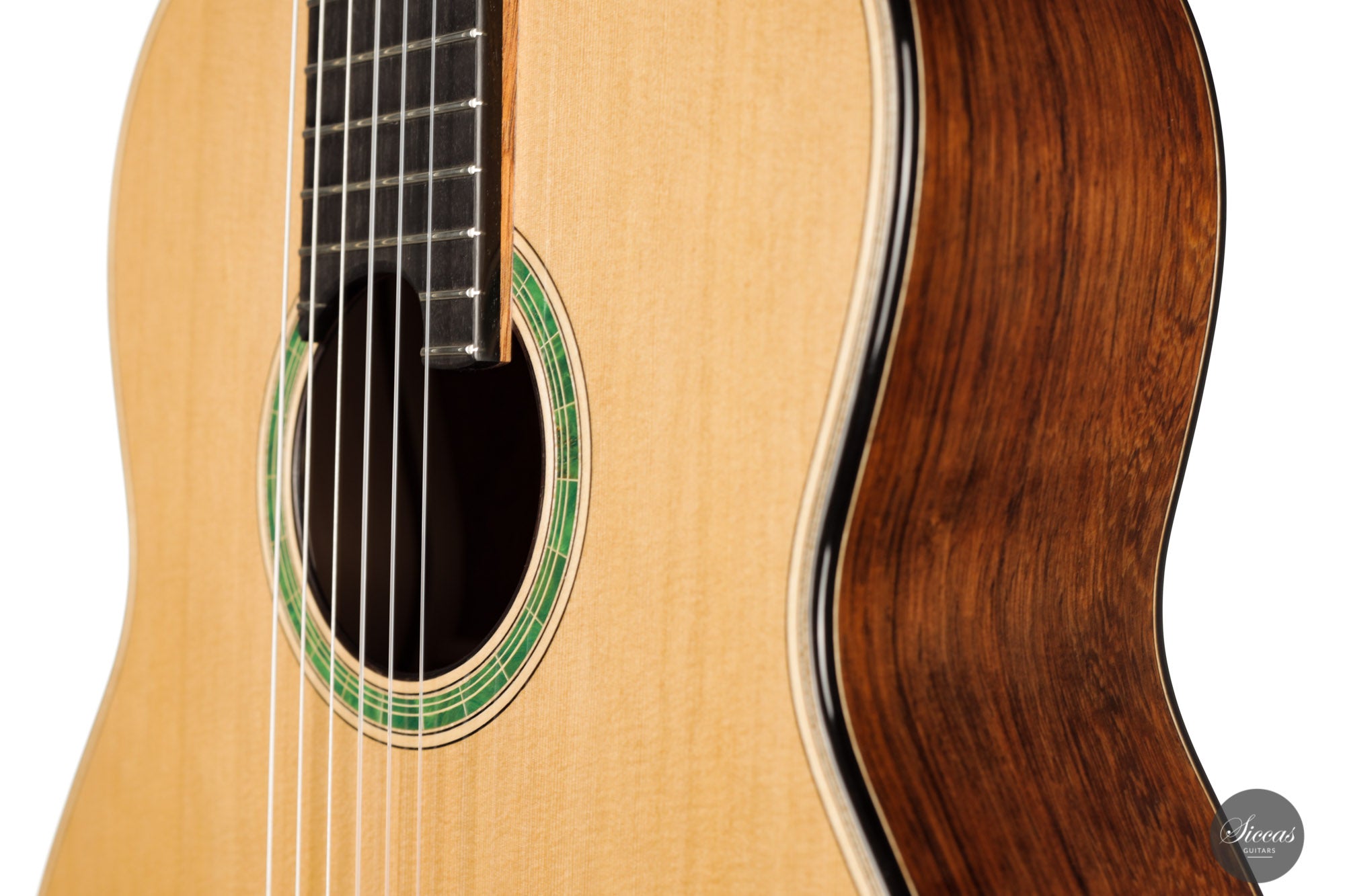 Diese Gitarre mit der Nummer 43 kommt direkt aus Vincents Werkstatt und es ist eine Freude sie zu spielen. Mit ihrer 64 cm langen Mensur, dem erhöhten Griffbrett und der reaktionsschnellen Zeder-/Zeder-Doubletopdecke ist diese Gitarre sowohl für die linke als auch für die rechte Hand hervorragend spielbar. Ein reizvolles Detail sind die dreifarbigen Motive der Intarsien, die aus einem dunkelgrünen Furnier bestehen und durch weiße und schwarze Randeinlagen hervorgehoben werden. Diese Gitarre wird jeden begeistern, der ein Instrument von bemerkenswerter Klangqualität, müheloser Bespielbarkeit und ein echtes Meisterstück sucht.
