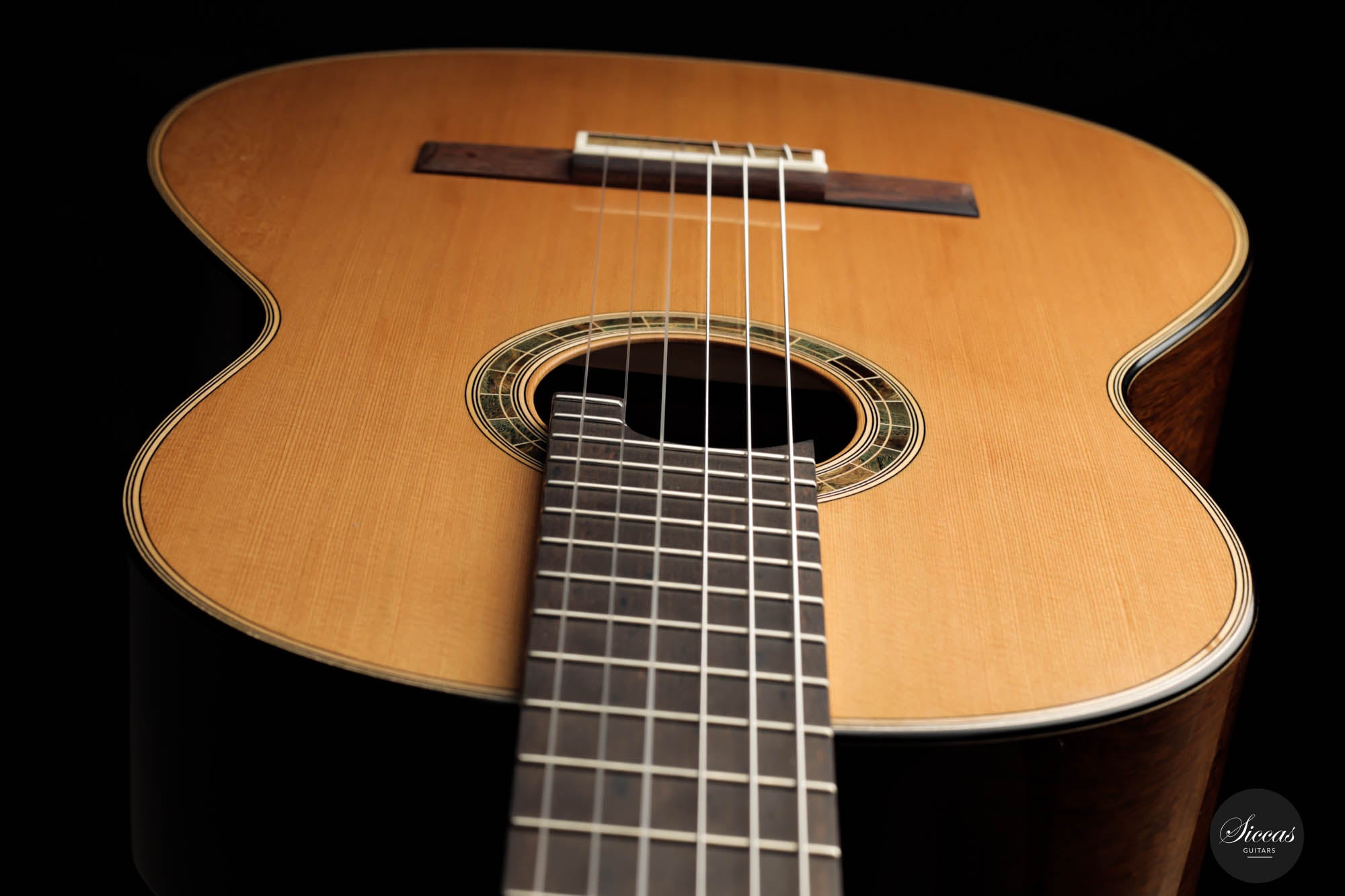 Vincent Humml ist ein deutscher Gitarrenbauer der jungen Generation. Vor zehn Jahren begann er eine Lehre als Zupfinstrumentenbauer, studierte in Markneukirchen Gitarrenbau und verfeinerte seine Fähigkeiten in verschiedenen Praktika und Workshops. Nach der Erlangung des sehr anspruchsvollen Meistertitels im Zupfinstrumentenbau im Jahr 2019, gründete er seine Werkstatt in Chemnitz, Deutschland. Vincents Gitarren zeichnen sich durch eine moderne Konstruktion und klare Ästhetik aus. Er baut seine Doubletop Gitarren, welche traditionell klingen aber immense Kraft und einen reichen und eleganten Klang haben. Eleganz zeigt sich auch im Aussehen seiner Instrumente. Sein Design ist klar und raffiniert, immer präzise gebaut und geschmackvoll. Vincent gehört zu den Gitarrenbauern der neuen Generation, die bei der Qualität keine Kompromisse eingehen, was sich durch 1a-Holzqualität und die Wahl von Scheller Mechaniken zeigt. Vincent veredelt zudem seine Gitarre mit einer Schellack Handpolitur.