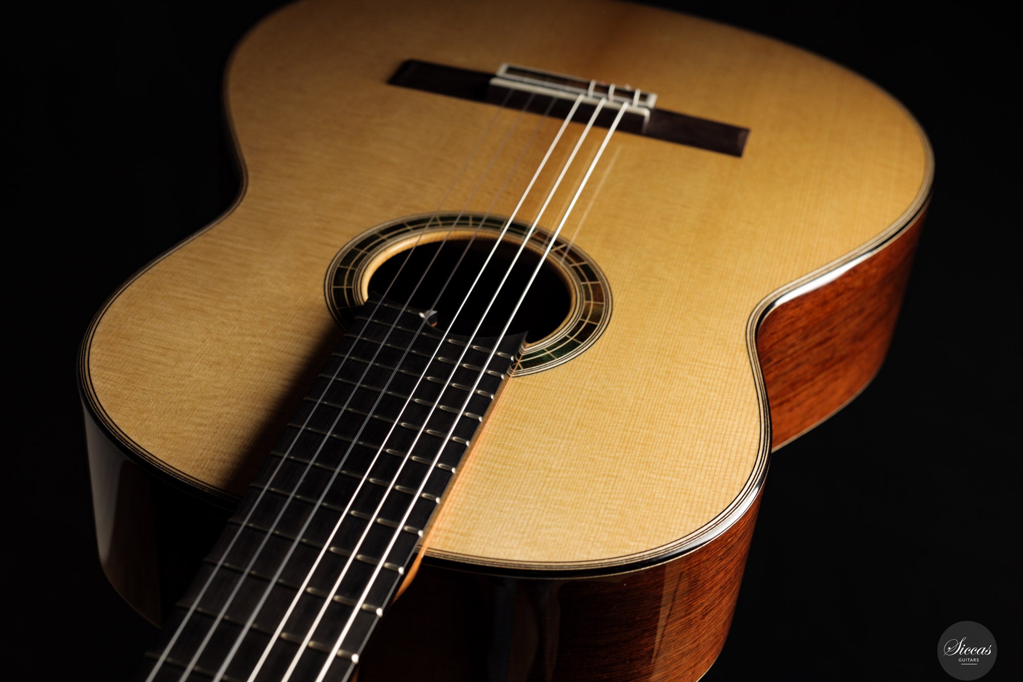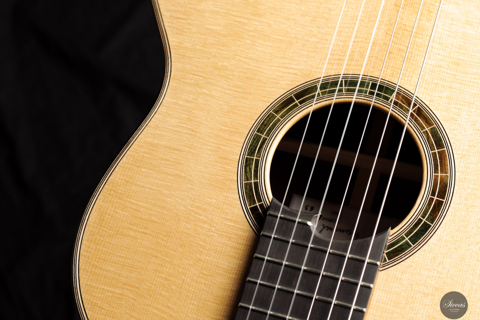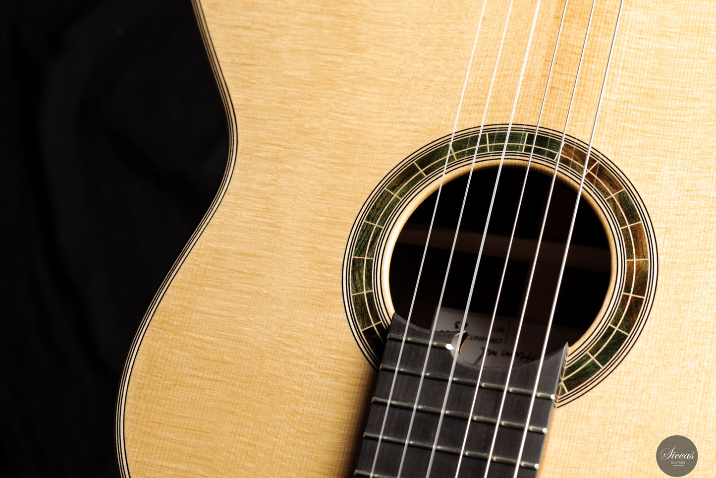Diese Gitarre, vollendet im Jahr 2025 und mit der Nummer 63 versehen, ist ein Doubletop-Instrument mit einer Fichtendecke und Boden sowie Zargen aus madagassischem Palisander, veredelt mit Schellack. Mit einem Gewicht von 1675 Gramm ist sie moderat leicht und bietet die Projektion und den Dynamikumfang, die für Hummls Doubletop-Bauweise charakteristisch sind. Die Mensur beträgt 640 mm bei einer Sattelbreite von 52 mm, was eine komfortable Spielbarkeit ermöglicht, ohne auf die gewohnten Proportionen im Griffbrett verzichten zu müssen. Klanglich überzeugt die Gitarre durch eine ausgewogene Ansprache: die Diskanttöne sind klar, rund und mit langem Nachklang, die Bässe kraftvoll und tragfähig, während die Mitten voll und präsent wirken. Die Sensibilität ist hoch, sodass das Instrument unmittelbar auf feinste Veränderungen im Anschlag reagiert. Der Dynamikumfang ist breit, vom Pianissimo bis zum kraftvollen Forte bleibt der Ton stabil und differenziert. Die kürzere Mensur erleichtert das Spiel und verringert die Belastung der linken Hand, wodurch die Gitarre auch bei längeren Spielzeiten hohen Komfort bietet, ohne an Bühnenpräsenz einzubüßen. Mit ihrer sorgfältig abgestimmten Doubletop-Decke aus Fichte, dem klanglich tiefen madagassischen Palisander und der komfortablen Spielbarkeit verbindet diese Gitarre moderne Bauweise mit traditioneller Klangfülle. Sie ist mit Mechaniken von Klaus Scheller ausgestattet und wird in einem Hiscox Pro II Koffer geliefert.