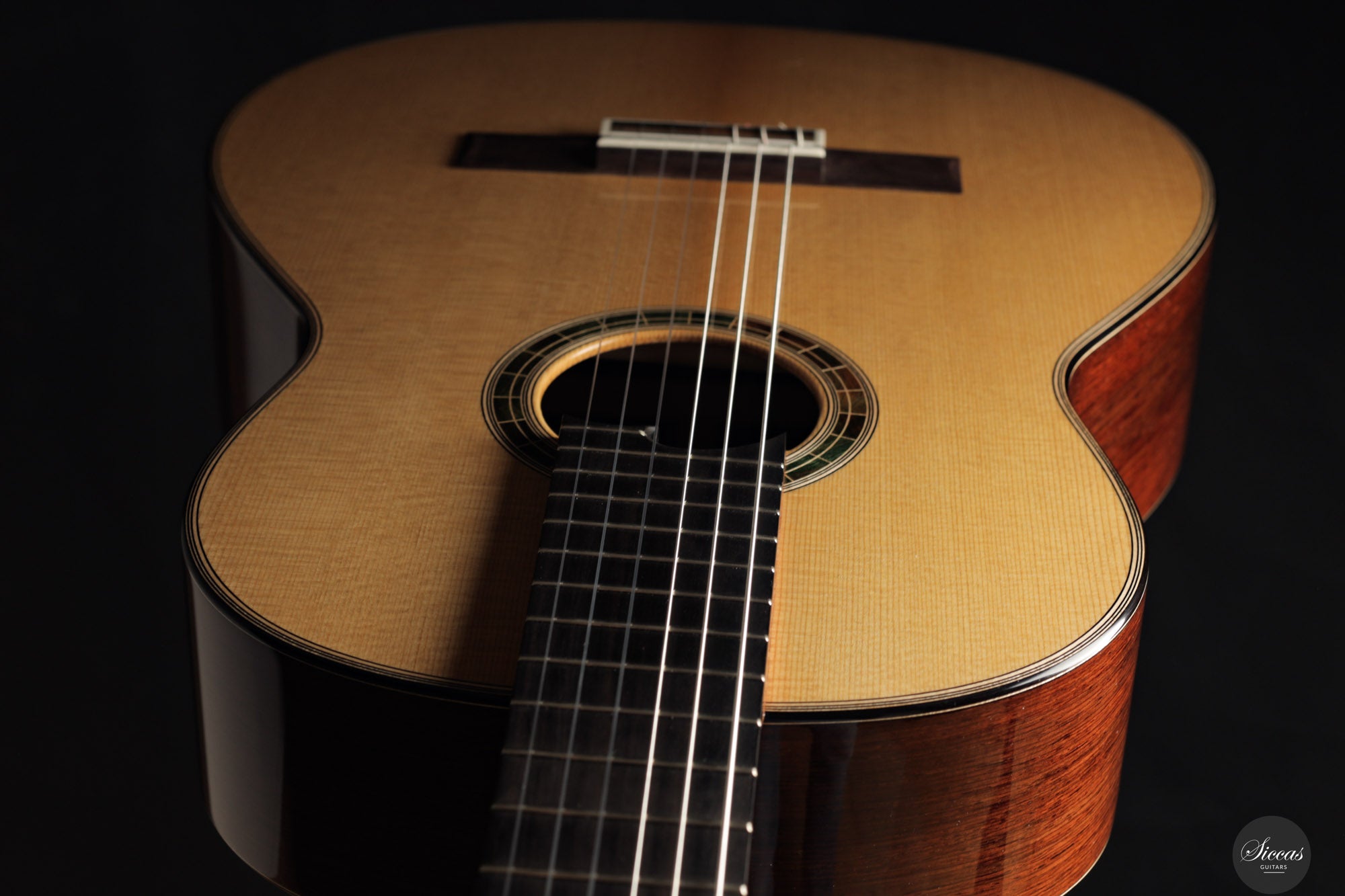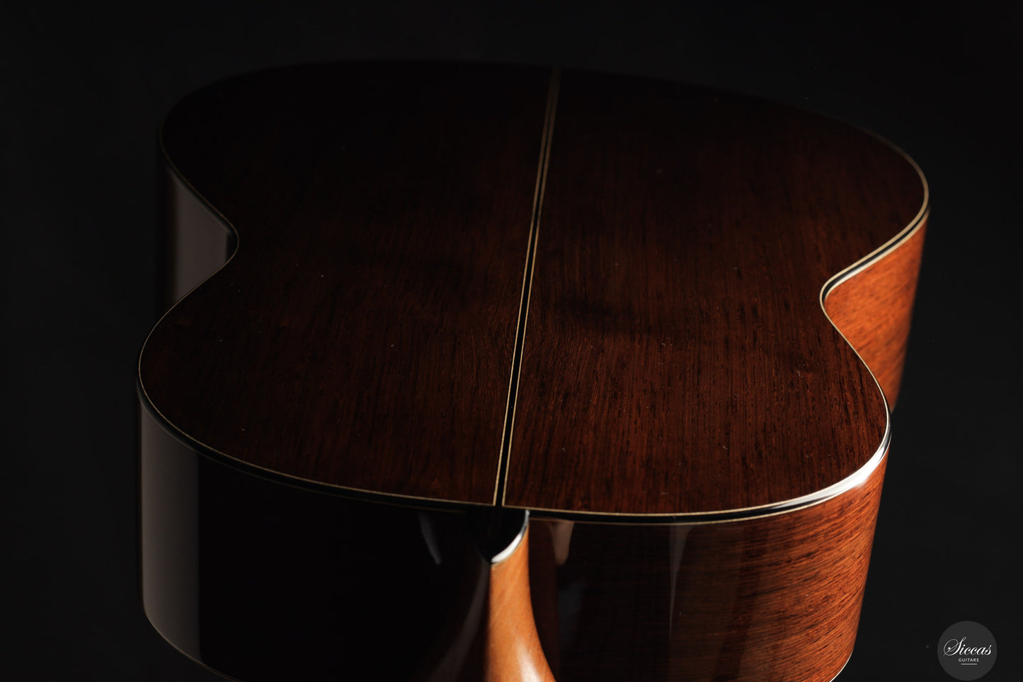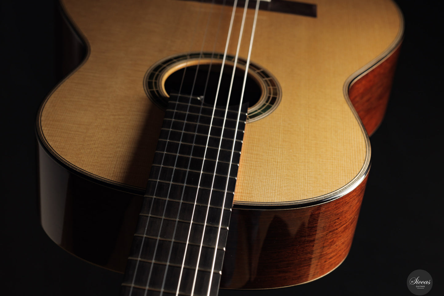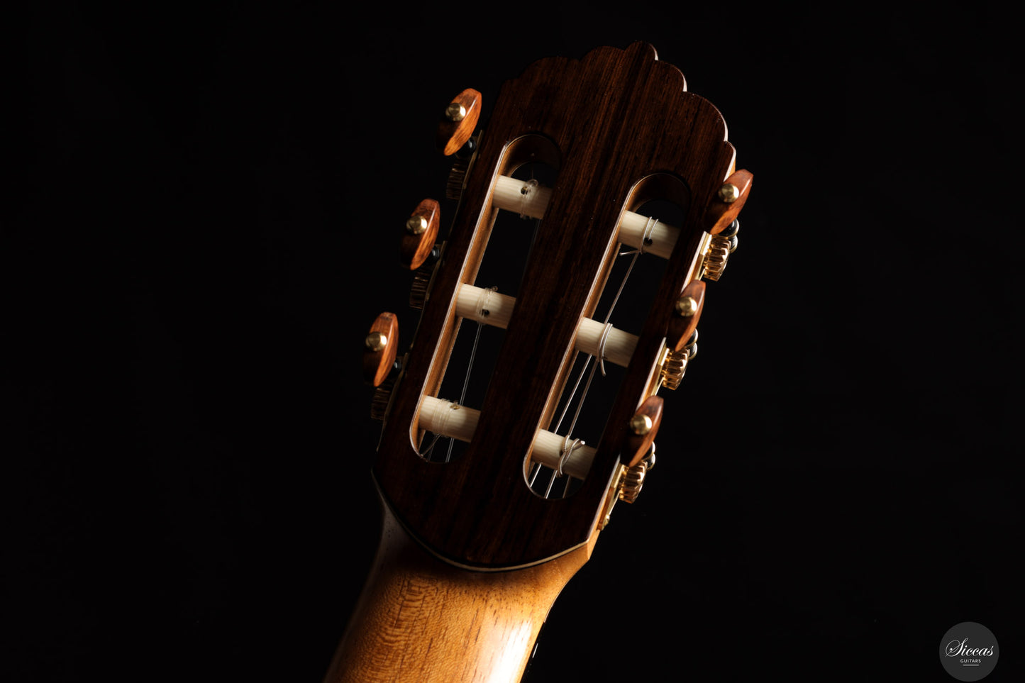 Diese Gitarre, vollendet im Jahr 2025 und mit der Nummer 63 versehen, ist ein Doubletop-Instrument mit einer Fichtendecke und Boden sowie Zargen aus madagassischem Palisander, veredelt mit Schellack. Mit einem Gewicht von 1675 Gramm ist sie moderat leicht und bietet die Projektion und den Dynamikumfang, die für Hummls Doubletop-Bauweise charakteristisch sind. Die Mensur beträgt 640 mm bei einer Sattelbreite von 52 mm, was eine komfortable Spielbarkeit ermöglicht, ohne auf die gewohnten Proportionen im Griffbrett verzichten zu müssen. Klanglich überzeugt die Gitarre durch eine ausgewogene Ansprache: die Diskanttöne sind klar, rund und mit langem Nachklang, die Bässe kraftvoll und tragfähig, während die Mitten voll und präsent wirken. Die Sensibilität ist hoch, sodass das Instrument unmittelbar auf feinste Veränderungen im Anschlag reagiert. Der Dynamikumfang ist breit, vom Pianissimo bis zum kraftvollen Forte bleibt der Ton stabil und differenziert. Die kürzere Mensur erleichtert das Spiel und verringert die Belastung der linken Hand, wodurch die Gitarre auch bei längeren Spielzeiten hohen Komfort bietet, ohne an Bühnenpräsenz einzubüßen. Mit ihrer sorgfältig abgestimmten Doubletop-Decke aus Fichte, dem klanglich tiefen madagassischen Palisander und der komfortablen Spielbarkeit verbindet diese Gitarre moderne Bauweise mit traditioneller Klangfülle. Sie ist mit Mechaniken von Klaus Scheller ausgestattet und wird in einem Hiscox Pro II Koffer geliefert.