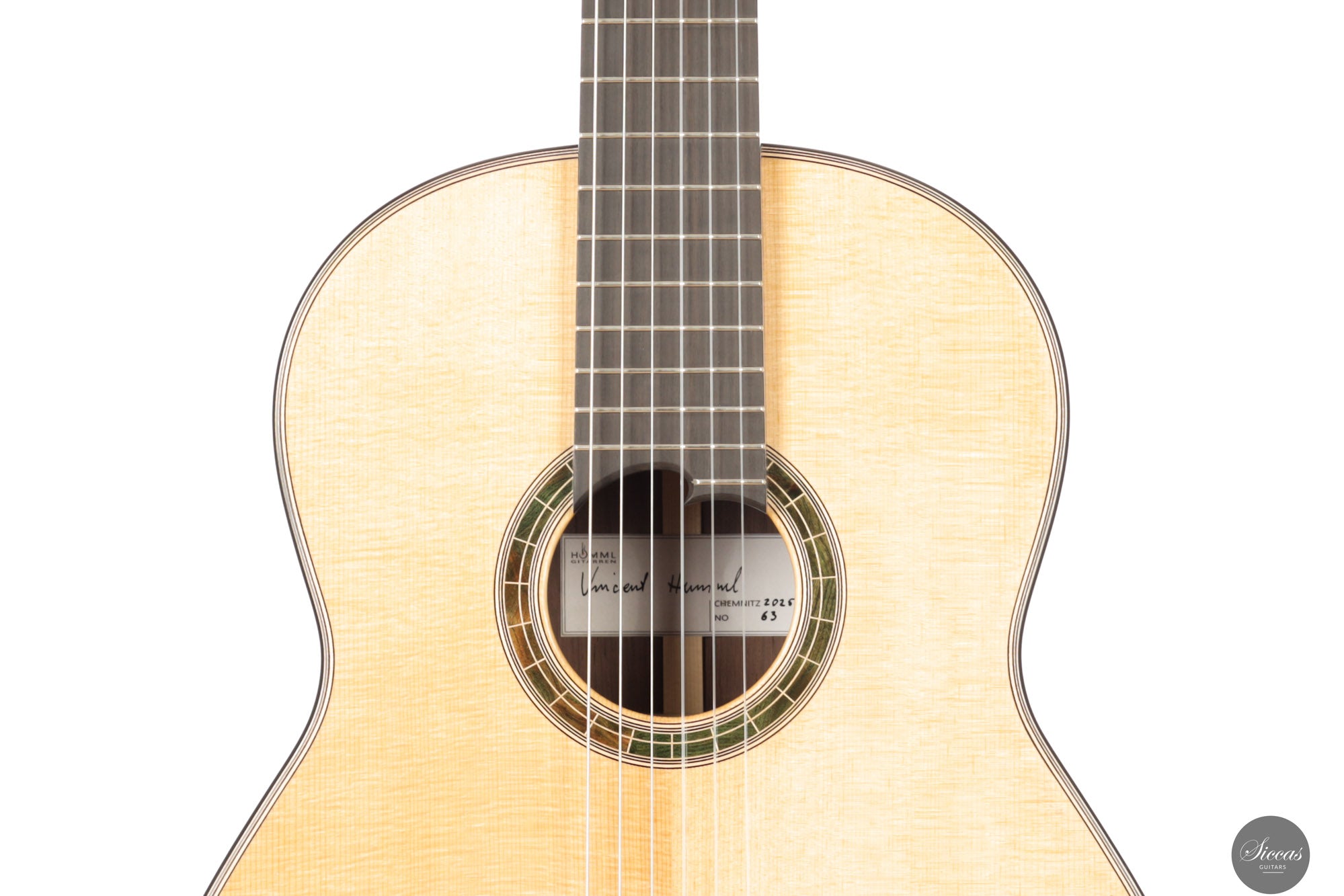 Vincent Humml gehört zur jüngeren Generation deutscher Gitarrenbauer. Seine Ausbildung zum Zupfinstrumentenmacher begann er in Markneukirchen und vertiefte seine Kenntnisse durch Praktika und spezialisierte Workshops. Im Jahr 2019 legte er erfolgreich die anspruchsvolle Meisterprüfung im Gitarrenbau ab und gründete anschließend seine Werkstatt in Chemnitz. Hummls Gitarren verbinden ein modernes Design mit den klanglichen Werten der Tradition. Besonders seine Doubletop-Instrumente zeigen seine Fähigkeit, große Projektion und Kraft mit Eleganz und klanglicher Feinheit zu vereinen. Sorgfältig ausgewählte Tonhölzer, präzise Verarbeitung und eine klare, geschmackvolle Ästhetik prägen seine Arbeit, die durch den Einsatz hochwertiger Komponenten wie Scheller-Mechaniken und Schellackoberflächen zusätzlich hervorgehoben wird.