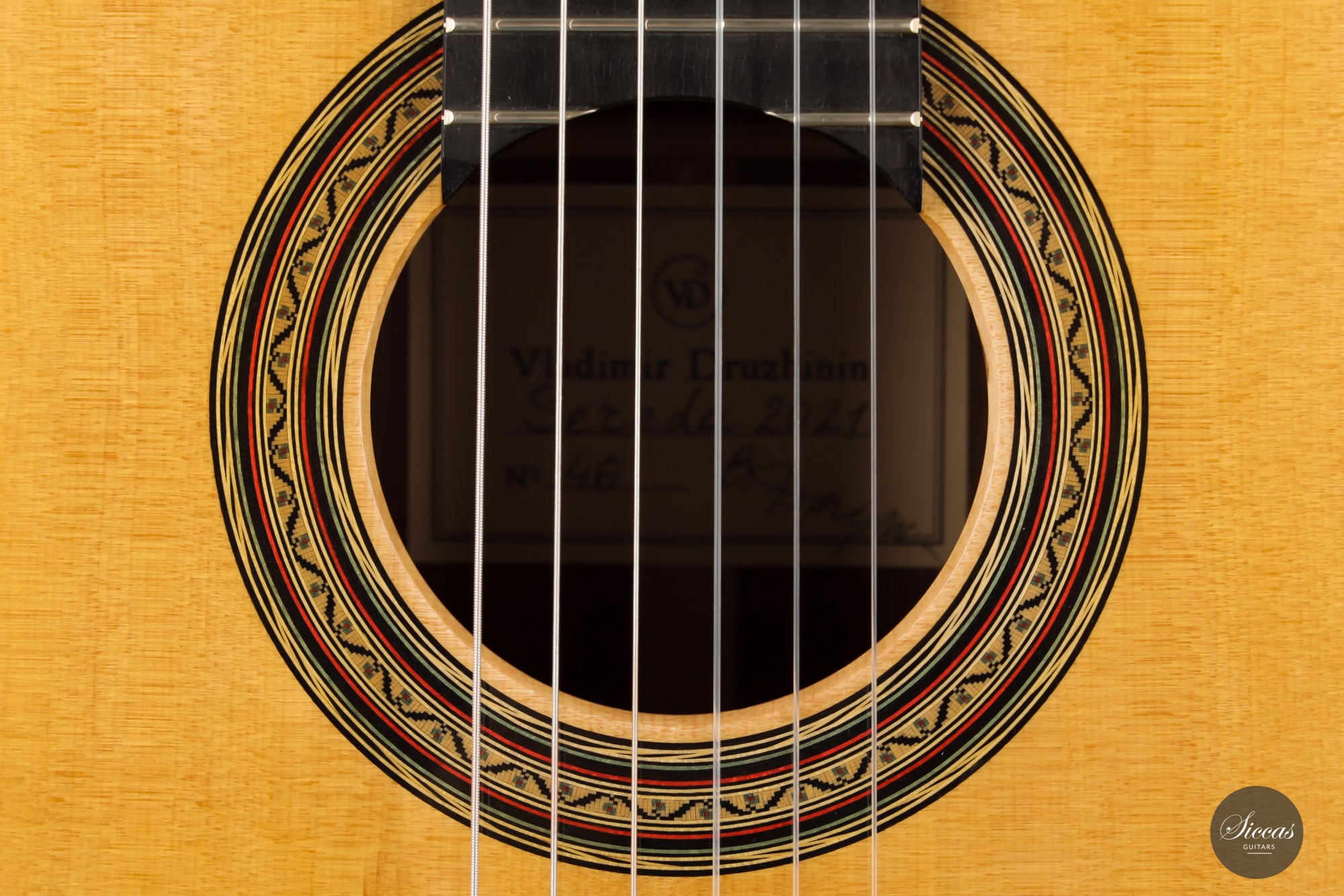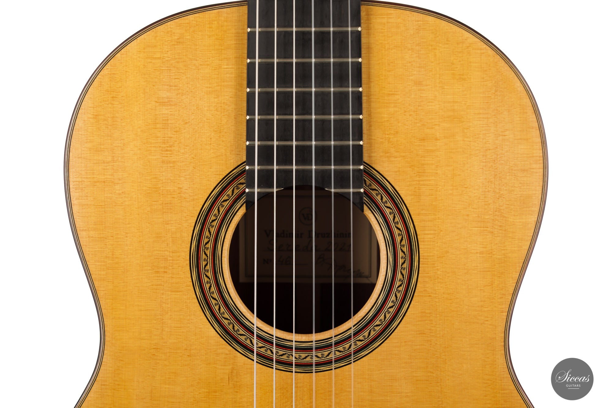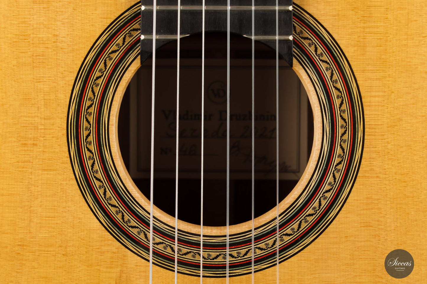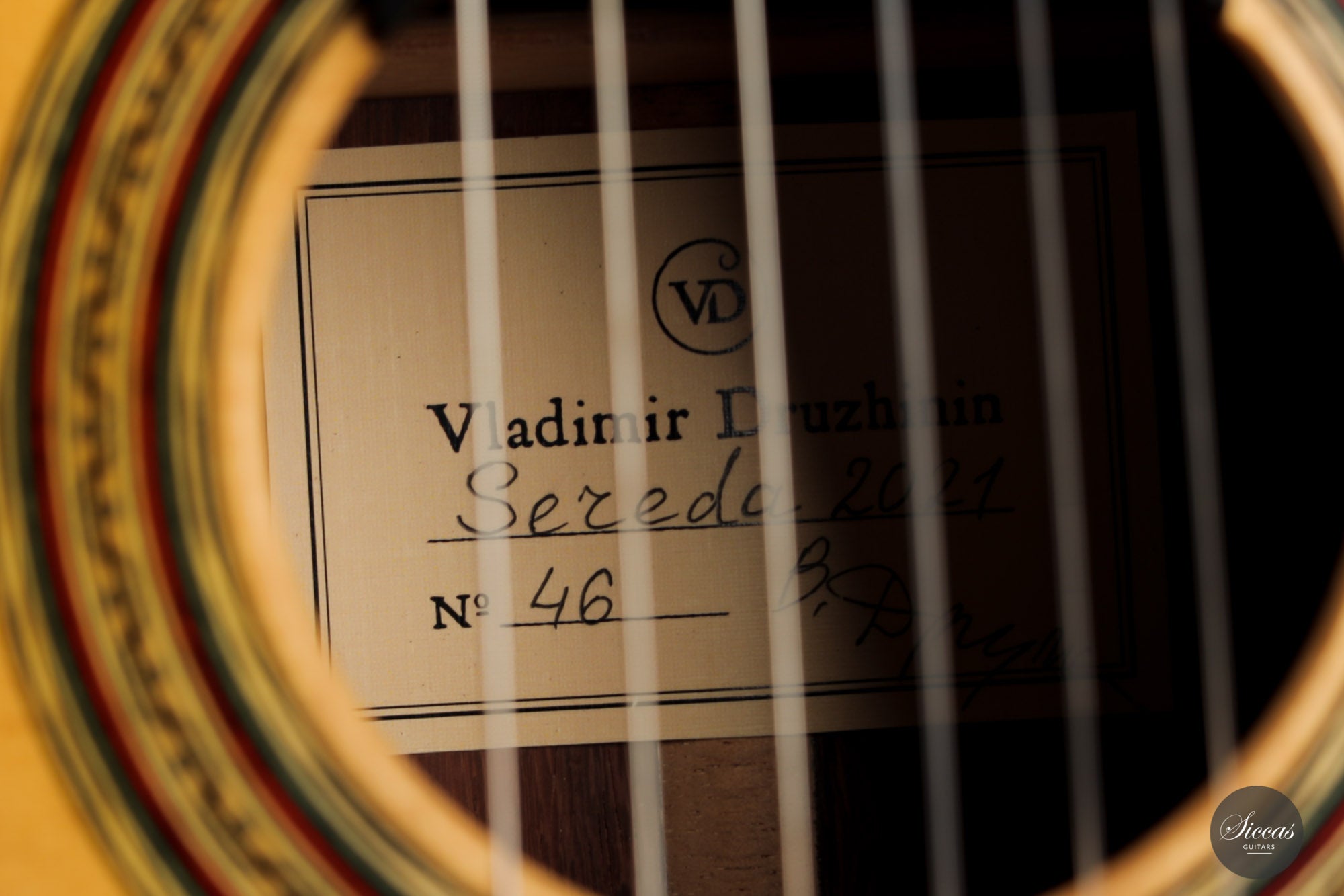 Vladimir Druzhinin was born in 1983 in Novosibirsk, Russia, in a scientist’s family. He graduated from high school with a major in mathematical physics in 2000 and successfully passed the entrance exams to Novosibirsk State University. Graduated with a Bachelor of Physics degree in 2004. Continued studies and graduated in 2006 with a master’s degree (specialization in accelerator physics). From 2000 to 2008 worked and was an intern at Budker Institute of Nuclear Physics. After this successful scientific career, Vladimir Druzhinin moved to Moscow as his passion for music took increasing importance in his life. He eventually switched to lutherie as his main occupation around 2010, as he apprenticed with the Russian luthier Timofey Tkach. Vladimir Druzhinin quickly became one of the most successful Russian luthiers, building elegant instrument showing a great influence of Spanish Masters as Antonio de Torres and Manuel Ramirez. His guitars are light and responsive, excellent on both acoustical and aesthetical levels.
