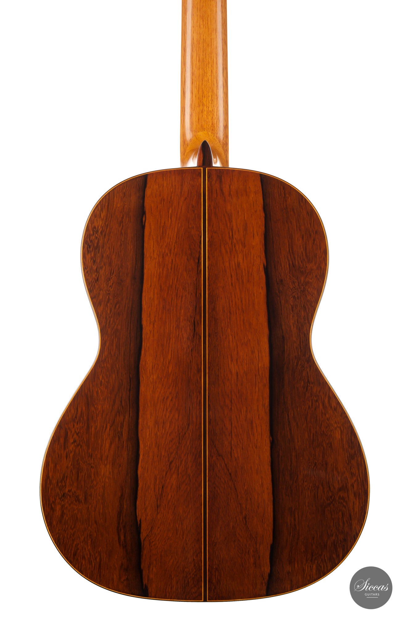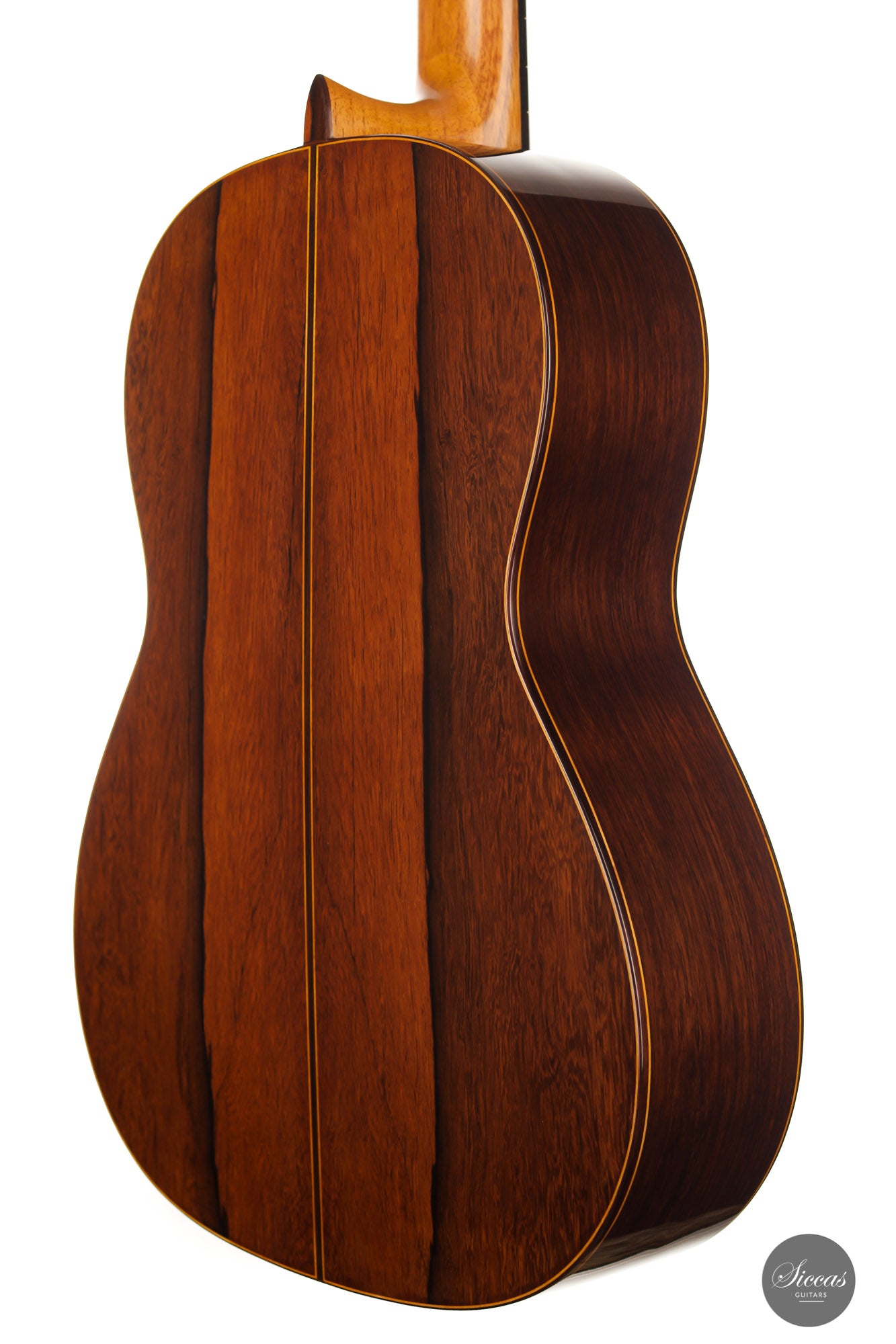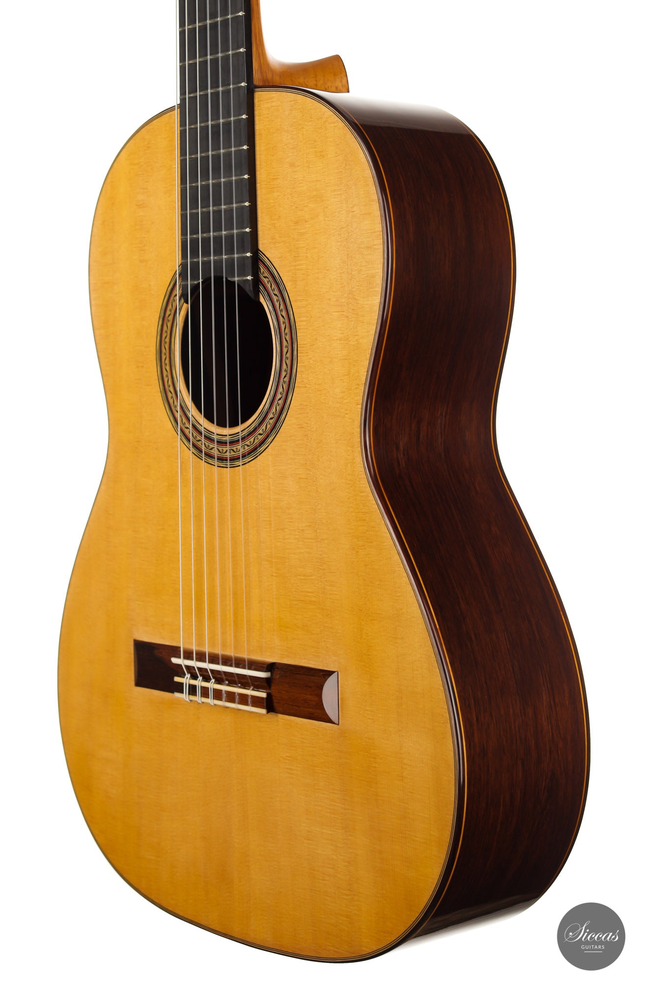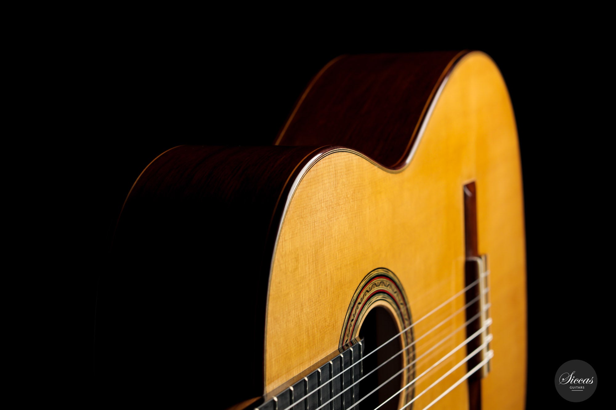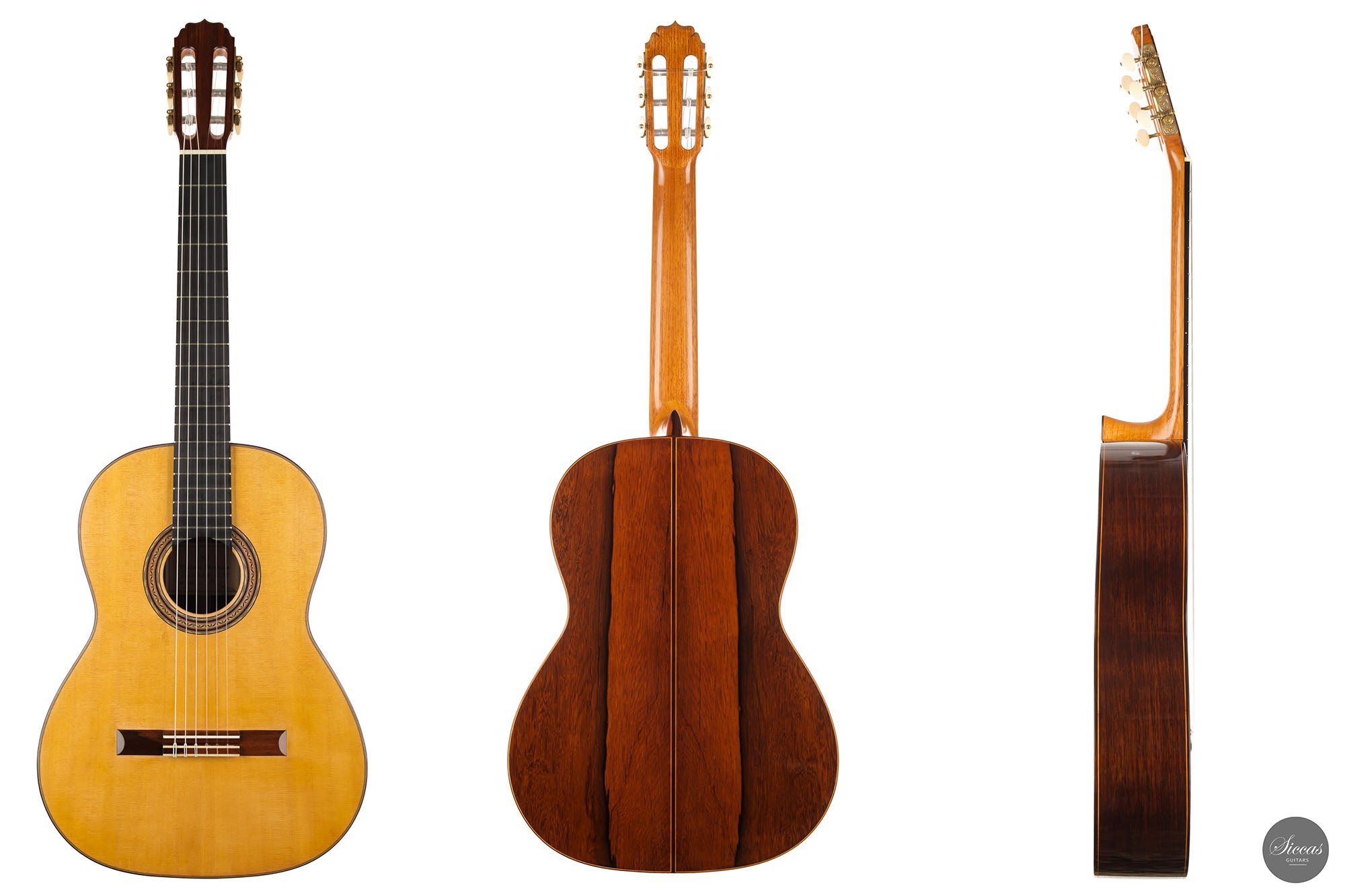 What a beautiful guitar! This stunning instrument is the first one that we receive from Vladimir Druzhinin, and certainly not the last. With its beautiful spruce top, displaying an authentic honey colour, and its elegant Madagascar rosewood back and sides, it is both an eye-catcher and convincing design in the Spanish tradition. From the guitarist’s point of view, this guitar’s tone is incredibly quick and bouncy. The responsiveness of the soundboard and the overall energy that emanates from it are incredible. Moreover, with its well-proportionated neck and relatively lightweight, this guitar is a real pleasure to play.