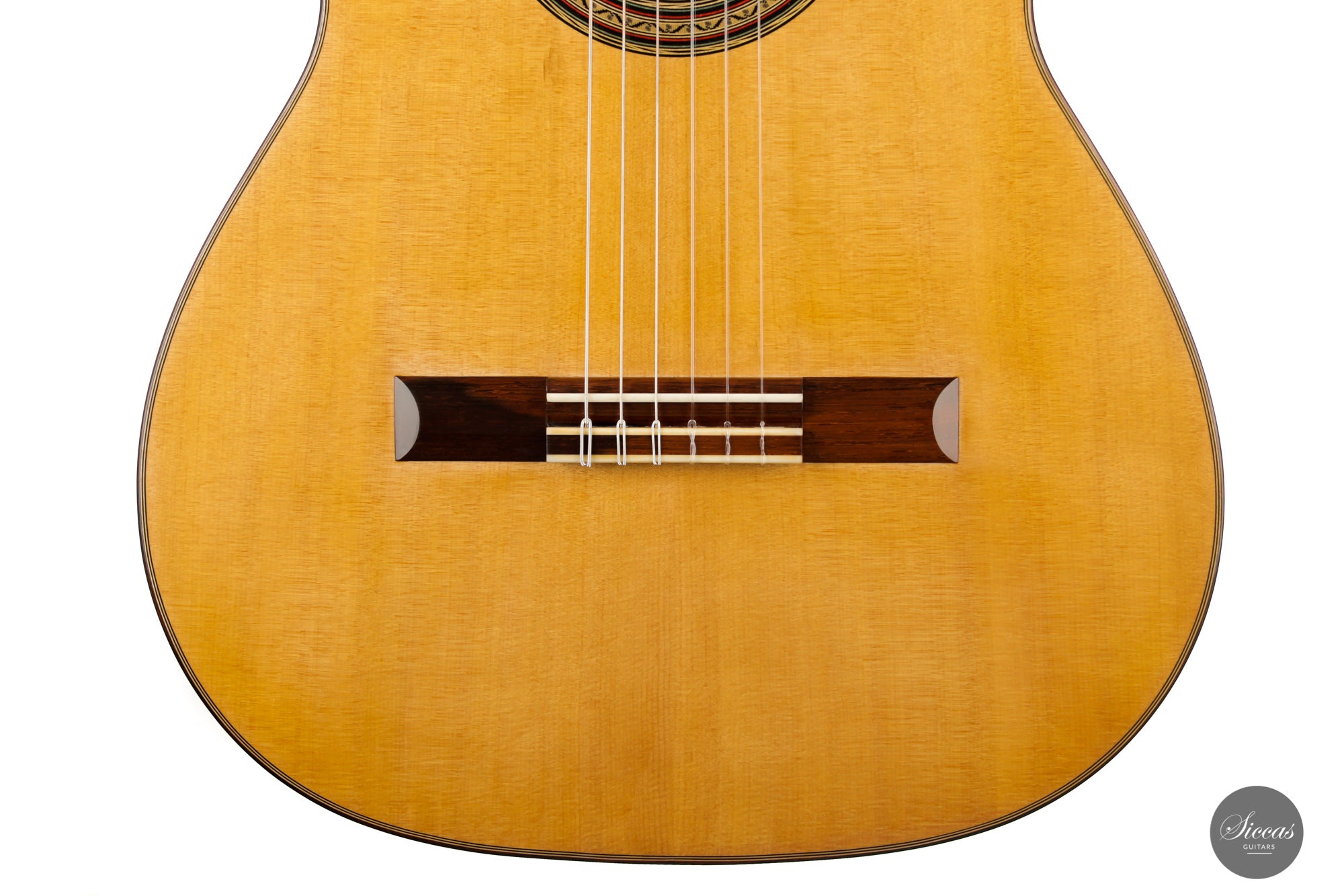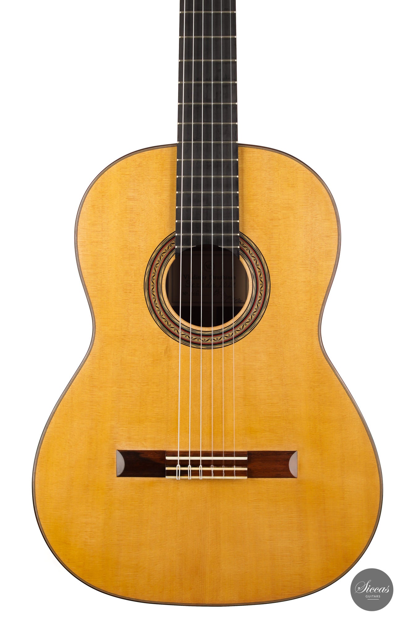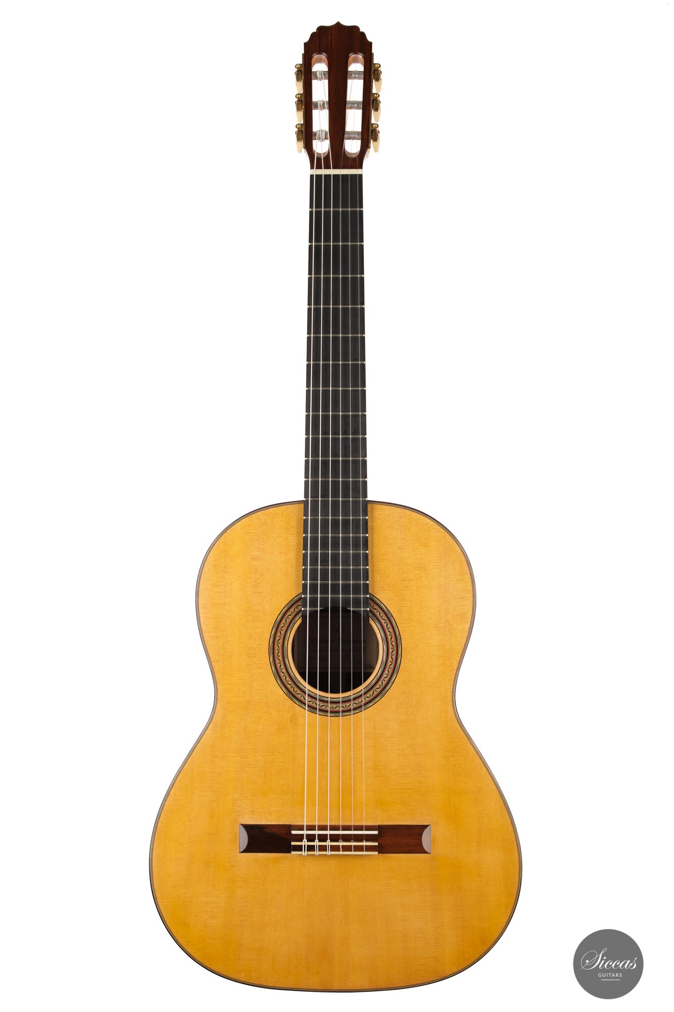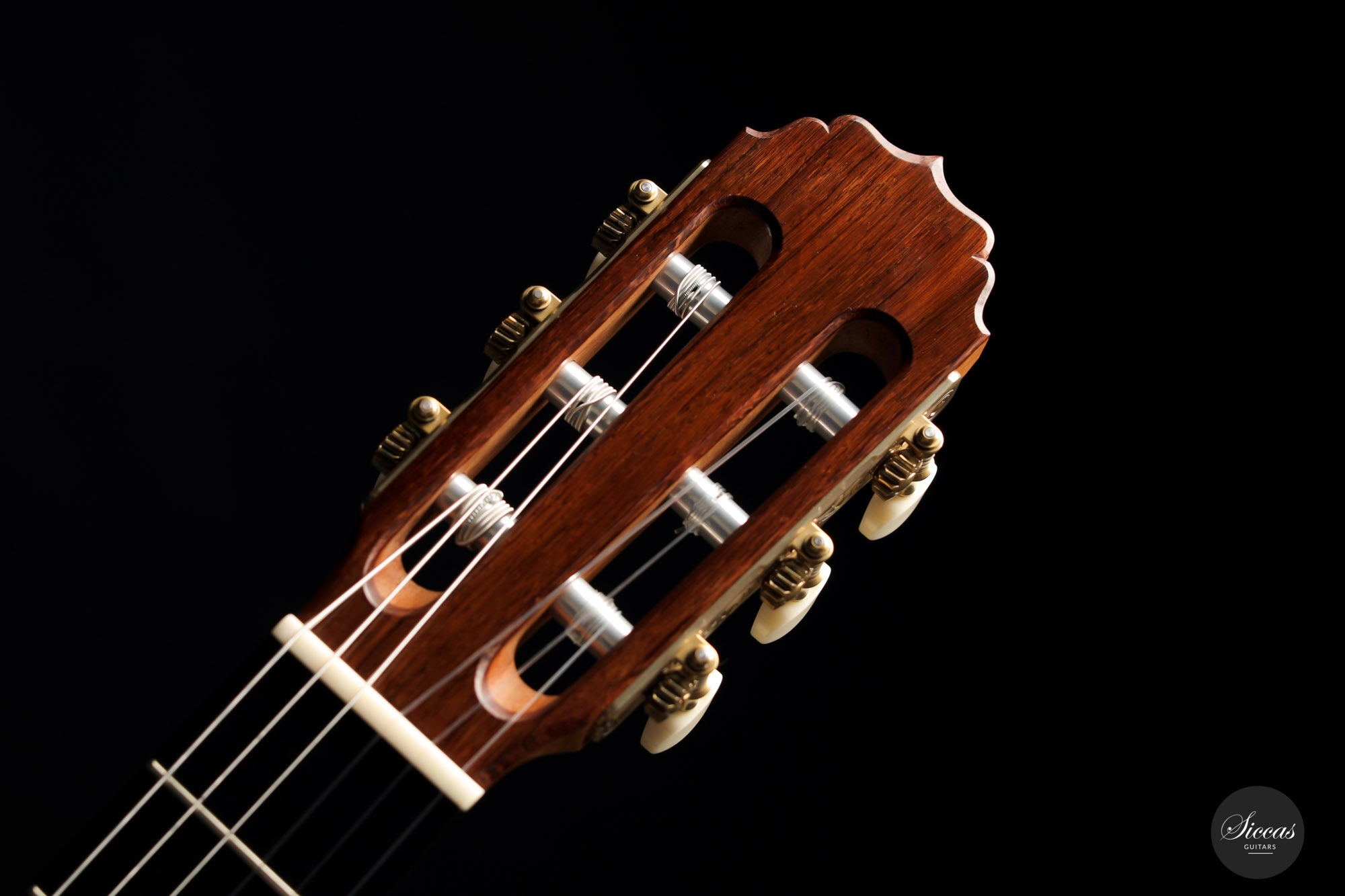 What a beautiful guitar! This stunning instrument is the first one that we receive from Vladimir Druzhinin, and certainly not the last. With its beautiful spruce top, displaying an authentic honey colour, and its elegant Madagascar rosewood back and sides, it is both an eye-catcher and convincing design in the Spanish tradition. From the guitarist’s point of view, this guitar’s tone is incredibly quick and bouncy. The responsiveness of the soundboard and the overall energy that emanates from it are incredible. Moreover, with its well-proportionated neck and relatively lightweight, this guitar is a real pleasure to play.