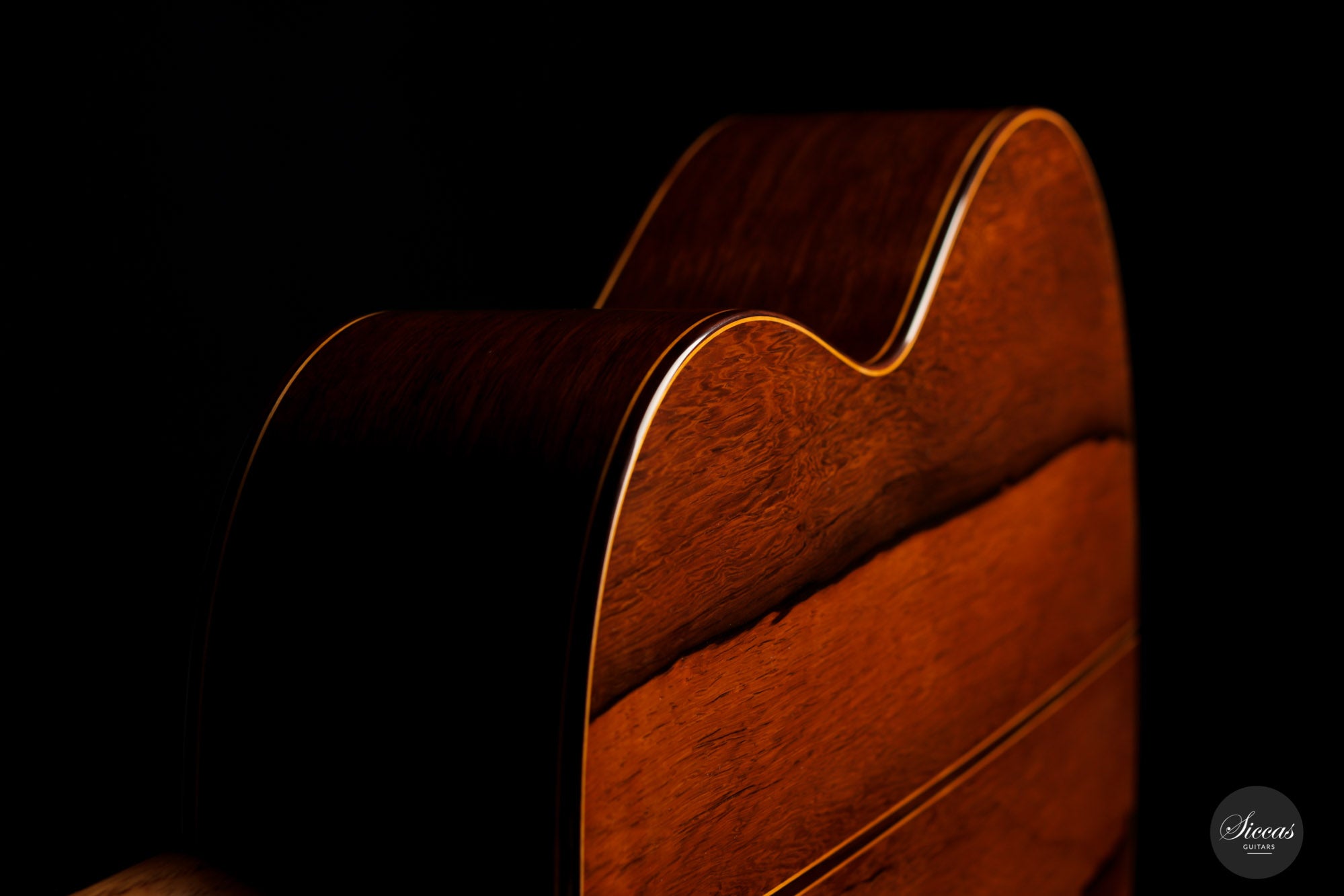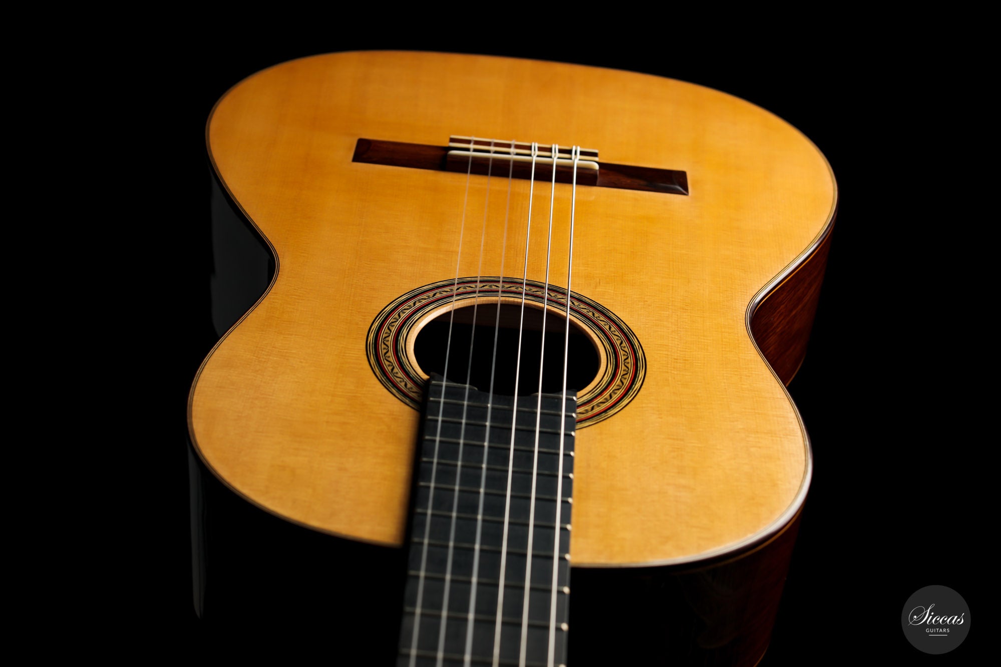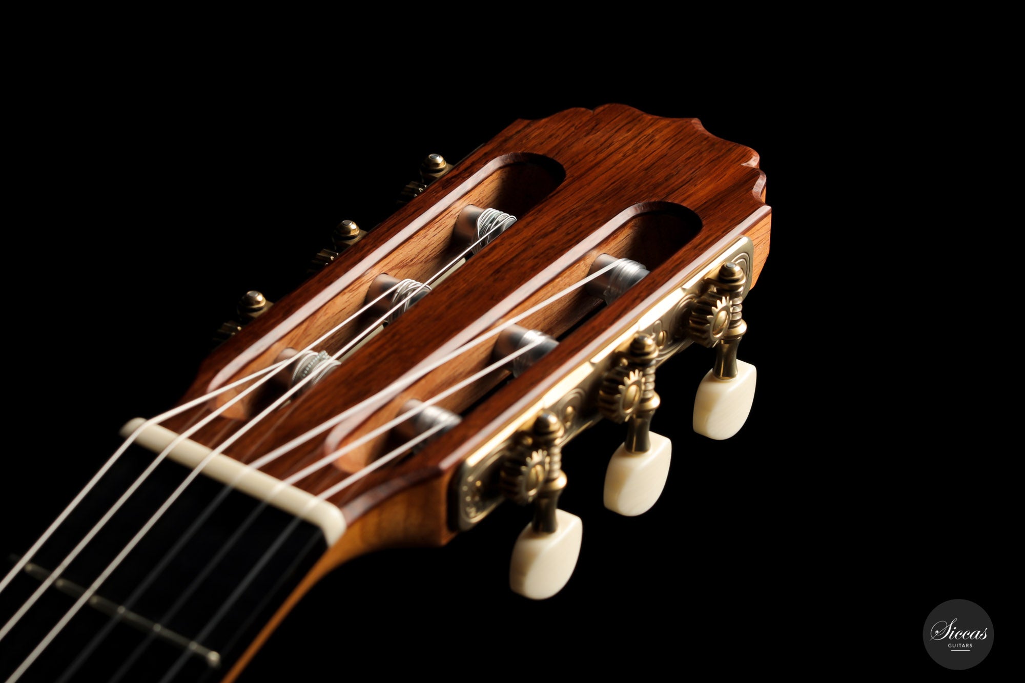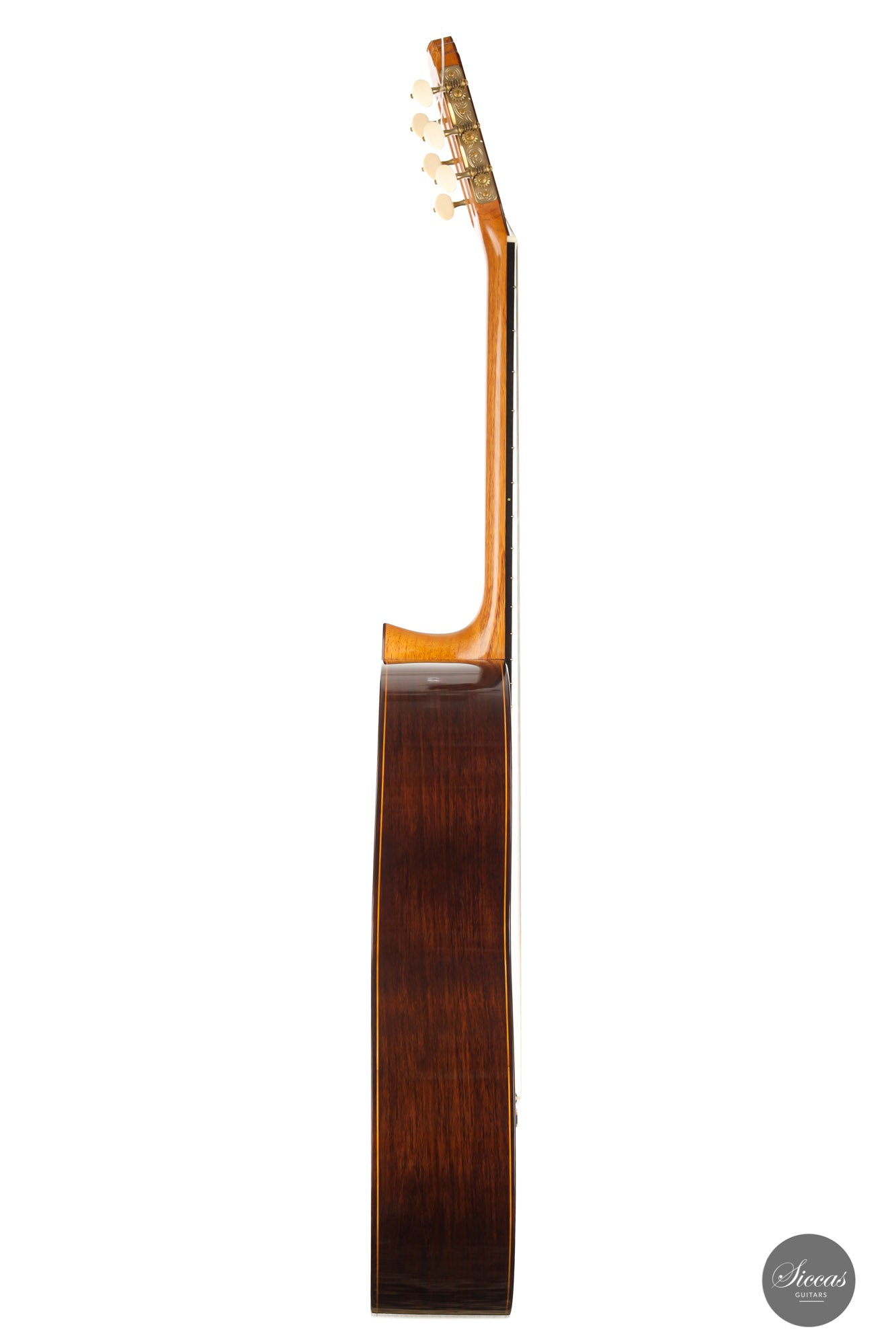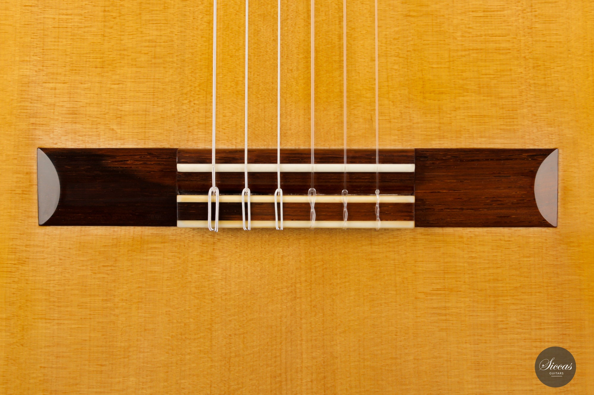 What a beautiful guitar! This stunning instrument is the first one that we receive from Vladimir Druzhinin, and certainly not the last. With its beautiful spruce top, displaying an authentic honey colour, and its elegant Madagascar rosewood back and sides, it is both an eye-catcher and convincing design in the Spanish tradition. From the guitarist’s point of view, this guitar’s tone is incredibly quick and bouncy. The responsiveness of the soundboard and the overall energy that emanates from it are incredible. Moreover, with its well-proportionated neck and relatively lightweight, this guitar is a real pleasure to play.
