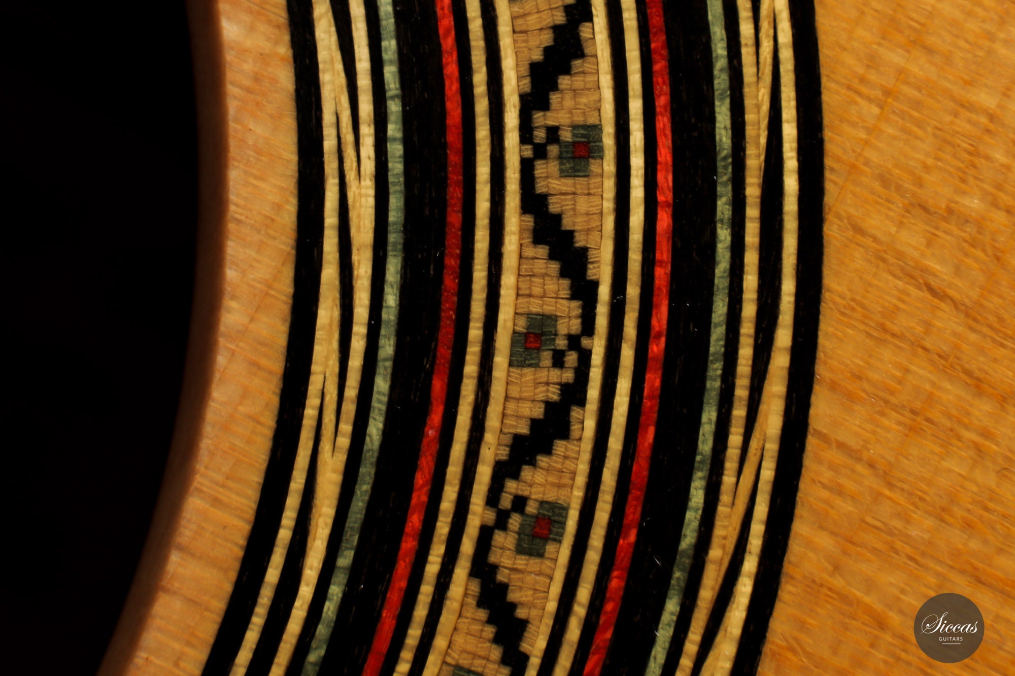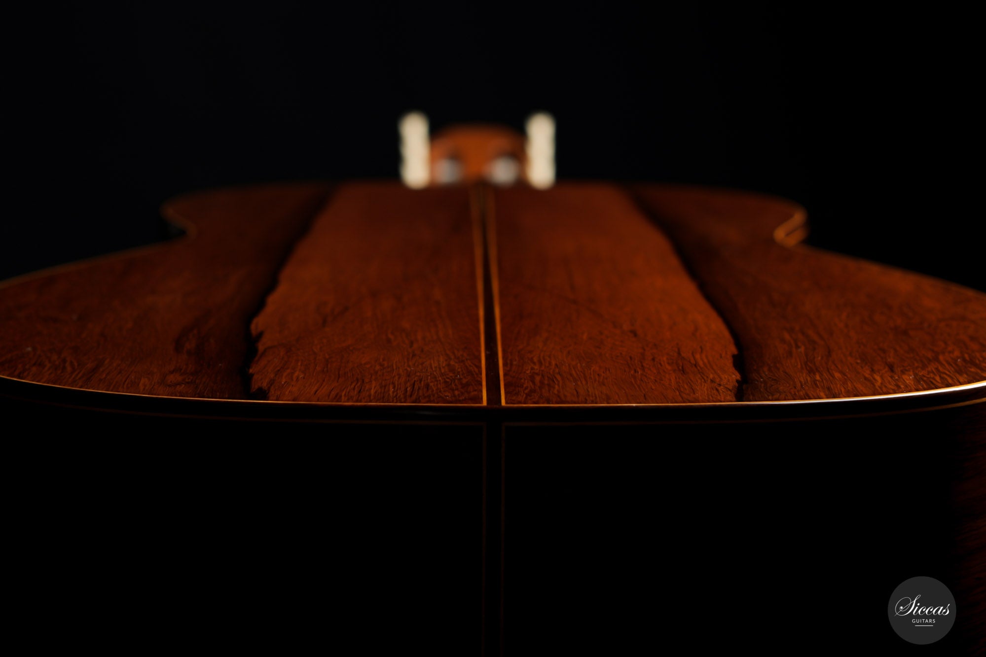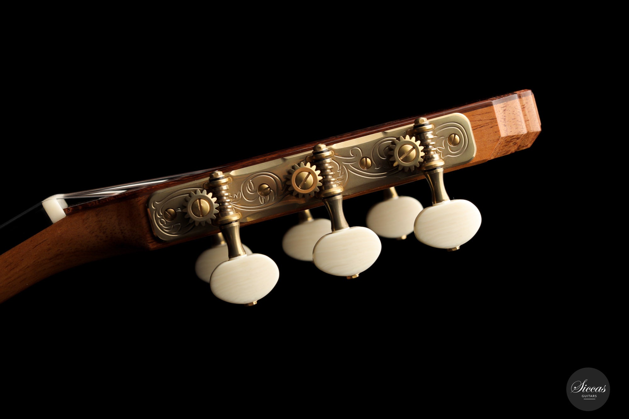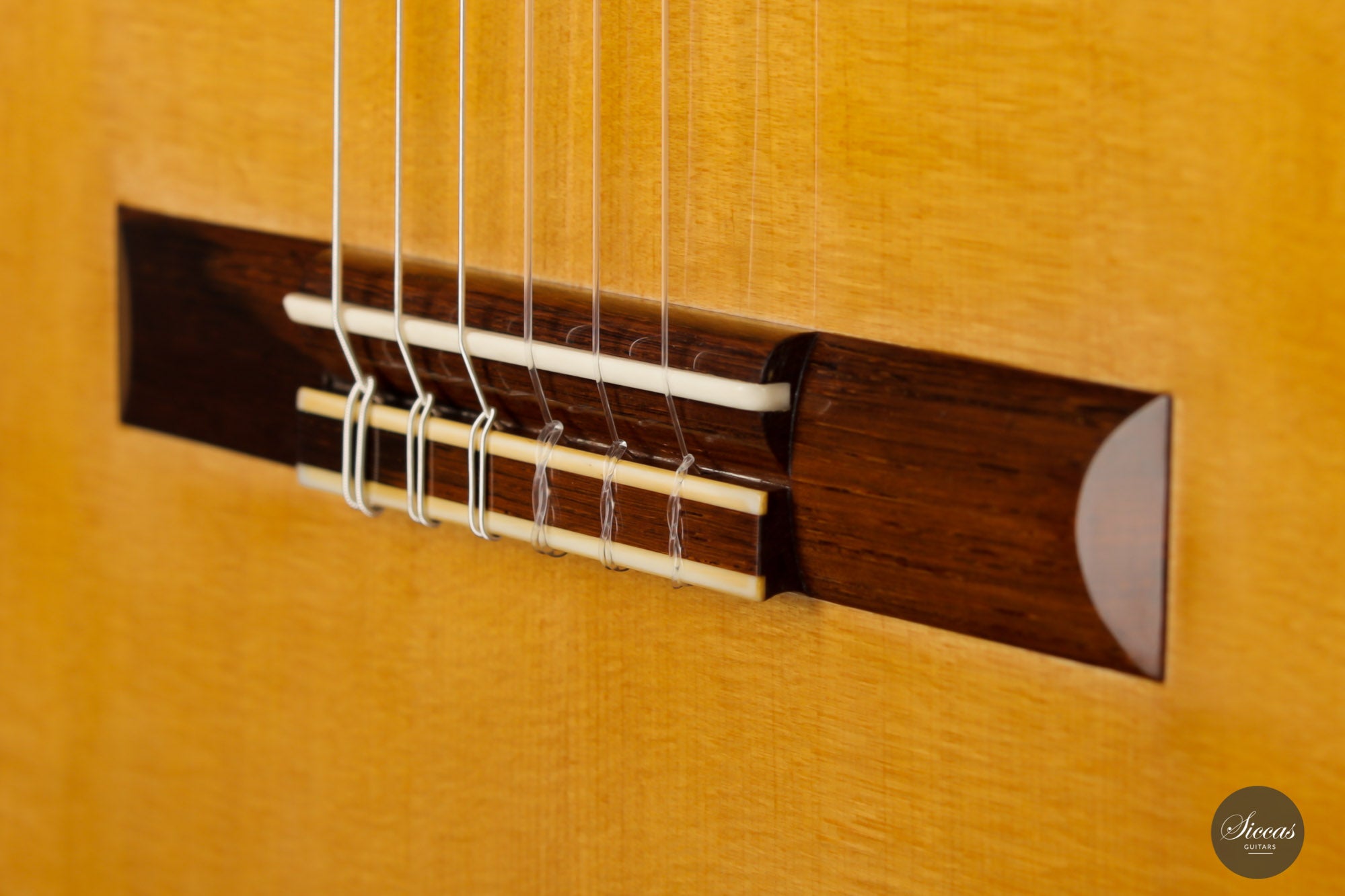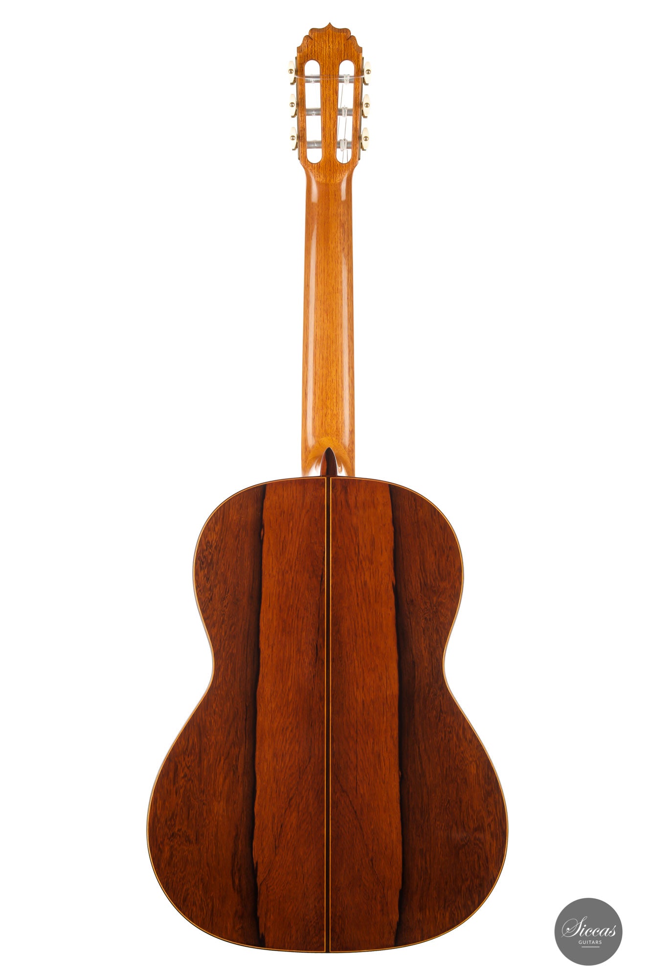 What a beautiful guitar! This stunning instrument is the first one that we receive from Vladimir Druzhinin, and certainly not the last. With its beautiful spruce top, displaying an authentic honey colour, and its elegant Madagascar rosewood back and sides, it is both an eye-catcher and convincing design in the Spanish tradition. From the guitarist’s point of view, this guitar’s tone is incredibly quick and bouncy. The responsiveness of the soundboard and the overall energy that emanates from it are incredible. Moreover, with its well-proportionated neck and relatively lightweight, this guitar is a real pleasure to play.