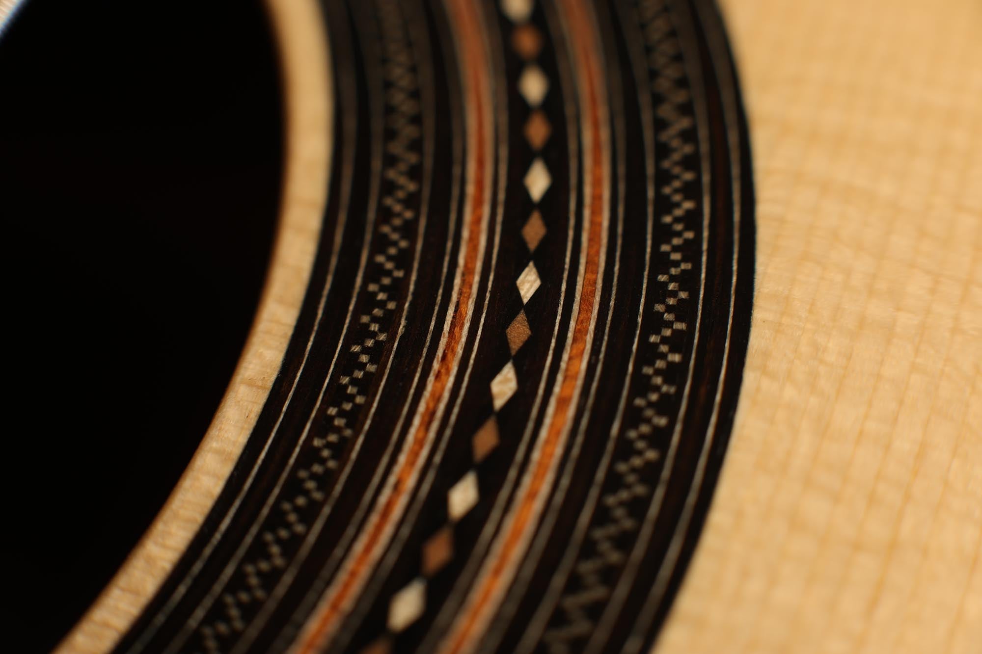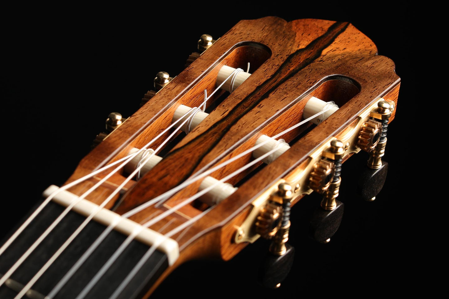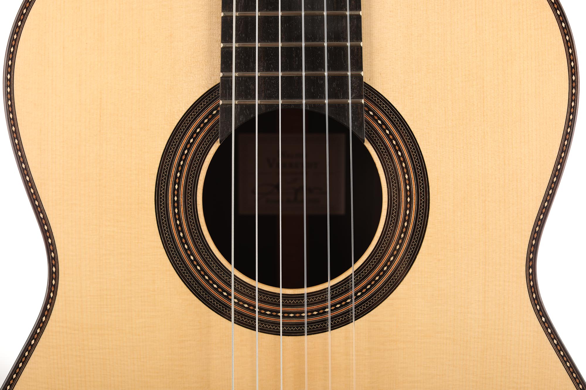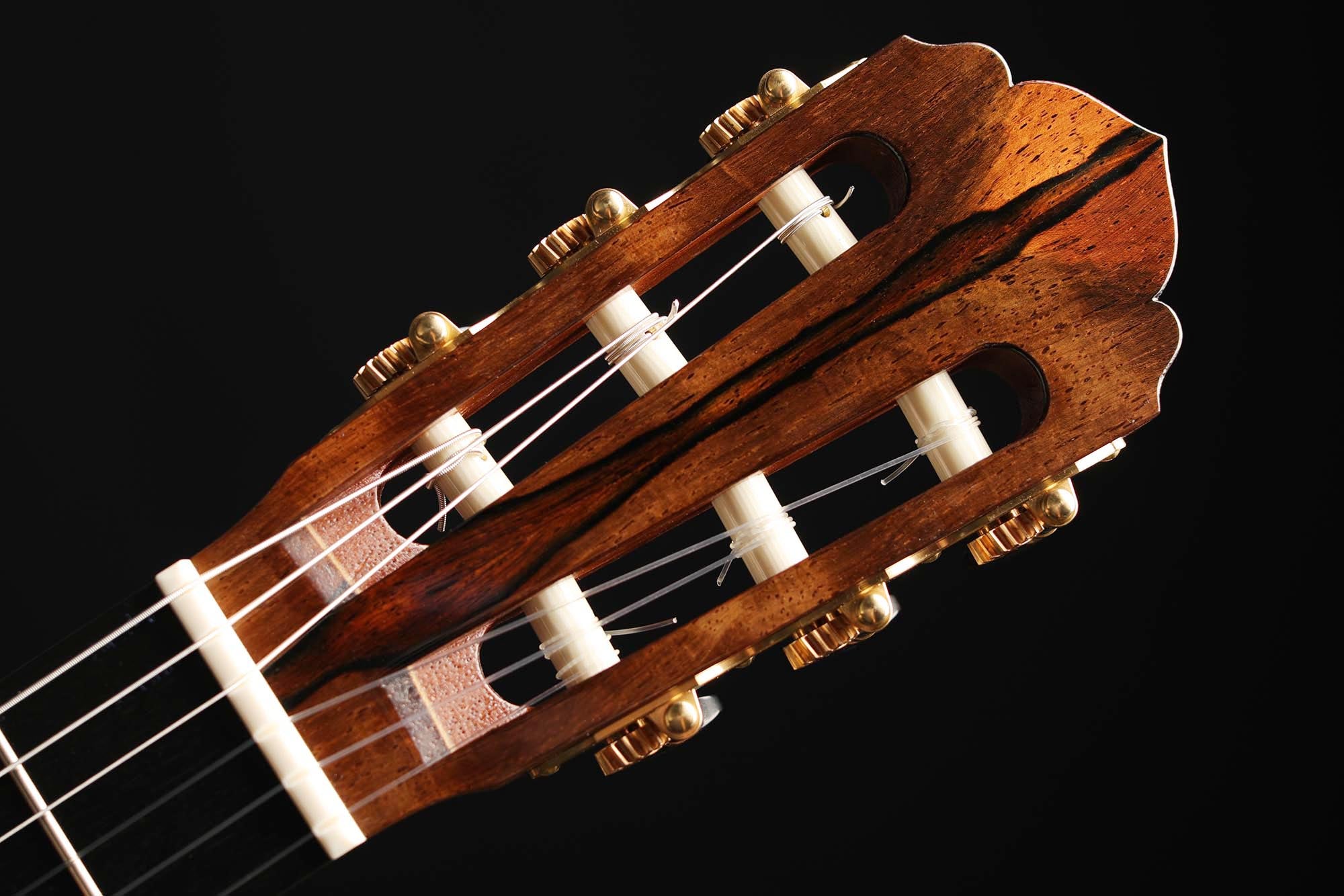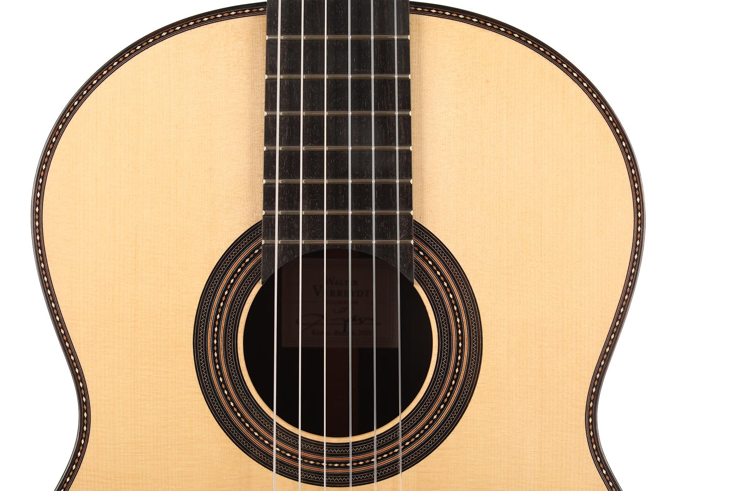 Die Gitarren von Walter Verreydt erkennt man auch an den filigranen Intarsien. Darüber hinaus ist dieses Instrument aufwändig verziert mit einer Rosette, die drei geometrische Friese aufweist und am Deckenrand das zentrale Muster der Rosette aufnimmt. Die Eleganz des sehr figurativ anmutenden Kopffurniers sowie die deutschen Klaus Scheller Mechaniken unterstreichen einmal mehr die Bedeutung, die Walter Verreydt der Ästhetik dieser Gitarre zukommen ließ. Folglich ist diese Gitarre von erlesener Handwerkskunst und ein Instrument, das auch klanglich hohen Ansprüchen gerecht wird und viele Gitarristen und deren Zuhörer begeistern wird.