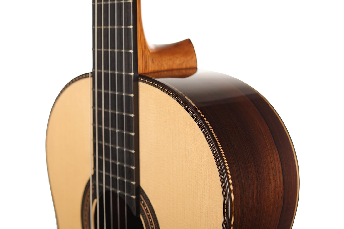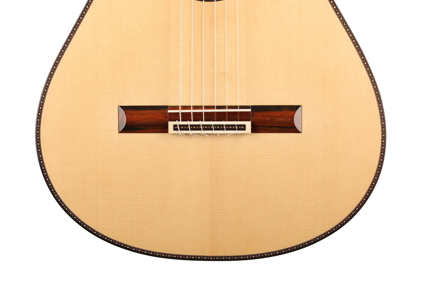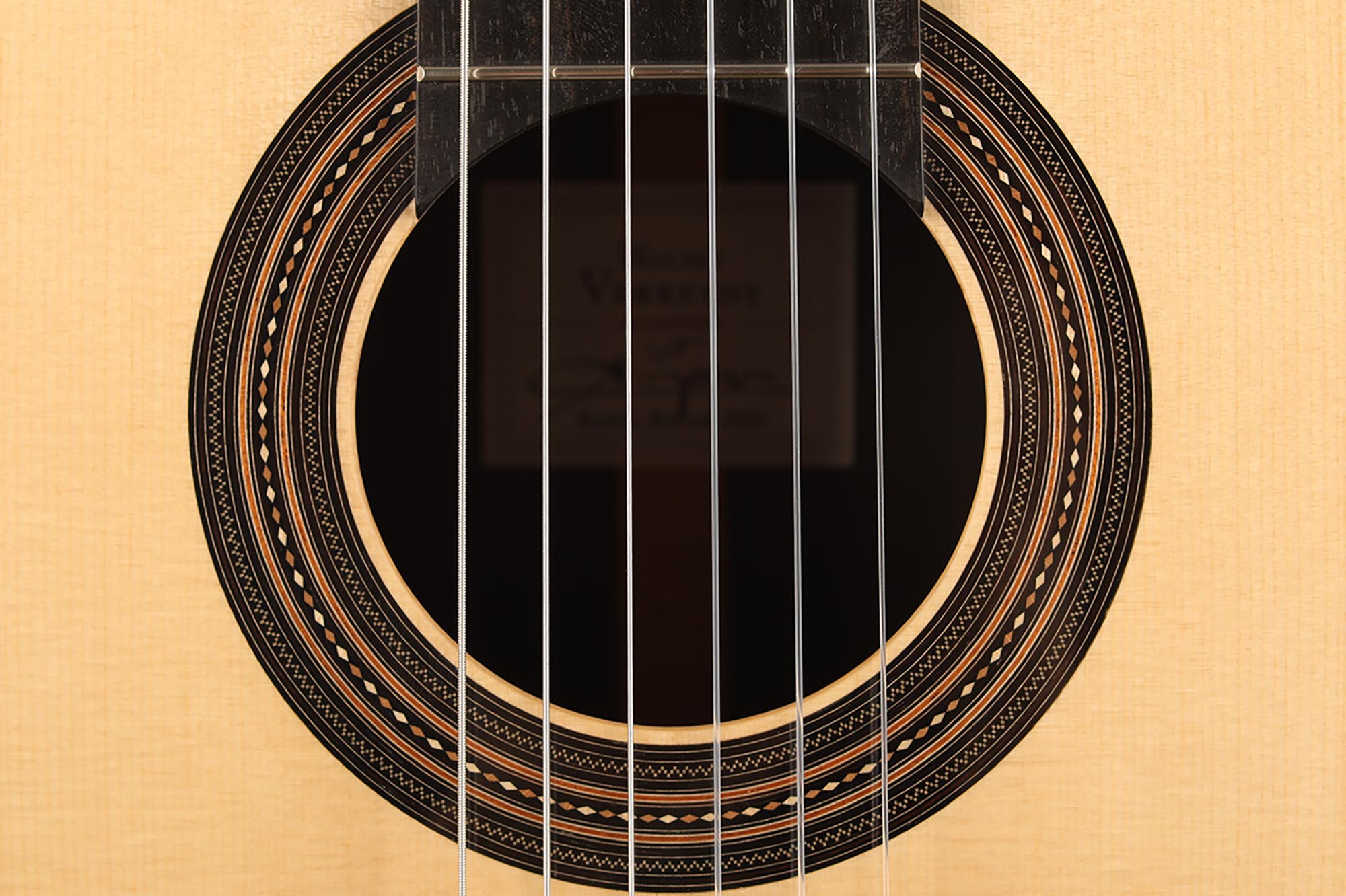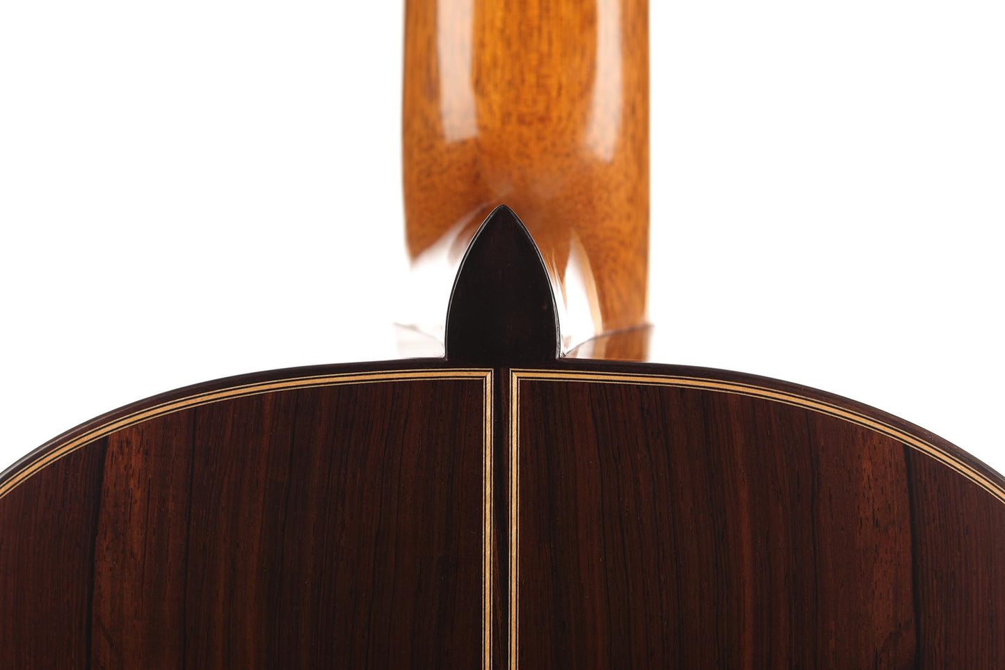 Diese neue, 2020 gebaute Gitarre zeichnet sich durch große Eleganz und Raffinesse bis ins kleinste Detail aus. Für dieses Instrument wurde ein wunderschöner Satz aus sehr dichtem und besonders dunklem Rio Palisander (CITES-zertifiziert) gewählt. Das Holz weist parallele schwarze Adern auf, die perfekt mit den orangefarbenen und grünen Reflexen des Holzes kontrastieren. Die Fichtendecke, wie auch der Rest des Instruments, ist französisch poliert mit klarem Schellack, der die Holzmaserung in ihrer ganzen natürlichen Schönheit zum Vorschein bringt.
