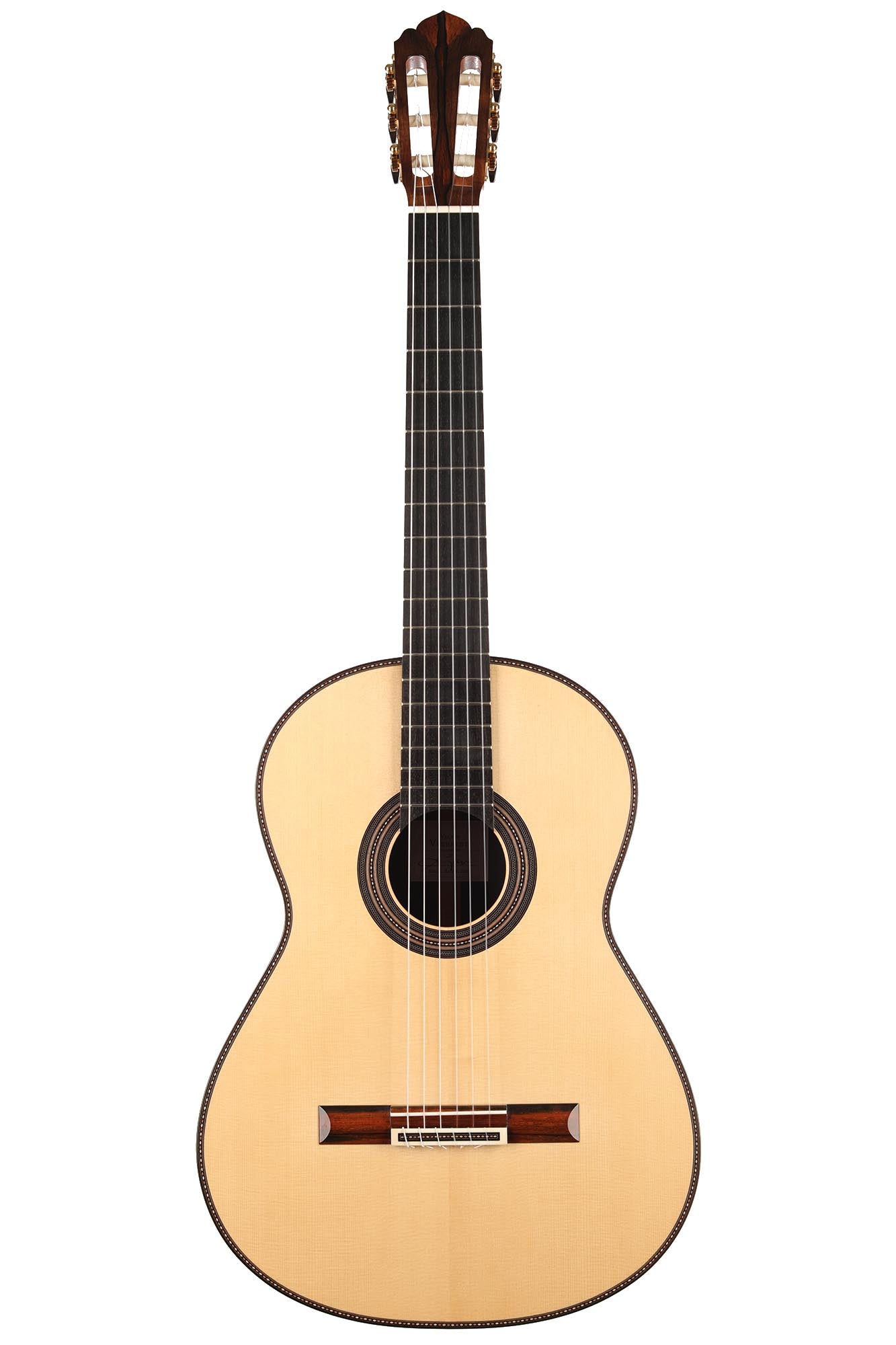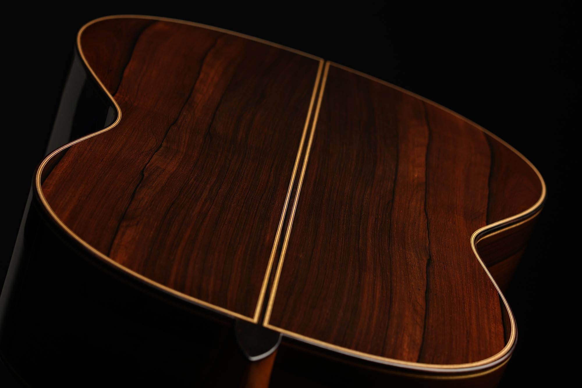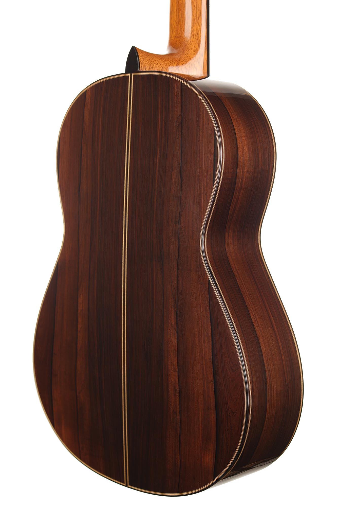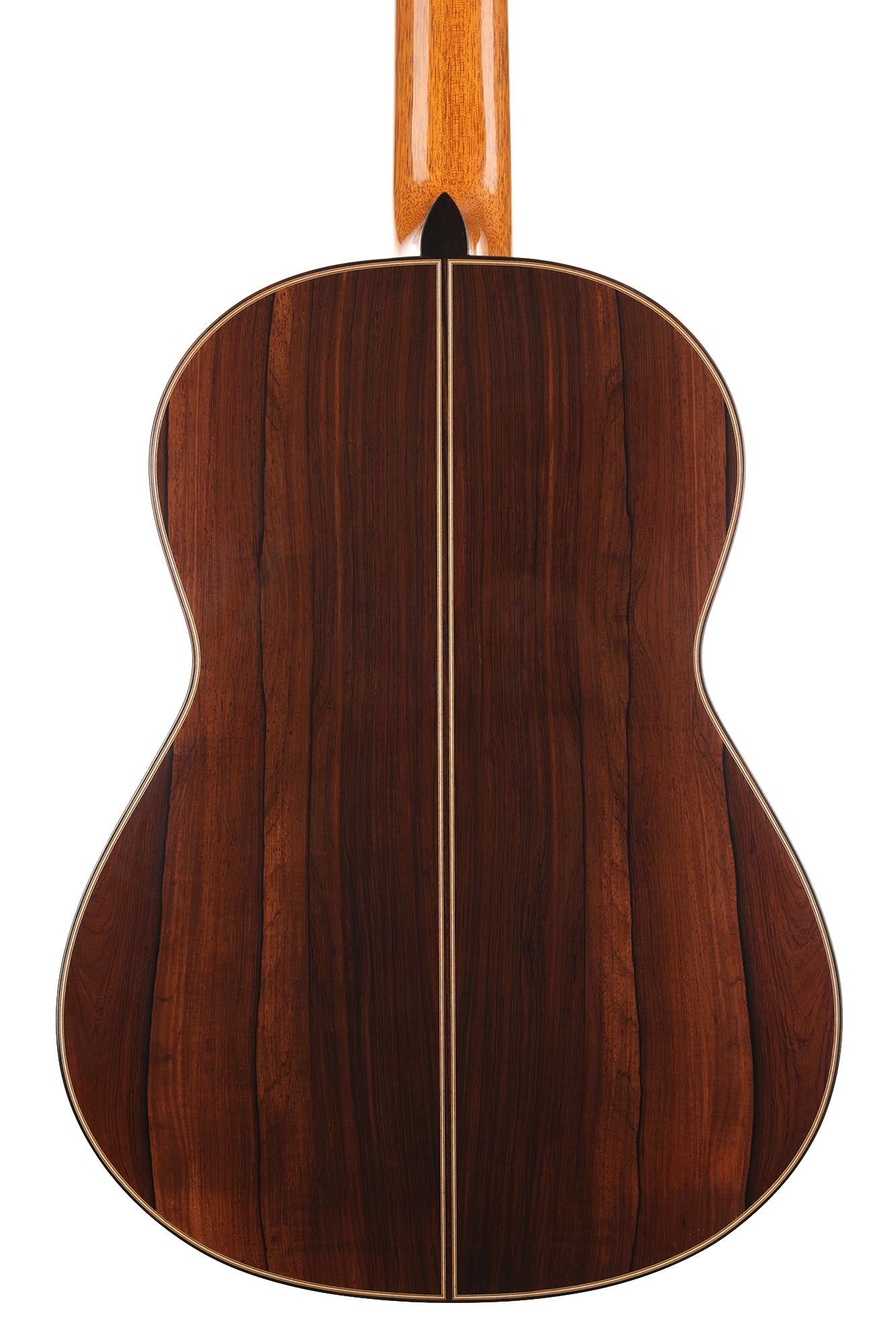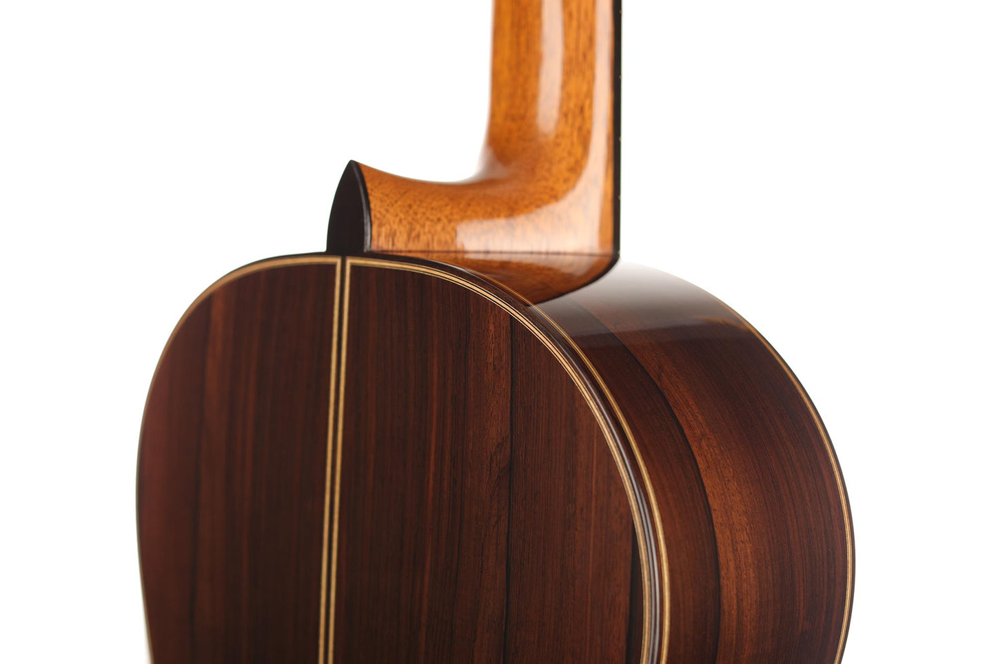 Diese neue, 2020 gebaute Gitarre zeichnet sich durch große Eleganz und Raffinesse bis ins kleinste Detail aus. Für dieses Instrument wurde ein wunderschöner Satz aus sehr dichtem und besonders dunklem Rio Palisander (CITES-zertifiziert) gewählt. Das Holz weist parallele schwarze Adern auf, die perfekt mit den orangefarbenen und grünen Reflexen des Holzes kontrastieren. Die Fichtendecke, wie auch der Rest des Instruments, ist französisch poliert mit klarem Schellack, der die Holzmaserung in ihrer ganzen natürlichen Schönheit zum Vorschein bringt.