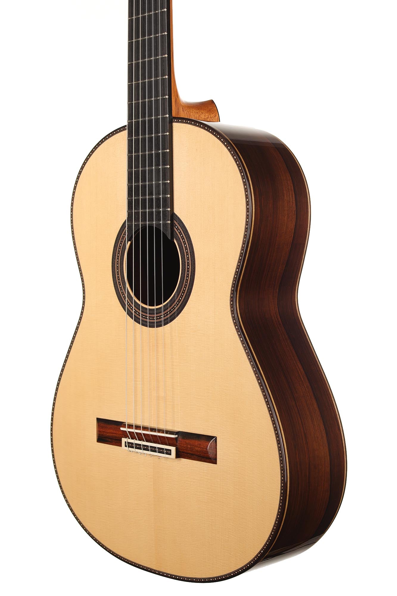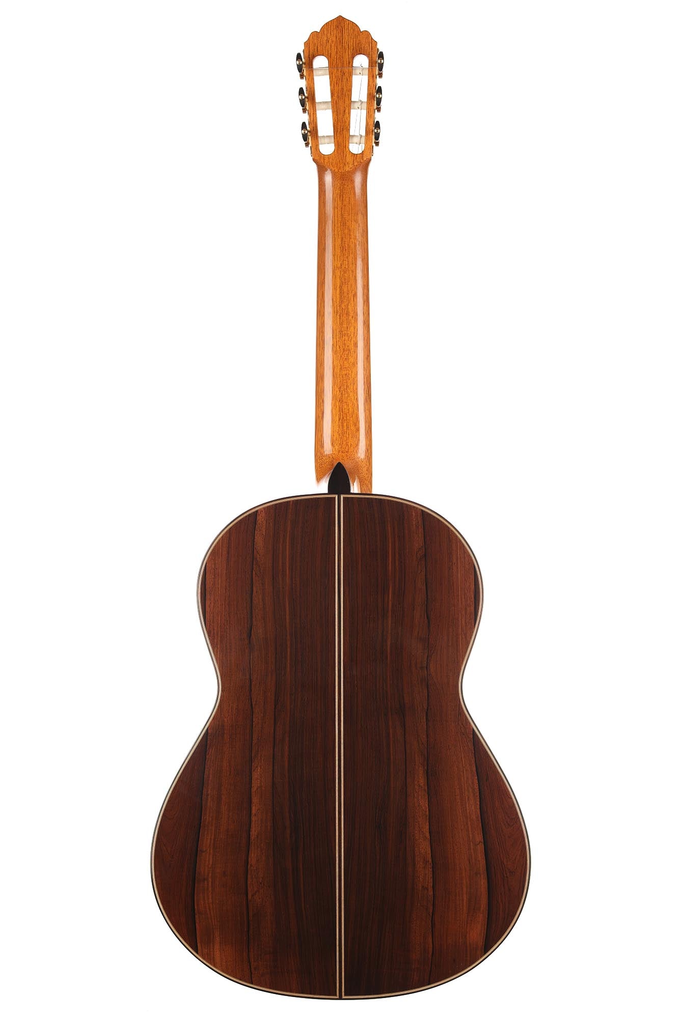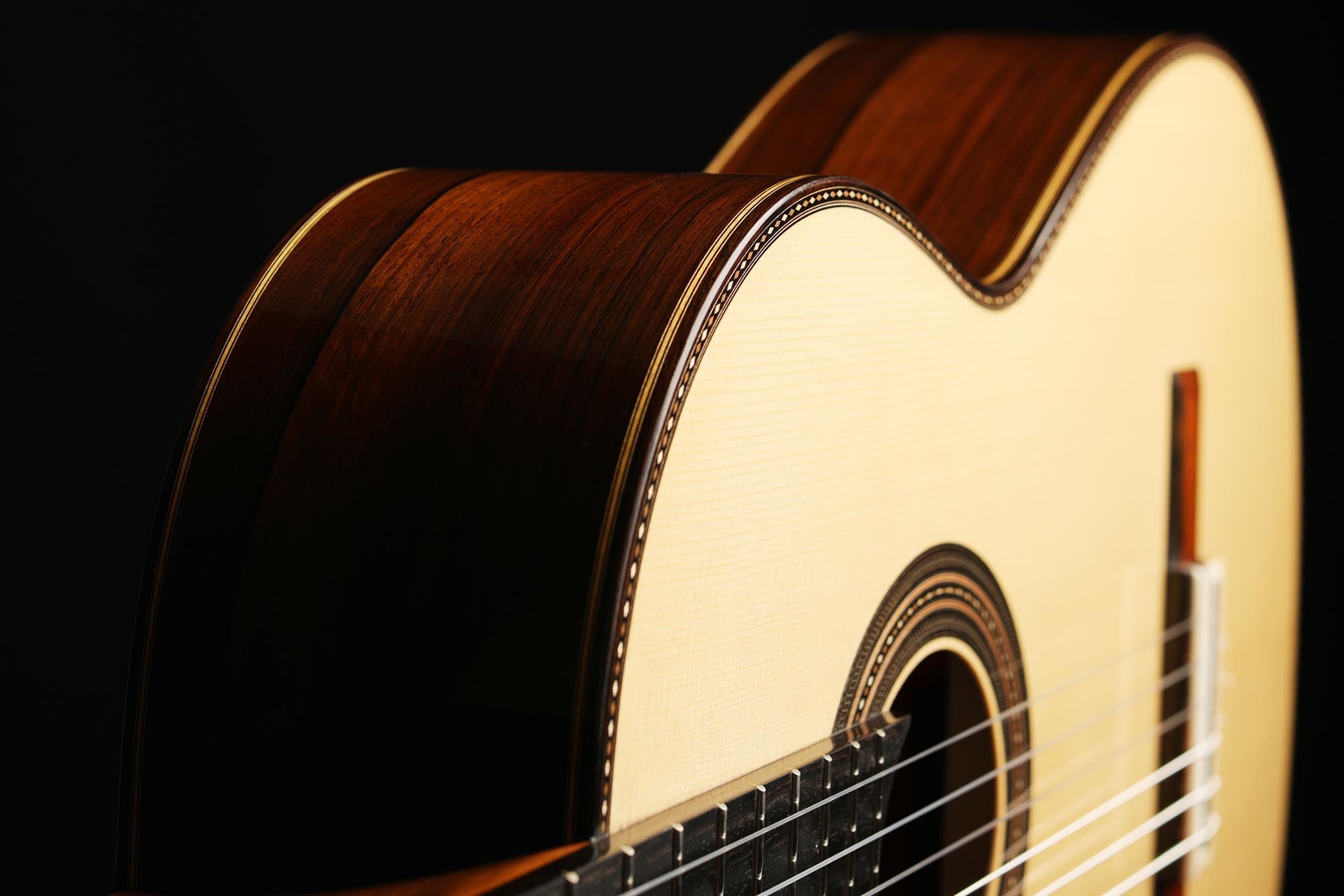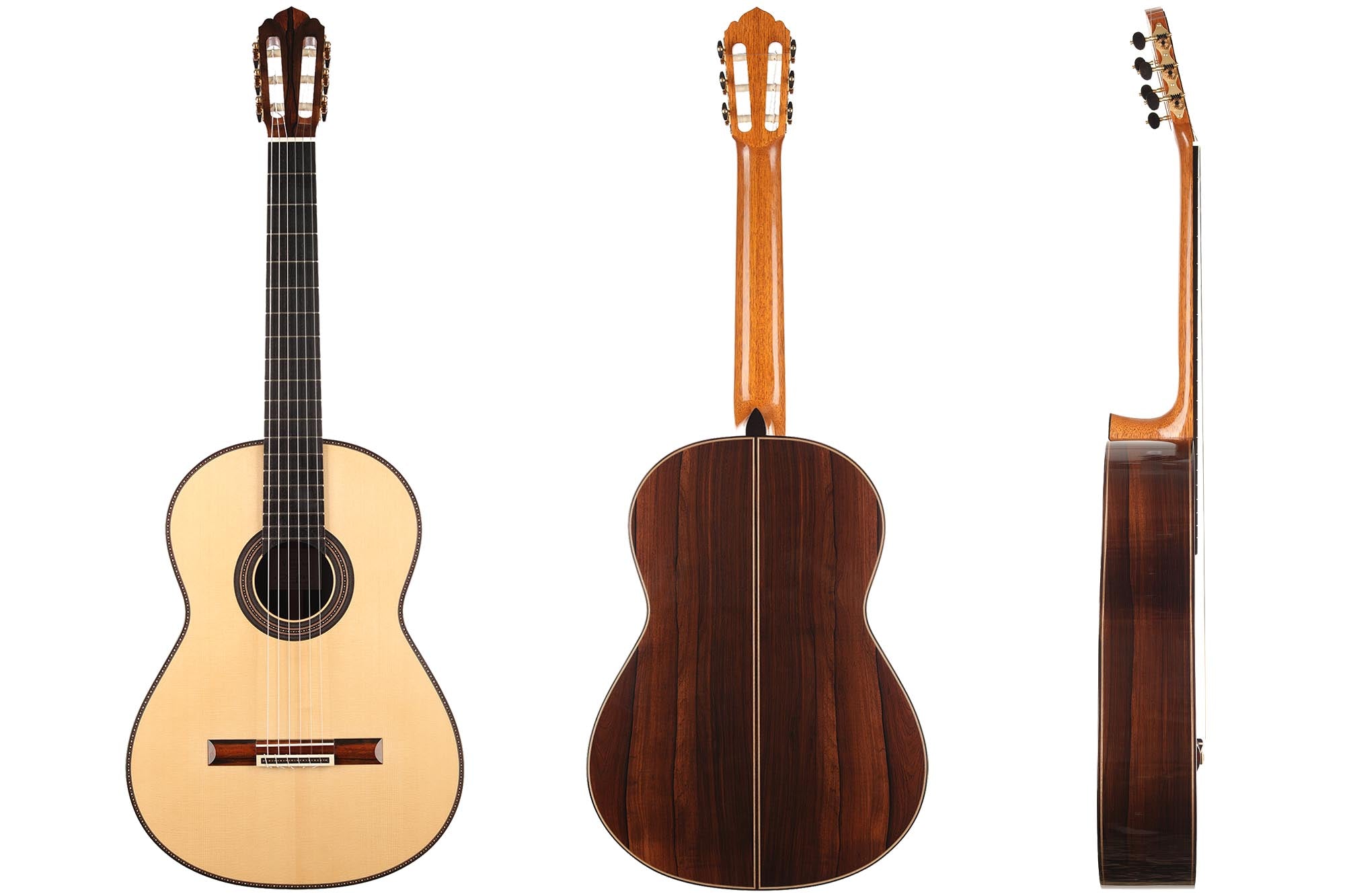 Diese neue, 2020 gebaute Gitarre zeichnet sich durch große Eleganz und Raffinesse bis ins kleinste Detail aus. Für dieses Instrument wurde ein wunderschöner Satz aus sehr dichtem und besonders dunklem Rio Palisander (CITES-zertifiziert) gewählt. Das Holz weist parallele schwarze Adern auf, die perfekt mit den orangefarbenen und grünen Reflexen des Holzes kontrastieren. Die Fichtendecke, wie auch der Rest des Instruments, ist französisch poliert mit klarem Schellack, der die Holzmaserung in ihrer ganzen natürlichen Schönheit zum Vorschein bringt.