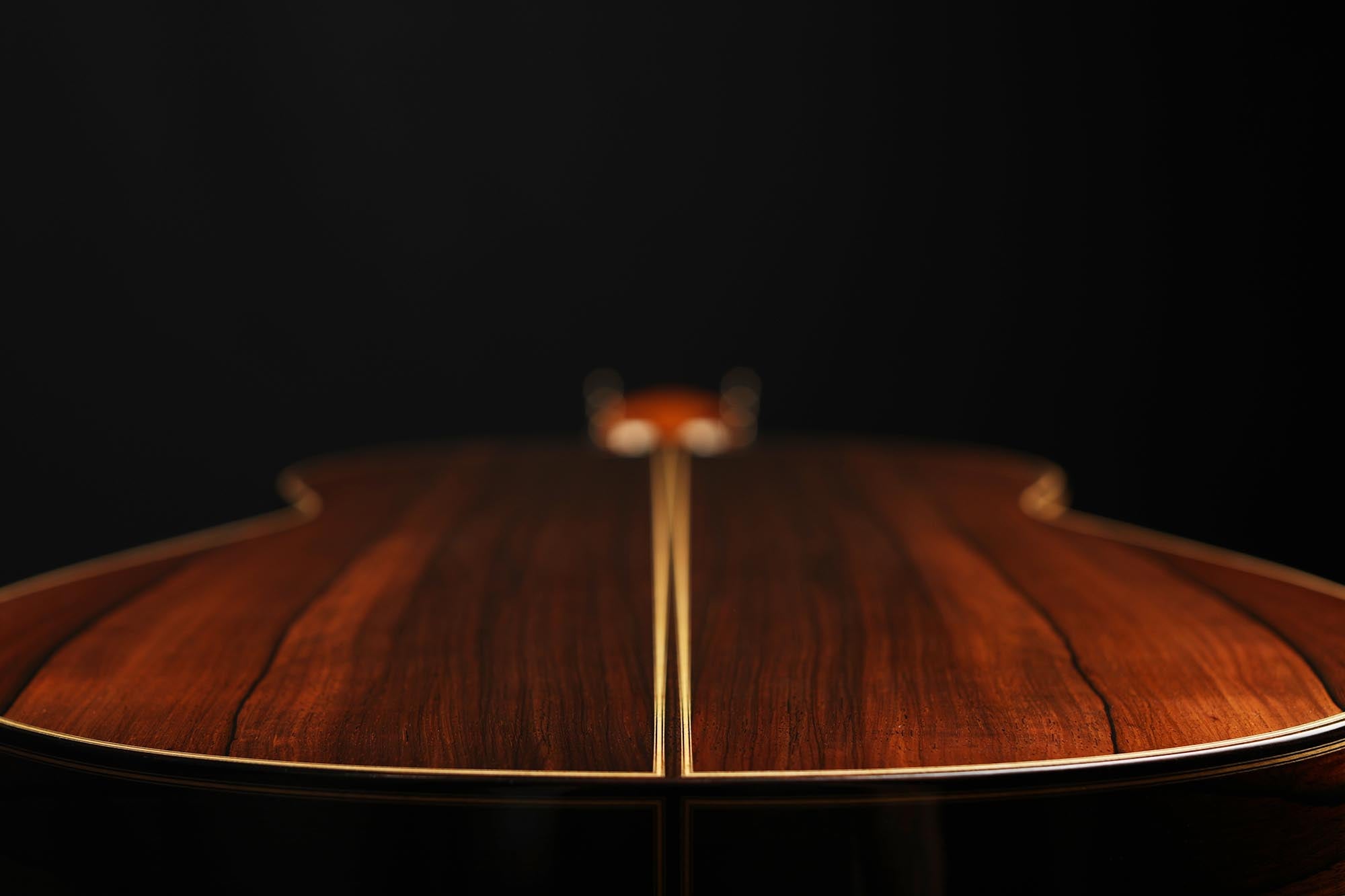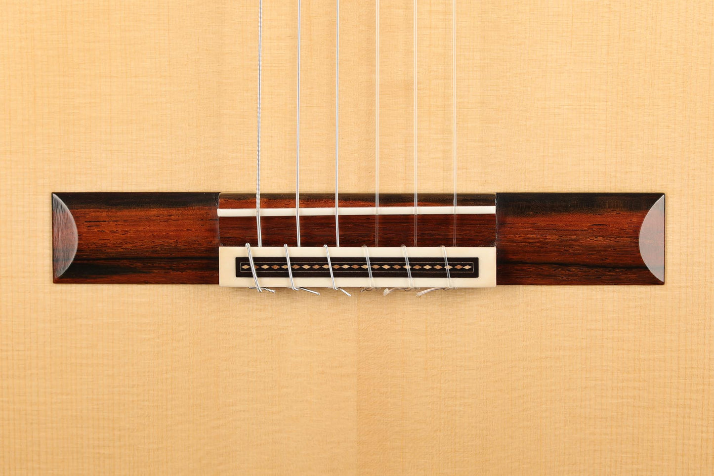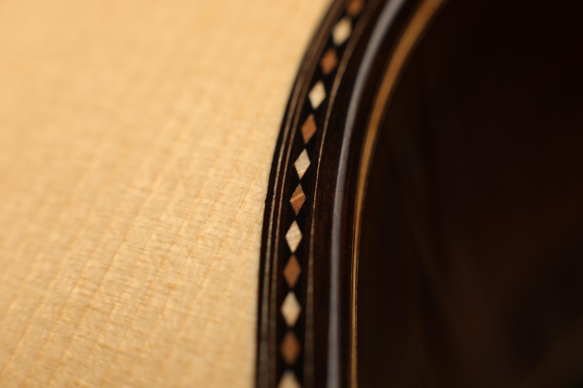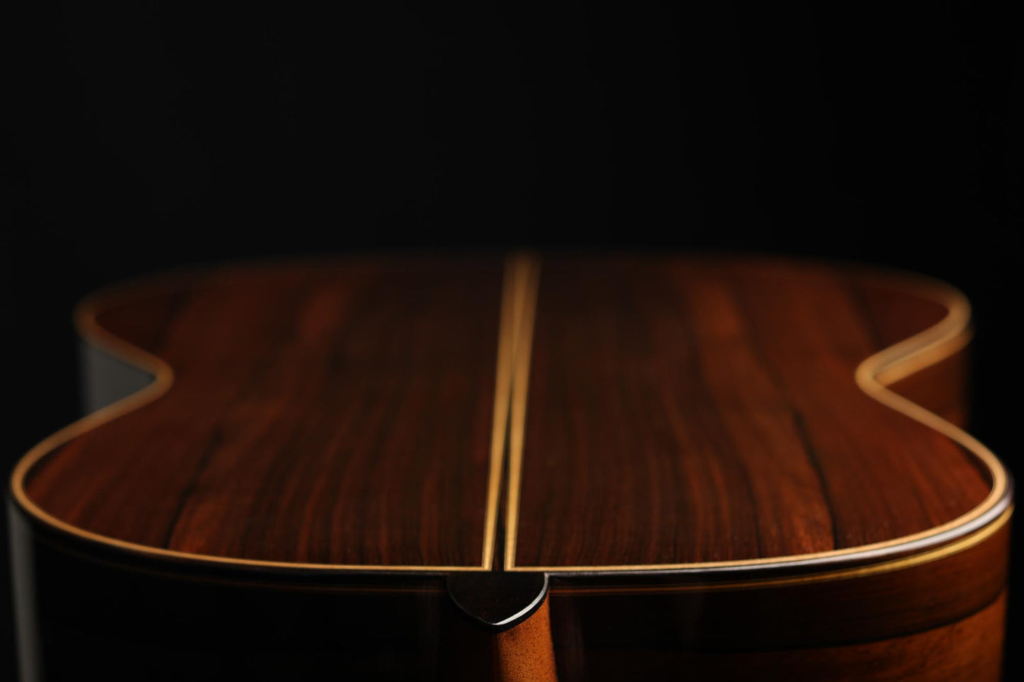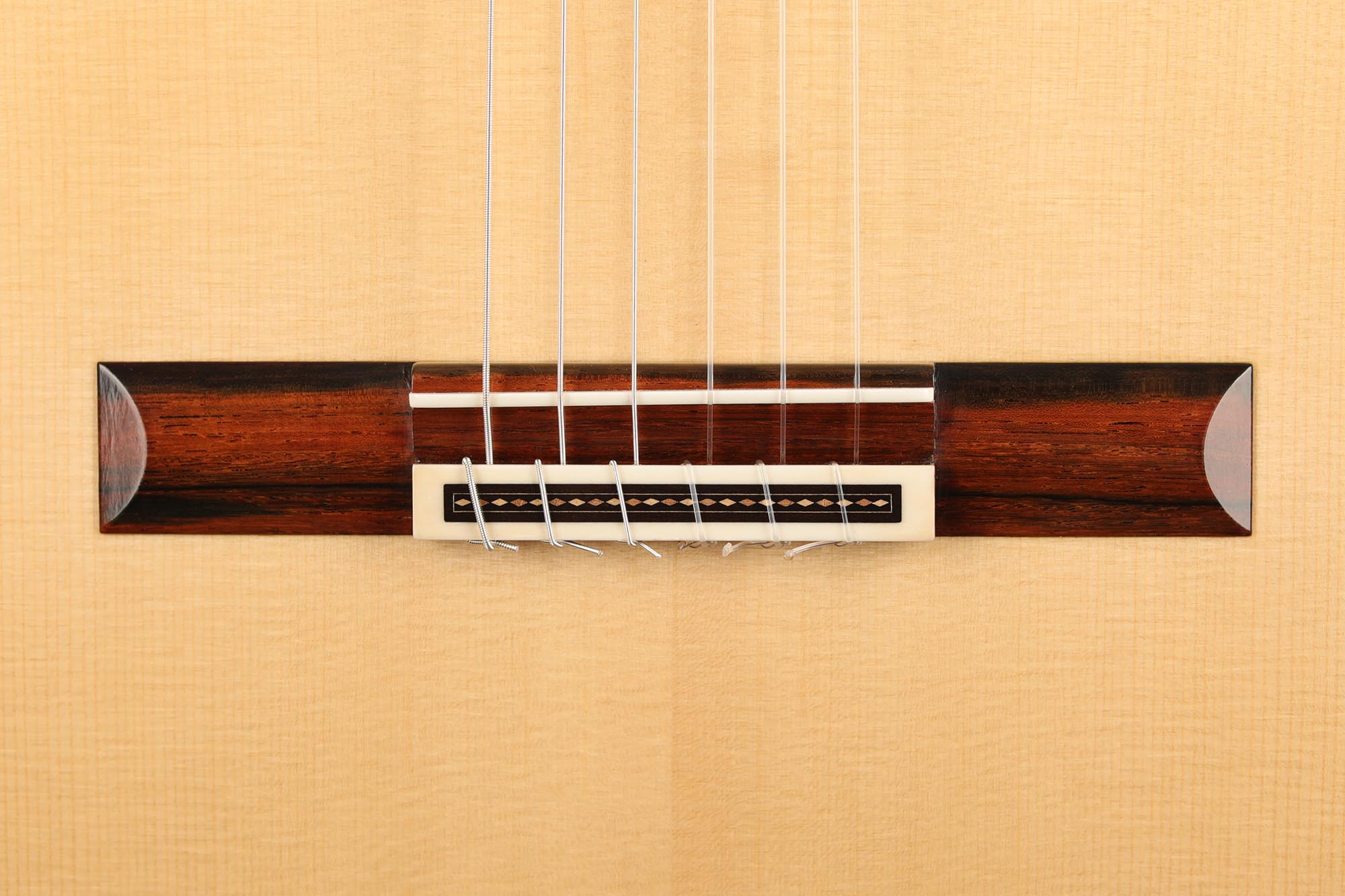 Diese neue, 2020 gebaute Gitarre zeichnet sich durch große Eleganz und Raffinesse bis ins kleinste Detail aus. Für dieses Instrument wurde ein wunderschöner Satz aus sehr dichtem und besonders dunklem Rio Palisander (CITES-zertifiziert) gewählt. Das Holz weist parallele schwarze Adern auf, die perfekt mit den orangefarbenen und grünen Reflexen des Holzes kontrastieren. Die Fichtendecke, wie auch der Rest des Instruments, ist französisch poliert mit klarem Schellack, der die Holzmaserung in ihrer ganzen natürlichen Schönheit zum Vorschein bringt.