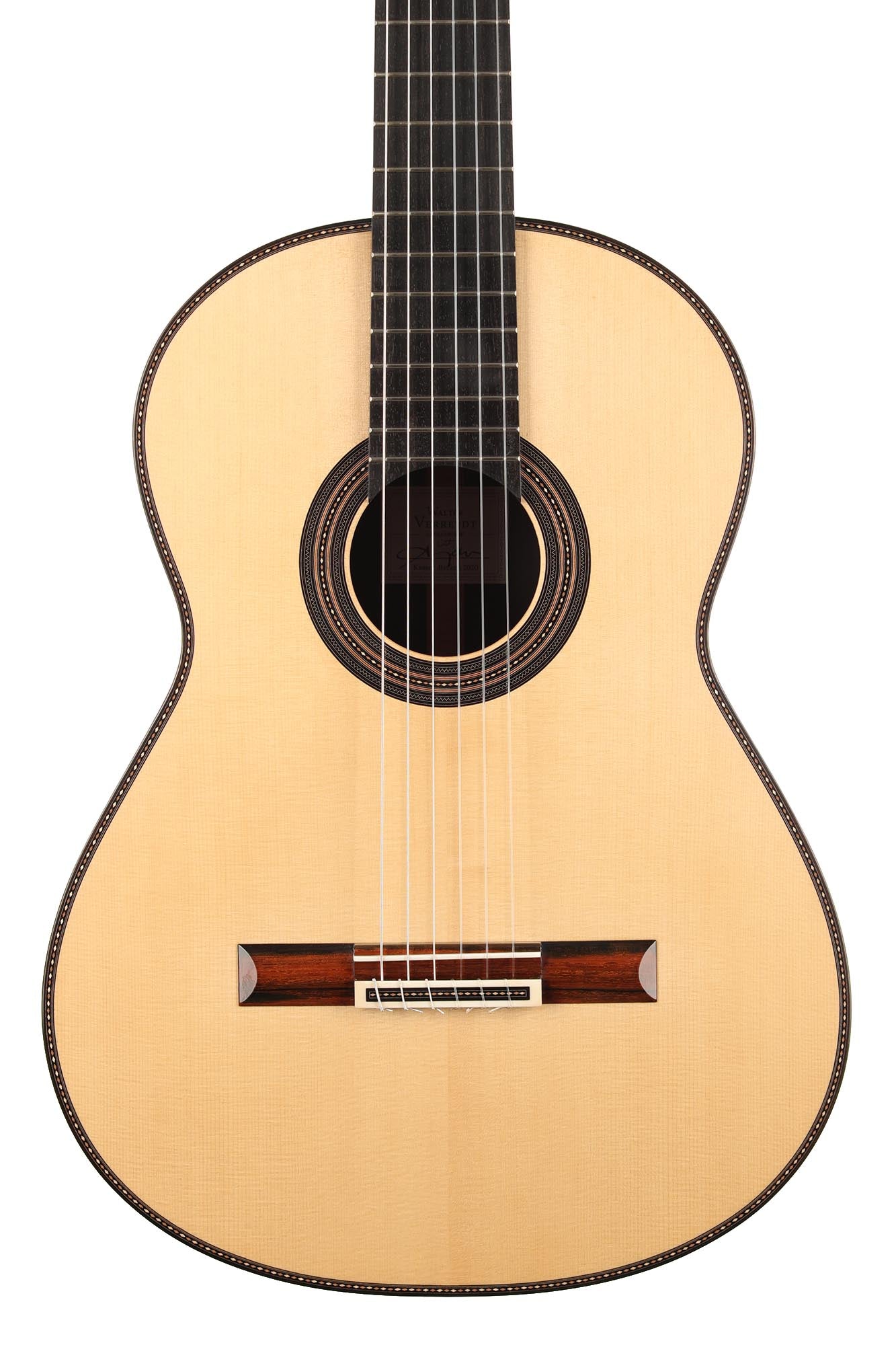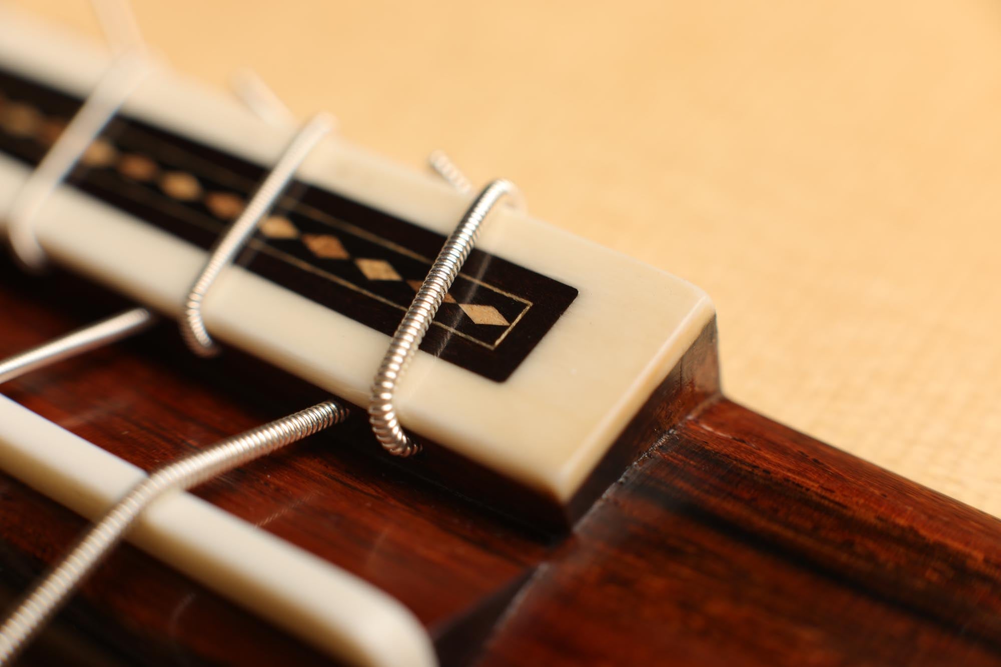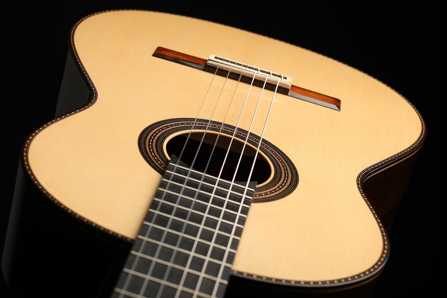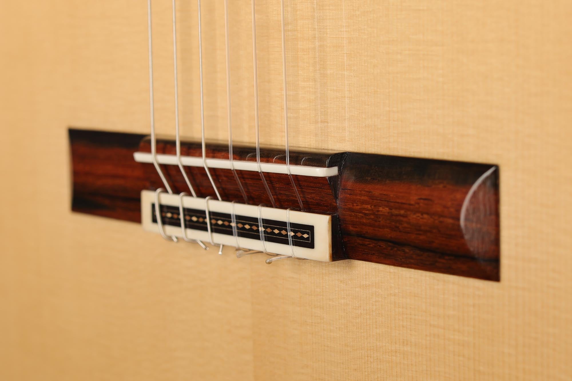 Diese neue, 2020 gebaute Gitarre zeichnet sich durch große Eleganz und Raffinesse bis ins kleinste Detail aus. Für dieses Instrument wurde ein wunderschöner Satz aus sehr dichtem und besonders dunklem Rio Palisander (CITES-zertifiziert) gewählt. Das Holz weist parallele schwarze Adern auf, die perfekt mit den orangefarbenen und grünen Reflexen des Holzes kontrastieren. Die Fichtendecke, wie auch der Rest des Instruments, ist französisch poliert mit klarem Schellack, der die Holzmaserung in ihrer ganzen natürlichen Schönheit zum Vorschein bringt.