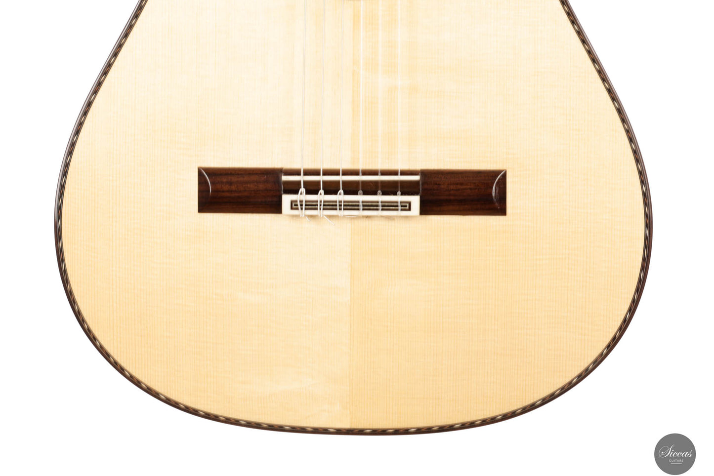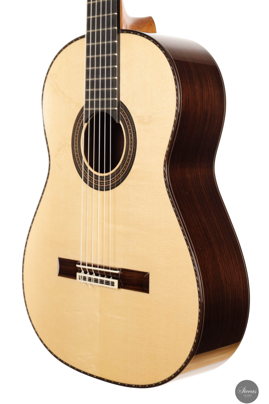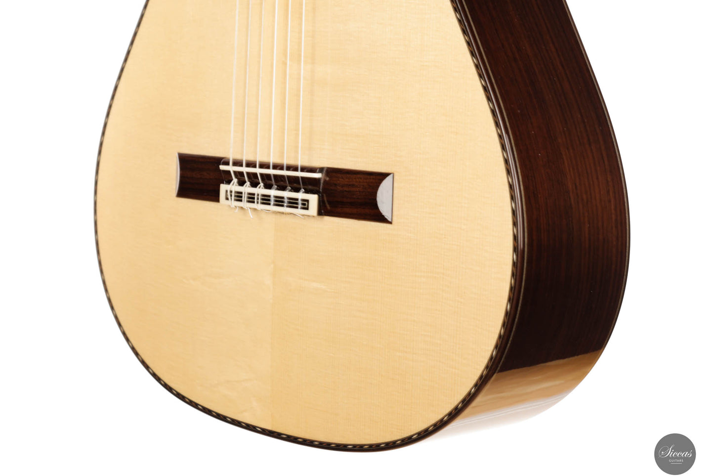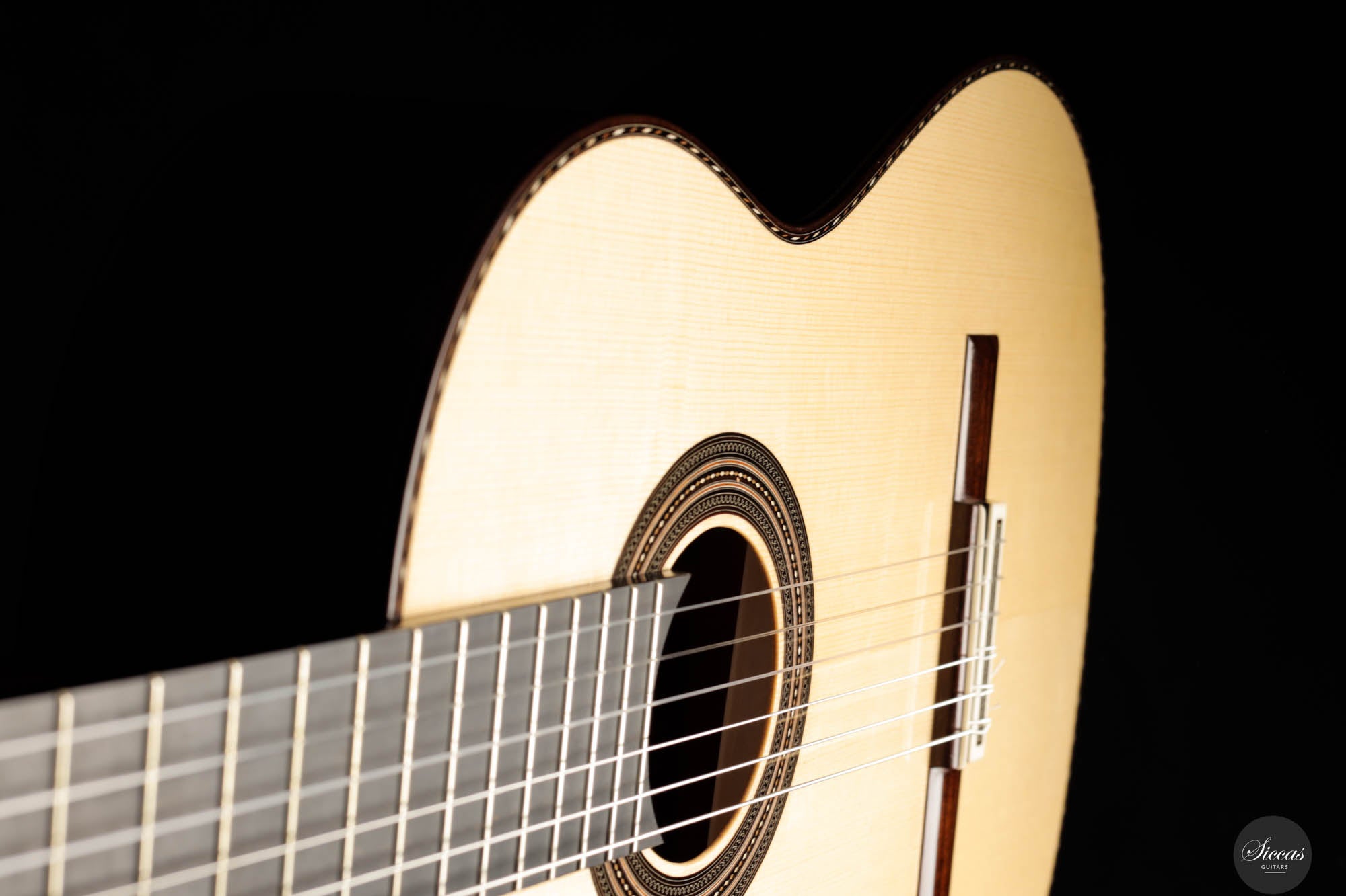 Diese Walter Verreydt Gitarre mit ihrem Gitterleisten-Verstrebungssystem steht als grandioses Meisterwerk im Bereich der Konzertinstrumente und strahlt in jedem Aspekt Raffinesse und Vollendung aus. Die außergewöhnliche Klangfülle und Ansprache der Gitarre heben sie hervor, doch es ist die Bandbreite an Klangfarben, die wahrhaft fasziniert und inspiriert. Jeder auf dieser Gitarre gespielte Ton resoniert mit einer einzigartigen Lebendigkeit und bietet ein Klangspektrum, das sowohl weitreichend als auch nuanciert ist. Insbesondere die erste E-Saite ist bemerkenswert für ihre Lebhaftigkeit und Freiheit, was es ihr ermöglicht, ihre singende Stimme mit beeindruckender Leichtigkeit zum Ausdruck zu bringen. Diese Qualität macht die Gitarre nicht nur zu einem Vergnügen beim Spielen, sondern auch zu einem vielseitigen Instrument, das in der Lage ist, eine breite Palette an Musikstilen und -ausdrucksformen mit Finesse zu bewältigen. Es sollte auch betont werden, dass die Seiten dieser Gitarre mit einer doppelten Schicht Zypresse verstärkt sind, was ihre strukturelle Integrität erhöht und die Klangprojektion deutlich verbessert.