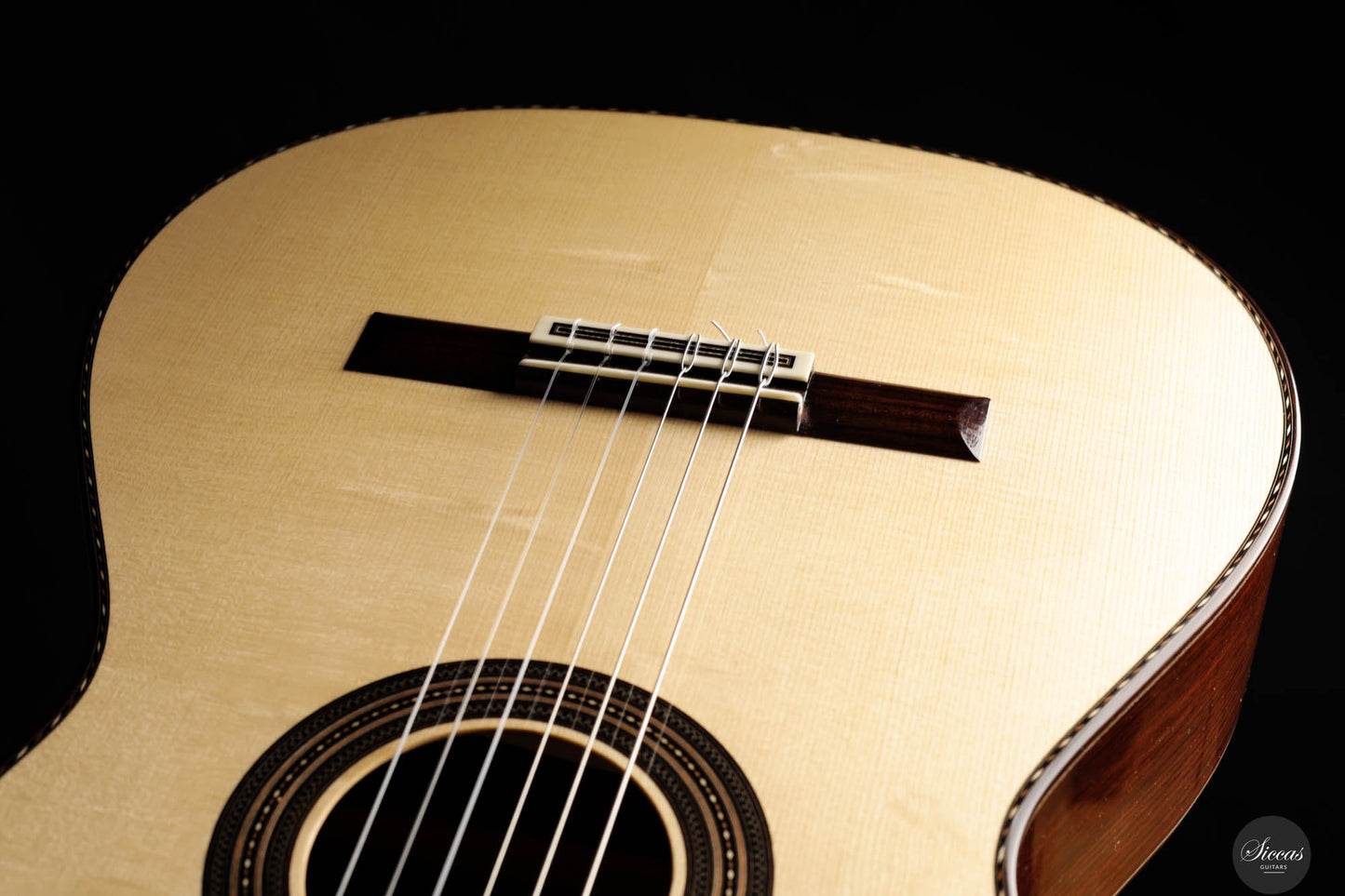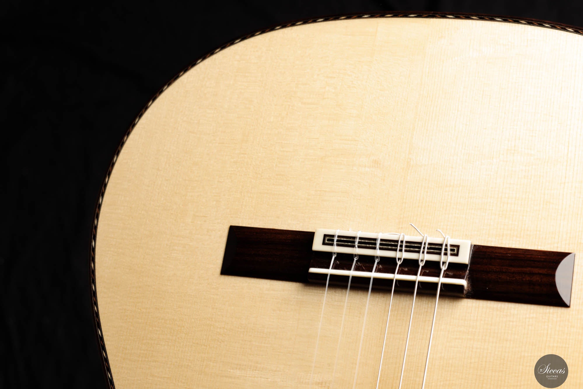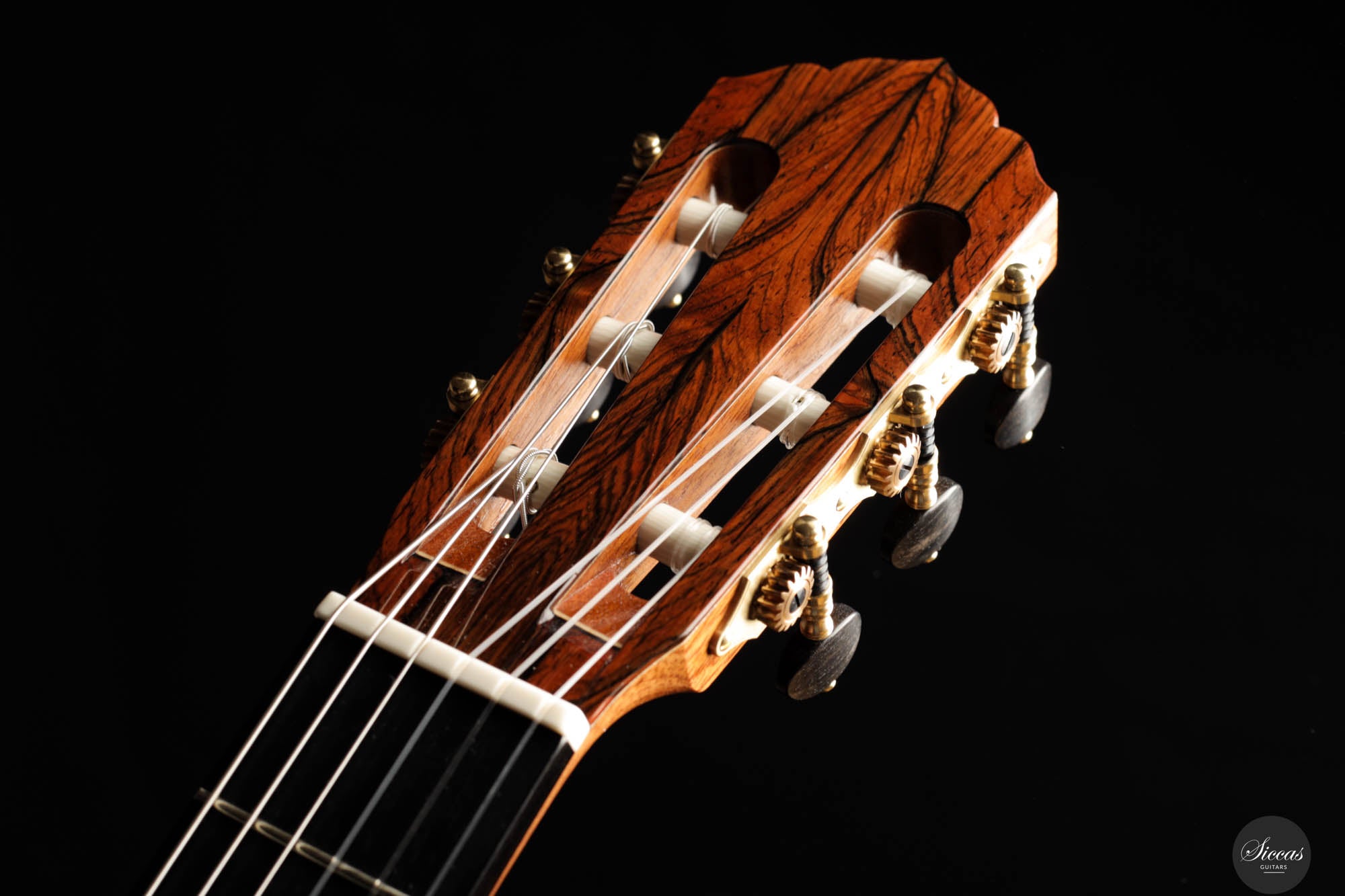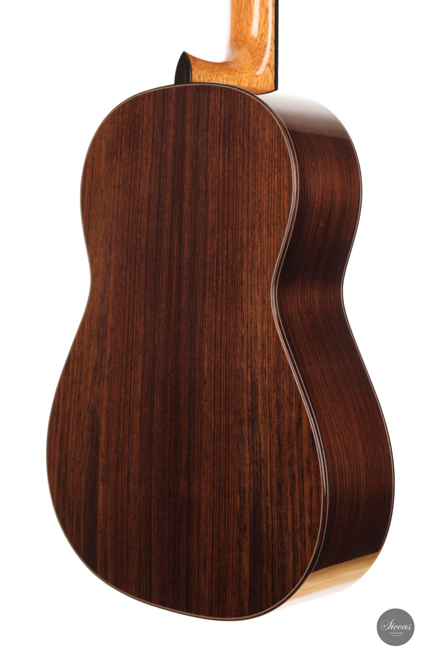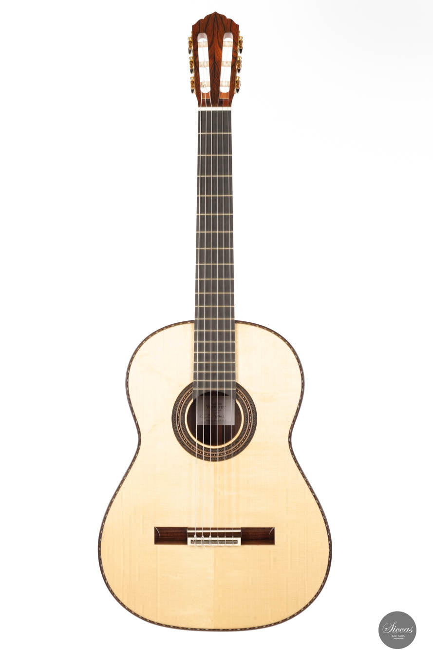 Diese Walter Verreydt Gitarre mit ihrem Gitterleisten-Verstrebungssystem steht als grandioses Meisterwerk im Bereich der Konzertinstrumente und strahlt in jedem Aspekt Raffinesse und Vollendung aus. Die außergewöhnliche Klangfülle und Ansprache der Gitarre heben sie hervor, doch es ist die Bandbreite an Klangfarben, die wahrhaft fasziniert und inspiriert. Jeder auf dieser Gitarre gespielte Ton resoniert mit einer einzigartigen Lebendigkeit und bietet ein Klangspektrum, das sowohl weitreichend als auch nuanciert ist. Insbesondere die erste E-Saite ist bemerkenswert für ihre Lebhaftigkeit und Freiheit, was es ihr ermöglicht, ihre singende Stimme mit beeindruckender Leichtigkeit zum Ausdruck zu bringen. Diese Qualität macht die Gitarre nicht nur zu einem Vergnügen beim Spielen, sondern auch zu einem vielseitigen Instrument, das in der Lage ist, eine breite Palette an Musikstilen und -ausdrucksformen mit Finesse zu bewältigen. Es sollte auch betont werden, dass die Seiten dieser Gitarre mit einer doppelten Schicht Zypresse verstärkt sind, was ihre strukturelle Integrität erhöht und die Klangprojektion deutlich verbessert.