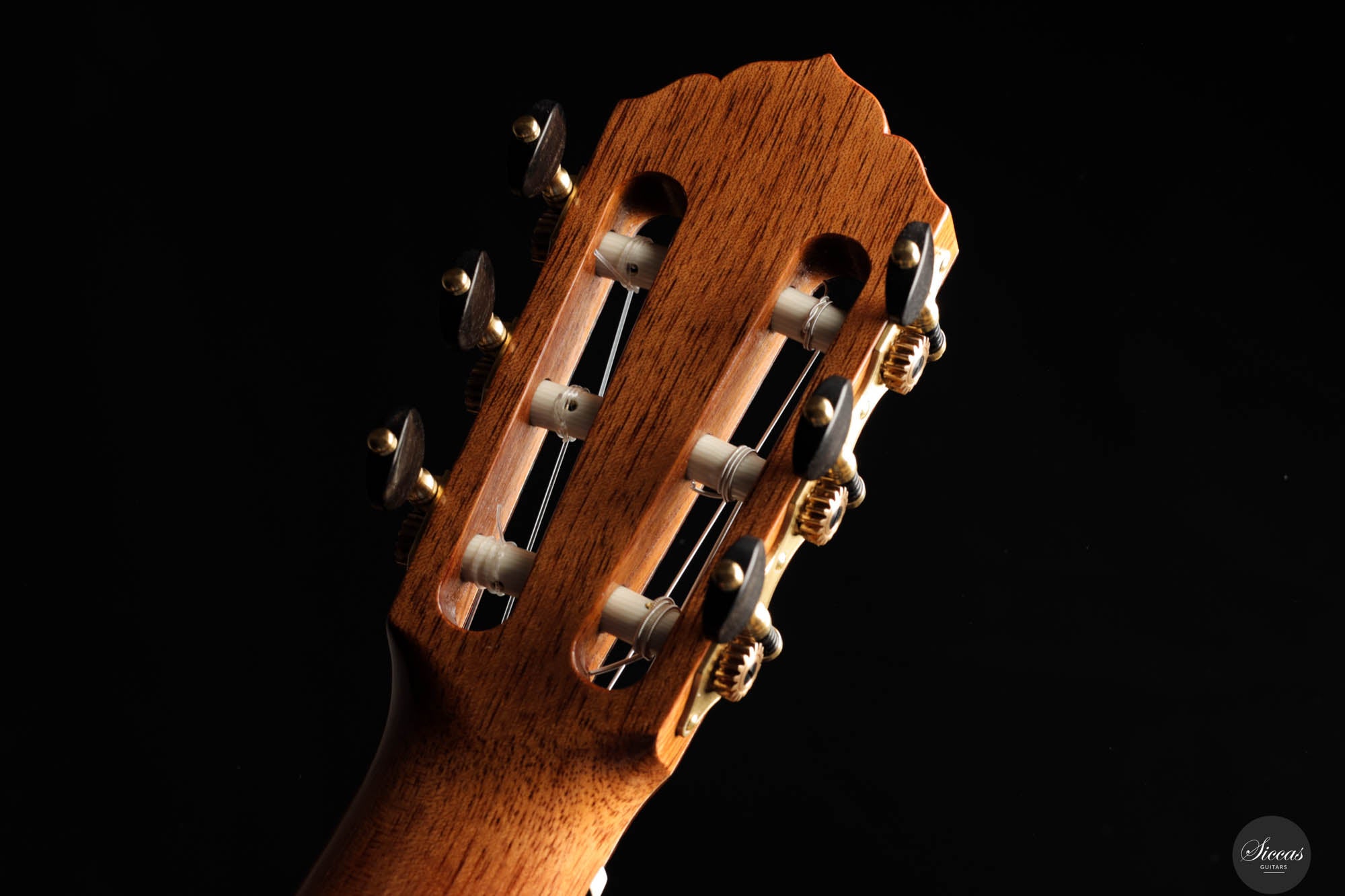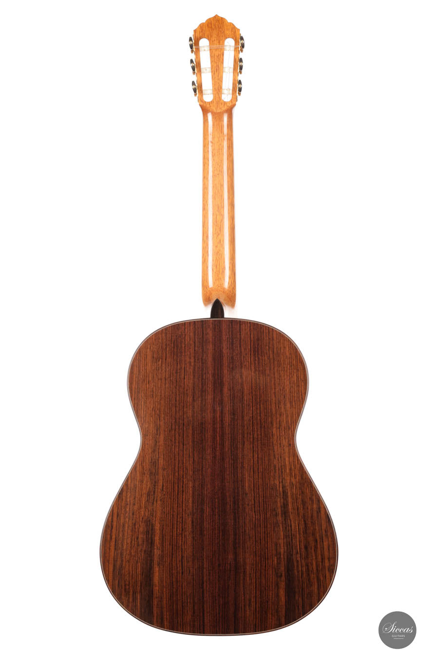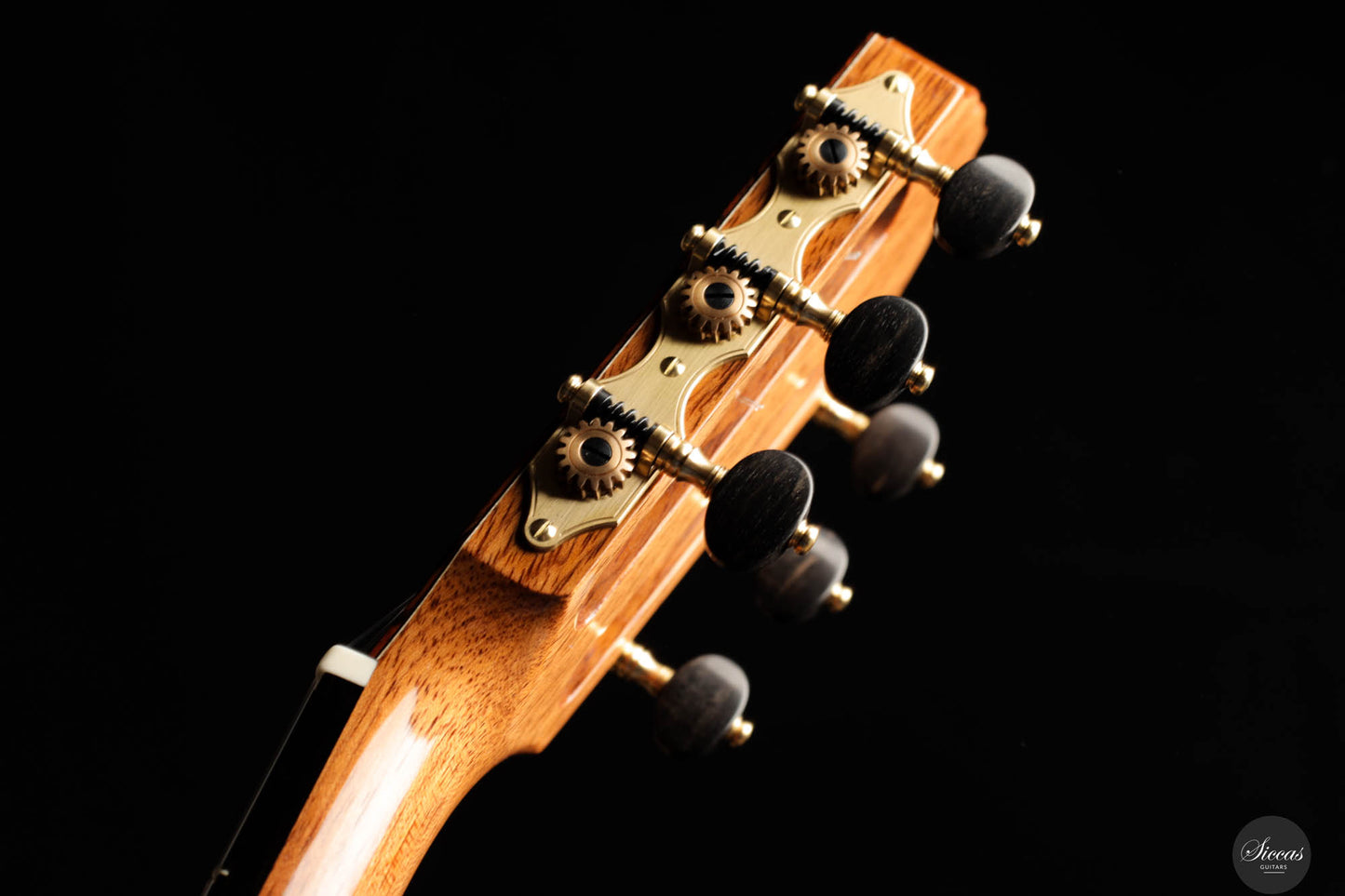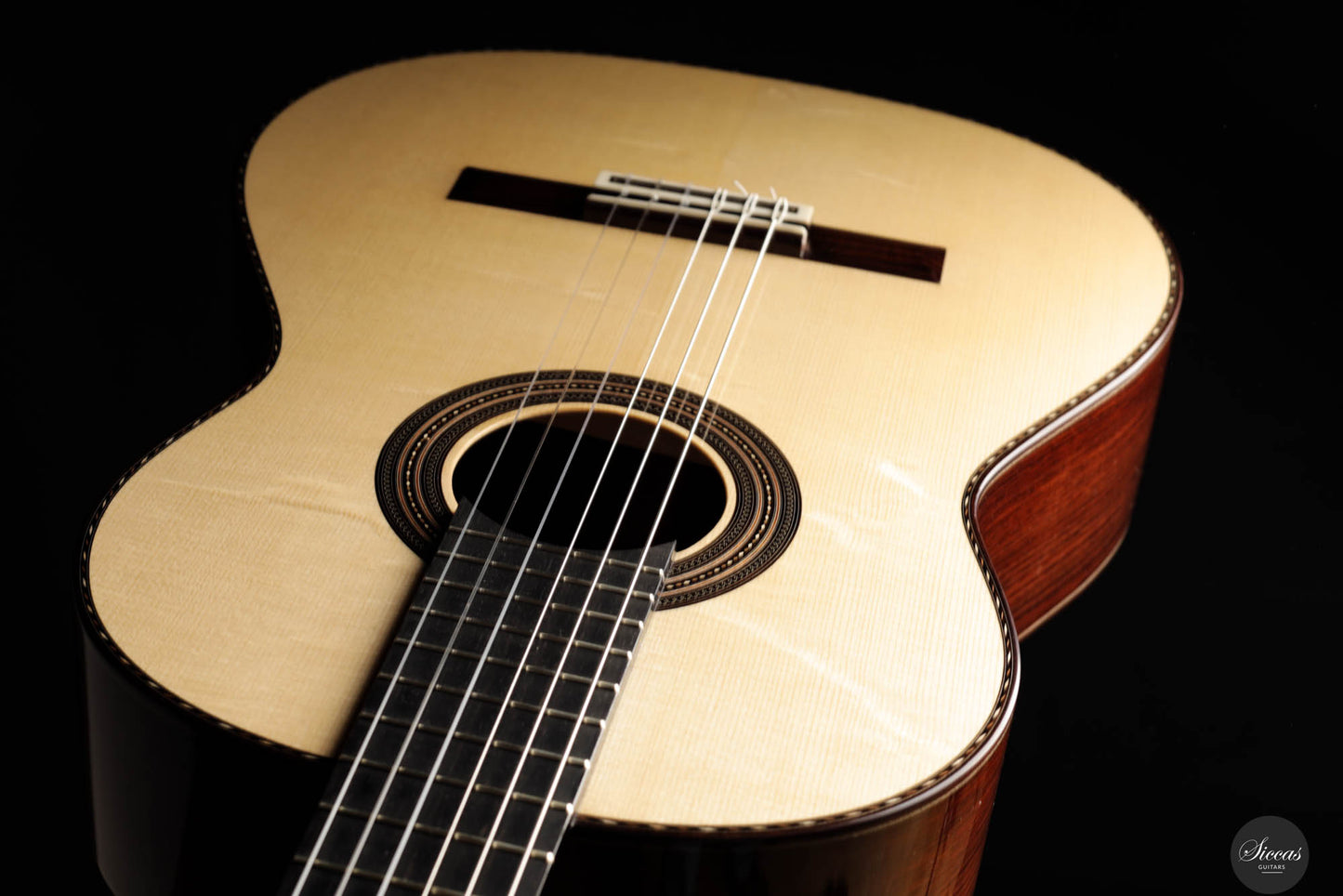 Diese Walter Verreydt Gitarre mit ihrem Gitterleisten-Verstrebungssystem steht als grandioses Meisterwerk im Bereich der Konzertinstrumente und strahlt in jedem Aspekt Raffinesse und Vollendung aus. Die außergewöhnliche Klangfülle und Ansprache der Gitarre heben sie hervor, doch es ist die Bandbreite an Klangfarben, die wahrhaft fasziniert und inspiriert. Jeder auf dieser Gitarre gespielte Ton resoniert mit einer einzigartigen Lebendigkeit und bietet ein Klangspektrum, das sowohl weitreichend als auch nuanciert ist. Insbesondere die erste E-Saite ist bemerkenswert für ihre Lebhaftigkeit und Freiheit, was es ihr ermöglicht, ihre singende Stimme mit beeindruckender Leichtigkeit zum Ausdruck zu bringen. Diese Qualität macht die Gitarre nicht nur zu einem Vergnügen beim Spielen, sondern auch zu einem vielseitigen Instrument, das in der Lage ist, eine breite Palette an Musikstilen und -ausdrucksformen mit Finesse zu bewältigen. Es sollte auch betont werden, dass die Seiten dieser Gitarre mit einer doppelten Schicht Zypresse verstärkt sind, was ihre strukturelle Integrität erhöht und die Klangprojektion deutlich verbessert.